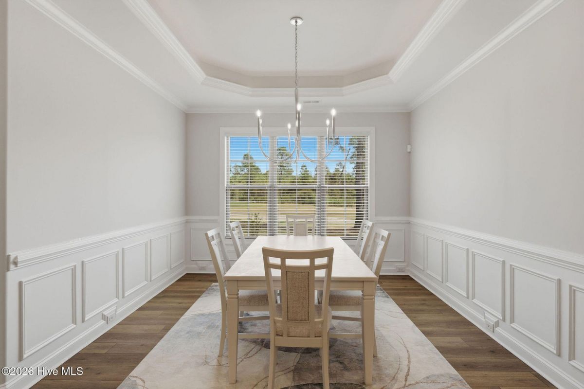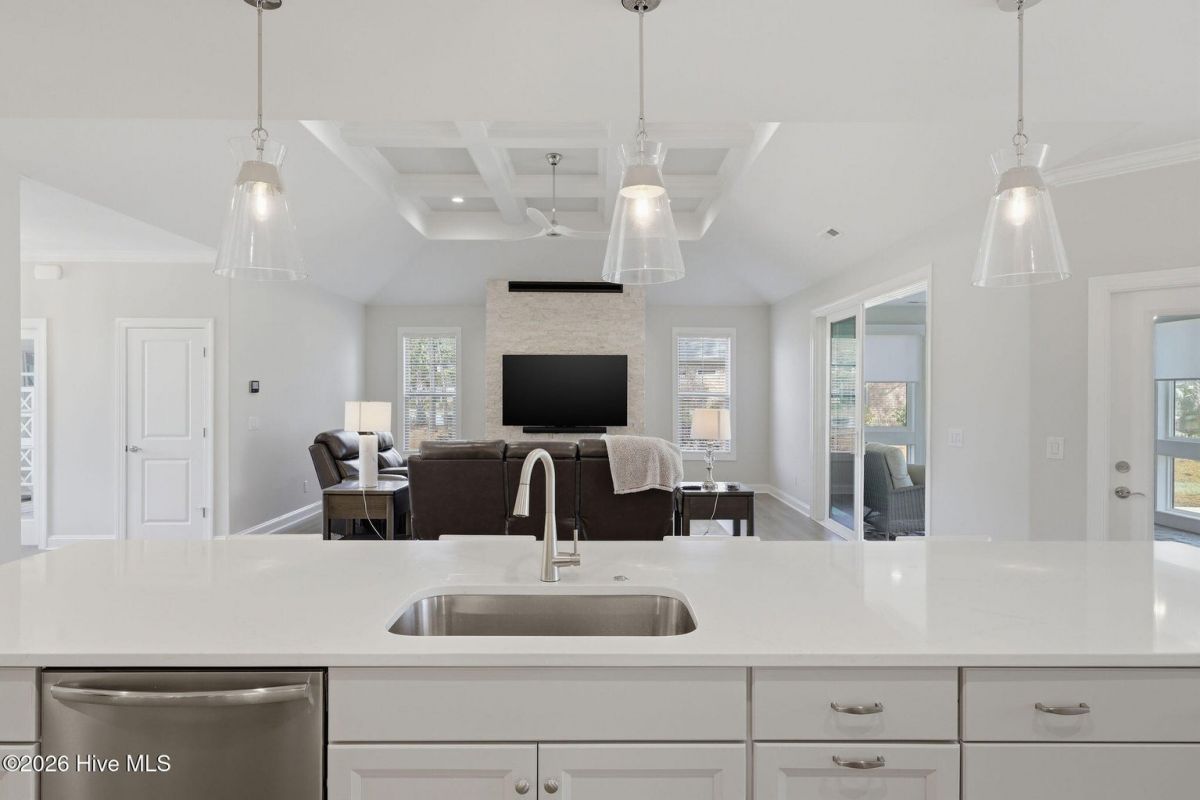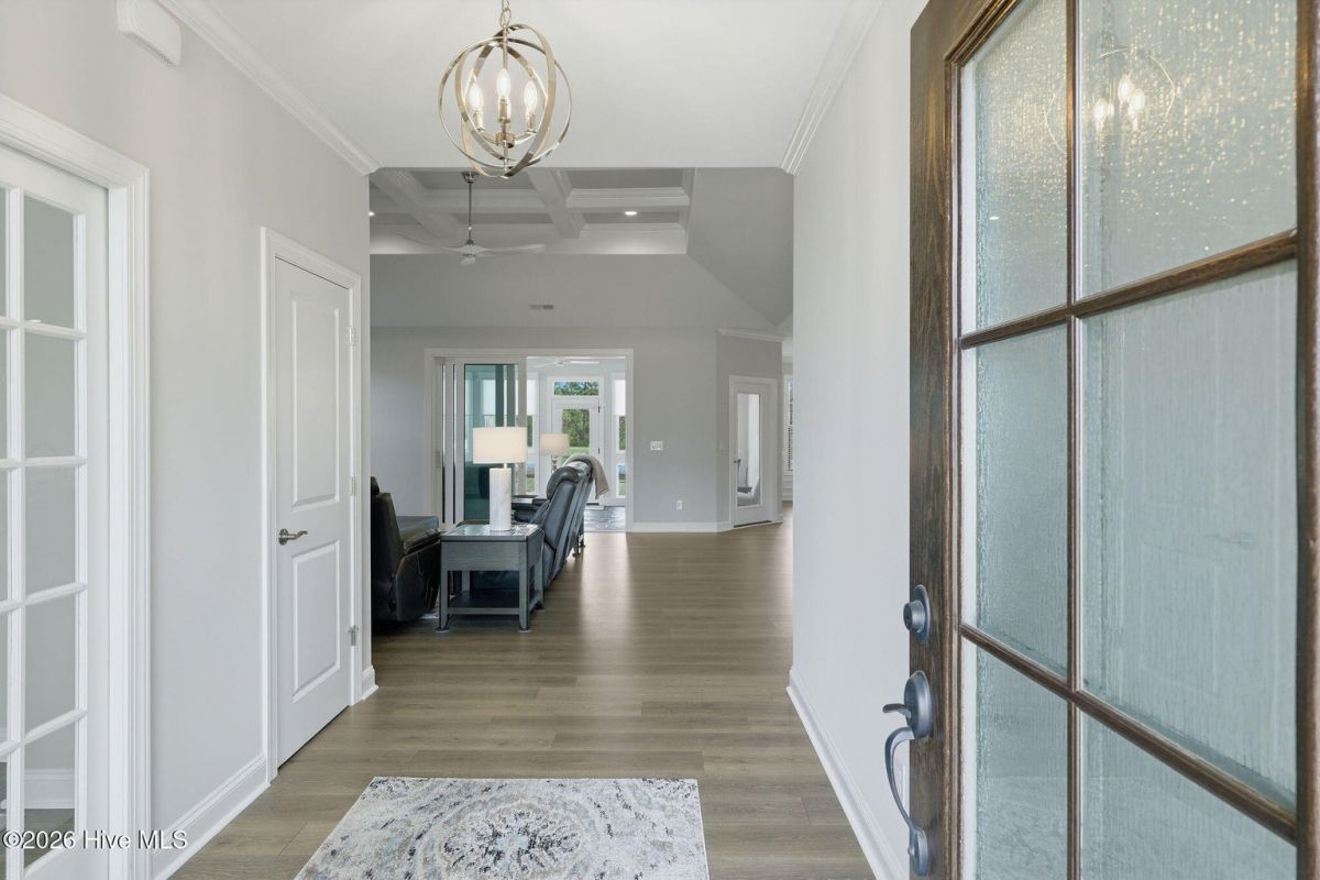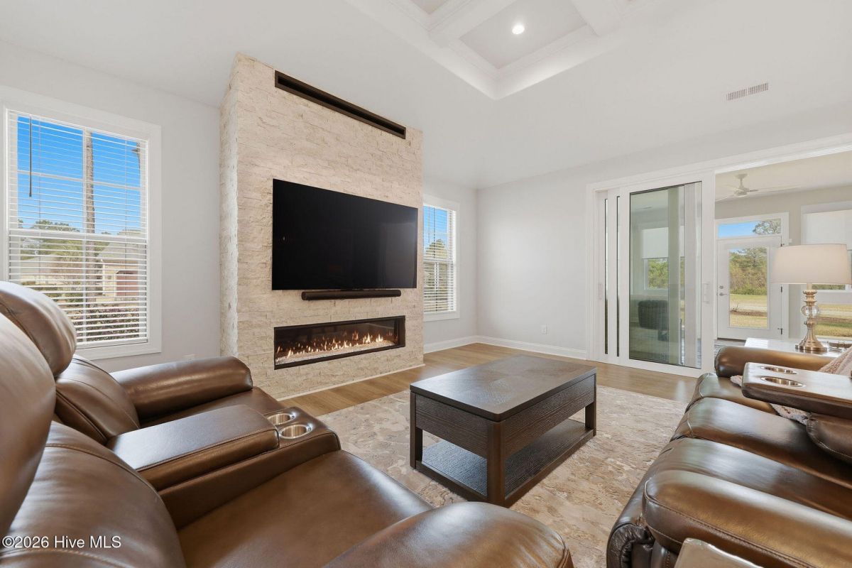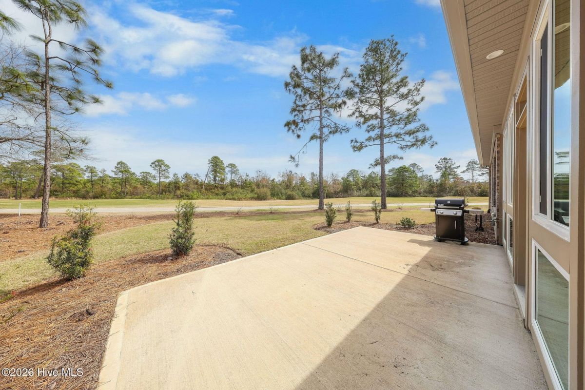 This stunning 2024 home is situated on a rare .54-acre homesite overlooking the golf course in Compass Pointe, this thoughtfully designed home offers the perfect blend of space, flexibility, and quality craftsmanship. The open-concept layout features a bright, well-appointed kitchen with upgraded appliances to include a Induction Stove that heats as fast as gas, full overlay cabinetry, glass accent doors, and a large island that flows seamlessly into the living room with coffered ceilings and a sleek horizontal fireplace. A 4-seasons room and expansive patio provide the ideal setting to enjoy peaceful golf course views, while the formal dining room with detailed wainscoting and a private study with glass pocket doors offer both function and character. The spacious primary suite includes a tray ceiling, dual closets, and a spa-like bath with double vanity and zero-entry tiled shower. Upstairs, a large bonus room with full bath offers flexibility as a guest suite, hobby space, or additional living area. Additional features include a side-load garage with epoxy floors, built-in storage, and EV charger, tankless water heater, upgraded electrical service, and a fully stick-built attic allowing for exceptional walkable storage. A rare combination of quality, space, and setting within one of the area's most sought-after golf communities. Compass Pointe offers resort-style living with optional memberships that include access to a championship golf course, indoor and outdoor pools, a fitness center, tennis and pickleball courts, walking and biking trails, and a vibrant social calendar. Conveniently located just minutes from shopping, dining, medical facilities, and a short drive to Wilmington and area beaches.