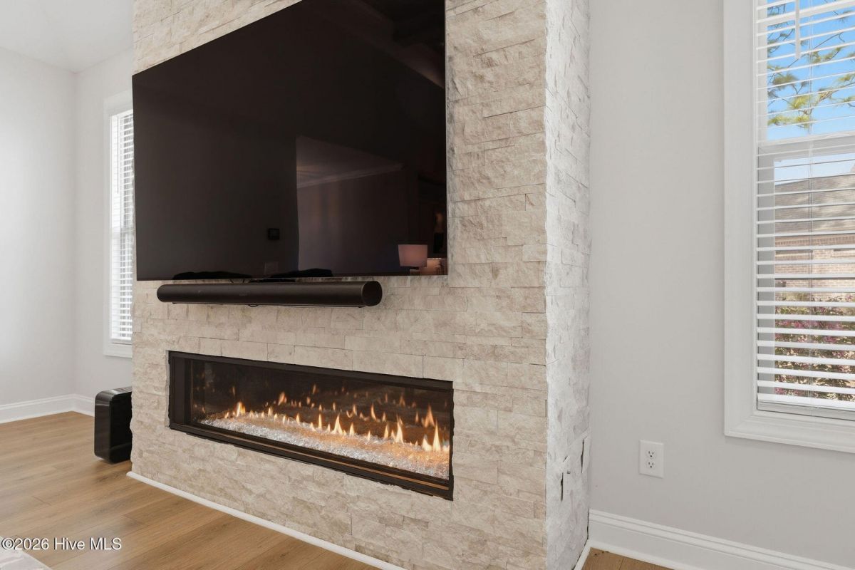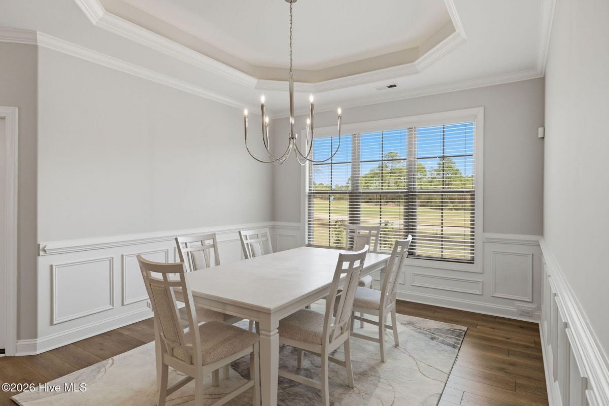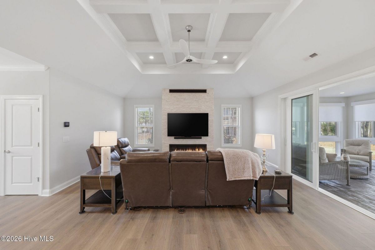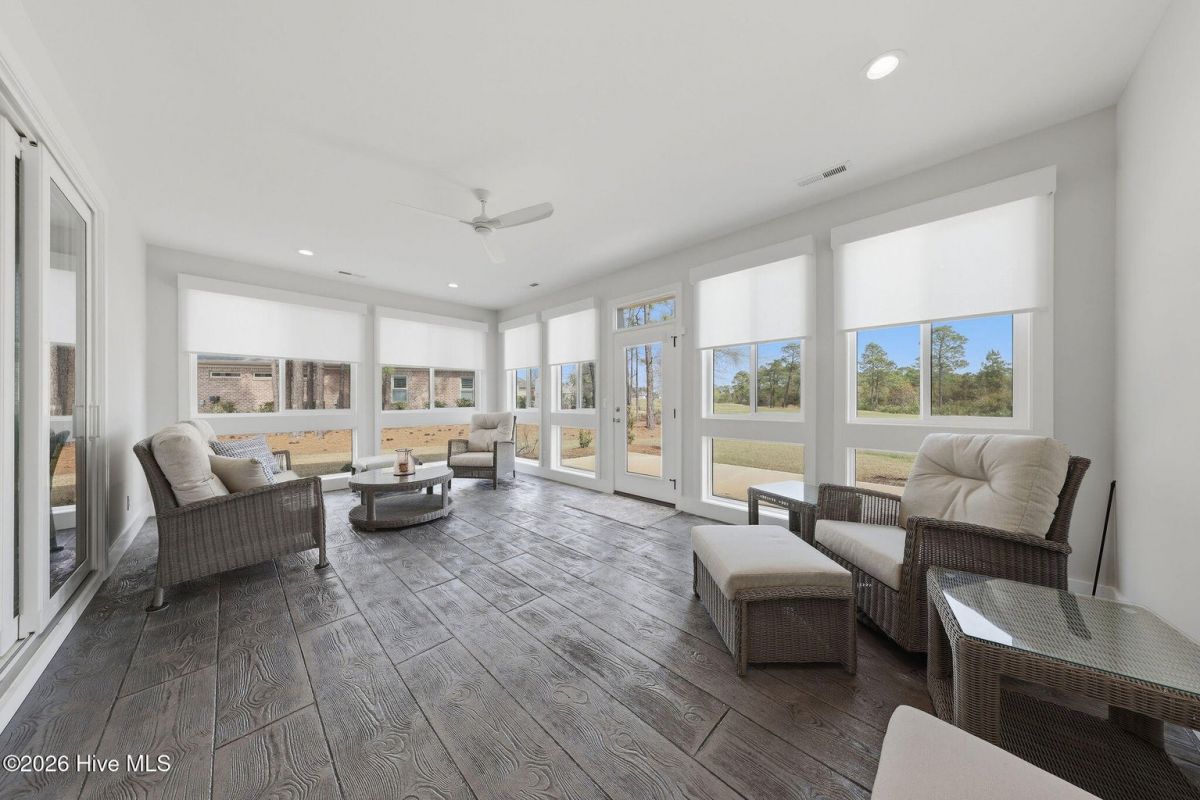 This stunning 2024 home is situated on a rare .54-acre homesite overlooking the golf course in Compass Pointe, this thoughtfully designed home offers the perfect blend of space, flexibility, and quality craftsmanship. The open-concept layout features a bright, well-appointed kitchen with upgraded appliances to include a Induction Stove that heats as fast as gas, full overlay cabinetry, glass accent doors, and a large island that flows seamlessly into the living room with coffered ceilings and a sleek horizontal fireplace. A 4-seasons room and expansive patio provide the ideal setting to enjoy peaceful golf course views, while the formal dining room with detailed wainscoting and a private study with glass pocket doors offer both function and character. The spacious primary suite includes a tray ceiling, dual closets, and a spa-like bath with double vanity and zero-entry tiled shower. Upstairs, a large bonus room with full bath offers flexibility as a guest suite, hobby space, or additional living area. Additional features include a side-load garage with epoxy floors, built-in storage, and EV charger, tankless water heater, upgraded electrical service, and a fully stick-built attic allowing for exceptional walkable storage. A rare combination of quality, space, and setting within one of the area's most sought-after golf communities. Compass Pointe offers resort-style living with optional memberships that include access to a championship golf course, indoor and outdoor pools, a fitness center, tennis and pickleball courts, walking and biking trails, and a vibrant social calendar. Conveniently located just minutes from shopping, dining, medical facilities, and a short drive to Wilmington and area beaches.