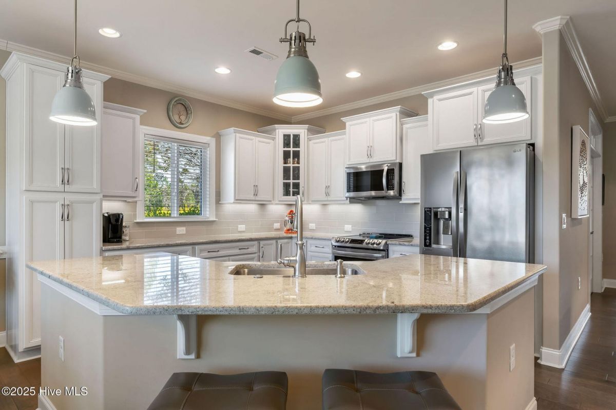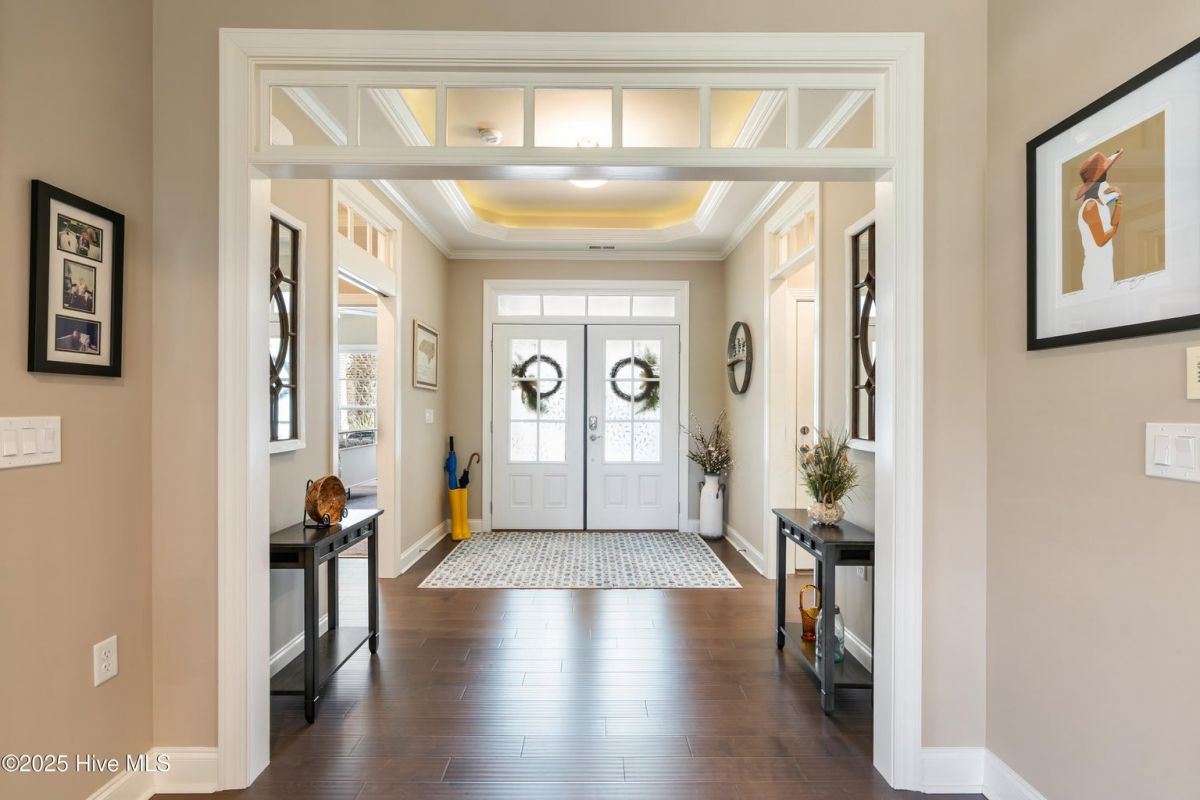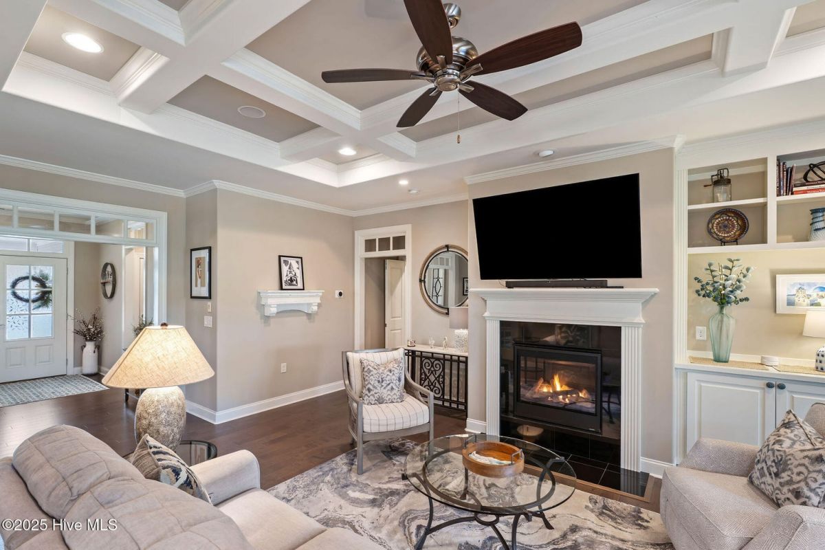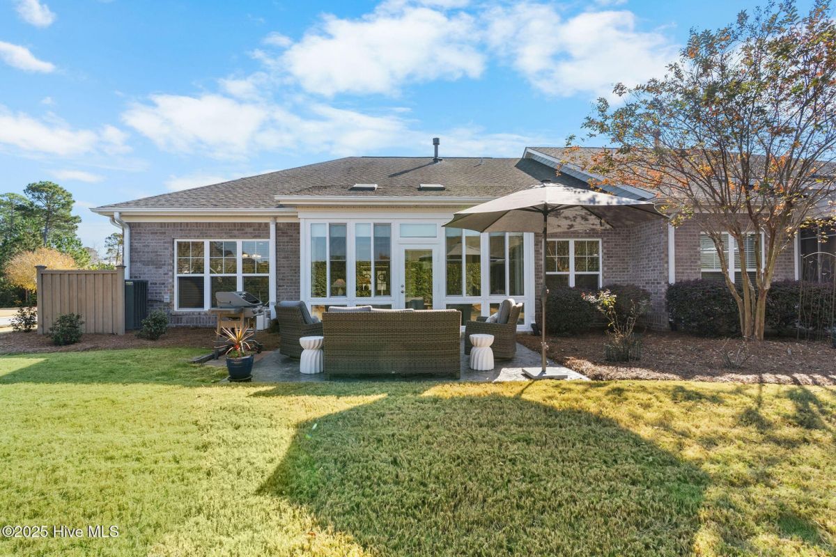 Discover easy, low-maintenance living in this like-new beauty, perfectly situated on a premier corner lot with lush, mature landscaping for privacy and year-round appeal. A timeless red brick front porch creates a warm welcome and a peaceful spot to enjoy nature's views. Step through the double front doors into an inviting open layout featuring lighted tray-ceilings, a coffered living room ceiling, and transom windows that fill the home with natural light. A bright study with French doors offers ideal flexibility for an office, den, or hobby room. The kitchen boasts abundant cabinetry, a large island perfect for gatherings, and a brand new refrigerator. Telescoping sliders off the living room extend your living space into the fully enclosed (heated and cooled!) sunroom with custom shades, overlooking a stamped concrete patio—perfect for grilling and relaxing in the private backyard. The primary suite is a generous retreat with direct sunroom access, a cozy reading nook, and two walk-in closets. Its ensuite bath features a double vanity, linen closet, and a walk-in shower with barn-door sliding glass. Guests enjoy exceptional comfort with a first-floor guest bedroom and bathroom, made even more private by a pocket door that closes off this entire area, or the spacious bonus room with its own full bath. Storage is plentiful with a walk-in attic and an epoxy-floor 2-car garage. Located in the gated, golf-cart-friendly community of Compass Pointe, offering resort-style amenities: the Grand Lanai clubhouse, indoor and outdoor pools, lazy river, fitness center, lighted tennis and pickleball courts, walking/biking trails, kayak launch, endless clubs and activities, and more. Home to the stunning 18-hole private Compass Pointe Golf Club and additional amenities available to members! Don't miss your chance to live in one of the area's most sought-after communities—just 12 minutes from the charm of historic downtown Wilmington. Make this your next address!