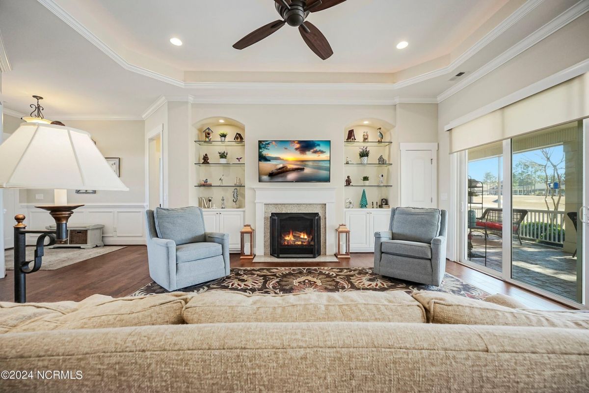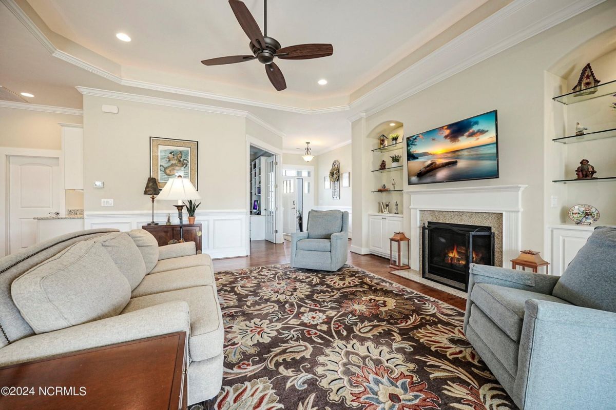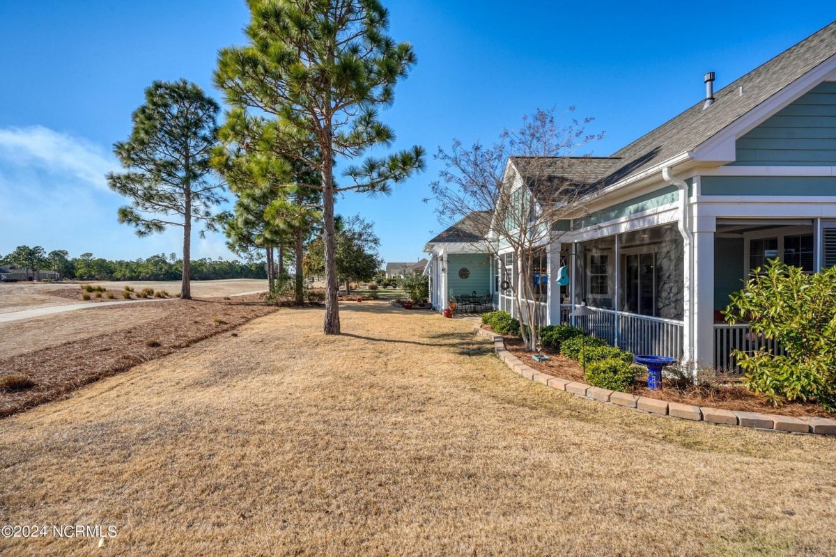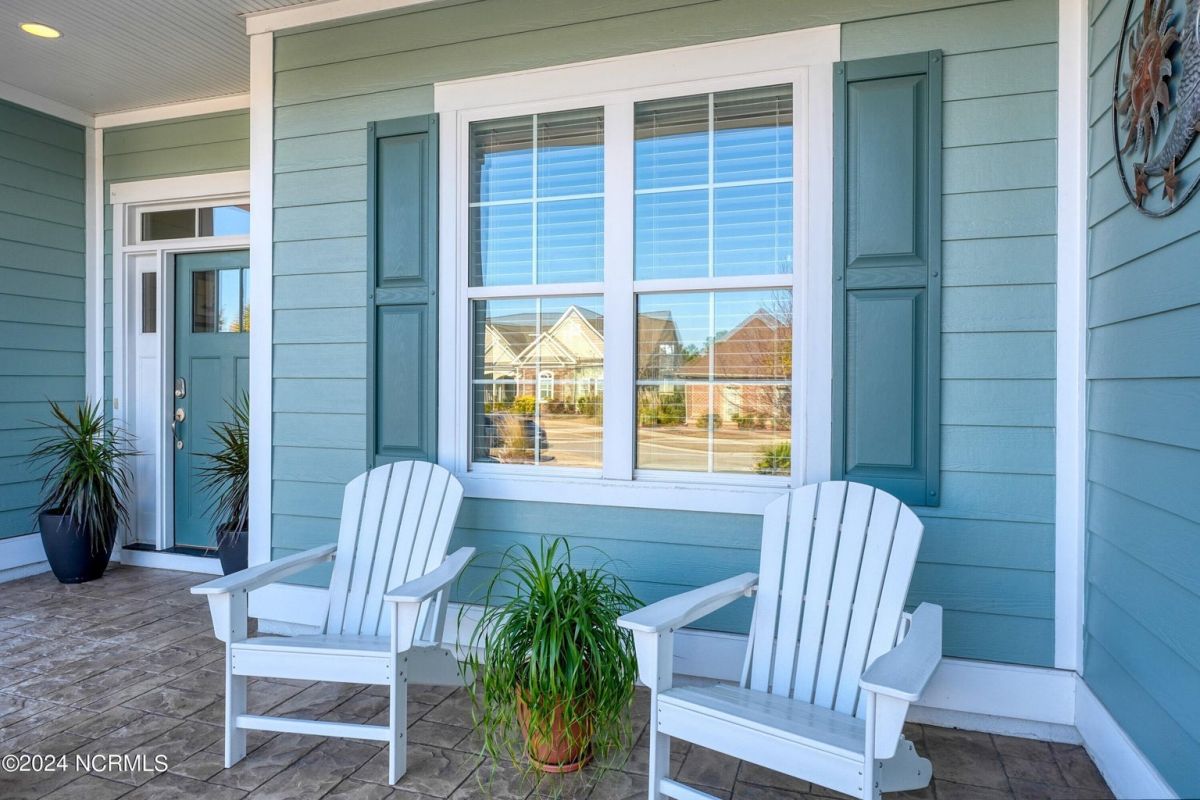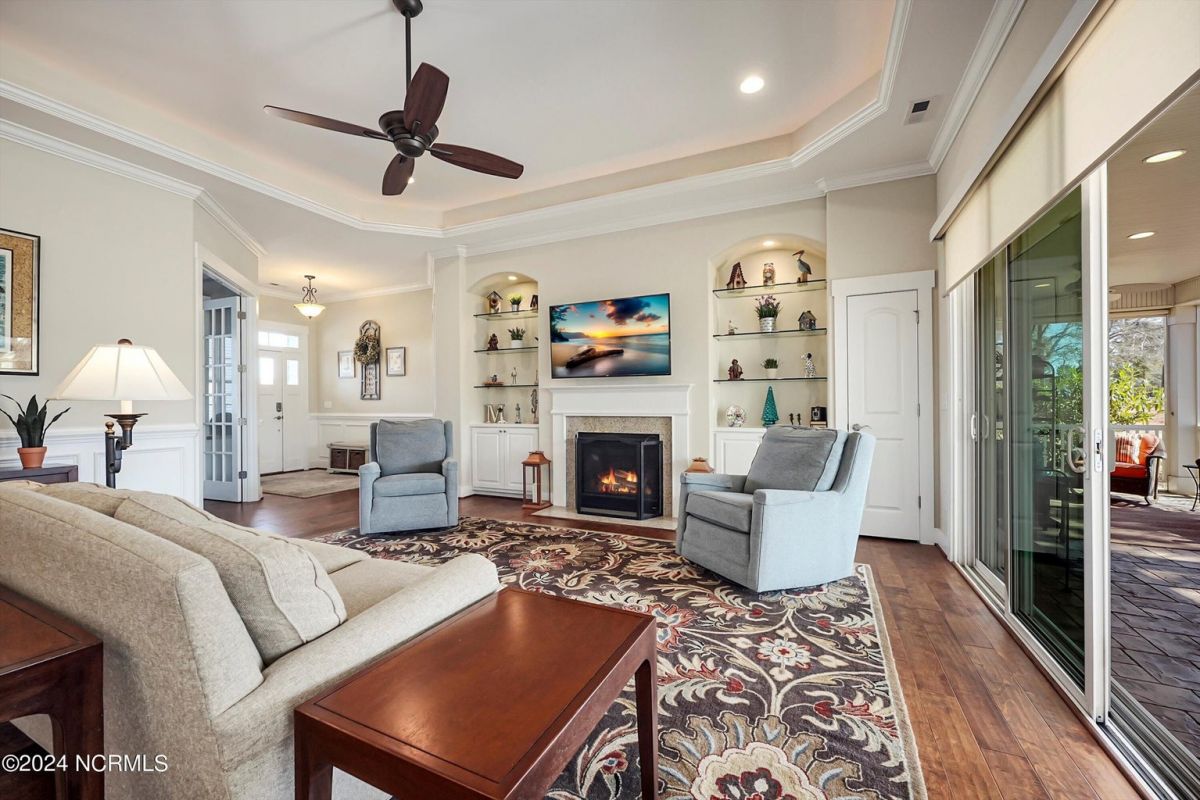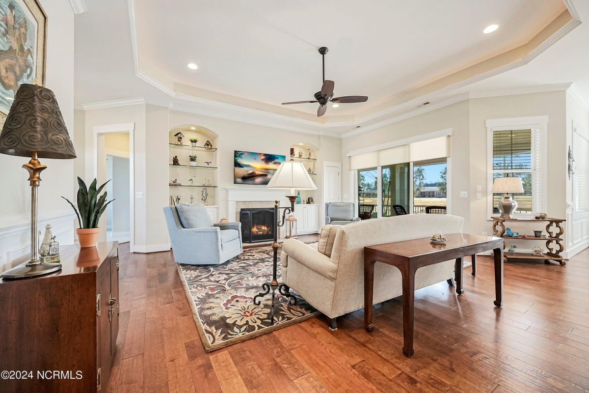 Welcome home! Better than new former Jonesport Model built by Kent Homes. Located on a coveted golf course lot, this home has been immaculately maintained and is move-in ready. Flooded with natural light, the open floorplan features soaring ceilings (trey and coffered), hardwood floors and a coastal vibe. You will enjoy the privacy of the open split floor plan. Upon entering the home, you will see the dedicated office off the foyer complete with built-in cabinets and bookshelves. The great room offers a gas fireplace with built-ins and shelves on either side. Enjoy cooking in your spacious kitchen, complete with an abundance of upper and lower cabinets and a generous sized island. The pantry (with an additional storage area) is not to be missed and will hold not only food staples but also small kitchen appliances. The generously sized light-filled dining room is perfect for entertaining. The Owner's suite has 2 walk-in closets, a large bathroom with split vanity and a spacious walk-in shower. The laundry room conveniently connects to the owner's ensuite. Private FROG with a fully tiled bath and multiple closets can be used as a bedroom or FLEX space. HUGE, floored attic for lots of storage. Restore and relax in your expansive Lanai overlooking the 9th fairway or under your shady Pergula. In addition, there is an oversized courtyard entry garage complete with epoxy floor and built-in storage cabinets. Recent upgrades include new carpet in the owner's suite, new paint, and a new Microwave. Compass Pointe offers a Grand Lanai, indoor pool, outdoor pool and a lazy river, fitness centers, tennis, pickleball, dog park, and trails. In addition to the wonderful amenities that are included in your HOA, you may choose, under separate membership, to join the Compass Pointe Private Golf Club/dining or fitness & social club. Conveniently located to beaches, medical, shopping and downtown Wilmington.