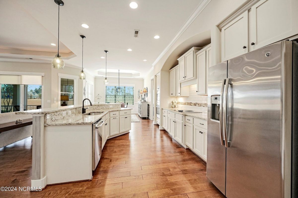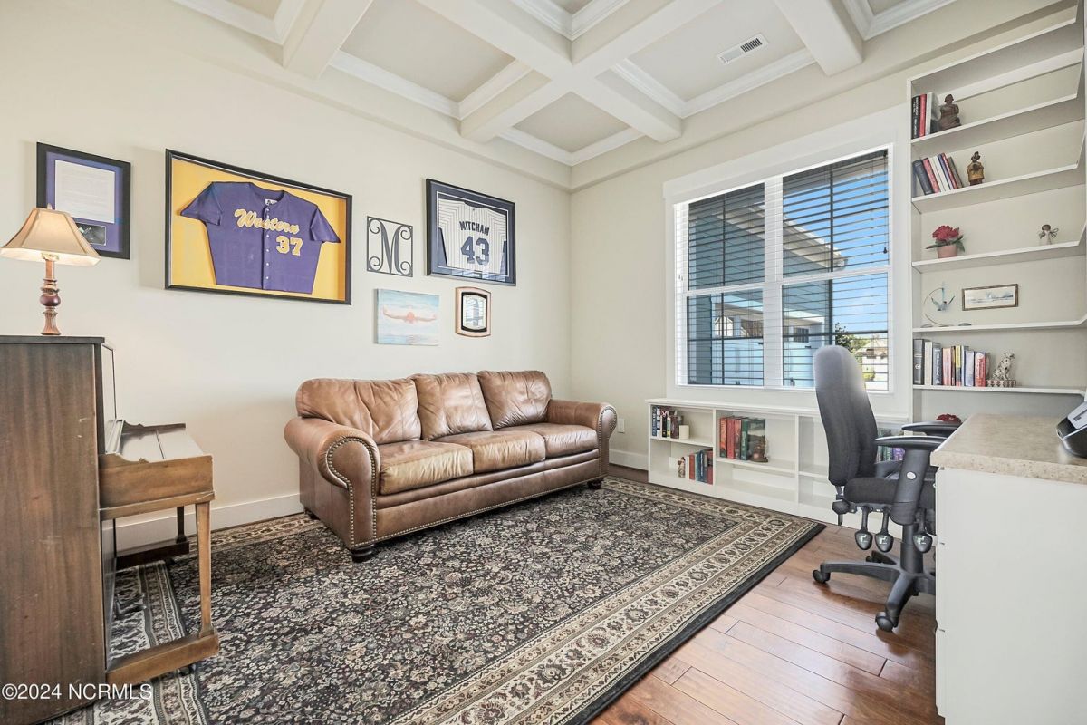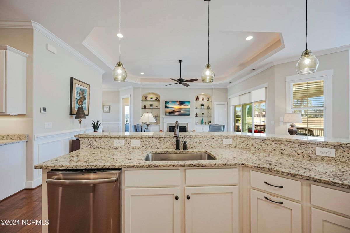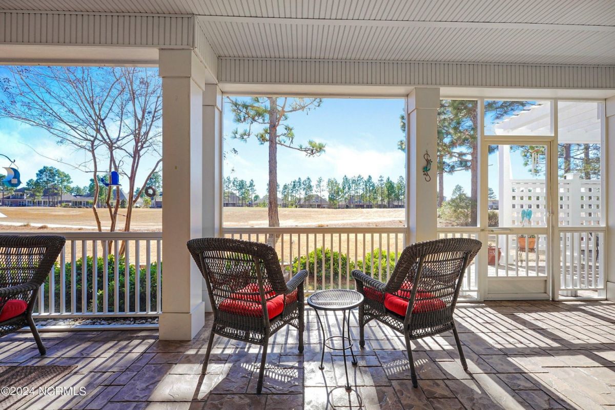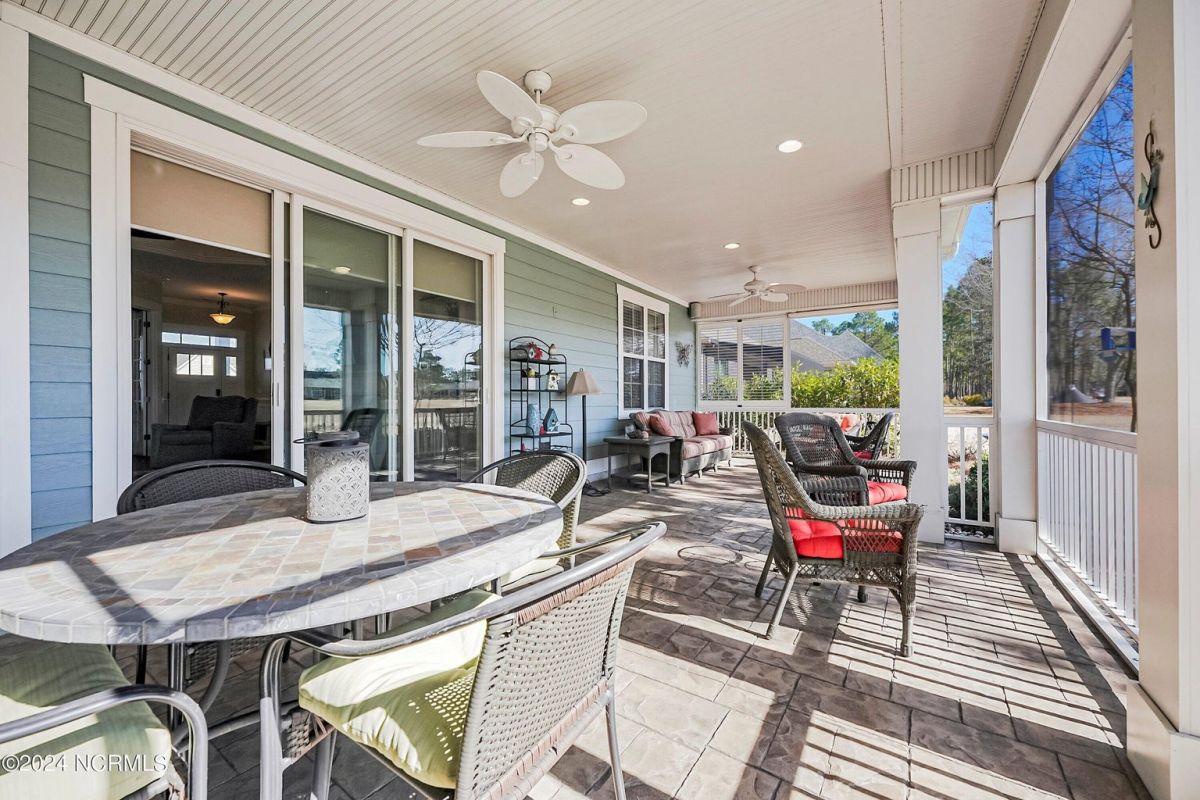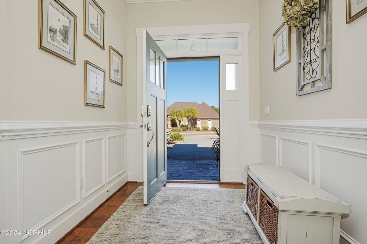 Welcome home! Better than new former Jonesport Model built by Kent Homes. Located on a coveted golf course lot, this home has been immaculately maintained and is move-in ready. Flooded with natural light, the open floorplan features soaring ceilings (trey and coffered), hardwood floors and a coastal vibe. You will enjoy the privacy of the open split floor plan. Upon entering the home, you will see the dedicated office off the foyer complete with built-in cabinets and bookshelves. The great room offers a gas fireplace with built-ins and shelves on either side. Enjoy cooking in your spacious kitchen, complete with an abundance of upper and lower cabinets and a generous sized island. The pantry (with an additional storage area) is not to be missed and will hold not only food staples but also small kitchen appliances. The generously sized light-filled dining room is perfect for entertaining. The Owner's suite has 2 walk-in closets, a large bathroom with split vanity and a spacious walk-in shower. The laundry room conveniently connects to the owner's ensuite. Private FROG with a fully tiled bath and multiple closets can be used as a bedroom or FLEX space. HUGE, floored attic for lots of storage. Restore and relax in your expansive Lanai overlooking the 9th fairway or under your shady Pergula. In addition, there is an oversized courtyard entry garage complete with epoxy floor and built-in storage cabinets. Recent upgrades include new carpet in the owner's suite, new paint, and a new Microwave. Compass Pointe offers a Grand Lanai, indoor pool, outdoor pool and a lazy river, fitness centers, tennis, pickleball, dog park, and trails. In addition to the wonderful amenities that are included in your HOA, you may choose, under separate membership, to join the Compass Pointe Private Golf Club/dining or fitness & social club. Conveniently located to beaches, medical, shopping and downtown Wilmington.