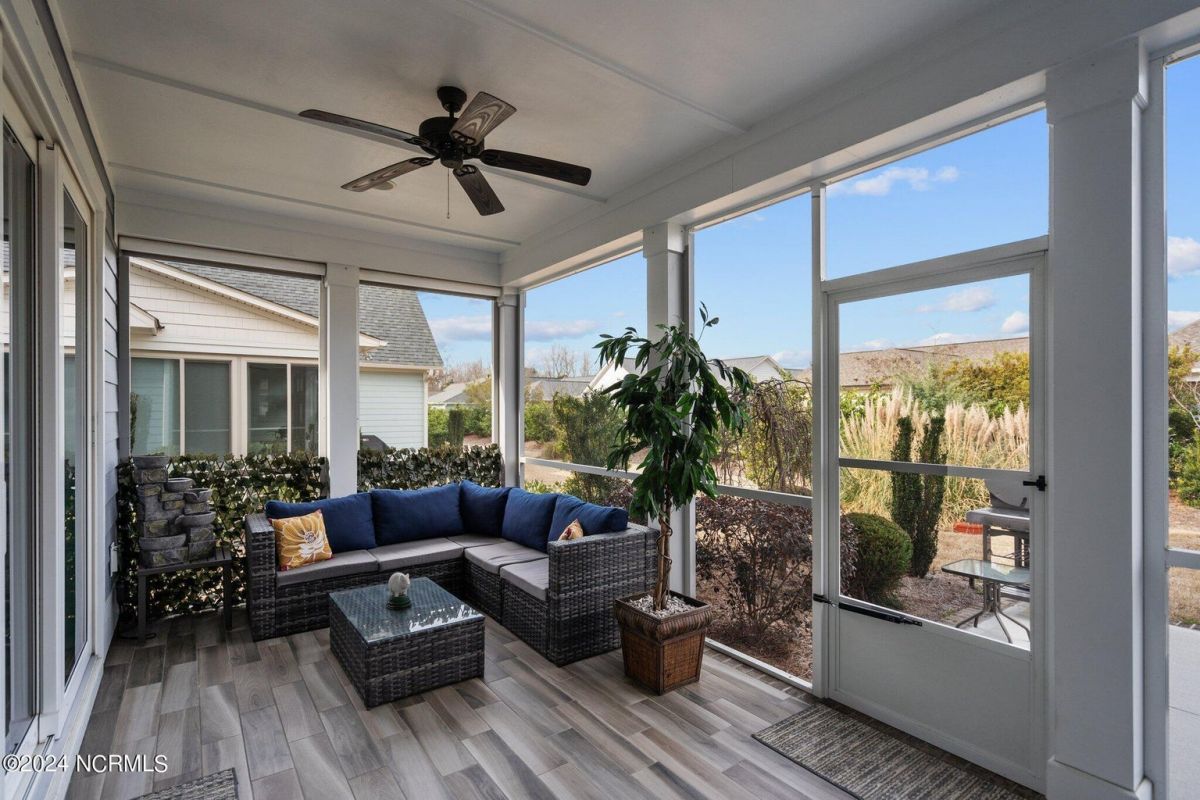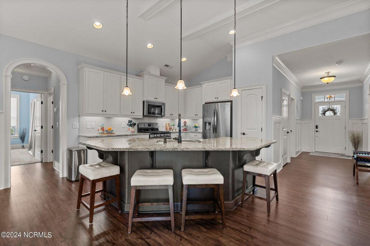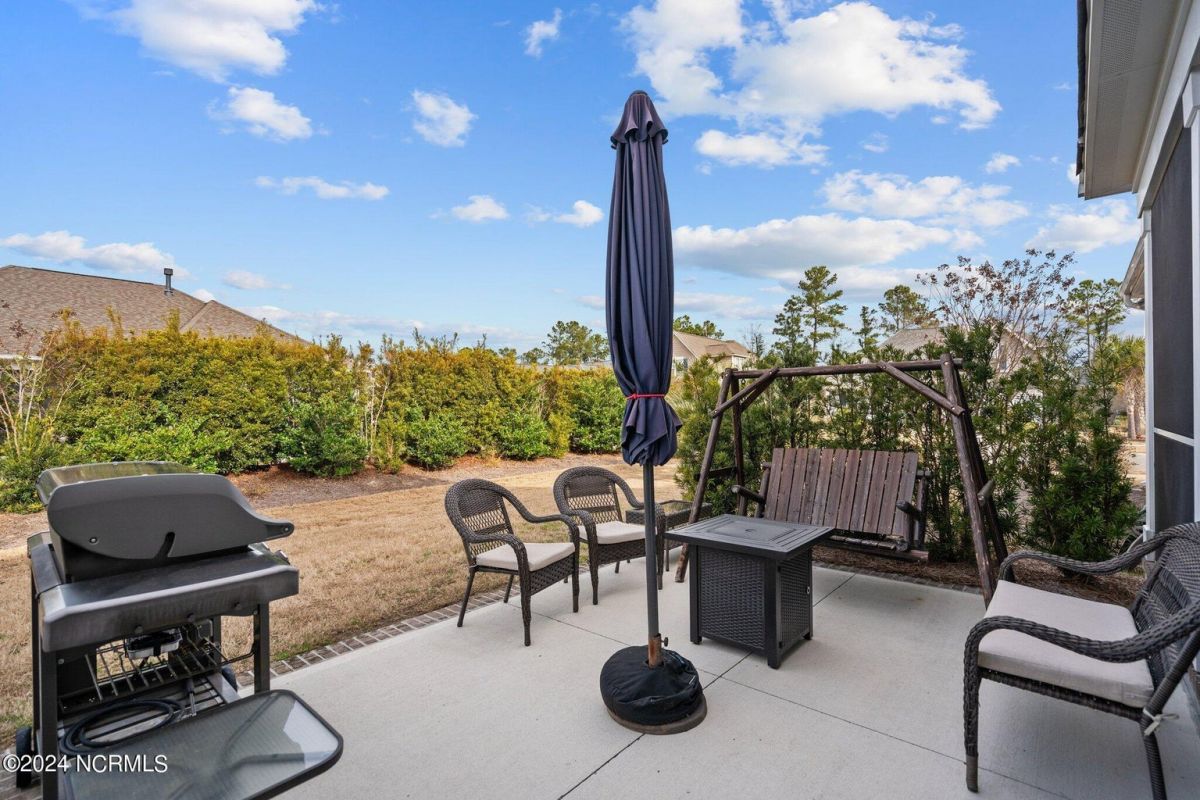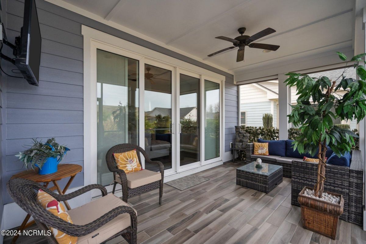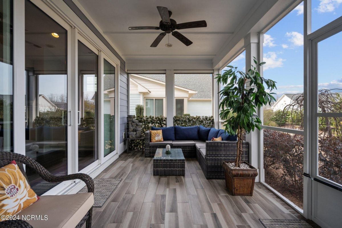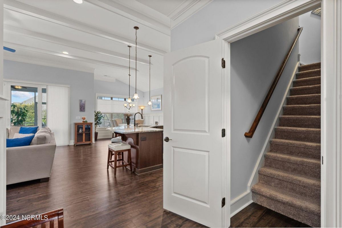 Enjoy life as an endless vacation in this gorgeous nearly new home built by Legacy Homes by Bill Clark nestled on a spacious corner lot in the prestigious community of Compass Pointe. Spanning 2,236 square feet, this home boasts luxury living at its finest with 4 bedrooms, 3 full bathrooms, and gorgeous details at every turn. Step inside to discover exquisite features such as luxury vinyl plank flooring, stunning arched doorways, exposed wooden beams, and double crown molding throughout. The gourmet kitchen highlights soft-close cabinetry with 42'' upper cabinets with crown trim, a gas range, convection microwave, Frigidaire Professional Stainless Steel appliances, beautiful tile backsplash, spacious pantry with wood shelving, granite counters, a large island, and a sunny breakfast nook with gorgeous wainscoting. Enjoy cozy evenings by the gas fireplace flanked by built-ins in the living room. Your impressive first-floor master suite boasts a beautiful tray ceiling with indirect lighting, a large walk-in closet with dual sides, and an en suite bathroom featuring double vanities and an oversized tiled walk-in shower with an ornate pebble floor. Upstairs, you'll find a large bedroom with a full bathroom and plenty of walk-in attic storage. Spend a relaxing evening on your expansive screened porch with beautiful porcelain tile floors. Additional features include an incredible laundry/mud room with a built-in drop zone, a two-car garage, and a 12'x14' concrete patio. The HOA dues include yard maintenance for additional convenience. The amenity-rich, gated community of Compass Pointe in Leland offers life as an endless vacation. A private, 18-hole golf course, a kayak launch on Cardinal Lake, an outdoor resort pool with a lazy river, an indoor pool, tennis and pickleball courts, a wellness center with a full gym and sauna, a dog park for your furry friends, and numerous walking and biking trails along scenic marshes. Call today to make this exquisite home yours!