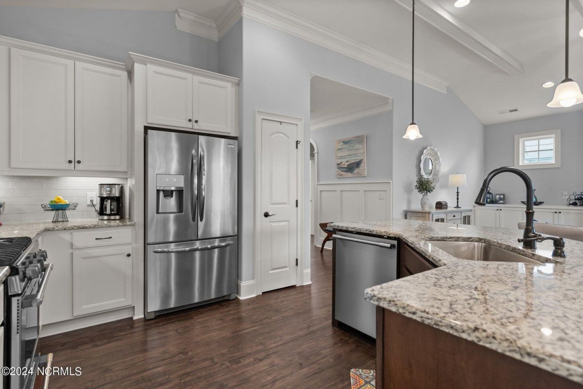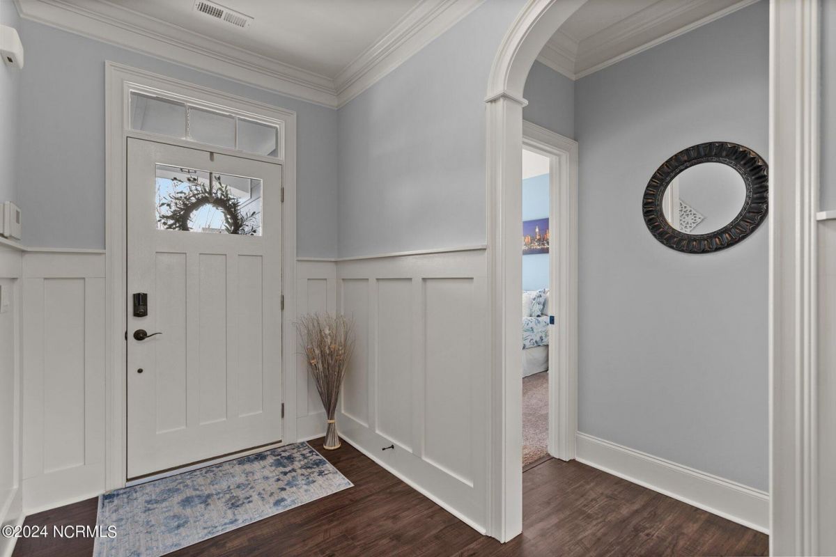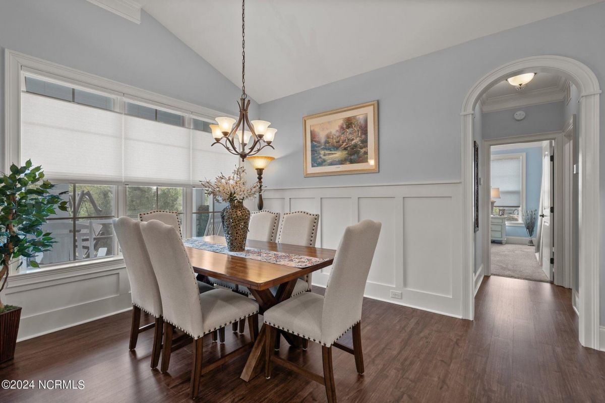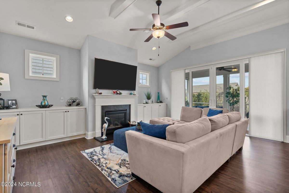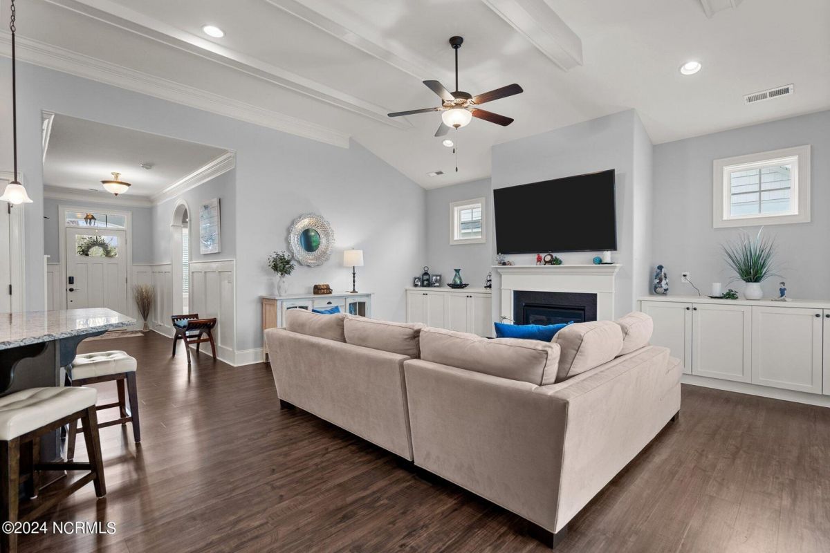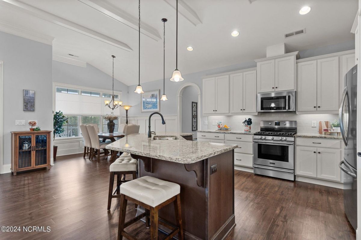 Enjoy life as an endless vacation in this gorgeous nearly new home built by Legacy Homes by Bill Clark nestled on a spacious corner lot in the prestigious community of Compass Pointe. Spanning 2,236 square feet, this home boasts luxury living at its finest with 4 bedrooms, 3 full bathrooms, and gorgeous details at every turn. Step inside to discover exquisite features such as luxury vinyl plank flooring, stunning arched doorways, exposed wooden beams, and double crown molding throughout. The gourmet kitchen highlights soft-close cabinetry with 42'' upper cabinets with crown trim, a gas range, convection microwave, Frigidaire Professional Stainless Steel appliances, beautiful tile backsplash, spacious pantry with wood shelving, granite counters, a large island, and a sunny breakfast nook with gorgeous wainscoting. Enjoy cozy evenings by the gas fireplace flanked by built-ins in the living room. Your impressive first-floor master suite boasts a beautiful tray ceiling with indirect lighting, a large walk-in closet with dual sides, and an en suite bathroom featuring double vanities and an oversized tiled walk-in shower with an ornate pebble floor. Upstairs, you'll find a large bedroom with a full bathroom and plenty of walk-in attic storage. Spend a relaxing evening on your expansive screened porch with beautiful porcelain tile floors. Additional features include an incredible laundry/mud room with a built-in drop zone, a two-car garage, and a 12'x14' concrete patio. The HOA dues include yard maintenance for additional convenience. The amenity-rich, gated community of Compass Pointe in Leland offers life as an endless vacation. A private, 18-hole golf course, a kayak launch on Cardinal Lake, an outdoor resort pool with a lazy river, an indoor pool, tennis and pickleball courts, a wellness center with a full gym and sauna, a dog park for your furry friends, and numerous walking and biking trails along scenic marshes. Call today to make this exquisite home yours!