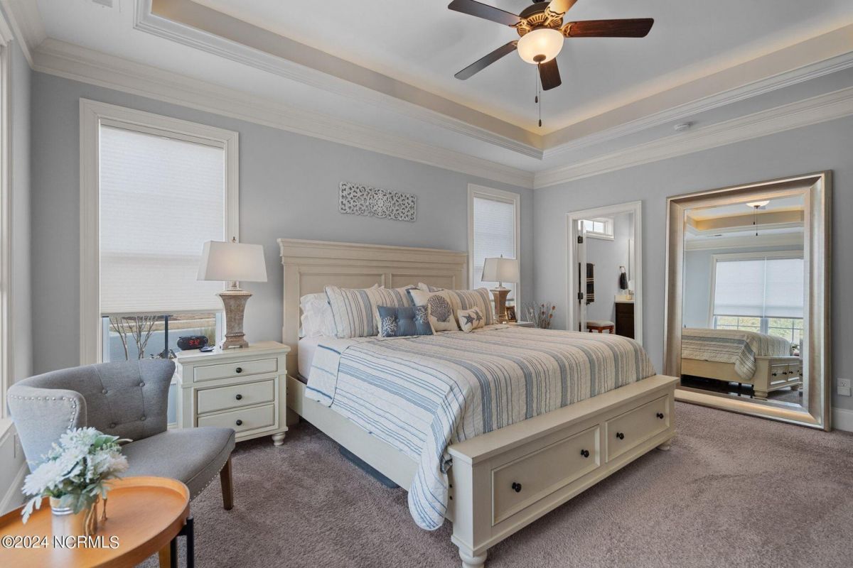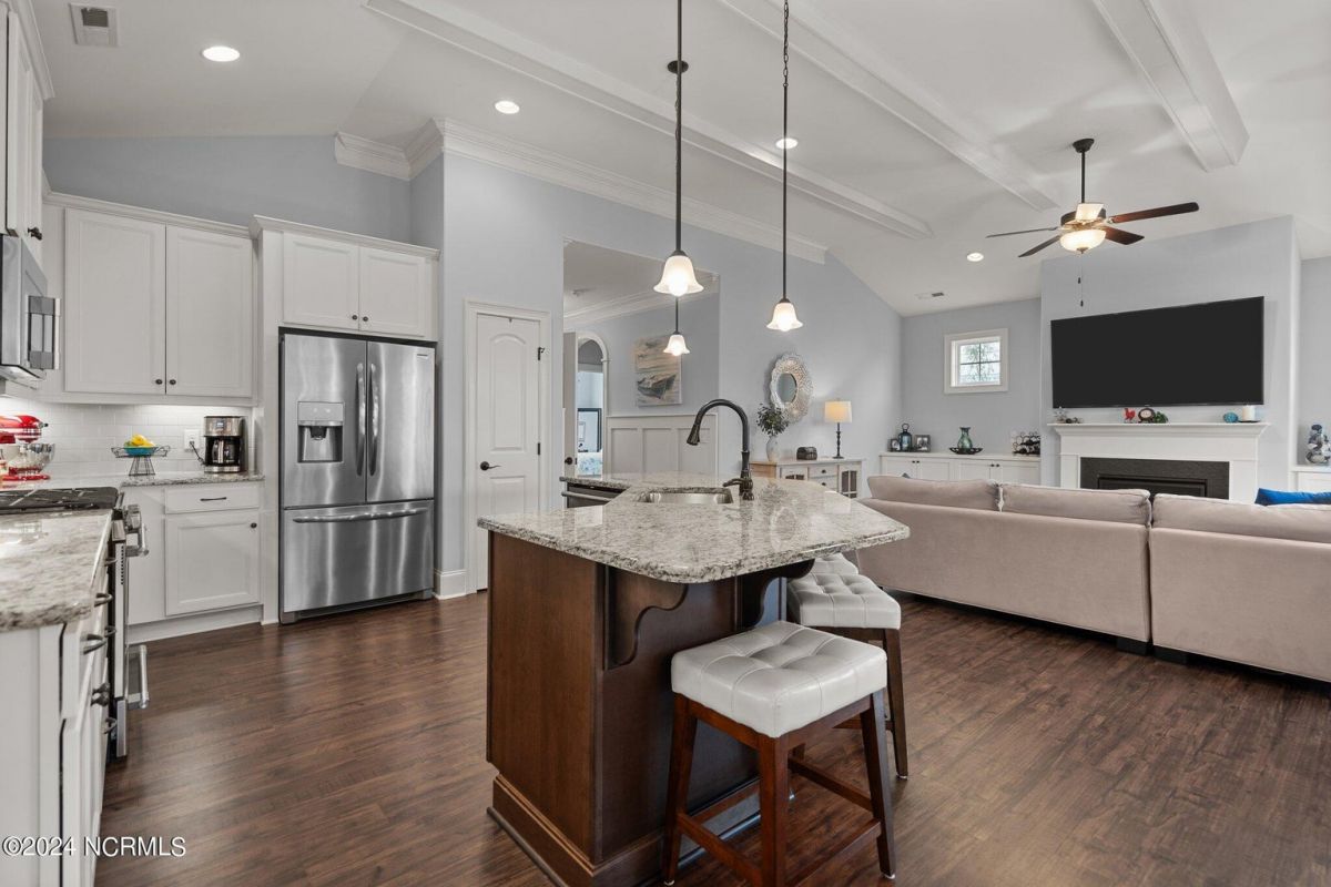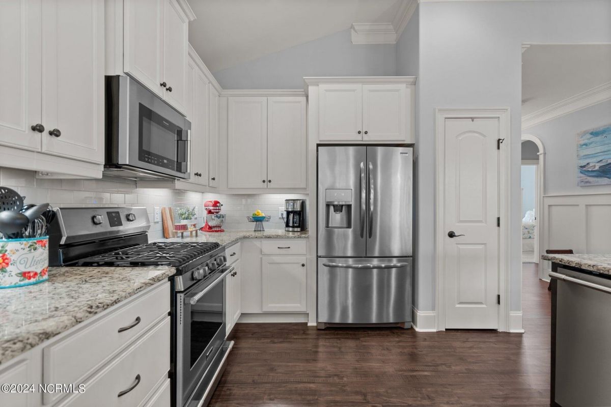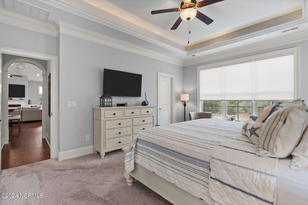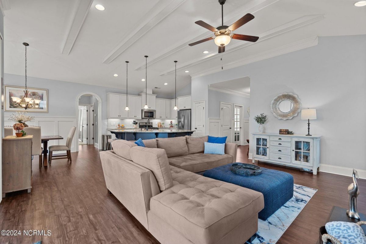 Enjoy life as an endless vacation in this gorgeous nearly new home built by Legacy Homes by Bill Clark nestled on a spacious corner lot in the prestigious community of Compass Pointe. Spanning 2,236 square feet, this home boasts luxury living at its finest with 4 bedrooms, 3 full bathrooms, and gorgeous details at every turn. Step inside to discover exquisite features such as luxury vinyl plank flooring, stunning arched doorways, exposed wooden beams, and double crown molding throughout. The gourmet kitchen highlights soft-close cabinetry with 42'' upper cabinets with crown trim, a gas range, convection microwave, Frigidaire Professional Stainless Steel appliances, beautiful tile backsplash, spacious pantry with wood shelving, granite counters, a large island, and a sunny breakfast nook with gorgeous wainscoting. Enjoy cozy evenings by the gas fireplace flanked by built-ins in the living room. Your impressive first-floor master suite boasts a beautiful tray ceiling with indirect lighting, a large walk-in closet with dual sides, and an en suite bathroom featuring double vanities and an oversized tiled walk-in shower with an ornate pebble floor. Upstairs, you'll find a large bedroom with a full bathroom and plenty of walk-in attic storage. Spend a relaxing evening on your expansive screened porch with beautiful porcelain tile floors. Additional features include an incredible laundry/mud room with a built-in drop zone, a two-car garage, and a 12'x14' concrete patio. The HOA dues include yard maintenance for additional convenience. The amenity-rich, gated community of Compass Pointe in Leland offers life as an endless vacation. A private, 18-hole golf course, a kayak launch on Cardinal Lake, an outdoor resort pool with a lazy river, an indoor pool, tennis and pickleball courts, a wellness center with a full gym and sauna, a dog park for your furry friends, and numerous walking and biking trails along scenic marshes. Call today to make this exquisite home yours!