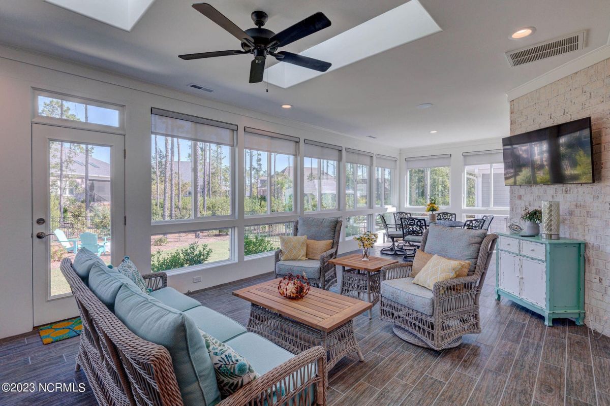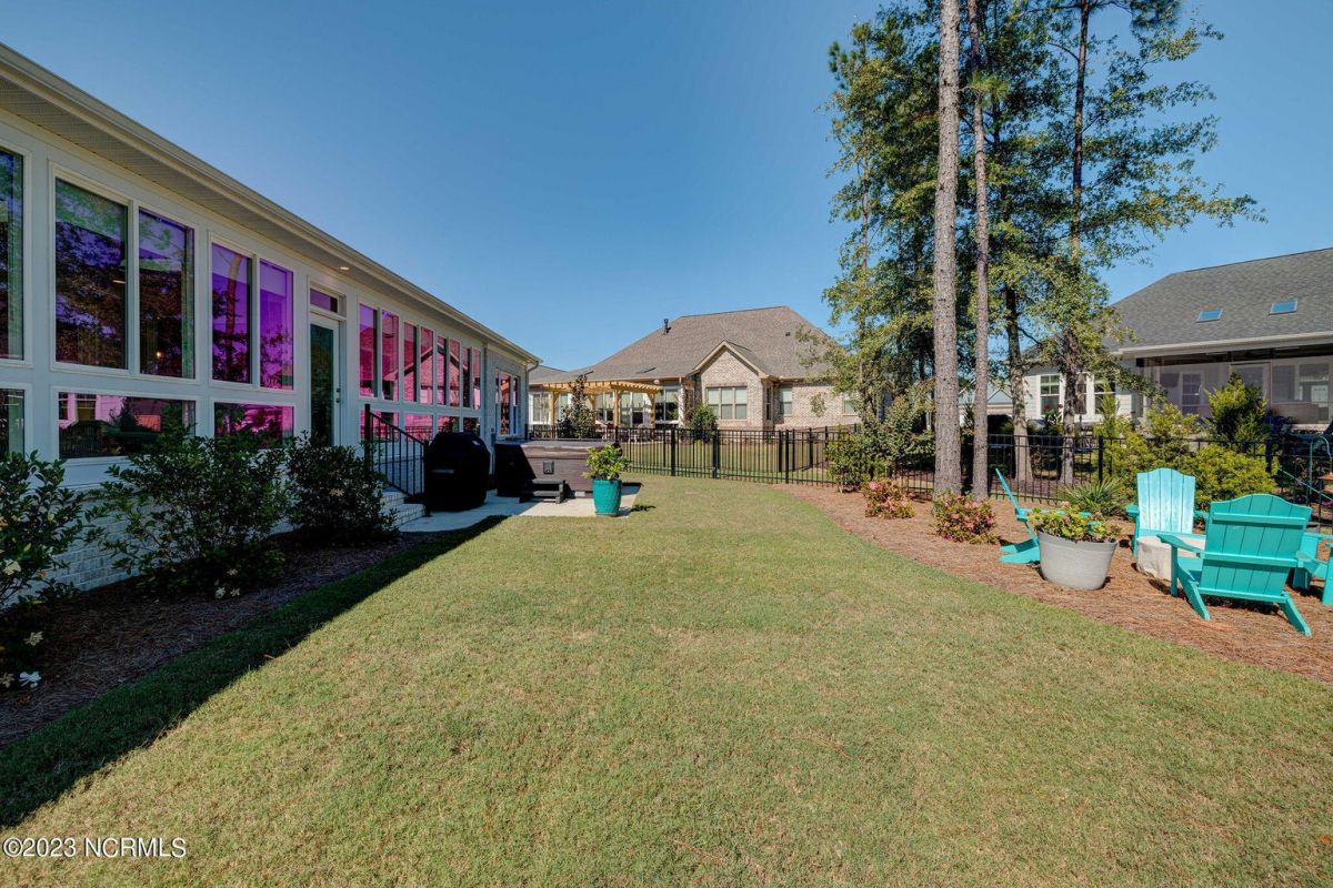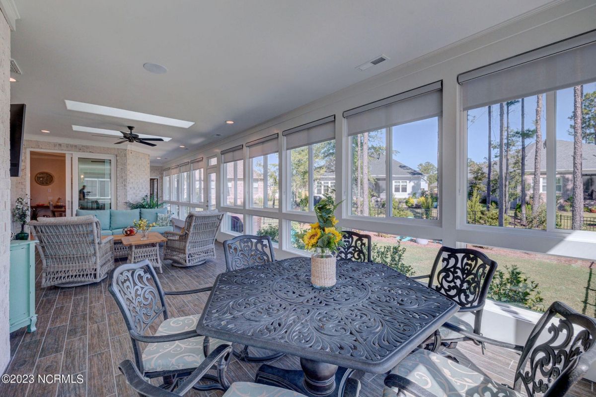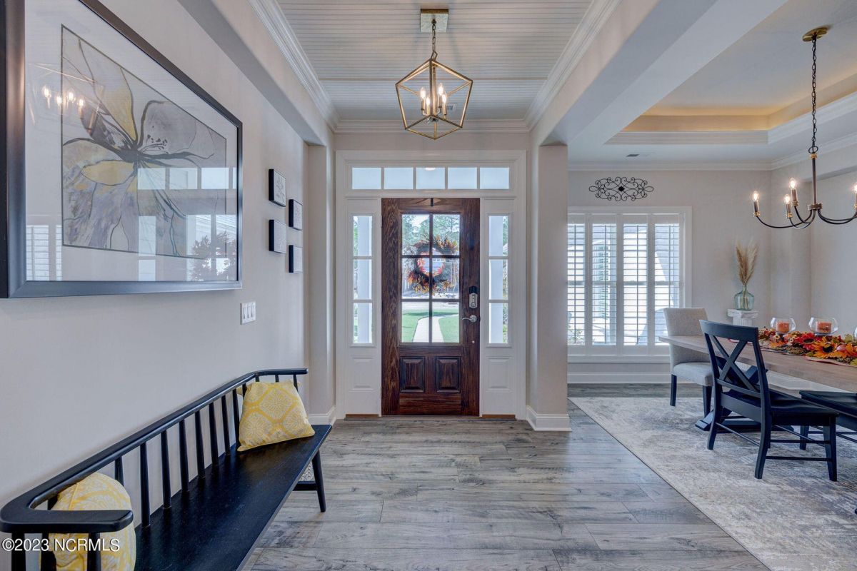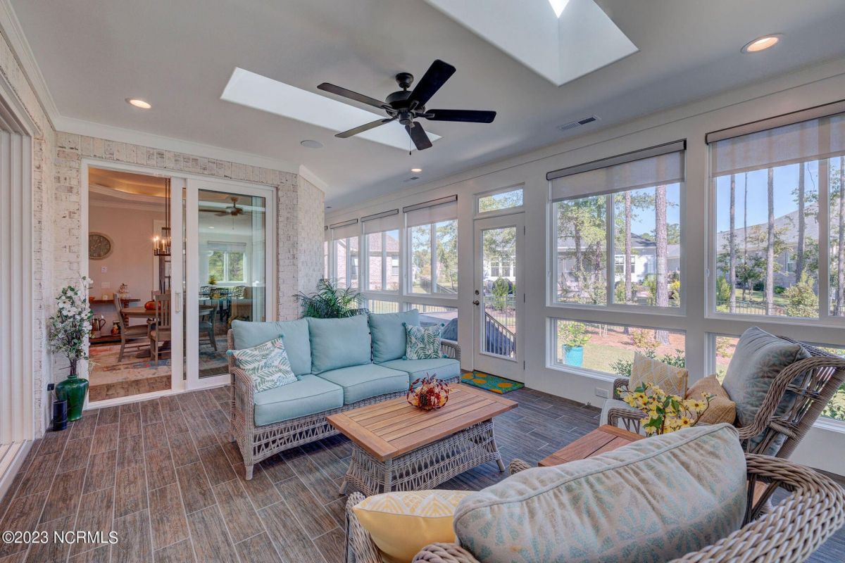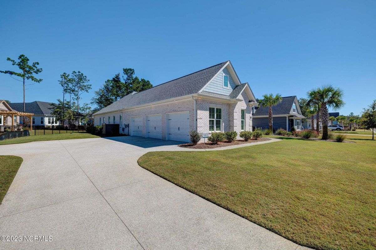 This like new move-in read Trusst built Trinity I home located in the new Timber Ridge section of Compass Pointe is a single level plan featuring three bedrooms, two and half baths, living room, formal dining room plus kitchen eating area, a beautiful den, large laundry room and a fabulous sunroom across most of the back of the home. It boasts quality construction with all (white) brick (quoined corners and other detail) with composite hardy board material accents in a coastal blue hue with large paver front porch lets you enjoy evening sunsets or a morning coffee. The front yard has extensive upgraded landscaping (note size of palms and other plants) with professional up lighting on palms and Japanese maple in front of home and zoned irrigation system. Exterior recessed ''down lighting'' in soffit across front and rear of home, above garage doors and on front porch make for a beautiful nighttime appearance. Fenced in back yard has been ''floated'' in which creates a grass ''perimeter of sorts''. Neighboring fences are both on property line and surveyor indicates this yard can accommodate a pool (subject to MOA approval). Huge side entry oversized three car garage. Features include three individual 9' wide doors (builder standard garage is a single 16' wide door) lots of room even with three cars inside. Fully painted and finished with epoxy floor, five windows and Minka ceiling fans for a cool breeze. Extra outlets added throughout including proper dedicated outlet for a refrigerator and one for a high wall mounted TV (also a cable jack), and an extra garden hose spigot. The heavy duty pull stairs in the garage provides convenient access to very large lighted attic storage area with flooring added above much of home. Beautiful accent ceilings throughout - including coffered ceilings in living room and den; dining room, eating area, primary bedroom and primary bath all feature lighted tray ceilings, entry way includes a tongue and groove accent ceiling. Custom built-in cabinets flank the beautiful, raised fireplace and extensive wood trim, crown molding throughout including all bedrooms and laundry room. See Features in the document section to see more details about this fabulous home!