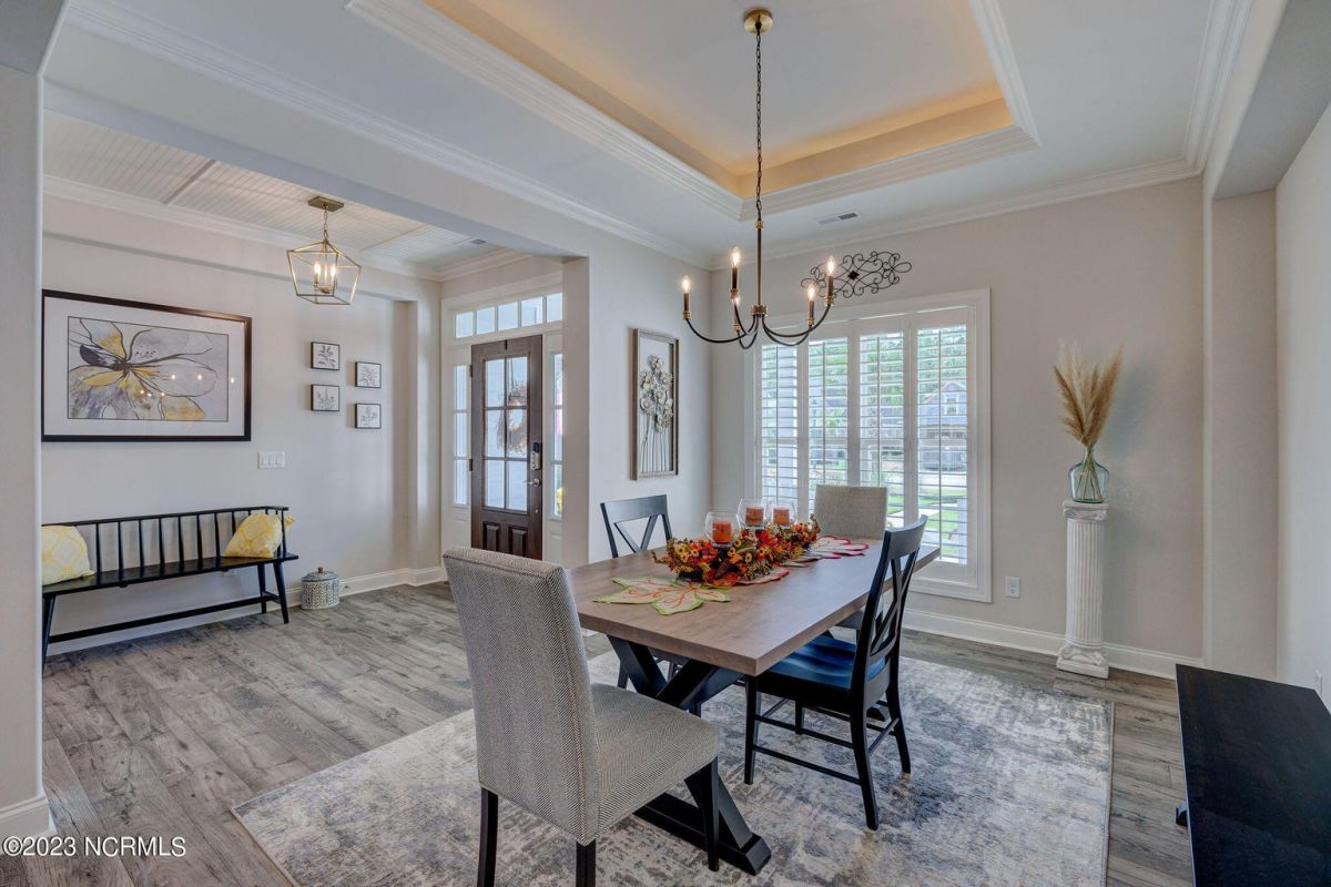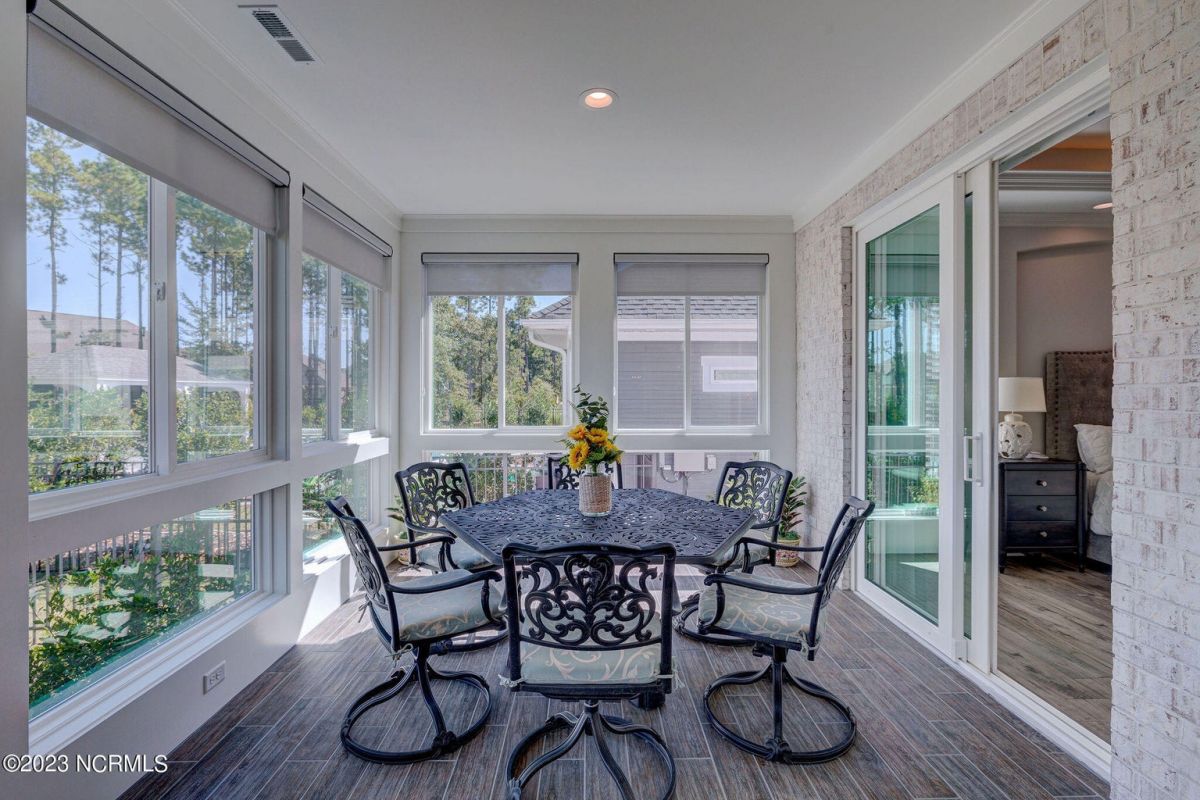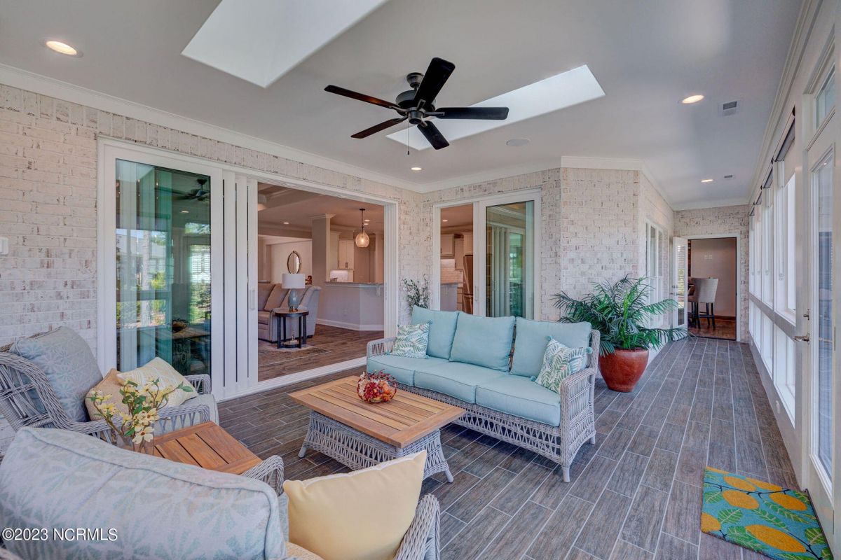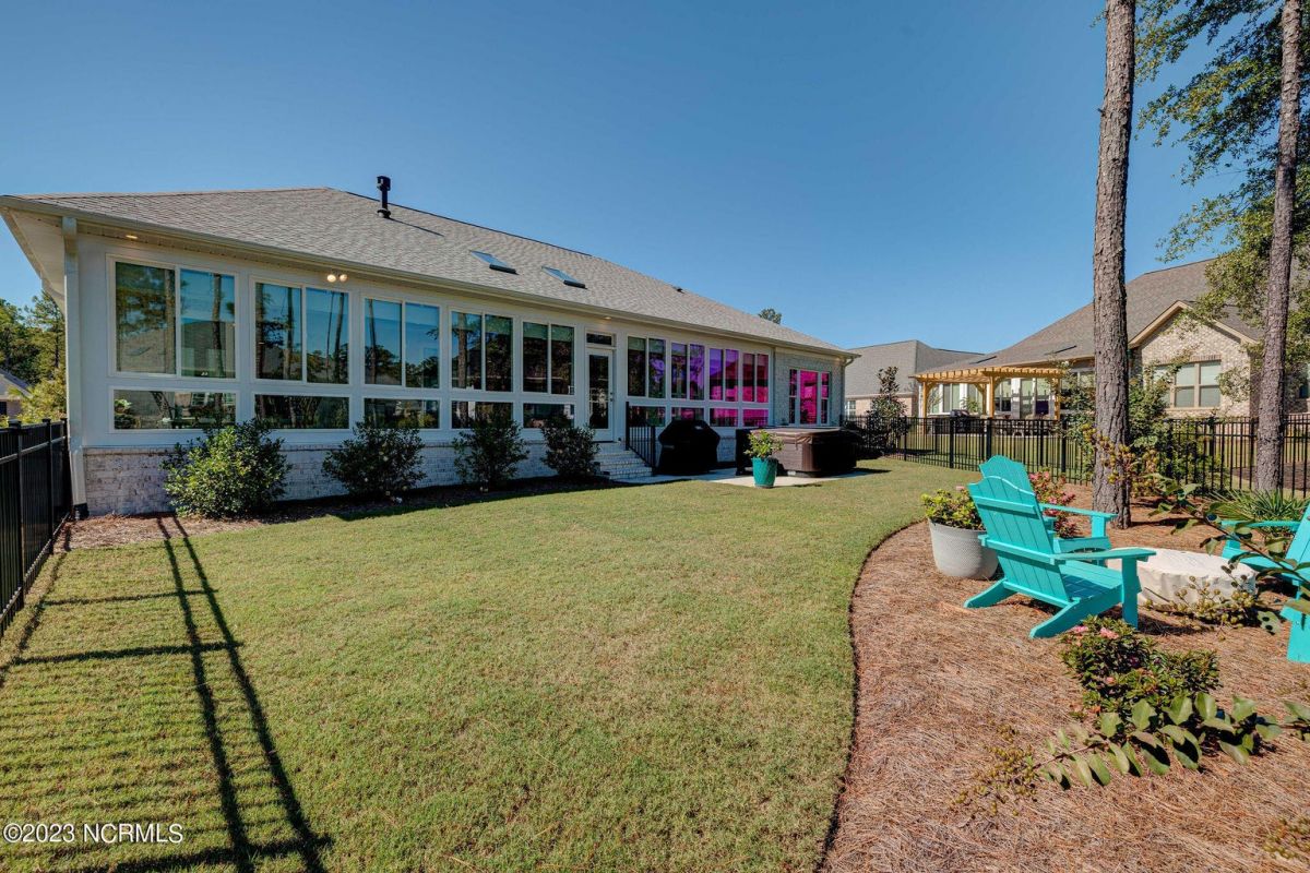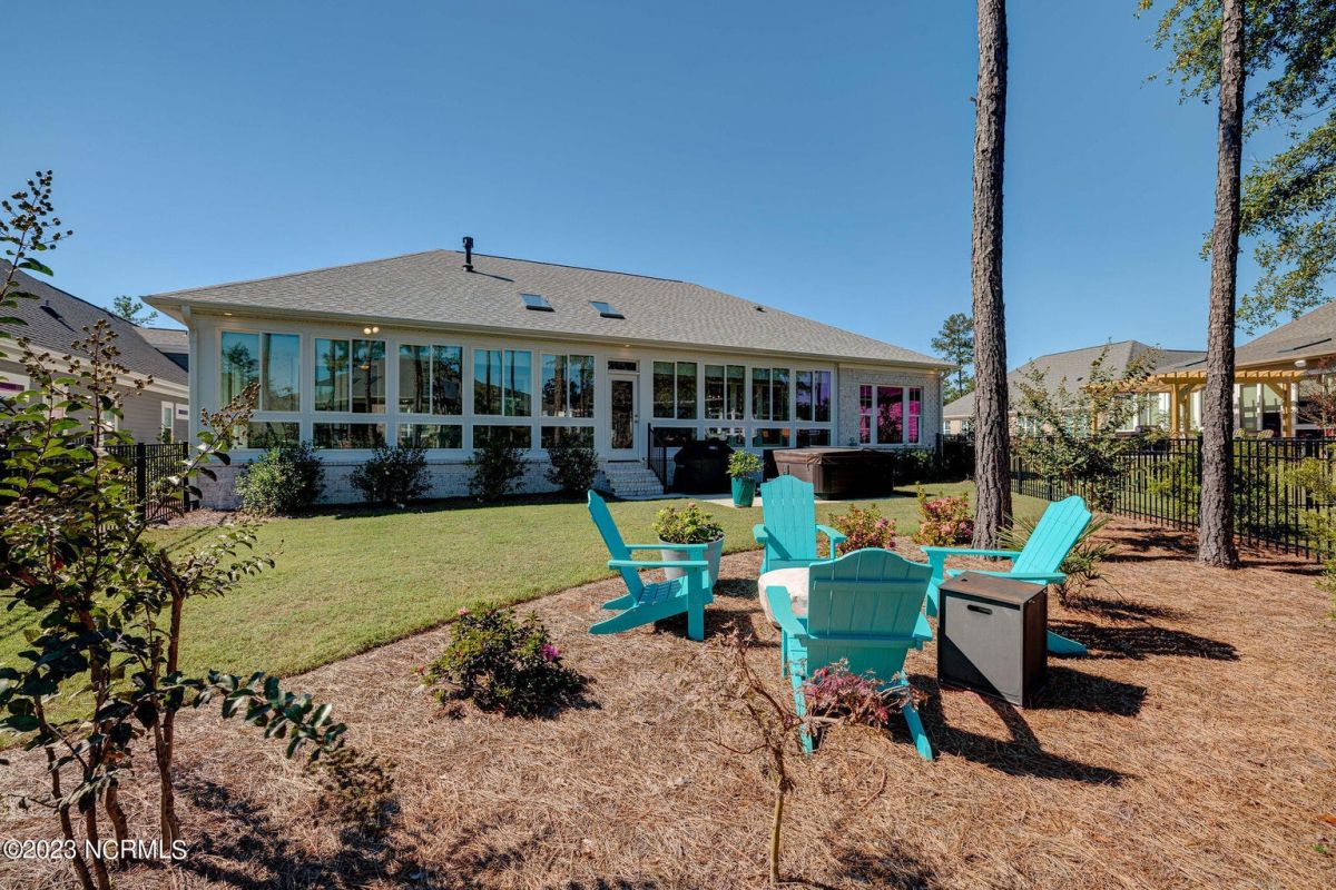 This like new move-in read Trusst built Trinity I home located in the new Timber Ridge section of Compass Pointe is a single level plan featuring three bedrooms, two and half baths, living room, formal dining room plus kitchen eating area, a beautiful den, large laundry room and a fabulous sunroom across most of the back of the home. It boasts quality construction with all (white) brick (quoined corners and other detail) with composite hardy board material accents in a coastal blue hue with large paver front porch lets you enjoy evening sunsets or a morning coffee. The front yard has extensive upgraded landscaping (note size of palms and other plants) with professional up lighting on palms and Japanese maple in front of home and zoned irrigation system. Exterior recessed ''down lighting'' in soffit across front and rear of home, above garage doors and on front porch make for a beautiful nighttime appearance. Fenced in back yard has been ''floated'' in which creates a grass ''perimeter of sorts''. Neighboring fences are both on property line and surveyor indicates this yard can accommodate a pool (subject to MOA approval). Huge side entry oversized three car garage. Features include three individual 9' wide doors (builder standard garage is a single 16' wide door) lots of room even with three cars inside. Fully painted and finished with epoxy floor, five windows and Minka ceiling fans for a cool breeze. Extra outlets added throughout including proper dedicated outlet for a refrigerator and one for a high wall mounted TV (also a cable jack), and an extra garden hose spigot. The heavy duty pull stairs in the garage provides convenient access to very large lighted attic storage area with flooring added above much of home. Beautiful accent ceilings throughout - including coffered ceilings in living room and den; dining room, eating area, primary bedroom and primary bath all feature lighted tray ceilings, entry way includes a tongue and groove accent ceiling. Custom built-in cabinets flank the beautiful, raised fireplace and extensive wood trim, crown molding throughout including all bedrooms and laundry room. See Features in the document section to see more details about this fabulous home!