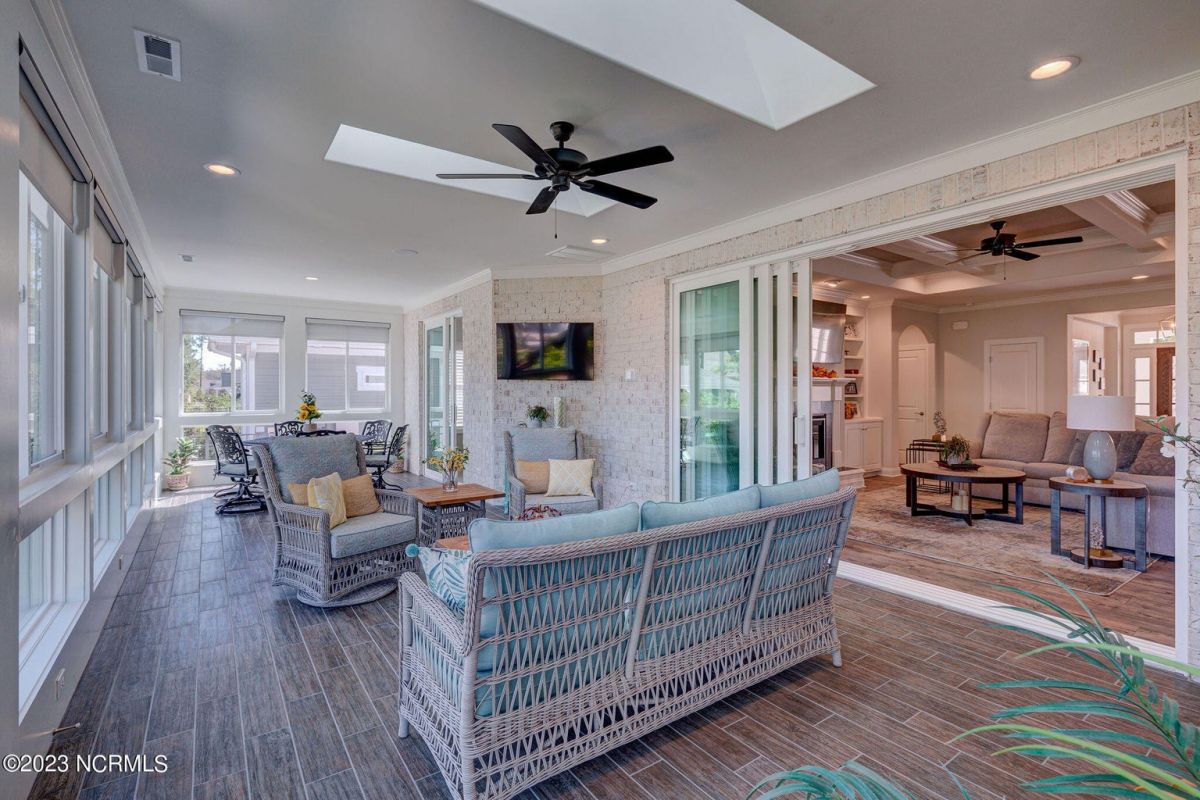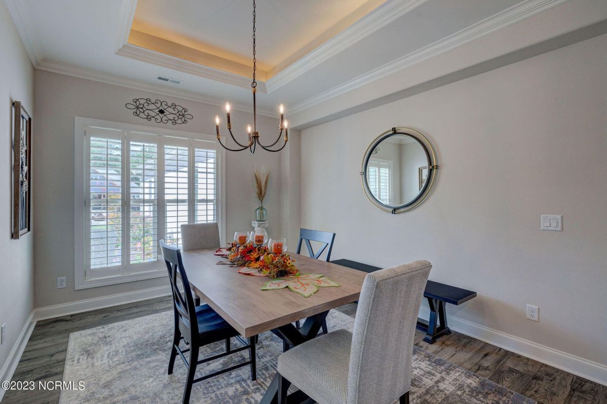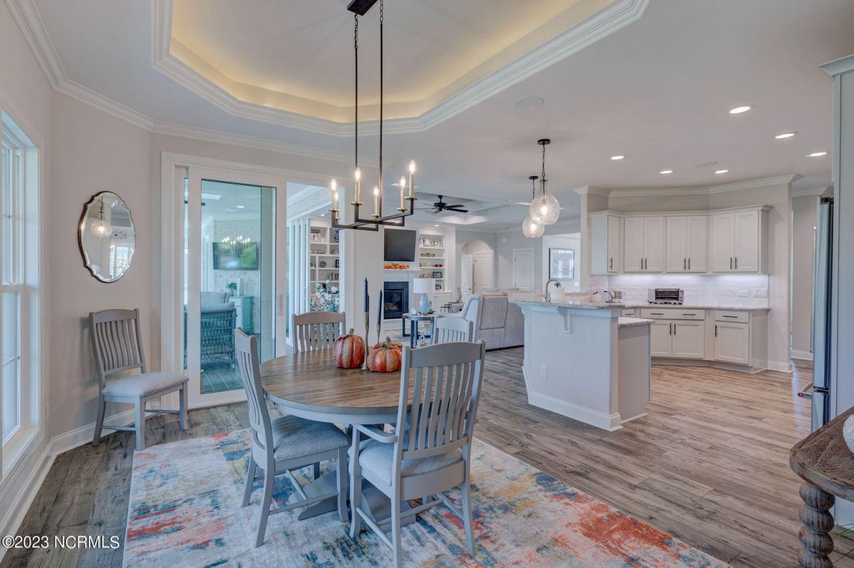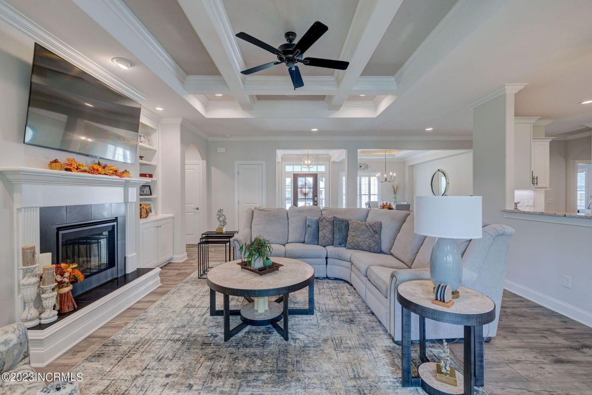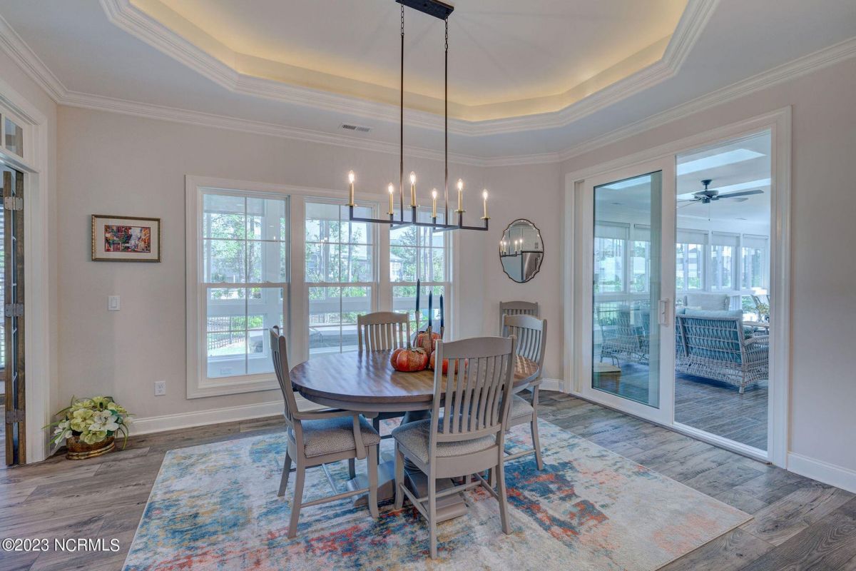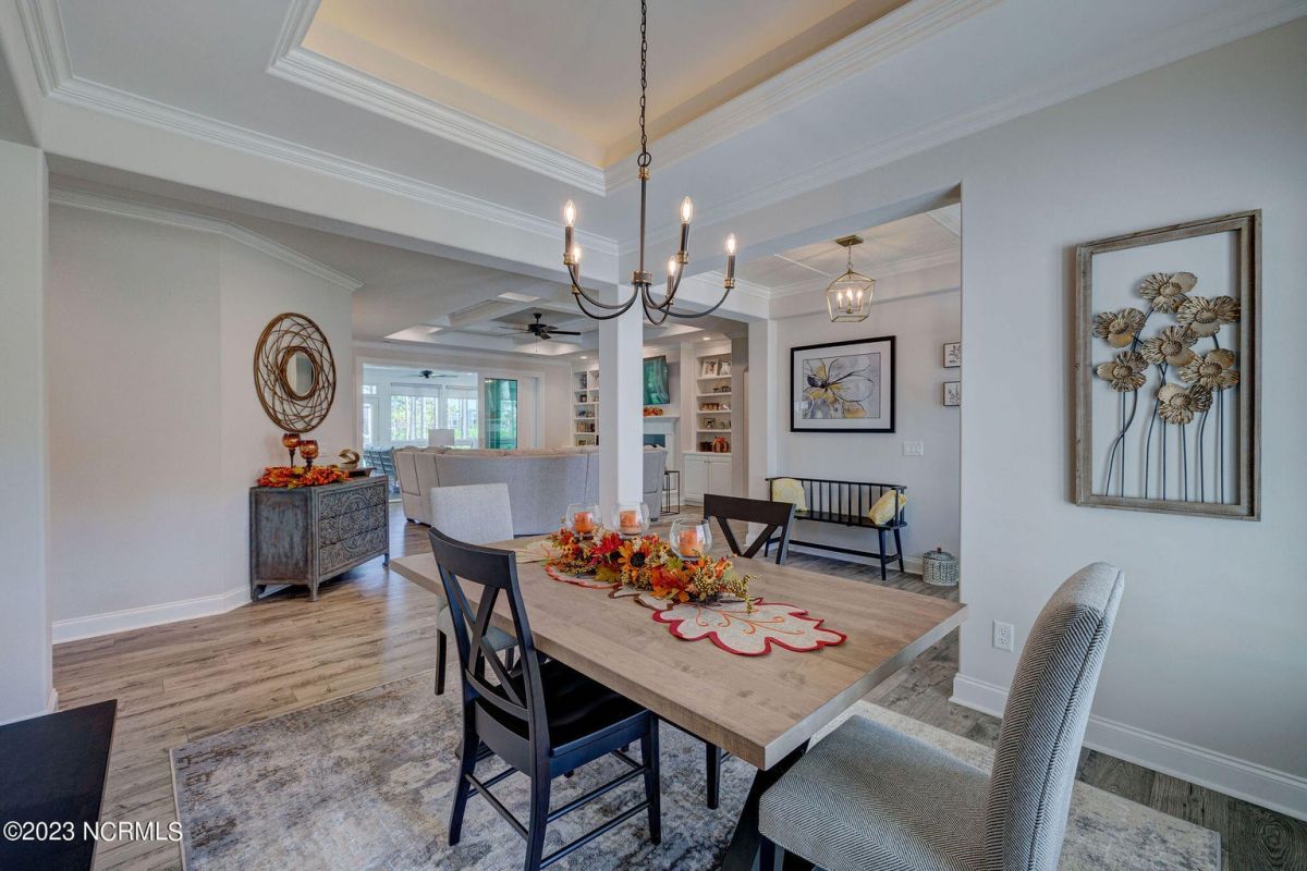 This like new move-in read Trusst built Trinity I home located in the new Timber Ridge section of Compass Pointe is a single level plan featuring three bedrooms, two and half baths, living room, formal dining room plus kitchen eating area, a beautiful den, large laundry room and a fabulous sunroom across most of the back of the home. It boasts quality construction with all (white) brick (quoined corners and other detail) with composite hardy board material accents in a coastal blue hue with large paver front porch lets you enjoy evening sunsets or a morning coffee. The front yard has extensive upgraded landscaping (note size of palms and other plants) with professional up lighting on palms and Japanese maple in front of home and zoned irrigation system. Exterior recessed ''down lighting'' in soffit across front and rear of home, above garage doors and on front porch make for a beautiful nighttime appearance. Fenced in back yard has been ''floated'' in which creates a grass ''perimeter of sorts''. Neighboring fences are both on property line and surveyor indicates this yard can accommodate a pool (subject to MOA approval). Huge side entry oversized three car garage. Features include three individual 9' wide doors (builder standard garage is a single 16' wide door) lots of room even with three cars inside. Fully painted and finished with epoxy floor, five windows and Minka ceiling fans for a cool breeze. Extra outlets added throughout including proper dedicated outlet for a refrigerator and one for a high wall mounted TV (also a cable jack), and an extra garden hose spigot. The heavy duty pull stairs in the garage provides convenient access to very large lighted attic storage area with flooring added above much of home. Beautiful accent ceilings throughout - including coffered ceilings in living room and den; dining room, eating area, primary bedroom and primary bath all feature lighted tray ceilings, entry way includes a tongue and groove accent ceiling. Custom built-in cabinets flank the beautiful, raised fireplace and extensive wood trim, crown molding throughout including all bedrooms and laundry room. See Features in the document section to see more details about this fabulous home!