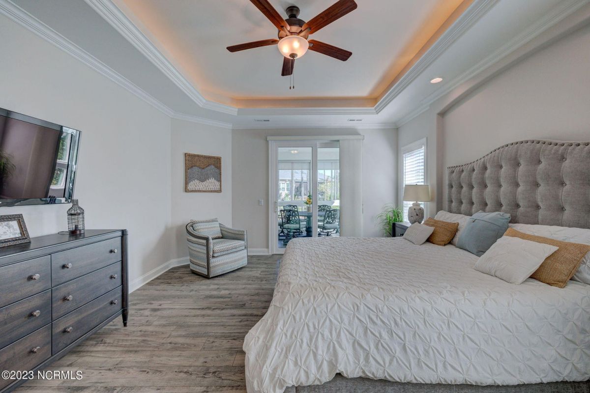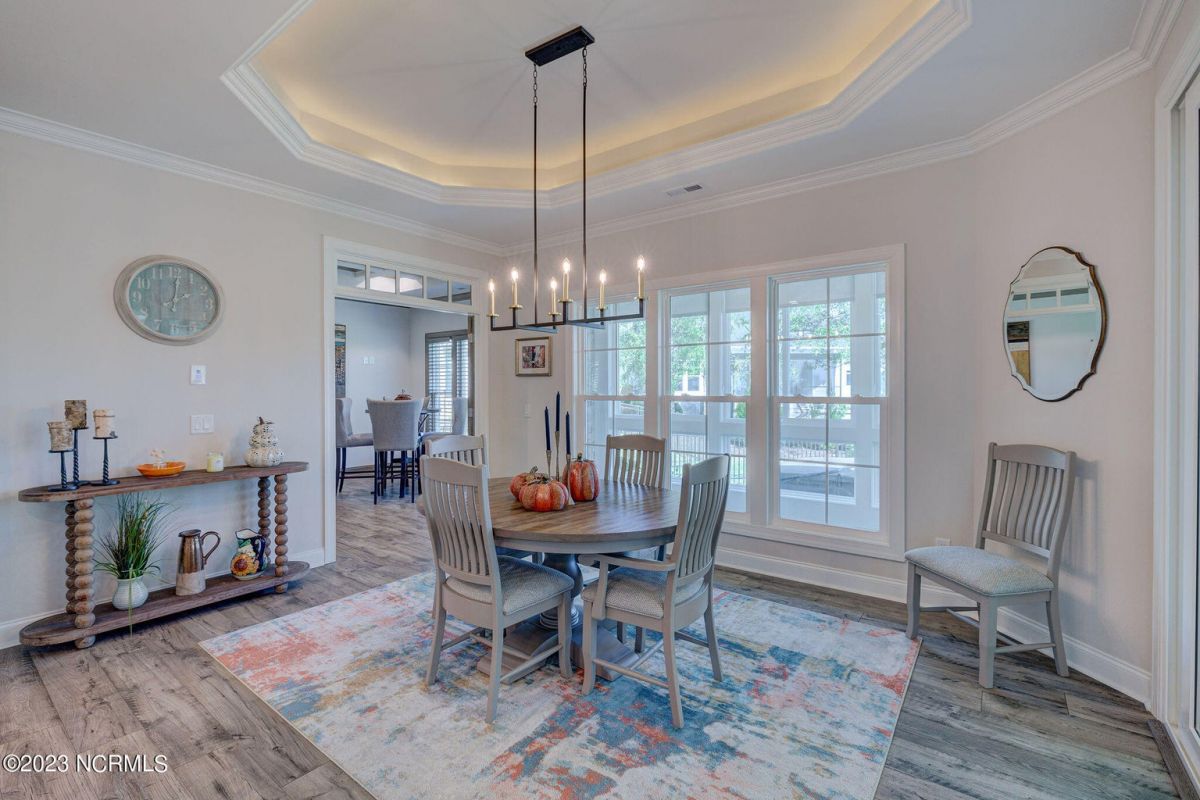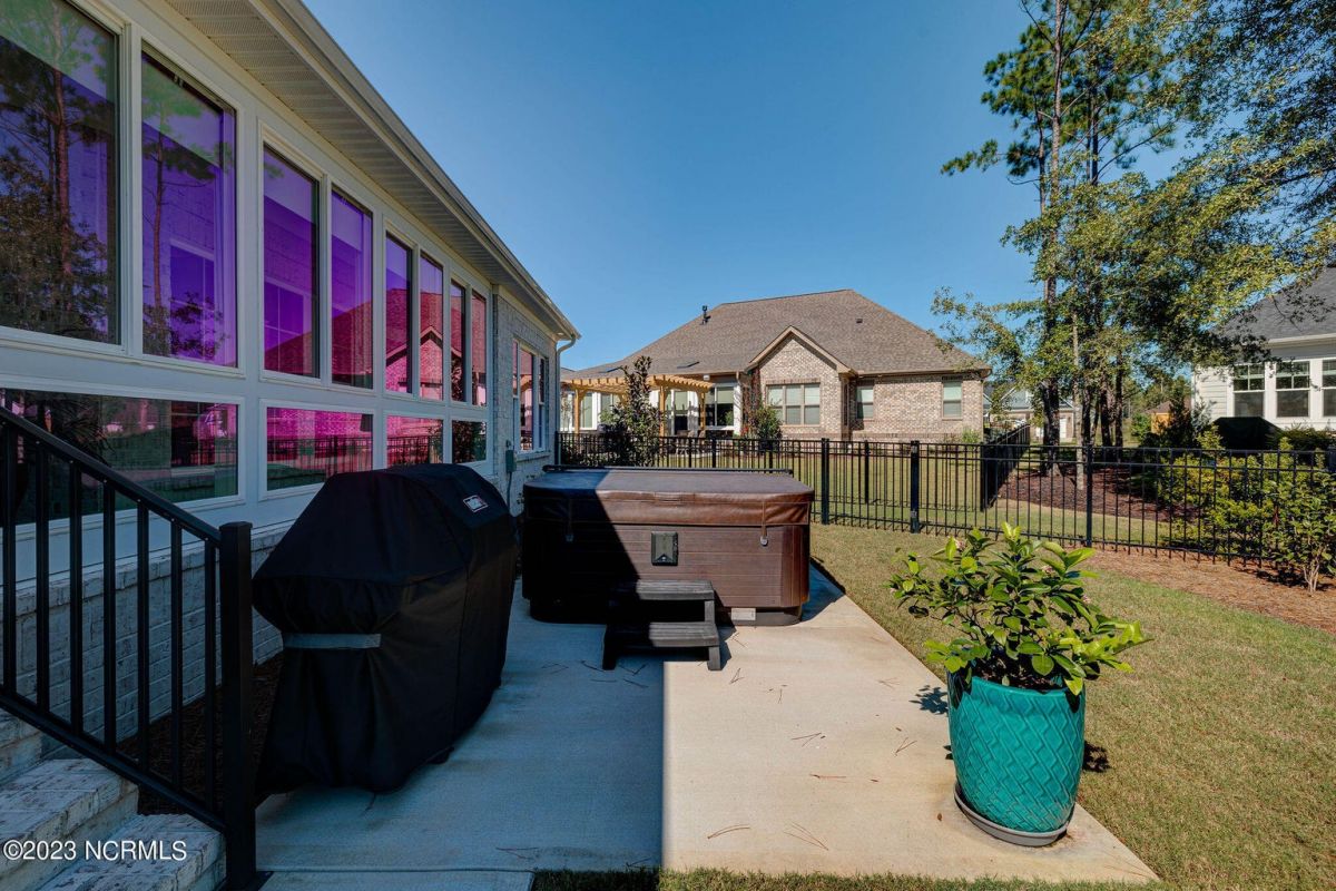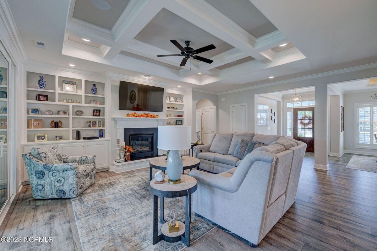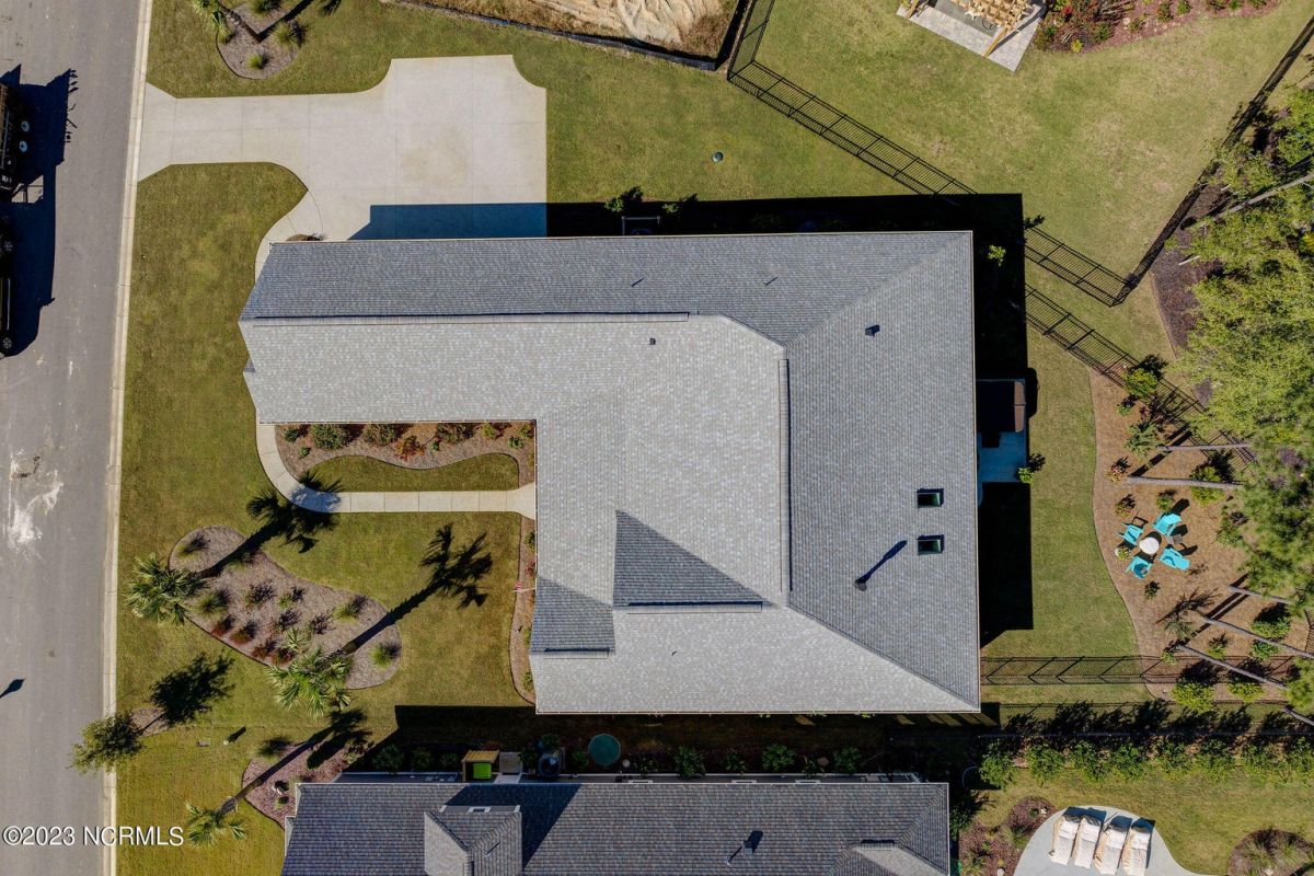 This like new move-in read Trusst built Trinity I home located in the new Timber Ridge section of Compass Pointe is a single level plan featuring three bedrooms, two and half baths, living room, formal dining room plus kitchen eating area, a beautiful den, large laundry room and a fabulous sunroom across most of the back of the home. It boasts quality construction with all (white) brick (quoined corners and other detail) with composite hardy board material accents in a coastal blue hue with large paver front porch lets you enjoy evening sunsets or a morning coffee. The front yard has extensive upgraded landscaping (note size of palms and other plants) with professional up lighting on palms and Japanese maple in front of home and zoned irrigation system. Exterior recessed ''down lighting'' in soffit across front and rear of home, above garage doors and on front porch make for a beautiful nighttime appearance. Fenced in back yard has been ''floated'' in which creates a grass ''perimeter of sorts''. Neighboring fences are both on property line and surveyor indicates this yard can accommodate a pool (subject to MOA approval). Huge side entry oversized three car garage. Features include three individual 9' wide doors (builder standard garage is a single 16' wide door) lots of room even with three cars inside. Fully painted and finished with epoxy floor, five windows and Minka ceiling fans for a cool breeze. Extra outlets added throughout including proper dedicated outlet for a refrigerator and one for a high wall mounted TV (also a cable jack), and an extra garden hose spigot. The heavy duty pull stairs in the garage provides convenient access to very large lighted attic storage area with flooring added above much of home. Beautiful accent ceilings throughout - including coffered ceilings in living room and den; dining room, eating area, primary bedroom and primary bath all feature lighted tray ceilings, entry way includes a tongue and groove accent ceiling. Custom built-in cabinets flank the beautiful, raised fireplace and extensive wood trim, crown molding throughout including all bedrooms and laundry room. See Features in the document section to see more details about this fabulous home!