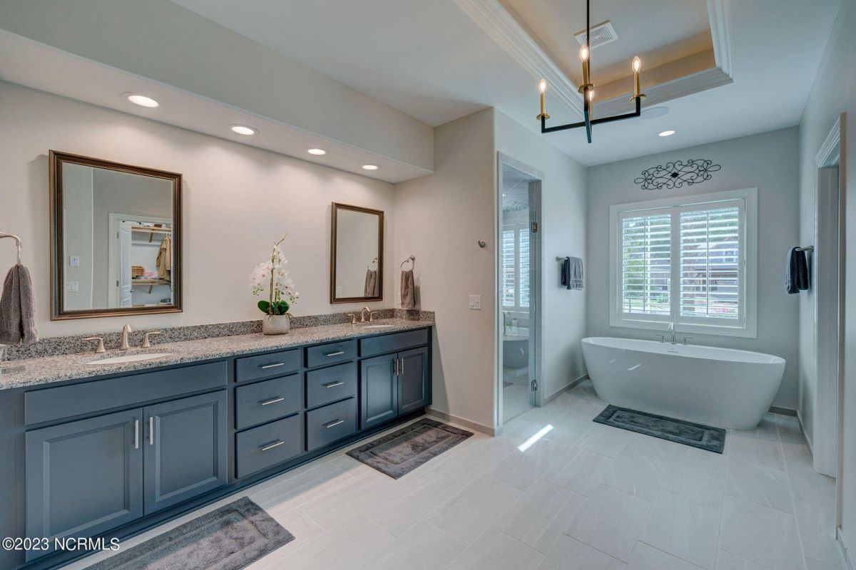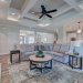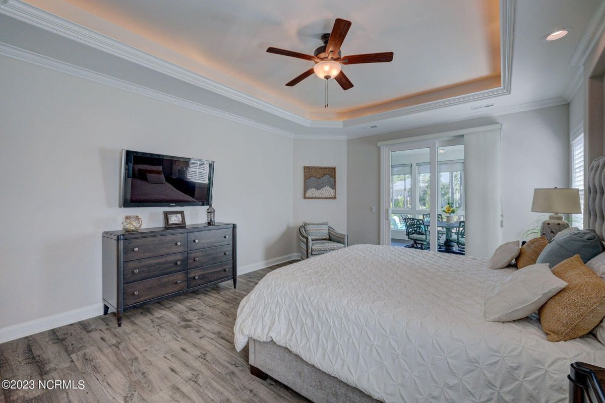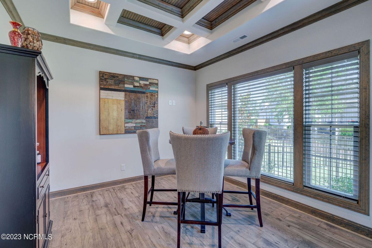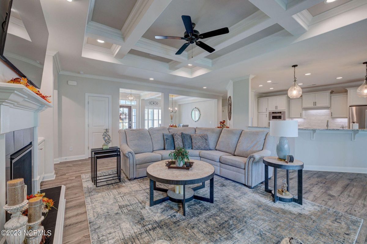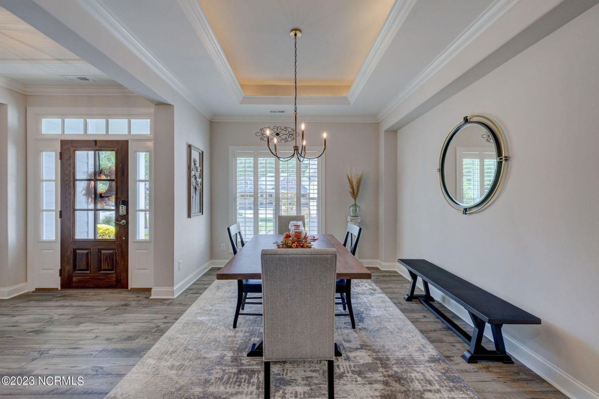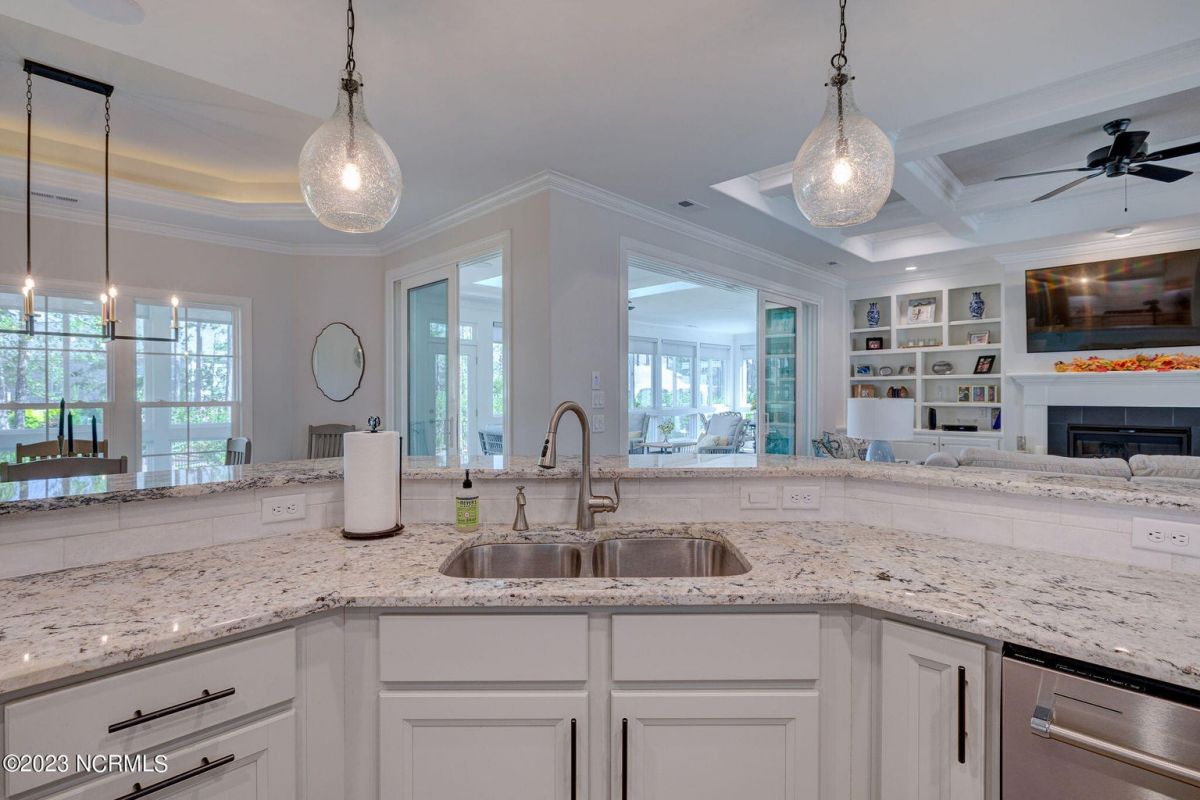 This like new move-in read Trusst built Trinity I home located in the new Timber Ridge section of Compass Pointe is a single level plan featuring three bedrooms, two and half baths, living room, formal dining room plus kitchen eating area, a beautiful den, large laundry room and a fabulous sunroom across most of the back of the home. It boasts quality construction with all (white) brick (quoined corners and other detail) with composite hardy board material accents in a coastal blue hue with large paver front porch lets you enjoy evening sunsets or a morning coffee. The front yard has extensive upgraded landscaping (note size of palms and other plants) with professional up lighting on palms and Japanese maple in front of home and zoned irrigation system. Exterior recessed ''down lighting'' in soffit across front and rear of home, above garage doors and on front porch make for a beautiful nighttime appearance. Fenced in back yard has been ''floated'' in which creates a grass ''perimeter of sorts''. Neighboring fences are both on property line and surveyor indicates this yard can accommodate a pool (subject to MOA approval). Huge side entry oversized three car garage. Features include three individual 9' wide doors (builder standard garage is a single 16' wide door) lots of room even with three cars inside. Fully painted and finished with epoxy floor, five windows and Minka ceiling fans for a cool breeze. Extra outlets added throughout including proper dedicated outlet for a refrigerator and one for a high wall mounted TV (also a cable jack), and an extra garden hose spigot. The heavy duty pull stairs in the garage provides convenient access to very large lighted attic storage area with flooring added above much of home. Beautiful accent ceilings throughout - including coffered ceilings in living room and den; dining room, eating area, primary bedroom and primary bath all feature lighted tray ceilings, entry way includes a tongue and groove accent ceiling. Custom built-in cabinets flank the beautiful, raised fireplace and extensive wood trim, crown molding throughout including all bedrooms and laundry room. See Features in the document section to see more details about this fabulous home!
