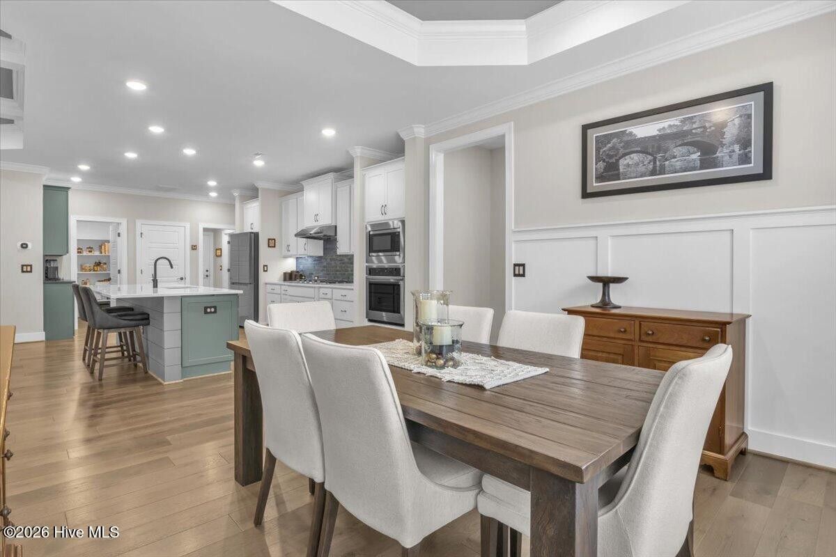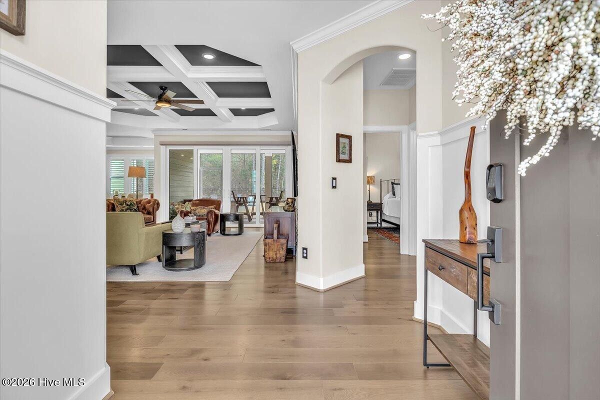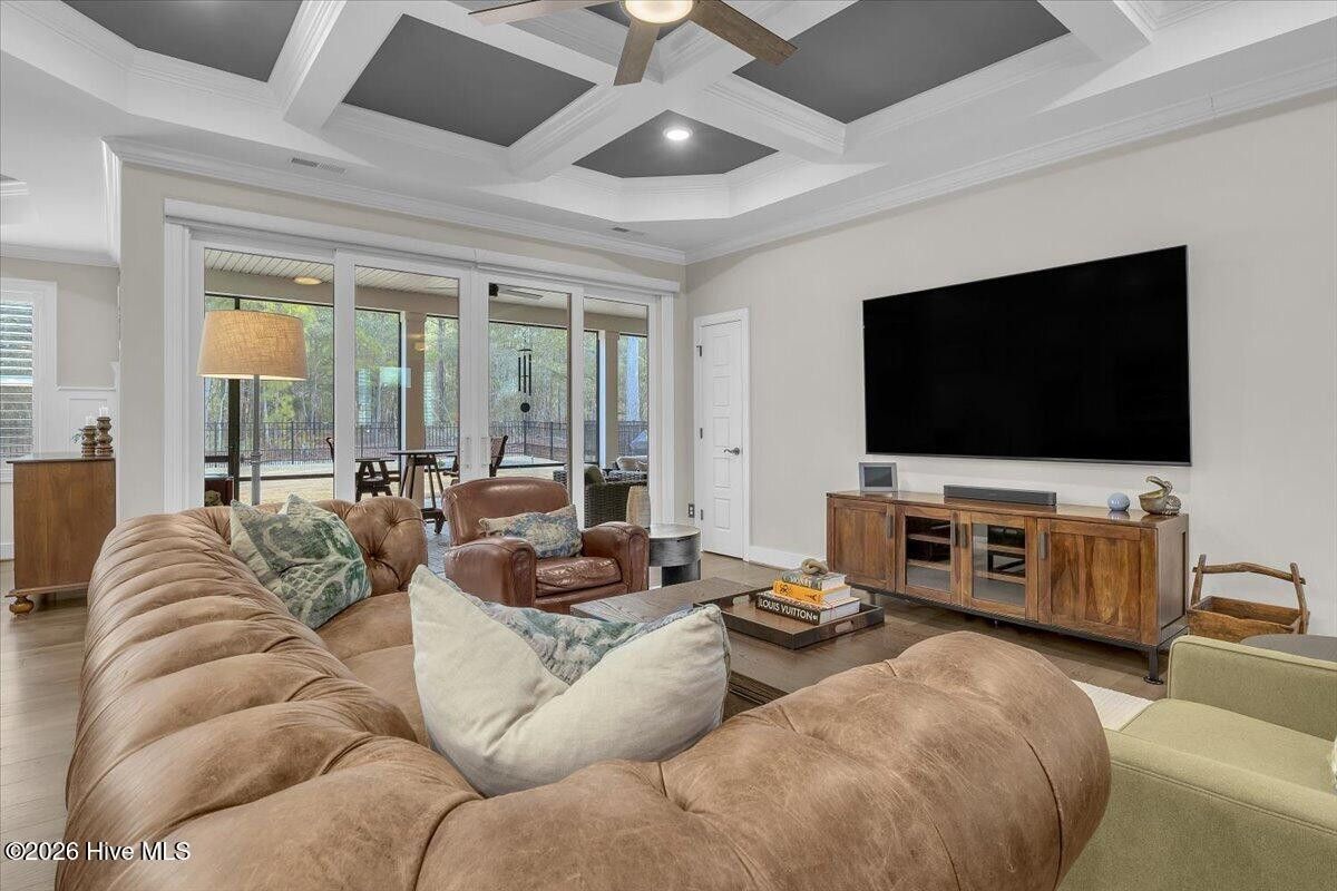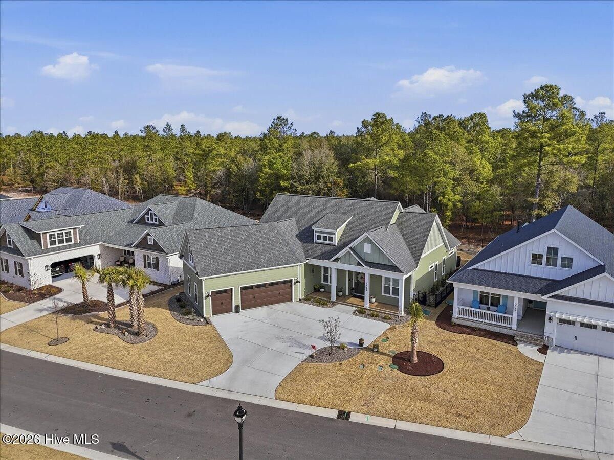 Located on a quiet nature preserve homesite in Compass Pointe, this beautifully crafted 2025 Kent Homes residence offers exceptional privacy, thoughtful design, and effortless one-level living. The appealing elevation features a covered front porch and a highly desirable 2.5-car front-inside entry garage, blending curb appeal with everyday functionality. Inside, the open-concept layout spans 2,266 square feet and is designed for comfort and flow. The welcoming foyer opens to a forward-facing private office with French doors, leading into the living room, expansive kitchen, and dining area—ideal for both entertaining and daily living. A split floor plan provides privacy for guests and owners alike. The spacious primary suite features a walk-in closet with custom built-ins and a spa-inspired bath with dual vanities, freestanding soaking tub, tiled walk-in shower, water closet, and custom slide-out storage. The laundry room is conveniently located just off the primary suite. Two additional bedrooms, a tiled walk-in guest shower, powder room, and abundant floored storage—including an unfinished bonus room—add to the home's exceptional livability. Interior highlights include LVP flooring throughout (no carpet), quartz countertops, an oversized island, custom soft-close cabinetry, stainless steel appliances, Zephyr hood, 5-burner range, coffered ceilings, crown molding, pocket doors, and plantation blinds. Outdoor living shines with an oversized screened porch and stamped concrete patio overlooking the preserve, offering a peaceful backdrop for entertaining or quiet evenings. A black aluminum fenced yard with dog-friendly screening and a paver walkway leading to a private firepit patio complete the setting. Compass Pointe residents enjoy resort-style amenities including the Grand Lanai Amenity Center, pools, lazy river, fitness center, tennis and pickleball courts, on-site dining, scenic trails, and access to the Rick Robbins Championship 18-hole golf course (memberships available). Gated and conveniently located near shopping, medical facilities, golf, historic downtown Wilmington (15 minutes), and Wrightsville Beach (30 minutes), this home captures the essence of luxury coastal livingwhere every day feels like a getaway.
