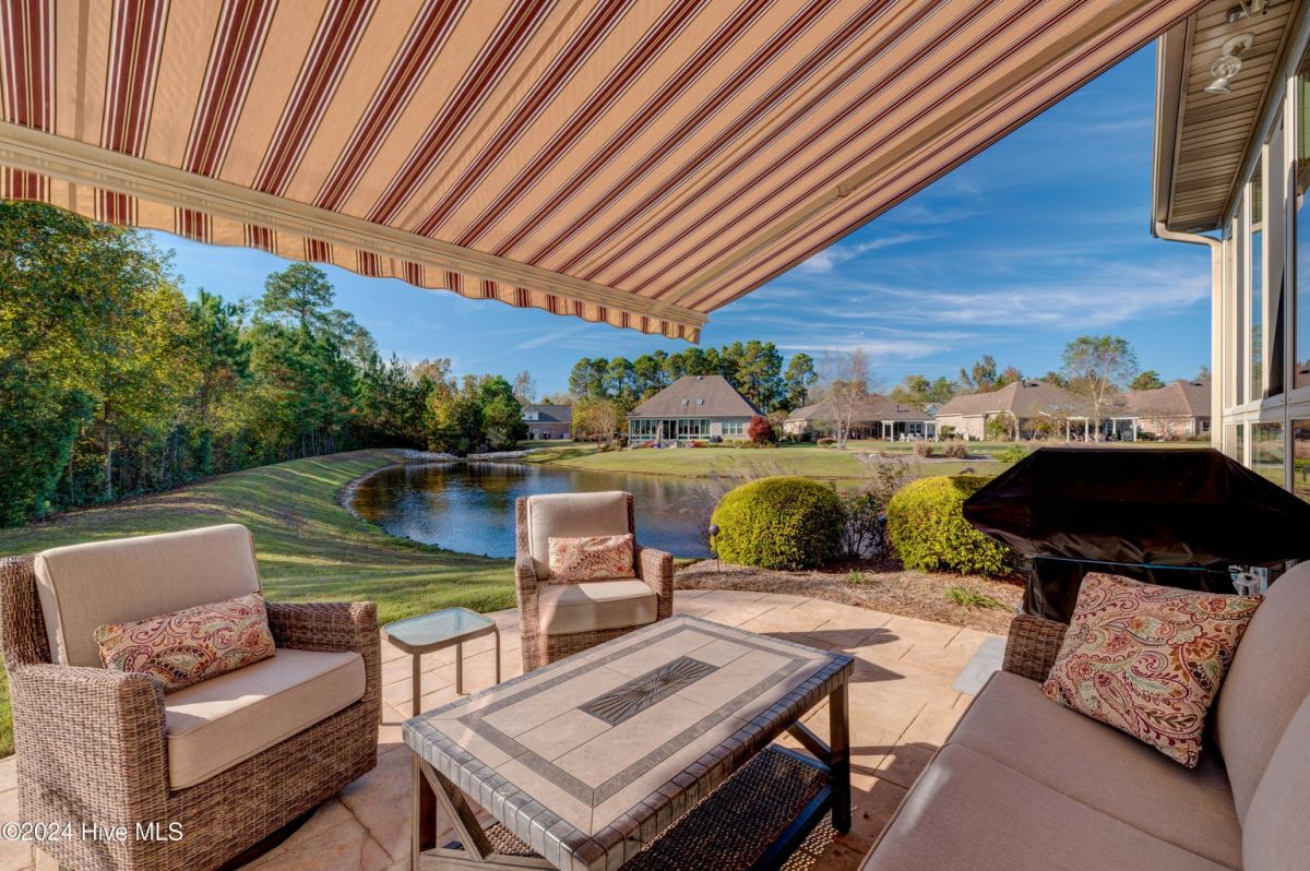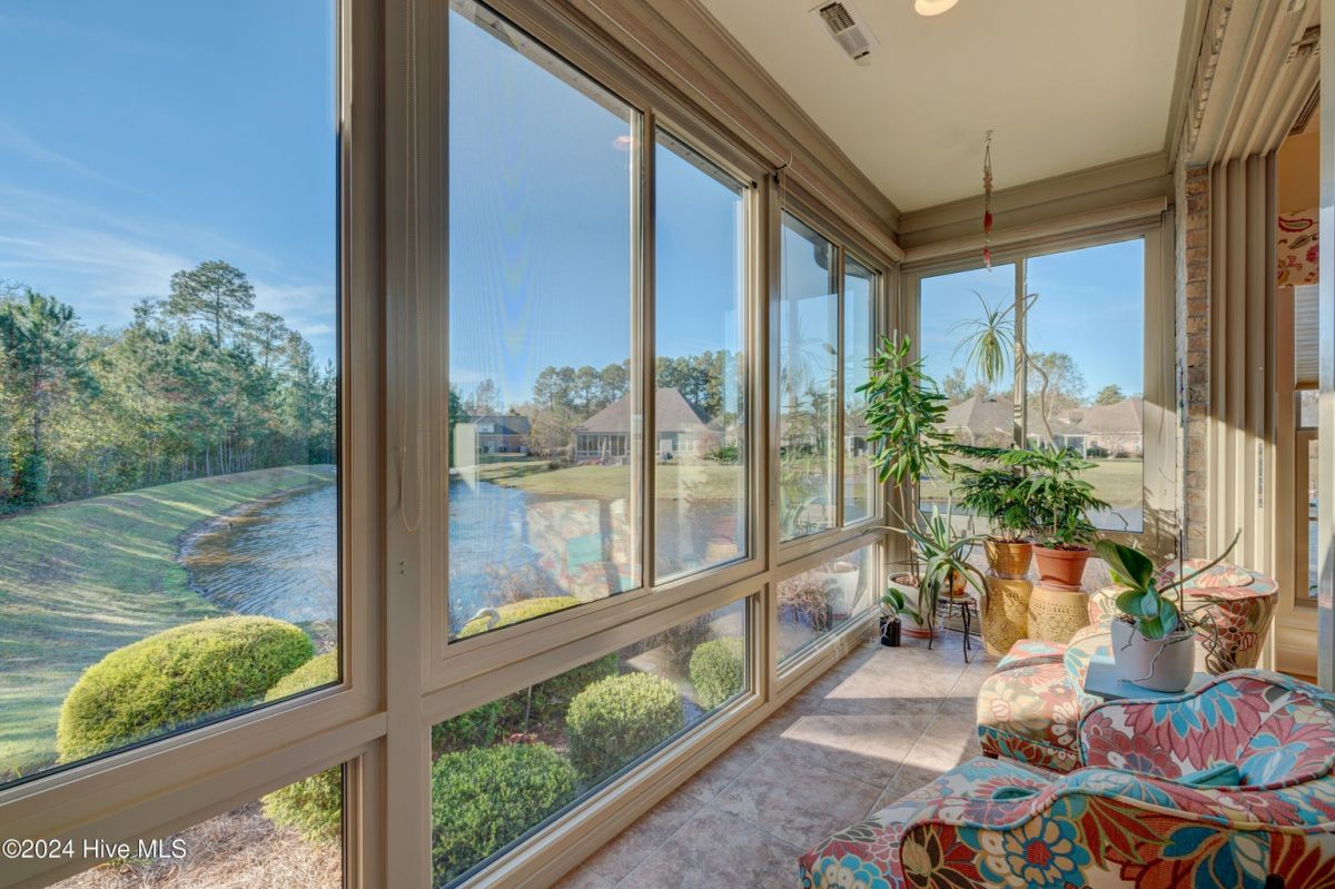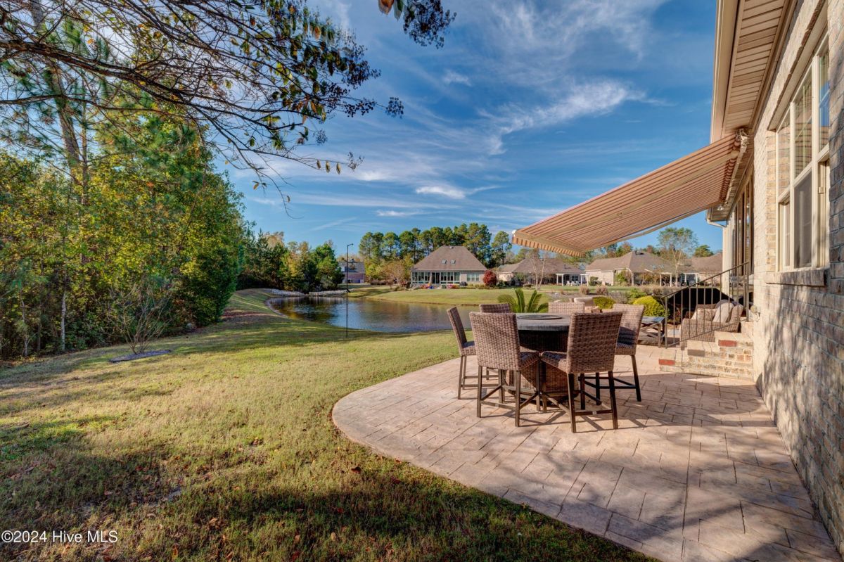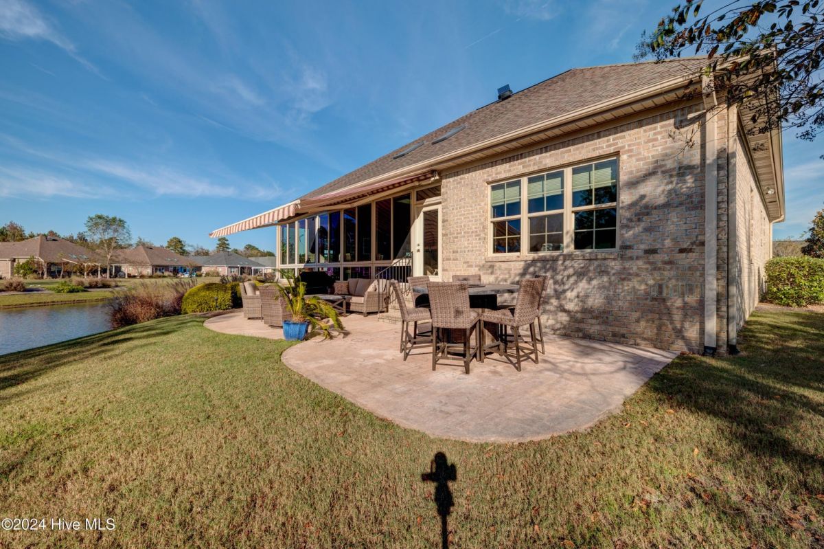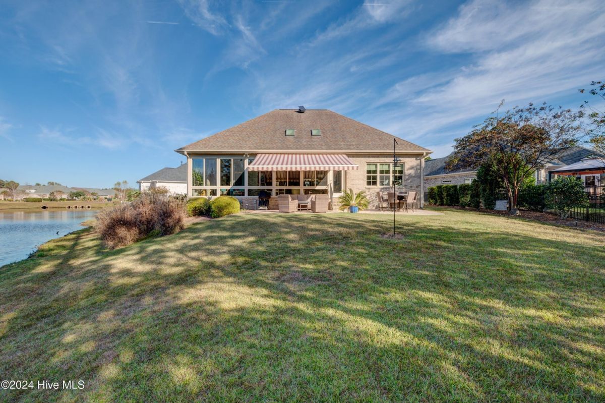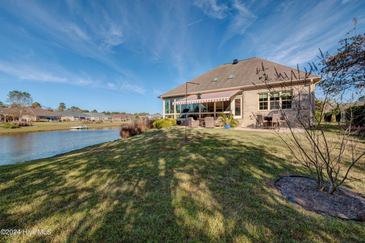 ENJOY RARE POND AND NATURE VIEWS BEHIND YOUR HOME, within walking distance of the main amenities in Compass Pointe. This beautiful low-maintenance brick home situated at the end of a cul du sac features a beautiful open floor plan with mainly one-level living. The decorative glass double doors welcome you in and your eyes are immediately drawn to the water out back. This home features coffered and tray ceilings and a warm kitchen and dining space overlooking the water. Continue out to the spacious 4-season lanai with your morning coffee to enjoy all of nature's beauty. Hardwood and tile flooring are throughout the main living area and bonus room. The Owners Suite features a beautiful tile shower, large walk-in closet, and separate vanities. The 3-car garage creates an oversized bonus room and offers guests their own full bath for a convenient en suite. The first floor is wired with surround sound, and a Whole House Generator will give you added peace of mind all year long. Compass Pointe's amenities feature the Grand Lanai Clubhouse, Health and Wellness Center, outdoor lazy river, a Jr. Olympic lap pool, Heated indoor pool, tennis and pickleball and a dog park. This golf-cart friendly lifestyle is very limited in Southeast North Carolina, but it can be yours. Save yourself the hassle of building and come explore this fantastic home today!
