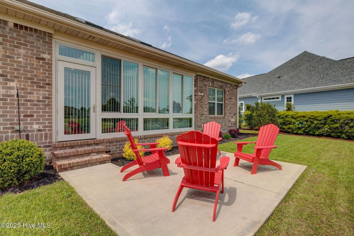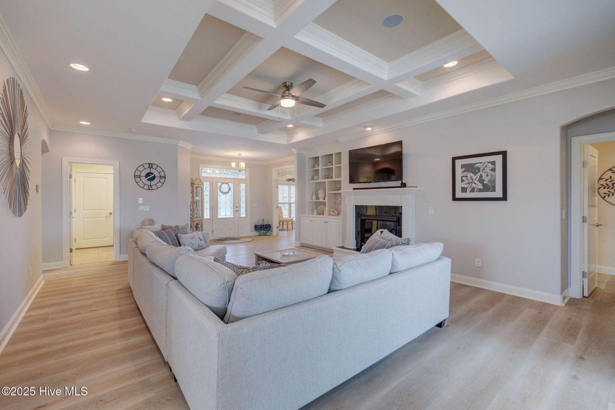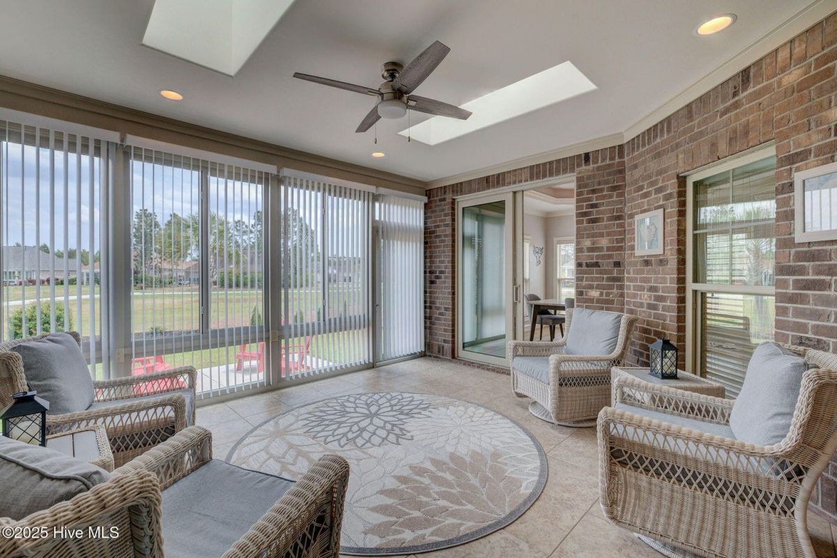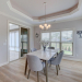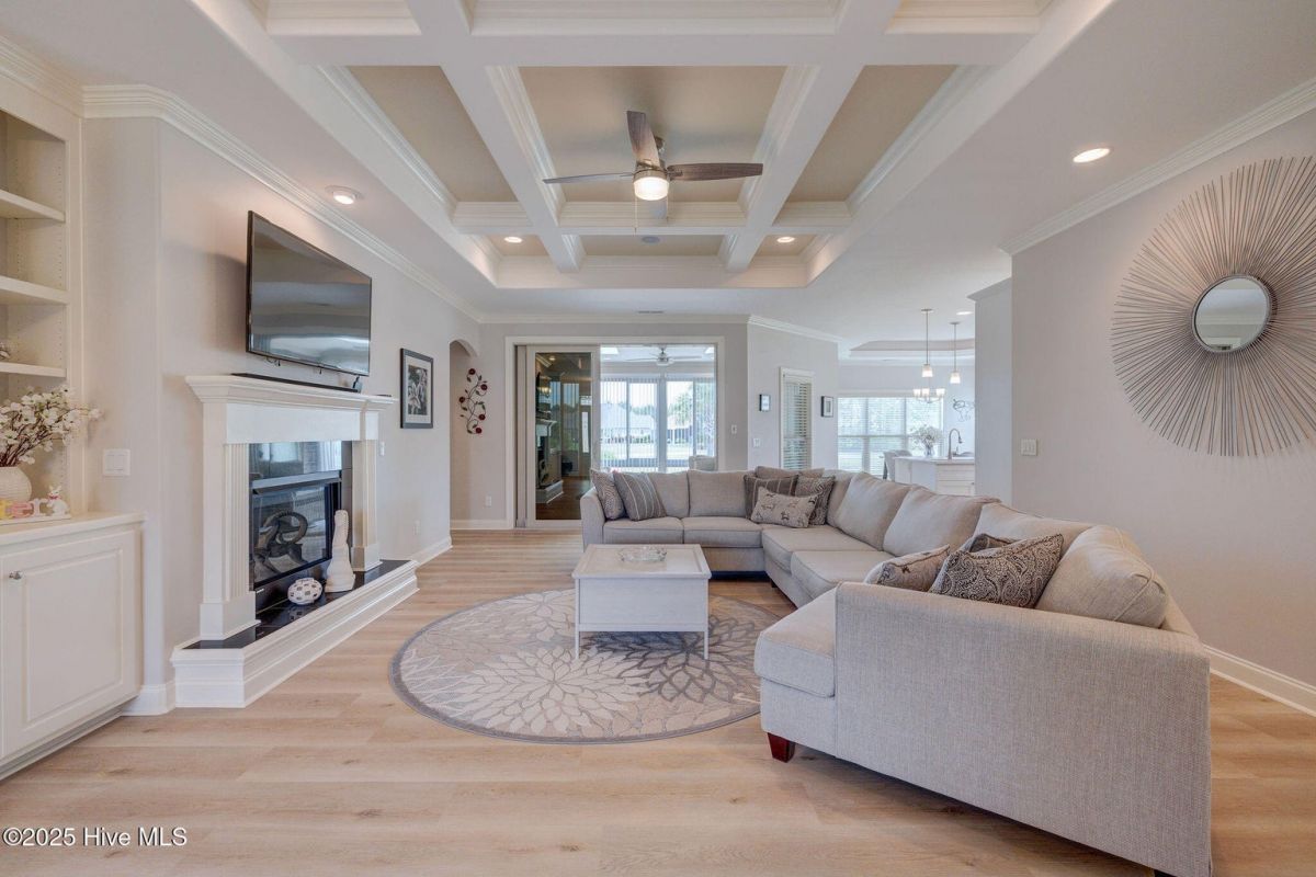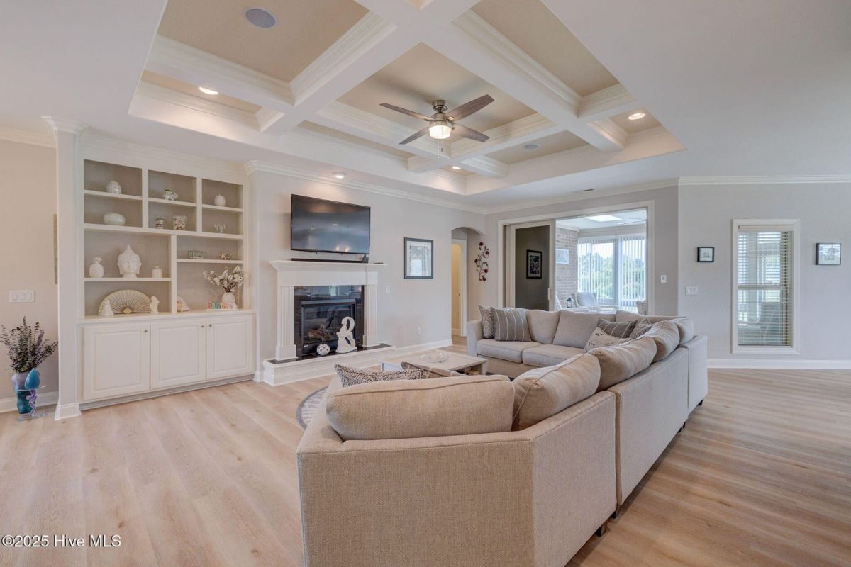 Welcome to this pristine, beautifully landscaped and meticulously maintained Trusst-built Mason Model home in Compass Pointe, a sought-after community known for resort-style living everyday. This elegant, single-story brick home in move-in condition sits on an oversized corner lot located on the 4th hole tee-box of the golf course with a pond view is admired for its curb appeal.This striking home boasts many architectural upgrades, including coffered and tray ceilings, arched entryways, crown molding, rounded corners, and much more! Upon entry through a welcoming front porch, a pair of French doors leads into a roomy office/2nd guest bedroom with a coffered ceiling. An open and spacious living room with new paint and flooring through out features a gas fireplace, built-in cabinetry and shelving, coffered ceiling, and tinted telescopic sliding glass doors is the perfect location for family gatherings. The completely remodeled gourmet kitchen offers white cabinetry, quartz counters, tile backsplash, pantry, under cabinet lighting, top-of the line-appliances, and electric cooktop with downdraft exhaust. The center island provides much storage space with cabinets on the front side. Tinted sliding glass doors connect the dining room to a sunroom with abundant natural lighting. The beautiful primary suite with direct access to the sunroom, easily accommodates a king-sized bed and features two oversized walk-in closets, a custom tile shower and separate granite vanities. A second guest bedroom features a large closet and is conveniently located next to a full bathroom, complete with shower and tub. The four-season, glass-enclosed lanai patio (sunroom) overlooking the golf and pond is perfect for entertaining. A large functional laundry room provides access to the two-car garage, and its separate utility and storage room. Why wait to build, come see it today and move-in within weeks! All offers considered.