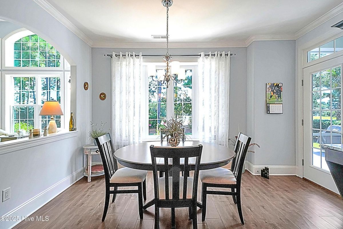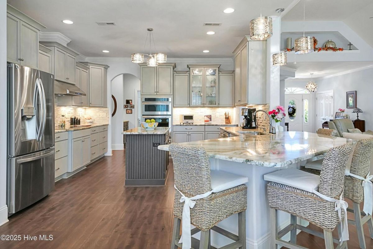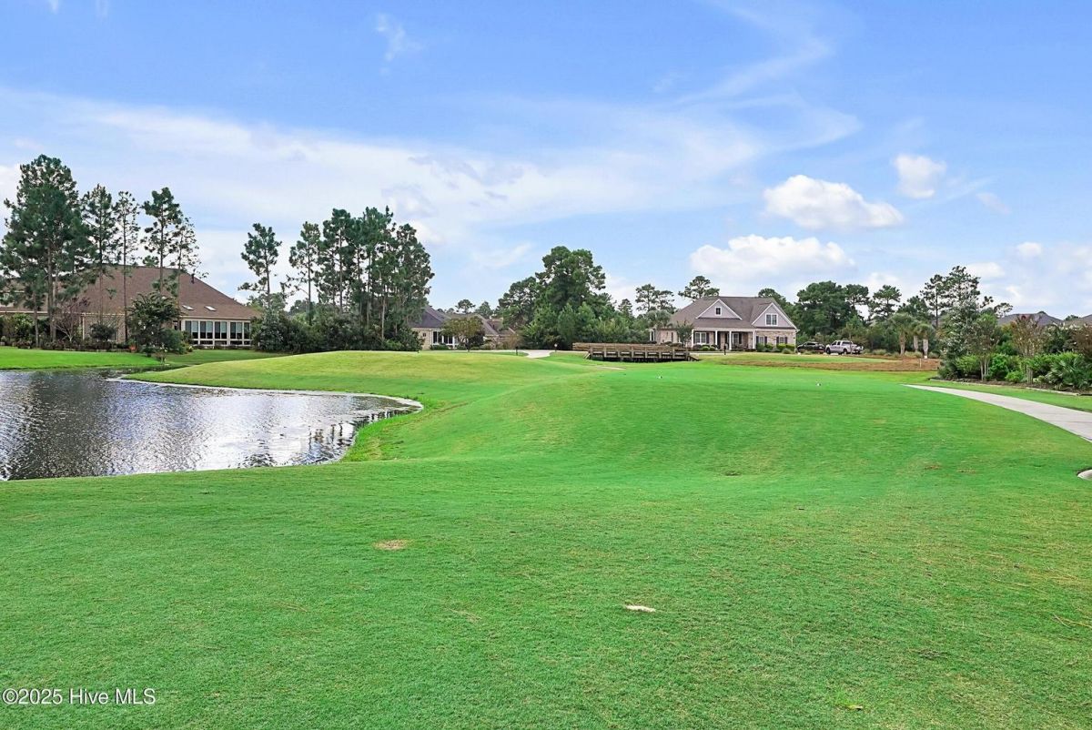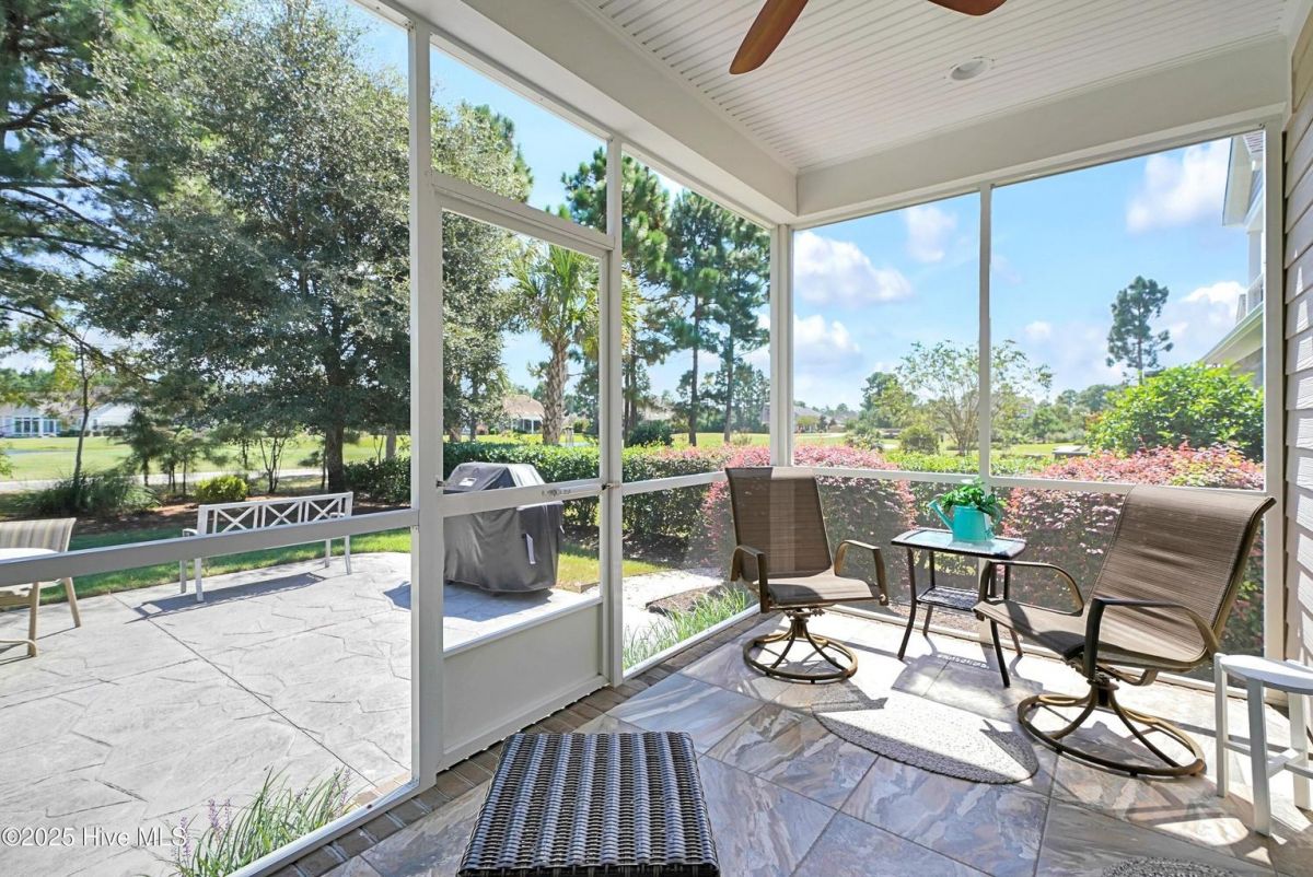 Quality & style combine in this stunning home built by Barker & Canady Custom Homes. Located in the resort-style, gated community of Compass Pointe, with golf course and pond views. Property offers 3 bedrooms, 3.5 bathrooms, dining room, sunroom, screen porch, and an office. Hardwood floors are found in the main living areas & office, and granite counters grace the kitchen & primary bath. Kitchen includes counter-height seating, grey cabinetry, cooktop with hood vent, wall oven & microwave, and double door pantry. An informal breakfast area is perfect for daily meals, while the formal dining room, and well-appointed butler's pantry/wet bar, allow you to take entertaining to the next level. The open living room is enhanced with an elegant fireplace featuring a stacked stone surround & hearth, flanked by bookcases & cabinets. Adjacent the living room is the bright sunroom, with access to the stamped concrete back patio. The primary suite includes a bay window overlooking the golf course, two walk-in closets, separate vanities, and a spa-like oversized tiled shower with dual shower heads and frameless glass door. The office, with direct access to the screen porch, and guest bedroom share a Jack & Jill bathroom. The laundry room includes white cabinets, utility sink, and a built-in drop zone. Washer & dryer convey. A half-bath completes the main level. A 3rd bedroom, with its own bathroom, is found on the second level, along with access to the attic storage. The enlarged 2-car attached garage provides room for a golf cart. You'll also find a walk-in storage closet and a side utility door. Additional features include a Bradford White Water Heater (2024), Grinder Pump (2025), and St. Augustine Sod in front lawn (2025). Compass Pointe amenities include a grand lanai, fitness center, indoor/outdoor pool, lazy river, tennis, pickleball & basketball courts, kayak launch, lake/canals, dog park, walking/biking trails. Only a short ride to Downtown Wilmington and area beaches.