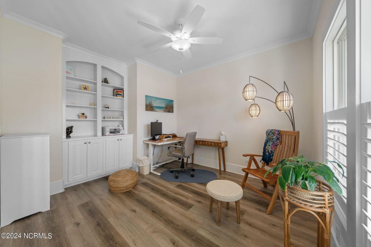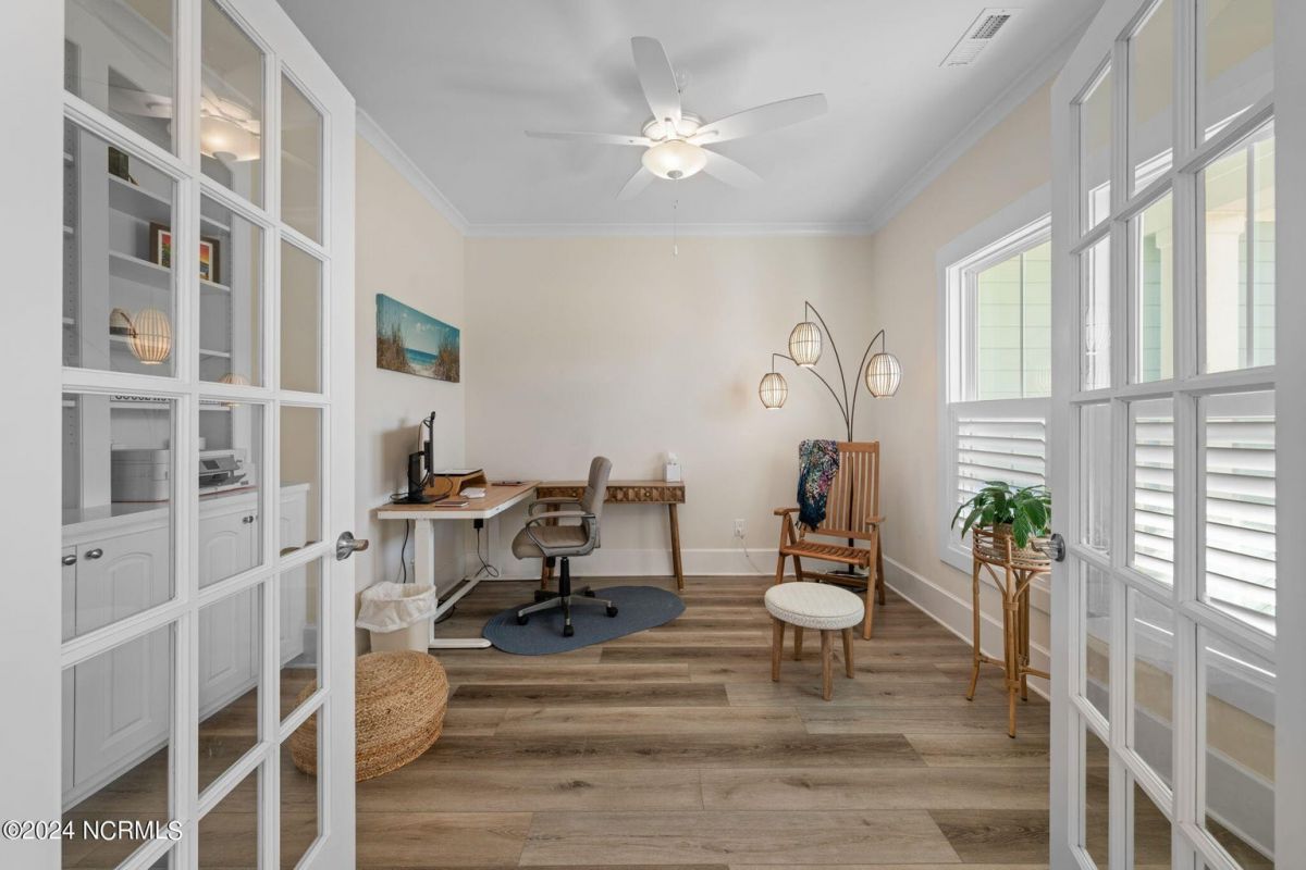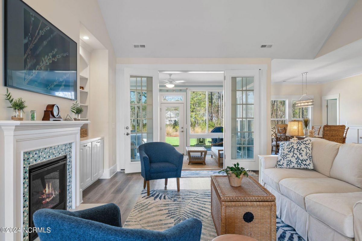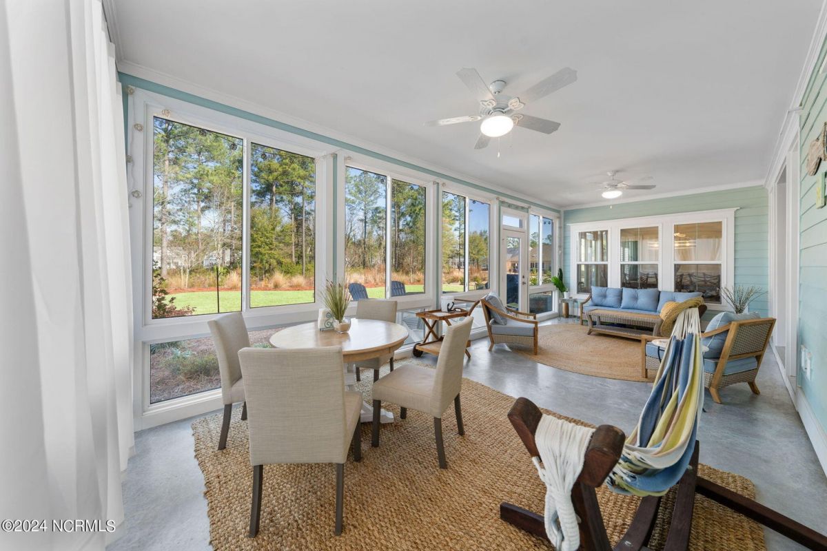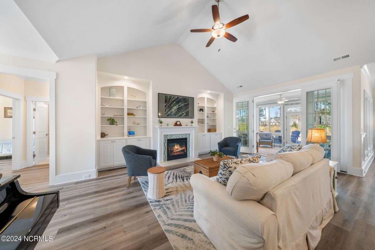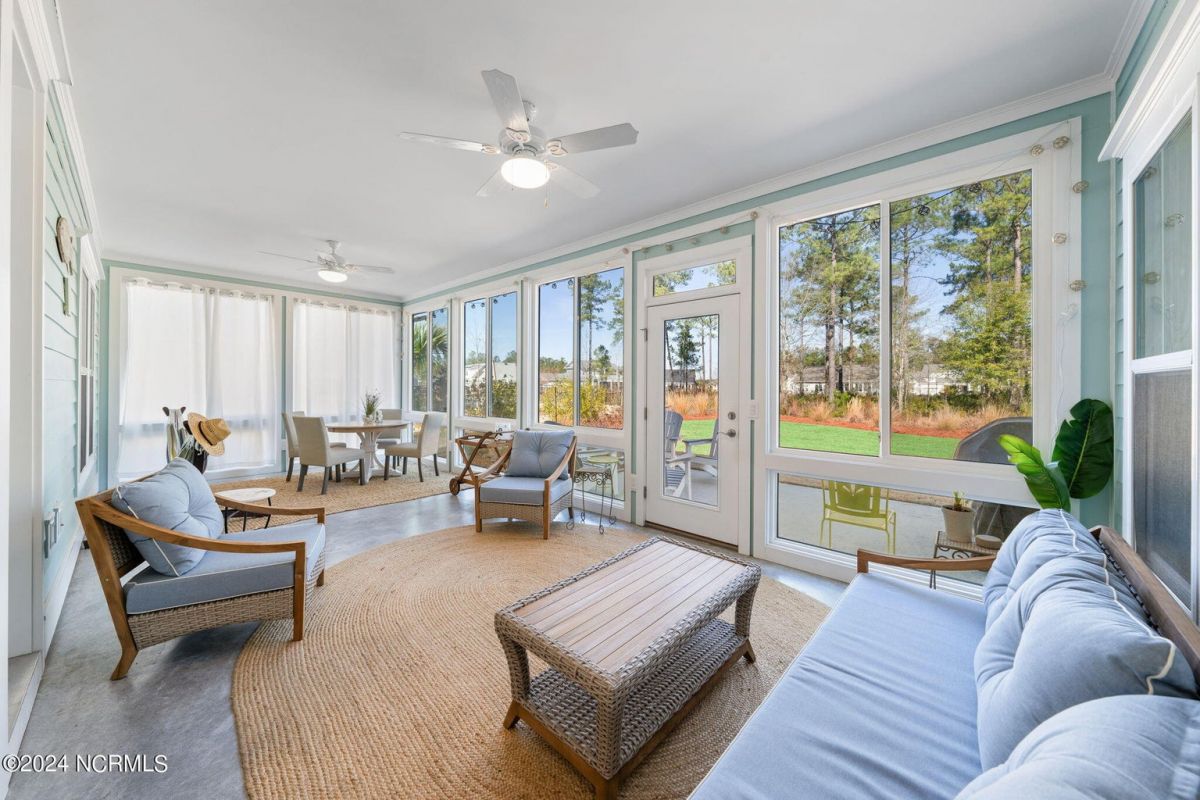 MOTIVATED SELLER!!!!!!! Welcome home to luxury living in the amenity-rich community of Compass Pointe! This exquisite 4-bedroom, 4-and-a-half-bathroom residence is just what you have been waiting for. As you enter the foyer you will notice French doors leading to the versatile office/flex room, complete with built-in shelves for added convenience. The heart of the home boasts an inviting open floor plan featuring a cozy fireplace flanked by built-in shelves. From the living room you will see the expansive chef kitchen equipped with top-of-the-line Whirlpool appliances, including a 5-burner stainless steel cooktop and vented hood. The kitchen and dining area all flow with the open concept of the house. Entertain guests in style as the living room seamlessly transitions into the spacious glass-enclosed 3-seasons Carolina room, ideal for enjoying the beautiful coastal weather year-round. As you ascend to the second story you will find two large guest bedrooms, each with their own full baths. In the center of these two guest rooms is an expansive loft area great for relaxation or entertainment. Retreat to the luxurious primary bedroom adorned with plantation shutters, offering a serene oasis to unwind after a long day. The study also features plantation shutters and built-in wooden shelves, adding a touch of sophistication throughout the first level. Experience peace of mind with the full house Generac 22KW generator. With meticulous attention to detail and premium finishes, including wooden shelves in all closets, pantries, and a fully insulated garage, this stunning home truly has it all including conditioned storage. With downtown Wilmington just 10 minutes away and the beach a short 25 minute drive, the location is prime. Don't miss the opportunity to make this dream home yours—schedule your showing today!