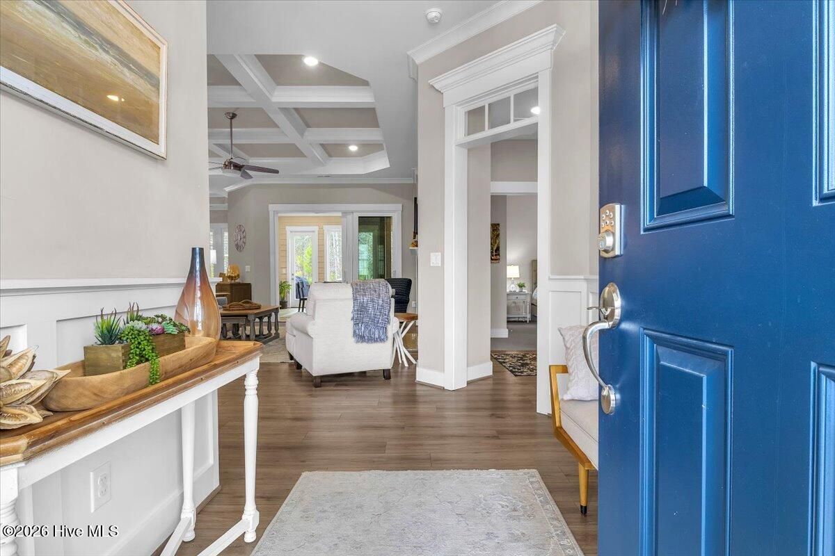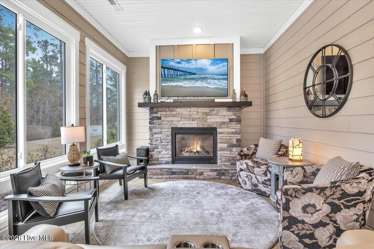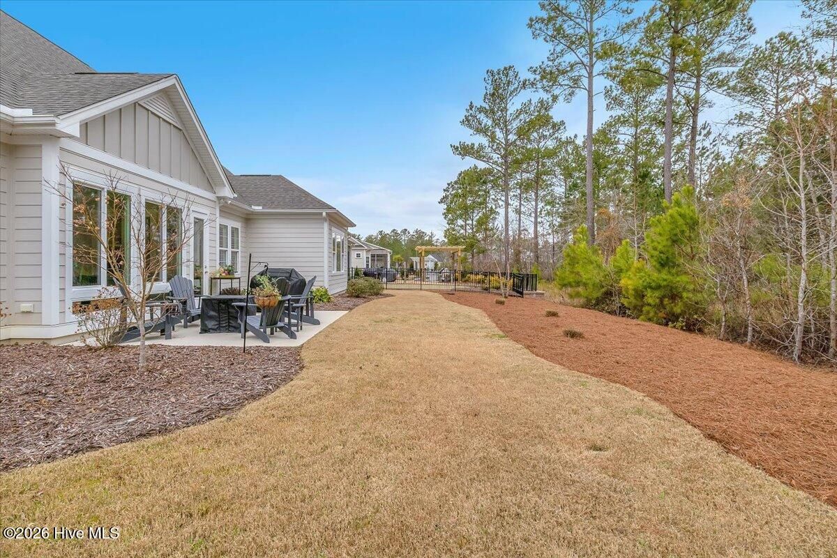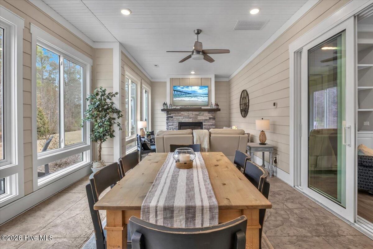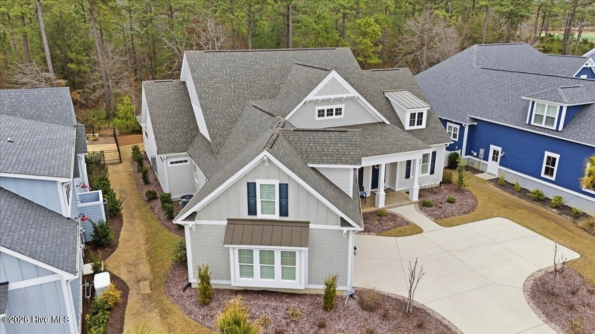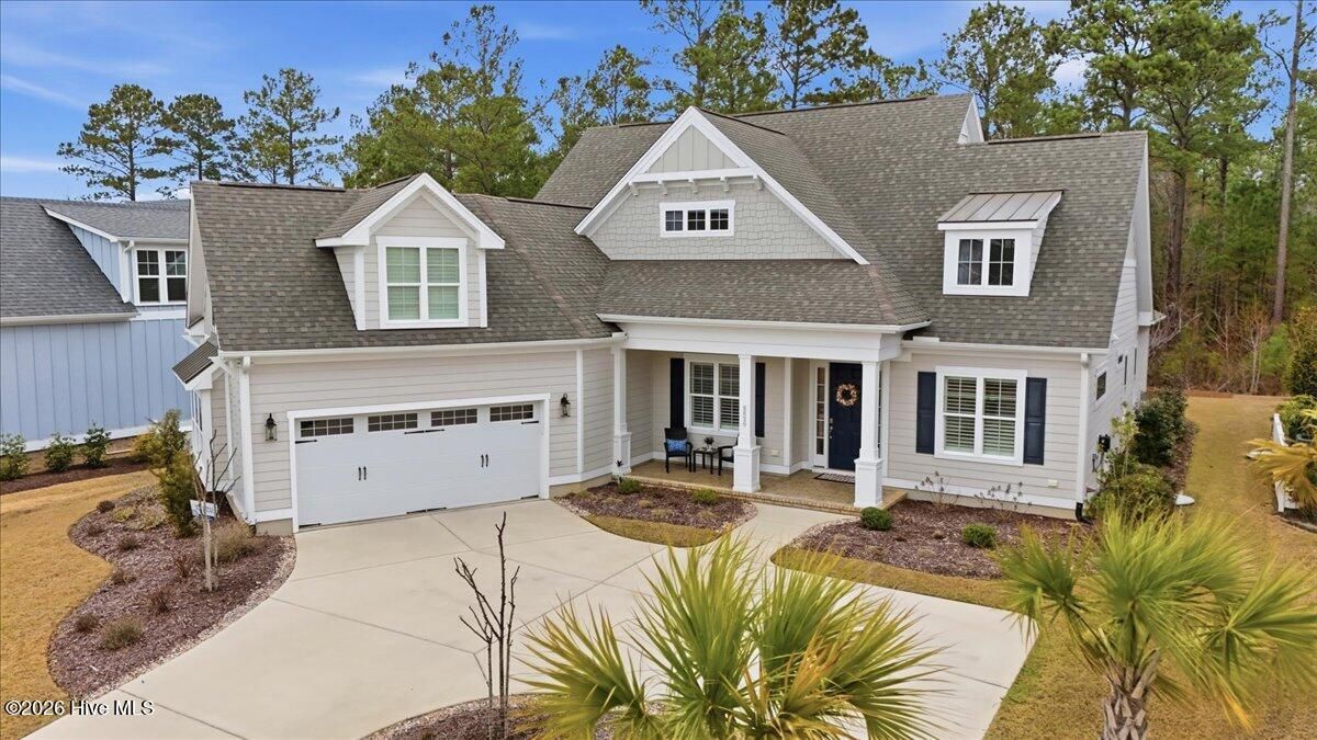 Welcome to resort-style living in the highly desirable Timber Ridge community of Compass Pointe. Nestled on a quiet street with a peaceful nature preserve homesite, this beautifully upgraded Kent Homes Jonesport model offers approximately 3,276 square feet of thoughtfully designed living space. This 4-bedroom, 3.5-bath residence includes a private office and a finished room over the garage, offering flexibility for guests, hobbies, or additional living space. The inviting covered front porch and attractive elevation create immediate curb appeal. Inside, the open-concept design is ideal for both everyday living and entertaining. A welcoming foyer leads to a private office with French doors and opens into the spacious living area, kitchen, and dining space. The beautifully expanded all-season sunroom quickly becomes the favorite gathering spot, featuring a stunning stone fireplace and tranquil views of the surrounding nature preserve. The split-bedroom floor plan offers privacy for both owners and guests. The spacious primary suite includes custom walk-in closet built-ins and a spa-like bath with dual vanities, a tiled walk-in shower, and a private water closet. Two additional bedrooms, a stylish guest bath, powder room, and a finished bonus room with full bath above the garage provide ample space for family and visitors. The home showcases numerous upgrades including luxury vinyl plank flooring throughout, quartz countertops, an oversized island, soft-close cabinetry, stainless steel appliances with a 5-burner gas range, coffered ceilings, crown molding, pocket doors, and plantation shutters throughout. A glass-enclosed lanai with its own HVAC zone provides comfortable year-round living, while additional features include a Rinnai tankless water heater with recirculating pump, sound-insulated guest areas, and a spacious laundry room with cabinetry and sink. Residents enjoy world-class amenities including the Grand Lanai clubhouse, indoor and outdoor pools, lazy river, fitness center, tennis and pickleball courts, walking and biking trails. With optional membership offers on-site dining, and access to the Rick Robbins championship golf course. Experience privacy, luxury, and the unmatched coastal lifestyle that makes Compass Pointe one of the Wilmington area's most sought-after communities.