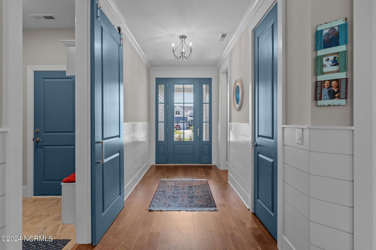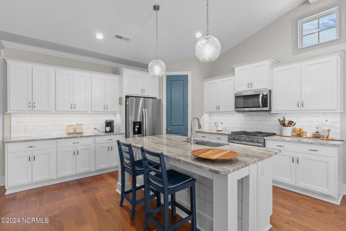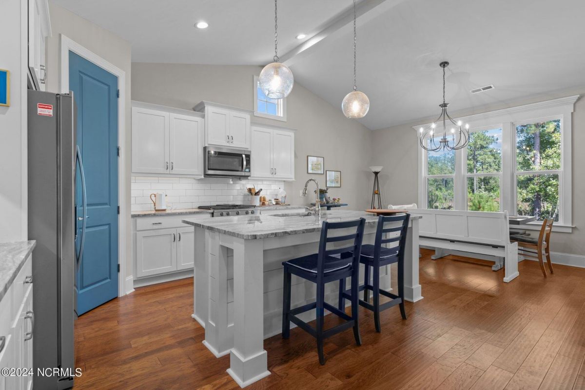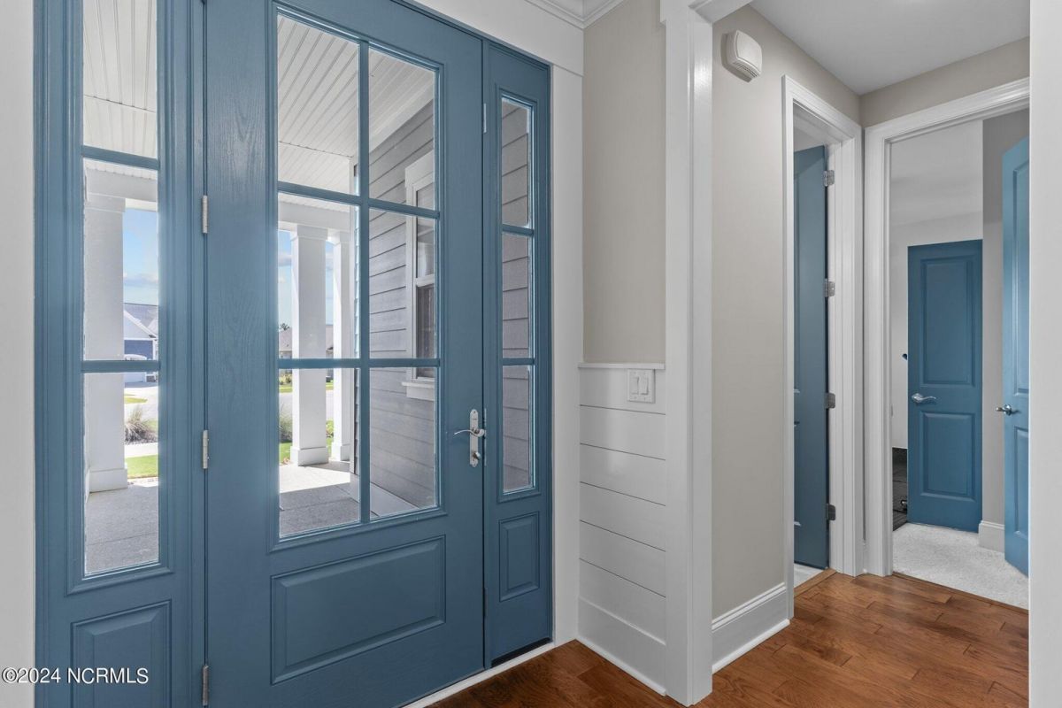 REDUCED $75,000 for quick sale!!! Best value in Compass Pointe!!! Presented is an exquisite coastal home with all the bells and whistles located on a rare, double corner lot with conservation area behind home!!! Totally private and room for a pool, putting green, or other outdoor activities. This nearly new home is located in the premier, gated community of Compass Pointe!! The open floor plan is perfect for entertaining featuring a large great room with gas log fireplace, beamed ceiling, shiplap, and built in shelving. This room leads to a cozy sun room with beautiful views. The chef's kitchen features top of the line appliances with gas range, custom cabinetry, island,and back splash. Huge owner's suite features trey ceilings and an over sized walk in closet. The owner's bath features twin vanity and tiled shower. Two other large bedrooms, another full bath, and laundry room complete the first level. Upstairs features another large bedroom, full bath, and living area that makes this a true junior suite. Loads of walk in storage and an extra feature is this area has spray foam insulation for heating and cooling efficiency. Wireed and plumbed for propane generator. You can't ask for more in a perfect coastal home. Compass Pointe is an luxurious community featuring golf, clubhouse, outdoor pool, lazy river, tennis, pickleball, kayak launch, wellness center and indoor heated pool. Close to Wilmington and area beaches, this is the one you have waited for!!!