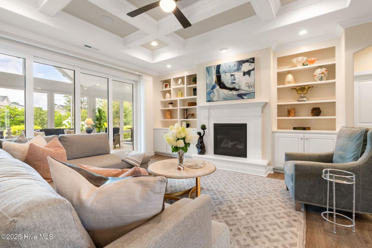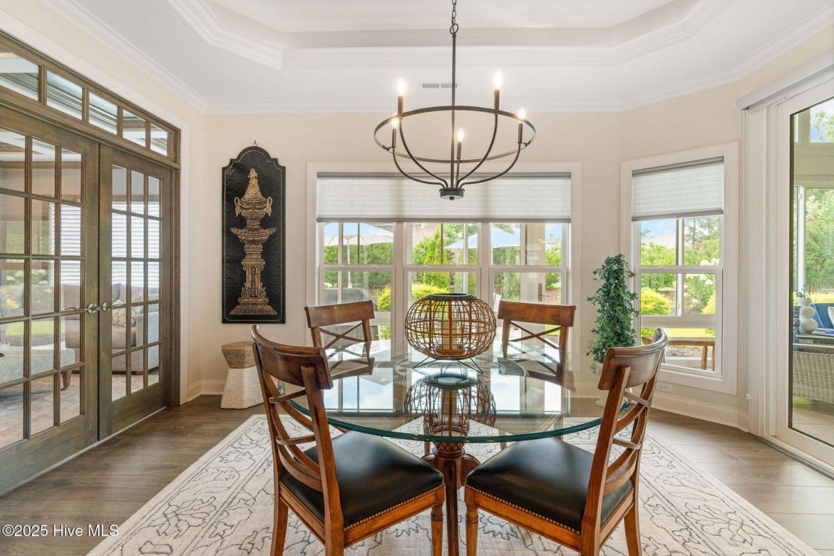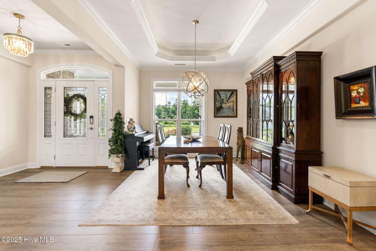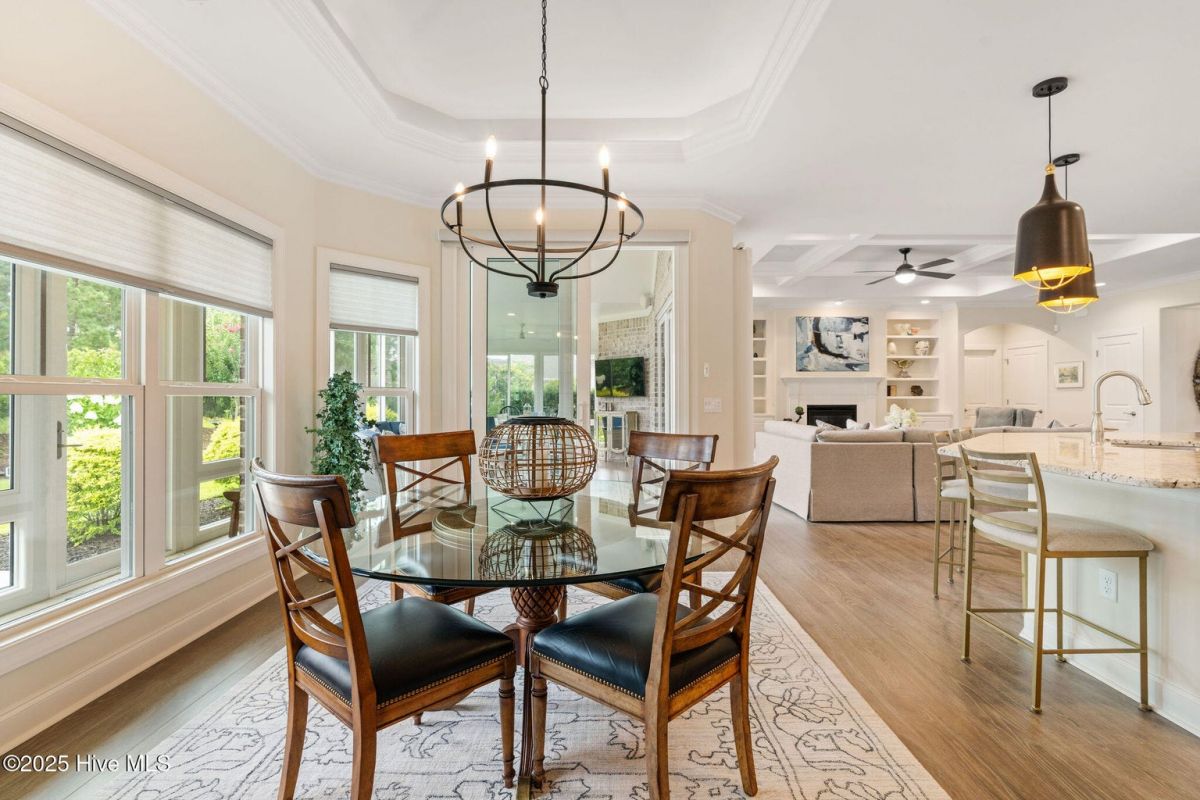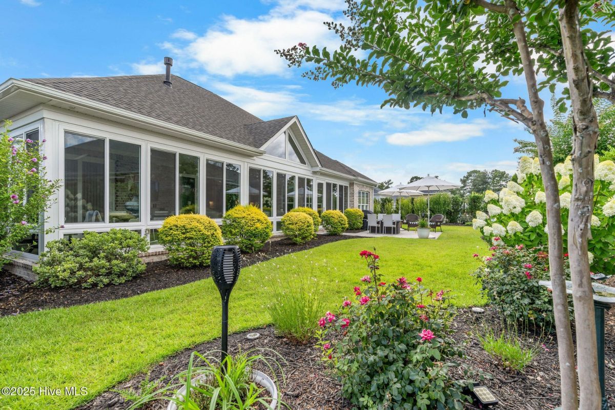 Located in the highly desirable, gated community of Compass Pointe, this beautifully designed home built in 2020, offers true single-level living with every space you could want - including a stunning glass-enclosed sunroom with vaulted ceiling. Thoughtfully laid out, the home features a spacious primary suite on one side, two guest bedrooms and a full bath on the other, a dining area off the foyer, a breakfast nook off the kitchen, a powder room, AND a private office with a beautifully stained coffered ceiling at the rear of the home. Crafted with attention to detail, the home showcases beadboard, a coffered ceiling in the family room, and four tray ceilings throughout. Wide hallways, large room sizes, and timeless finishes create a perfect blend of classic elegance and modern flow. The gourmet kitchen includes a gas cooktop, wall oven and microwave, and dual pantry cabinets, all open to a family room with custom built-ins, surround sound, and a gas fireplace. The private study offers direct access to the breathtaking sunroom, perfect for enjoying year-round natural light. The expansive primary suite features a tray ceiling, sunroom access as well, a luxurious spa-like bathroom with a zero-entry tiled shower, garden tub, and comfort-height fixtures. Additional highlights include wide-plank luxury vinyl flooring, custom window treatments, central sound and security systems, and extensive mature landscaping. The oversized garage offers an 18' wide door, separate golf cart bay, attic access, and suspended shelving for storage. Conveniently located near the Compass Pointe golf clubhouse, restaurant, and West Gate, this home seriously delivers comfort, style, and exceptional convenience!