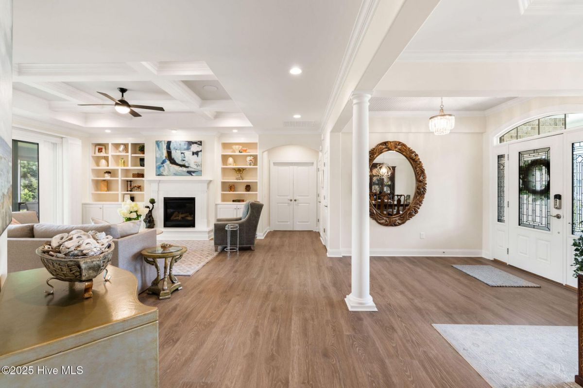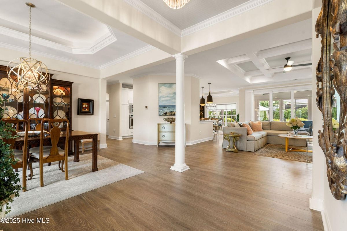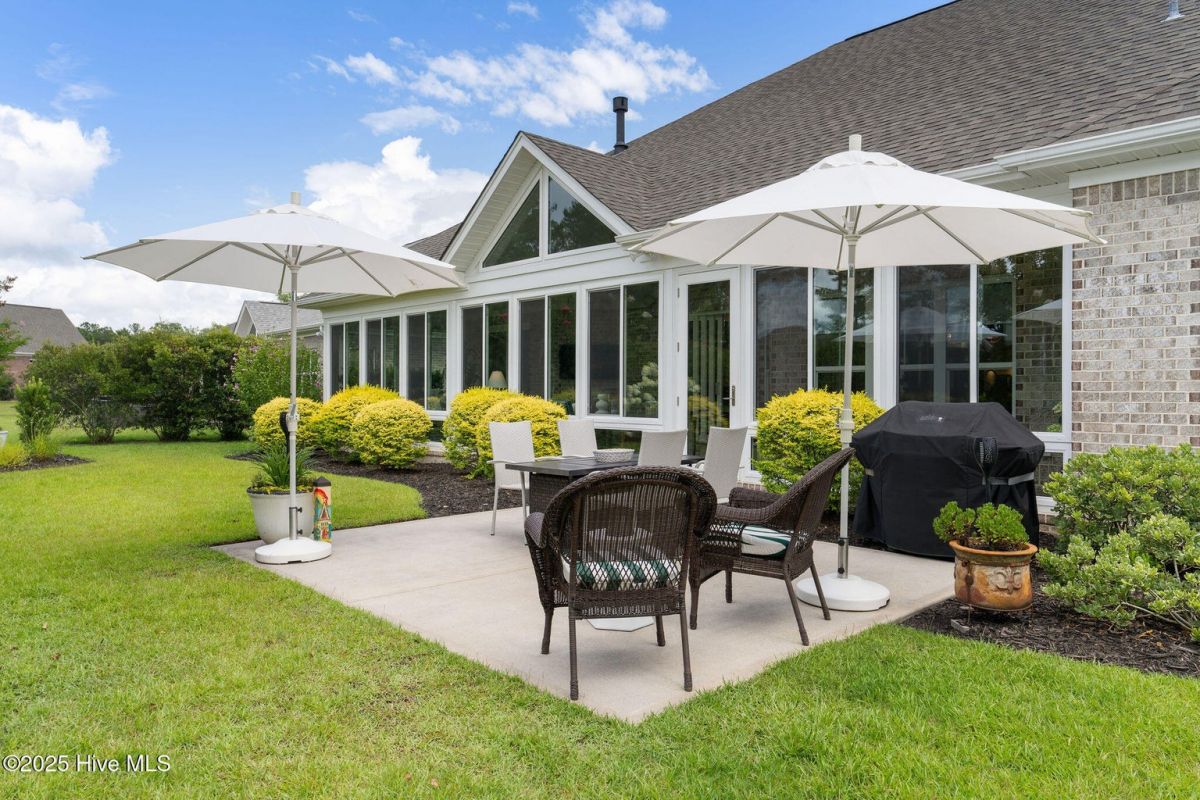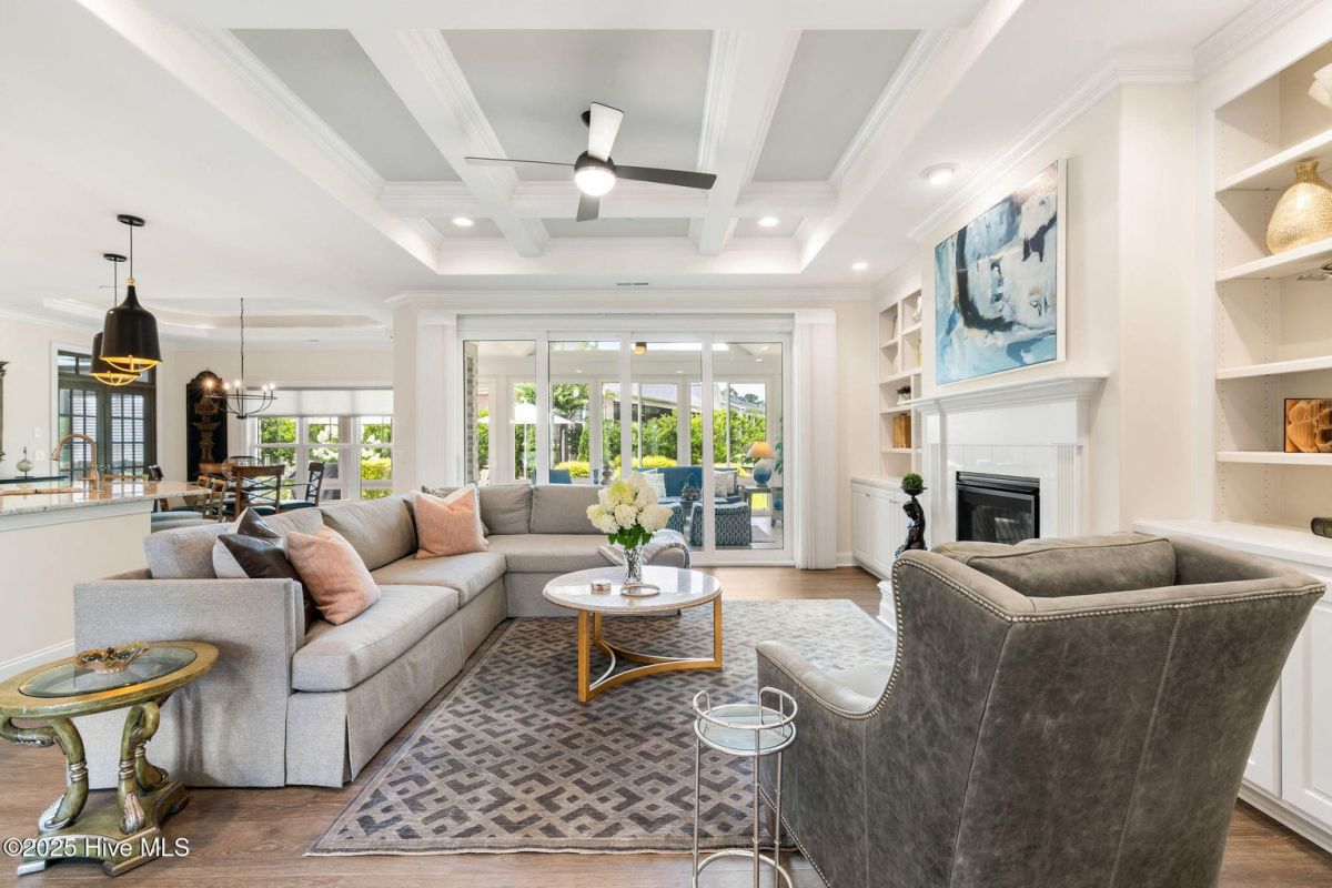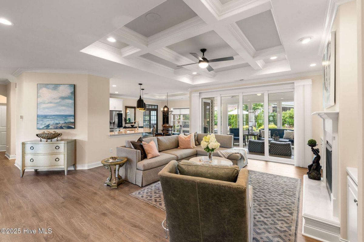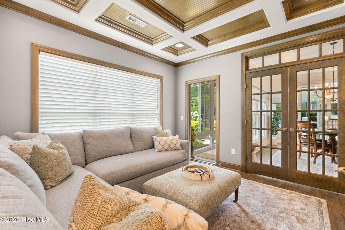 Located in the highly desirable, gated community of Compass Pointe, this beautifully designed home built in 2020, offers true single-level living with every space you could want - including a stunning glass-enclosed sunroom with vaulted ceiling. Thoughtfully laid out, the home features a spacious primary suite on one side, two guest bedrooms and a full bath on the other, a dining area off the foyer, a breakfast nook off the kitchen, a powder room, AND a private office with a beautifully stained coffered ceiling at the rear of the home. Crafted with attention to detail, the home showcases beadboard, a coffered ceiling in the family room, and four tray ceilings throughout. Wide hallways, large room sizes, and timeless finishes create a perfect blend of classic elegance and modern flow. The gourmet kitchen includes a gas cooktop, wall oven and microwave, and dual pantry cabinets, all open to a family room with custom built-ins, surround sound, and a gas fireplace. The private study offers direct access to the breathtaking sunroom, perfect for enjoying year-round natural light. The expansive primary suite features a tray ceiling, sunroom access as well, a luxurious spa-like bathroom with a zero-entry tiled shower, garden tub, and comfort-height fixtures. Additional highlights include wide-plank luxury vinyl flooring, custom window treatments, central sound and security systems, and extensive mature landscaping. The oversized garage offers an 18' wide door, separate golf cart bay, attic access, and suspended shelving for storage. Conveniently located near the Compass Pointe golf clubhouse, restaurant, and West Gate, this home seriously delivers comfort, style, and exceptional convenience!