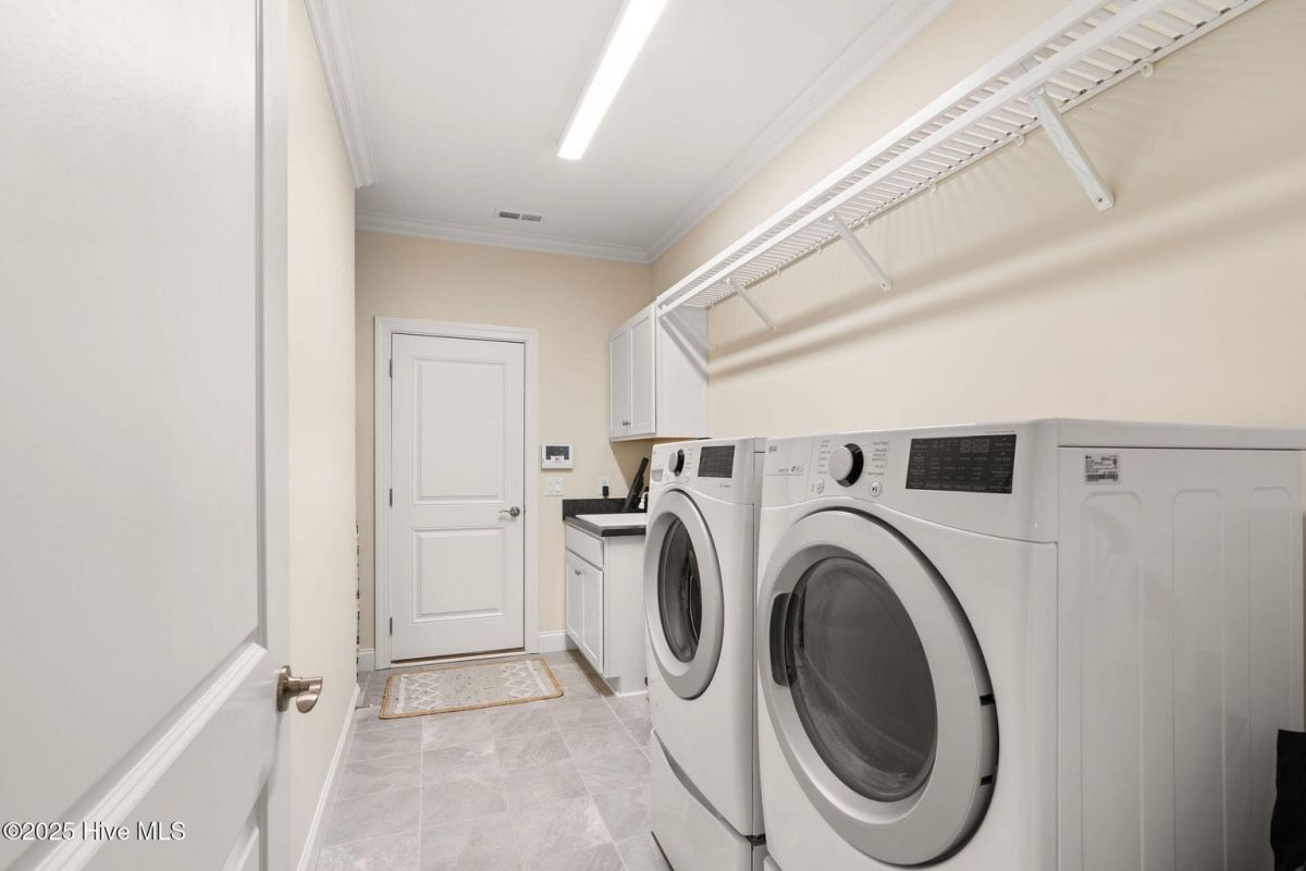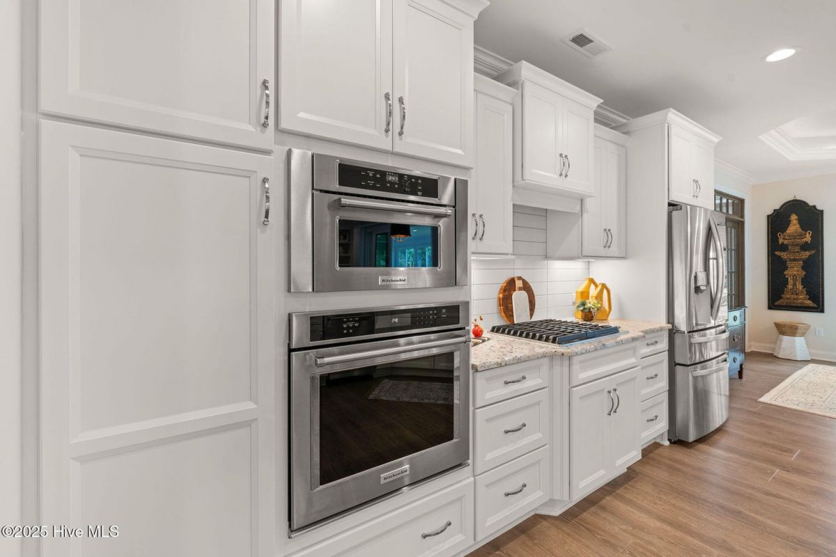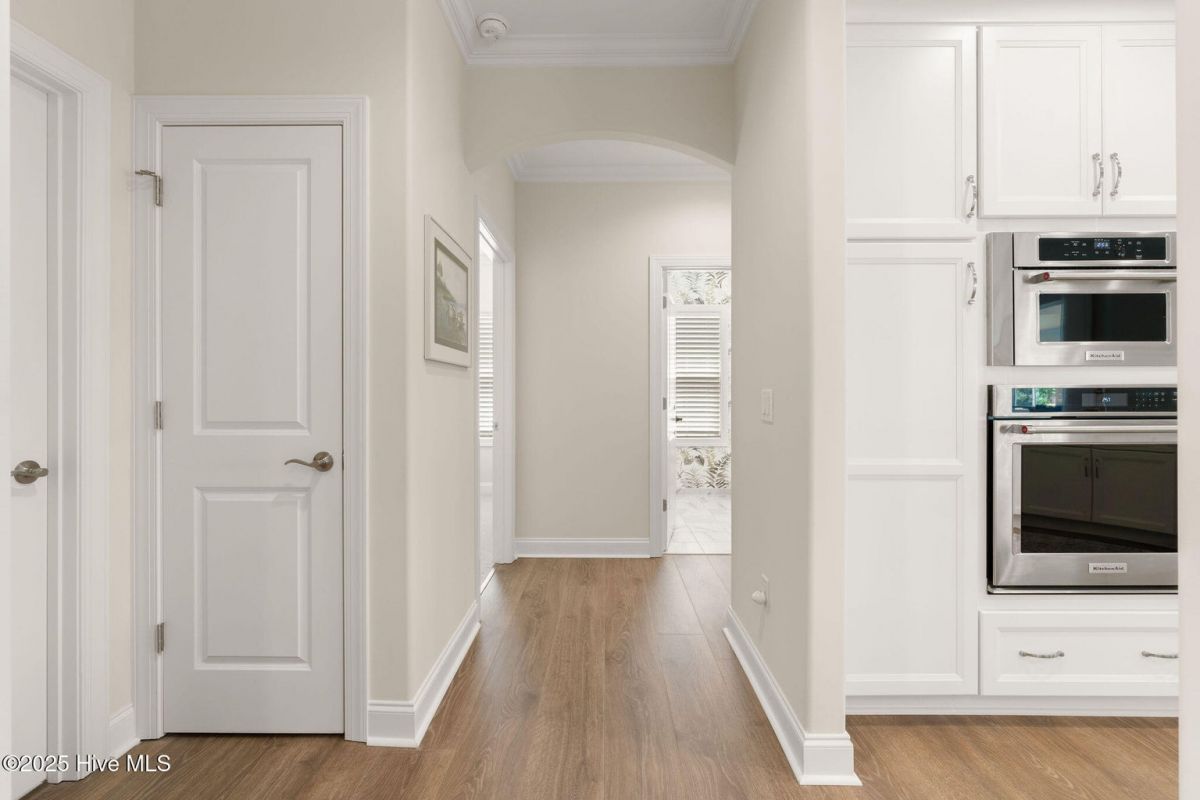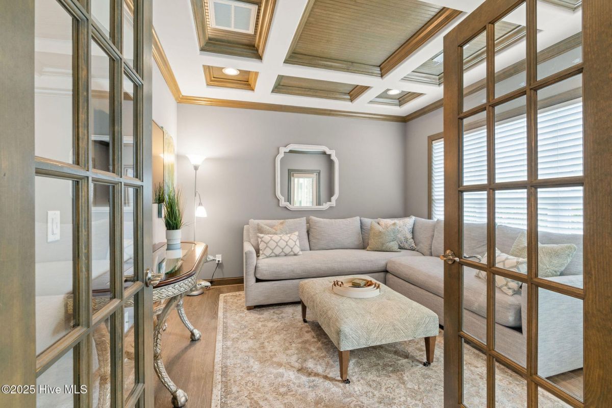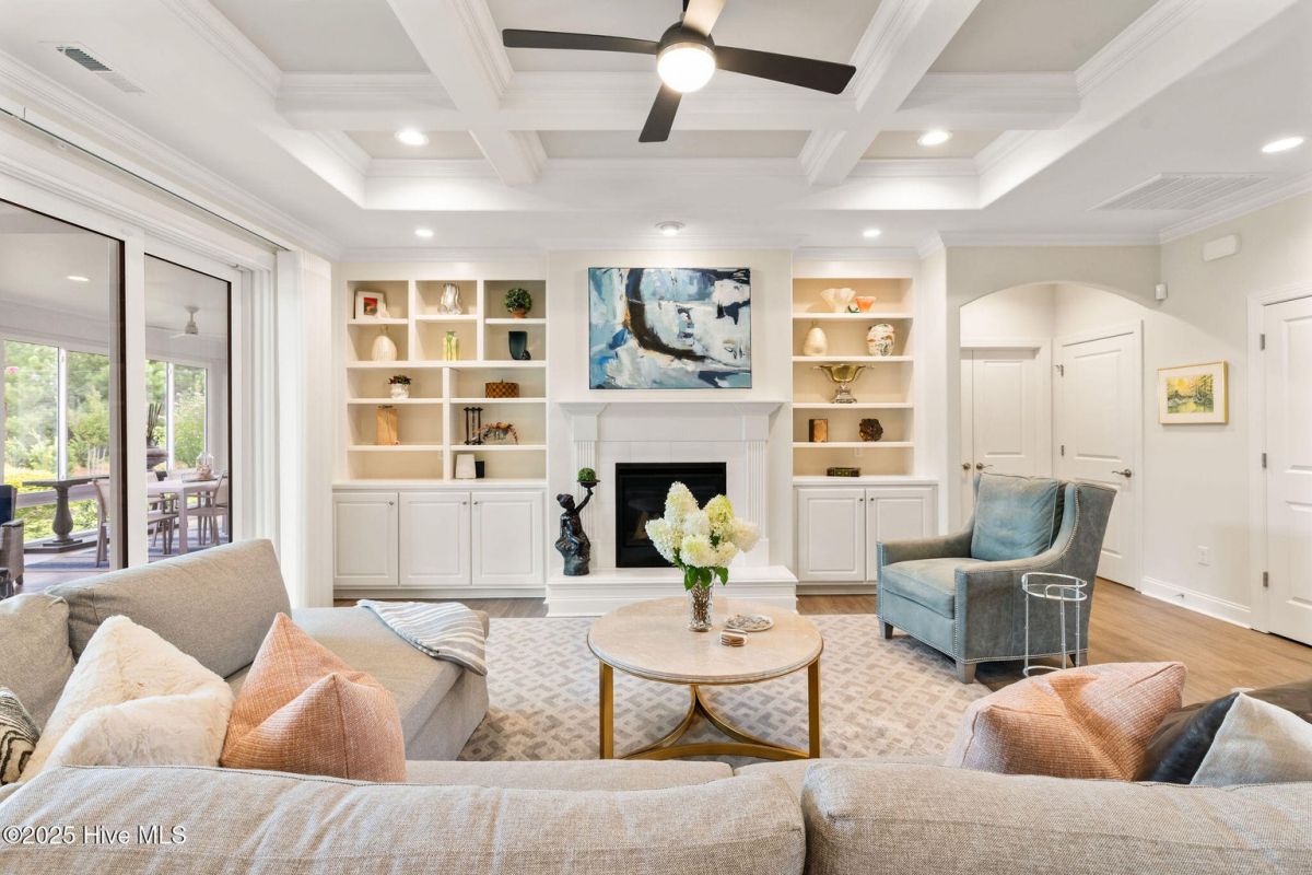 Located in the highly desirable, gated community of Compass Pointe, this beautifully designed home built in 2020, offers true single-level living with every space you could want - including a stunning glass-enclosed sunroom with vaulted ceiling. Thoughtfully laid out, the home features a spacious primary suite on one side, two guest bedrooms and a full bath on the other, a dining area off the foyer, a breakfast nook off the kitchen, a powder room, AND a private office with a beautifully stained coffered ceiling at the rear of the home. Crafted with attention to detail, the home showcases beadboard, a coffered ceiling in the family room, and four tray ceilings throughout. Wide hallways, large room sizes, and timeless finishes create a perfect blend of classic elegance and modern flow. The gourmet kitchen includes a gas cooktop, wall oven and microwave, and dual pantry cabinets, all open to a family room with custom built-ins, surround sound, and a gas fireplace. The private study offers direct access to the breathtaking sunroom, perfect for enjoying year-round natural light. The expansive primary suite features a tray ceiling, sunroom access as well, a luxurious spa-like bathroom with a zero-entry tiled shower, garden tub, and comfort-height fixtures. Additional highlights include wide-plank luxury vinyl flooring, custom window treatments, central sound and security systems, and extensive mature landscaping. The oversized garage offers an 18' wide door, separate golf cart bay, attic access, and suspended shelving for storage. Conveniently located near the Compass Pointe golf clubhouse, restaurant, and West Gate, this home seriously delivers comfort, style, and exceptional convenience!