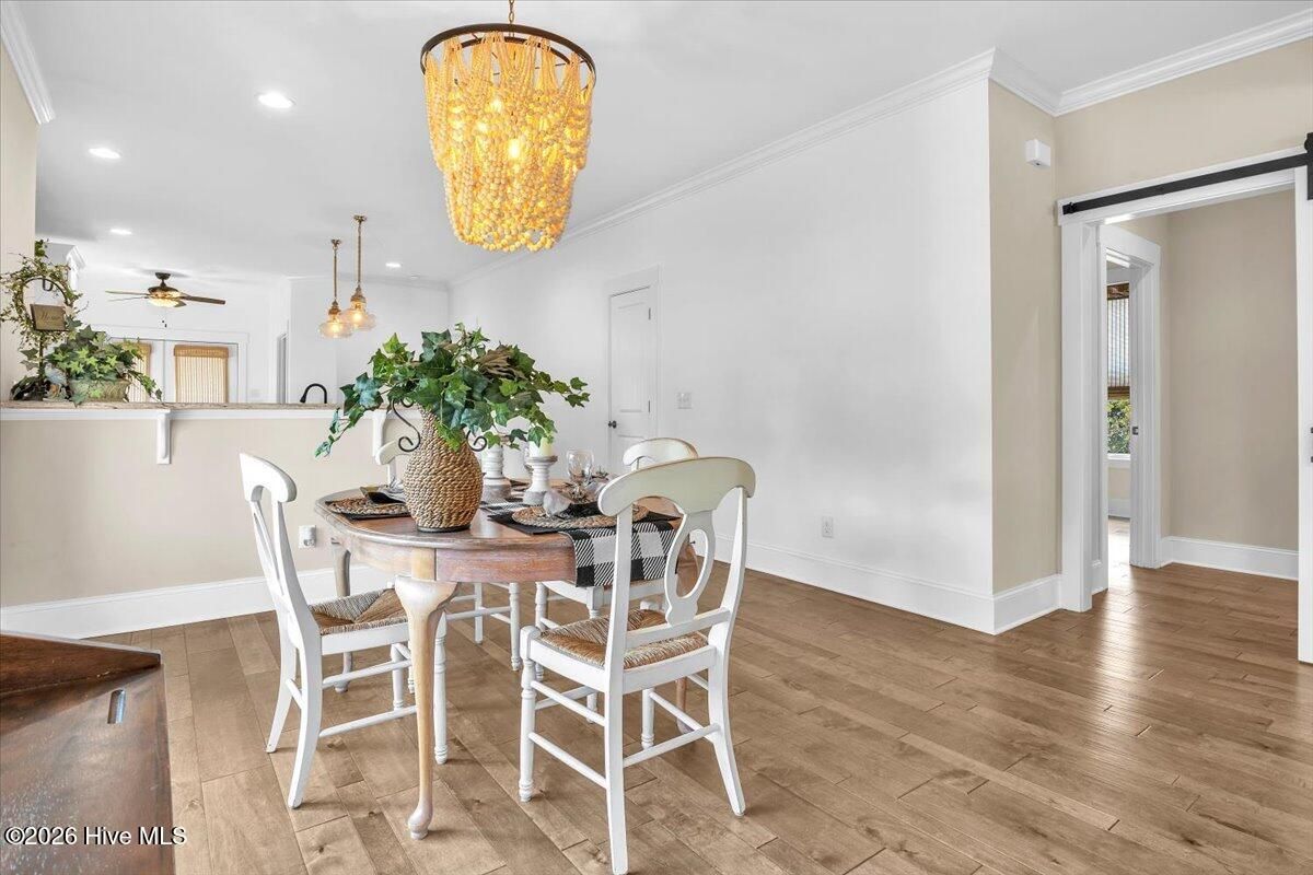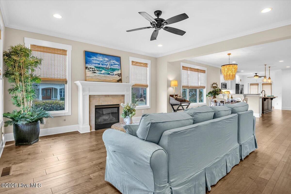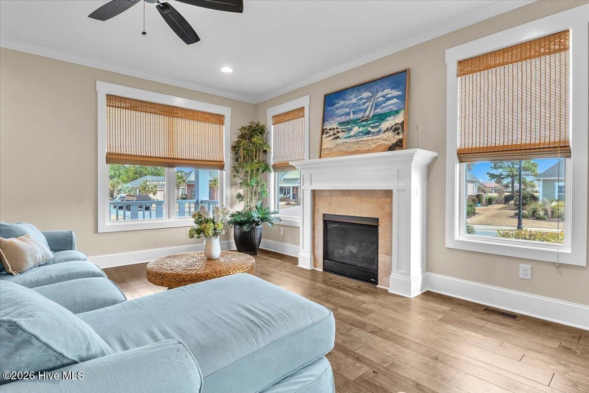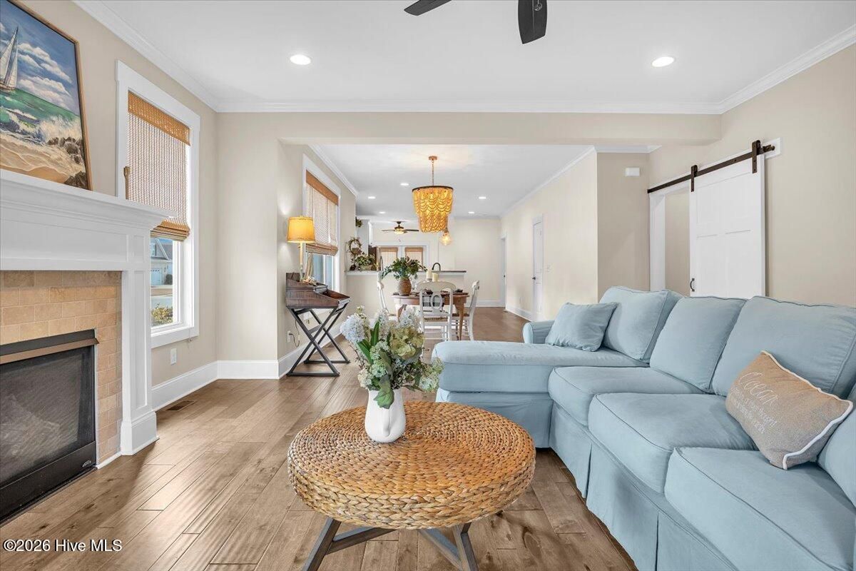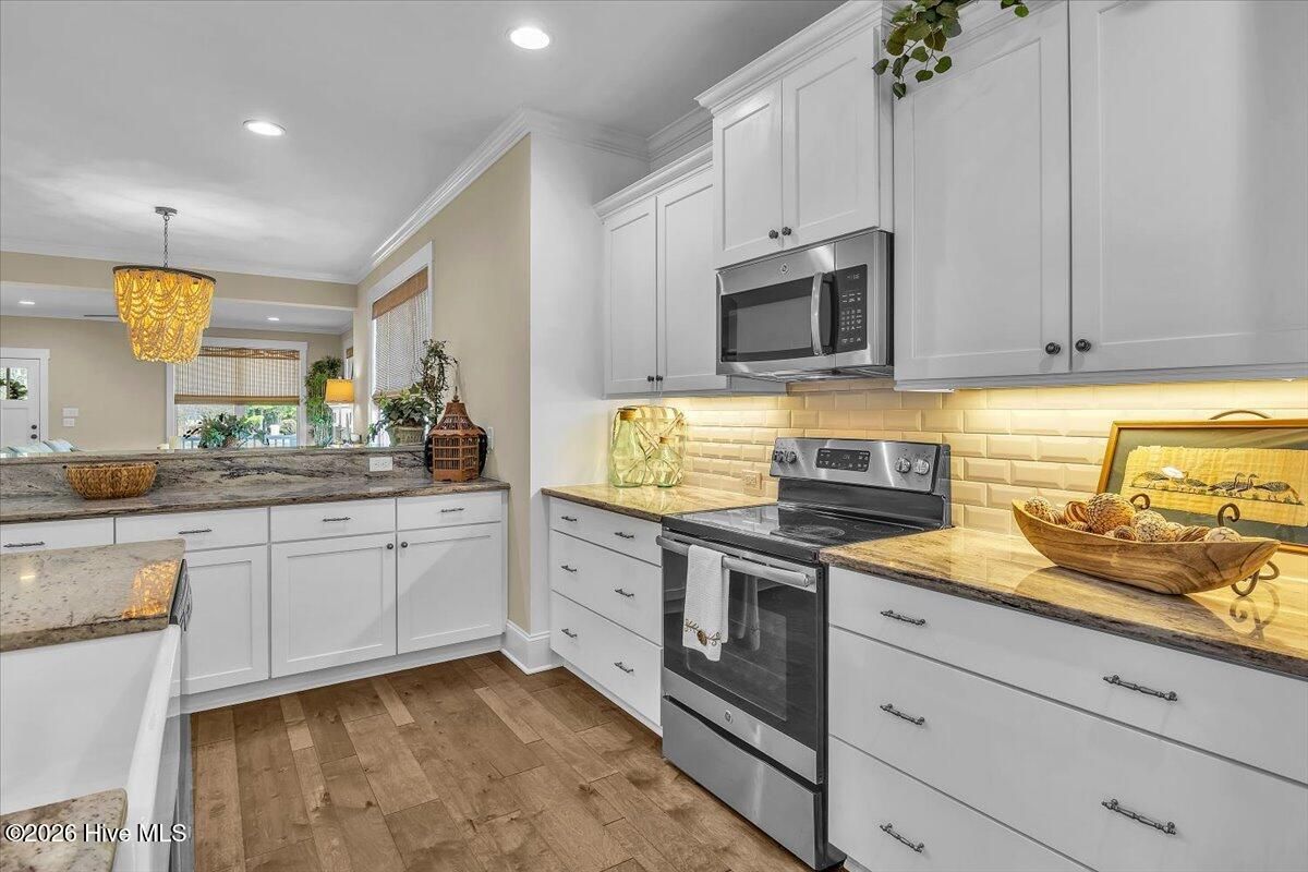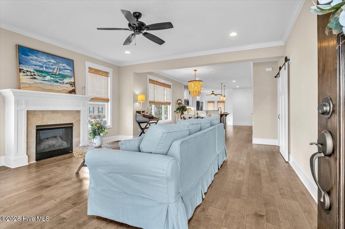 Perfectly situated on a beautiful corner lot in the Hammocks Cove neighborhood of Compass Pointe, this charming original cottage home combines timeless character, thoughtful design, and move-in-ready comfort. Built by Cardinal Builders, it is an impeccably maintained home and offers 3 bedrooms, 2½ baths. It is thoughtfully designed for comfortable easy living. As you enter, you are greeted by warm hardwood floors, abundant windows that fill the home with natural light, a beautiful fireplace mantel, and a stylish barn door that provides privacy for the two guest bedrooms. The private primary suite is located at the back of the home and features a classic clawfoot soaking tub and separate shower, creating a peaceful retreat. The bright and welcoming kitchen features neutral soft-close cabinetry, granite countertops, stainless steel appliances, a spacious pantry, and a large center island perfect for casual dining and gathering with friends. Just off the kitchen is a charming breakfast nook--an inviting spot for morning coffee, casual meals, or even a friendly game of cards. The screened-in porch off the breakfast nook offers a relaxing outdoor living space that has been fully painted and sealed for easy maintenance. A pathway from the porch leads to the detached garage, which includes a finished bonus room with a half bath. This flexible space is ideal for a private guest retreat, home office, art or music studio, or fitness room. Bonus features include a Rinnai tankless water heater and generator hookup for added peace of mind. Residents of Compass Pointe enjoy exceptional resort-style amenities including the Grand Lanai clubhouse, indoor and outdoor pools, lazy river, fitness center, tennis and pickleball courts. Enjoy low-maintenance coastal living in one of the Wilmington area's most sought-after gated communities. This is a rare opportunity to own one of Compass Pointe's original cottage homes, offering timeless charm and flexible living space in a vibrant coastal lifestyle community.