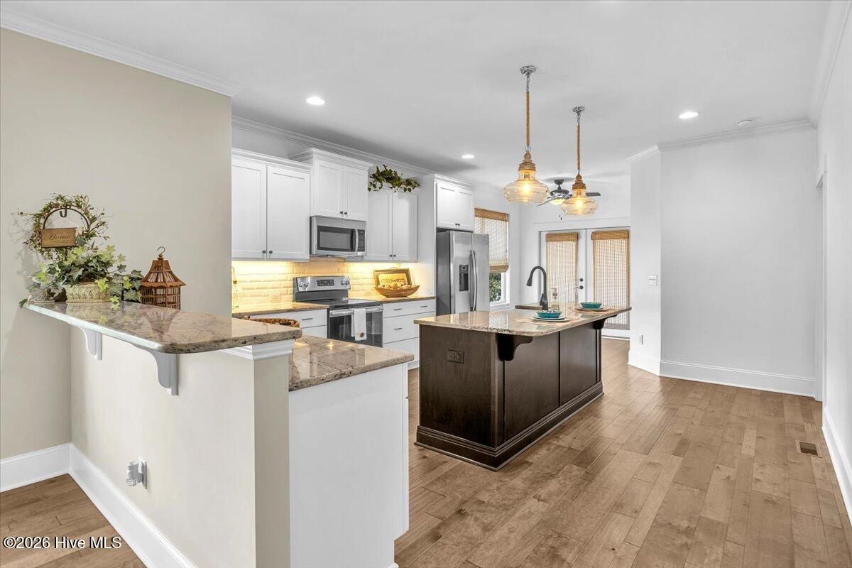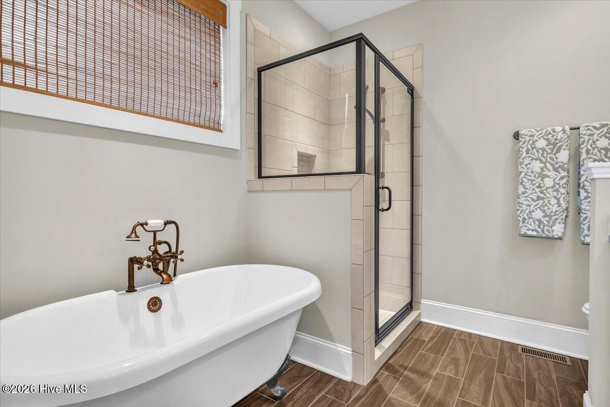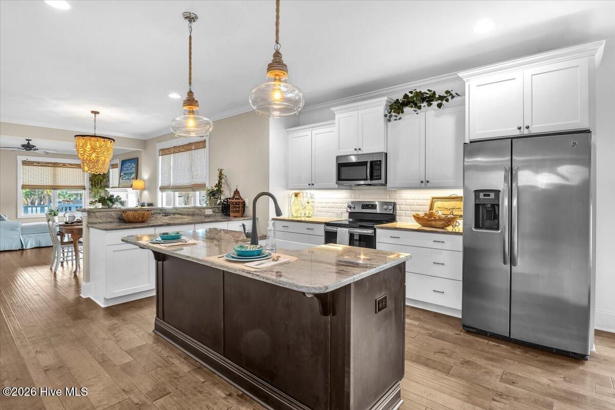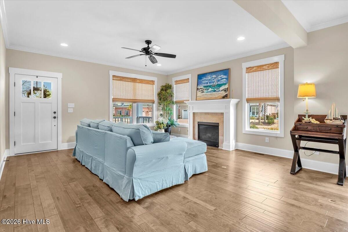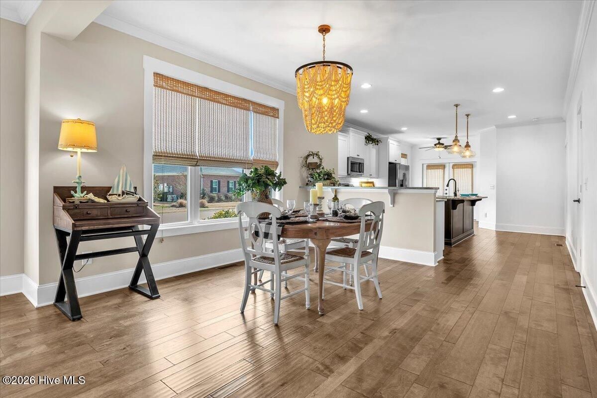 Perfectly situated on a beautiful corner lot in the Hammocks Cove neighborhood of Compass Pointe, this charming original cottage home combines timeless character, thoughtful design, and move-in-ready comfort. Built by Cardinal Builders, it is an impeccably maintained home and offers 3 bedrooms, 2½ baths. It is thoughtfully designed for comfortable easy living. As you enter, you are greeted by warm hardwood floors, abundant windows that fill the home with natural light, a beautiful fireplace mantel, and a stylish barn door that provides privacy for the two guest bedrooms. The private primary suite is located at the back of the home and features a classic clawfoot soaking tub and separate shower, creating a peaceful retreat. The bright and welcoming kitchen features neutral soft-close cabinetry, granite countertops, stainless steel appliances, a spacious pantry, and a large center island perfect for casual dining and gathering with friends. Just off the kitchen is a charming breakfast nook--an inviting spot for morning coffee, casual meals, or even a friendly game of cards. The screened-in porch off the breakfast nook offers a relaxing outdoor living space that has been fully painted and sealed for easy maintenance. A pathway from the porch leads to the detached garage, which includes a finished bonus room with a half bath. This flexible space is ideal for a private guest retreat, home office, art or music studio, or fitness room. Bonus features include a Rinnai tankless water heater and generator hookup for added peace of mind. Residents of Compass Pointe enjoy exceptional resort-style amenities including the Grand Lanai clubhouse, indoor and outdoor pools, lazy river, fitness center, tennis and pickleball courts. Enjoy low-maintenance coastal living in one of the Wilmington area's most sought-after gated communities. This is a rare opportunity to own one of Compass Pointe's original cottage homes, offering timeless charm and flexible living space in a vibrant coastal lifestyle community.