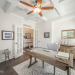 This Logan Homes ''Seagrass'' Villa is located on hole #13 in Greenway Landing at Compass Pointe. This bright, open floor plan has three bedrooms, and three baths as well as an office/den/media room. The living area leads to a four seasons lanai that has beautiful views of the green on hole #13. The kitchen boasts a large island with quartz countertops and bar seating on one side, custom backsplash, gas cooktop, white soft close cabinets/drawers and a nice sized pantry and utility closet in the hall leading to the two car garage. The Master suite has upgraded Berber carpet, transom windows, large master bath with walk-in tiled shower, water closet, master closet, linen closet, double vanity and door to the laundry room from the bath. There is a guest bedroom and full bath downstairs, and another guest bed and full bath upstairs. There are beautiful light fixtures, ceiling fans and wood blinds throughout. Washer/dryer and refrigerator are included with the sale. Come see this gem today!