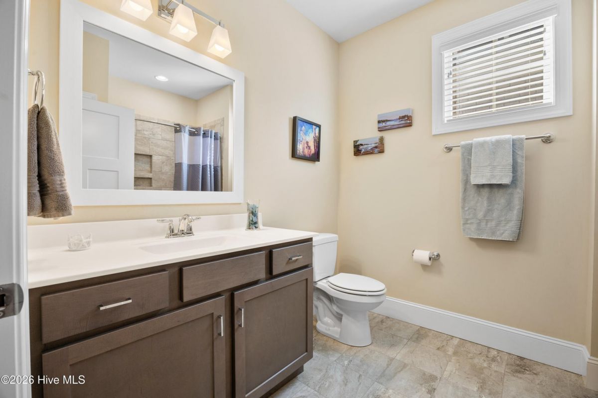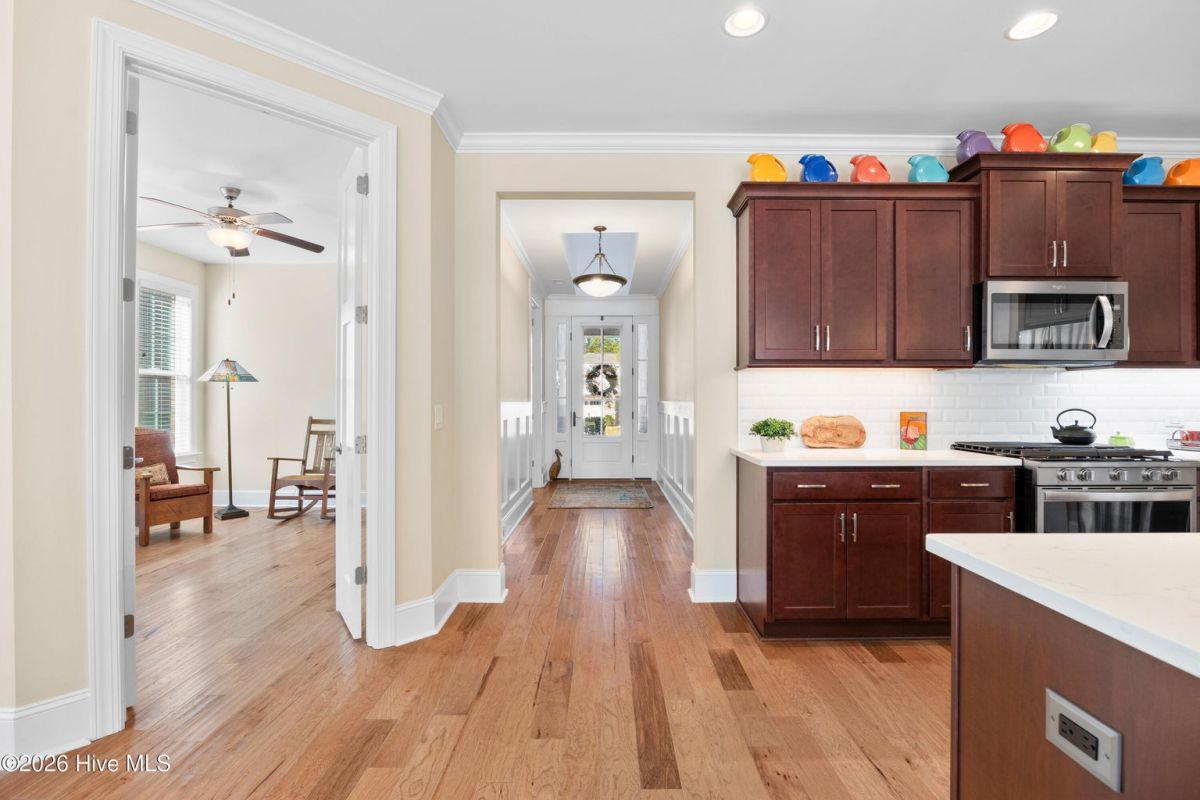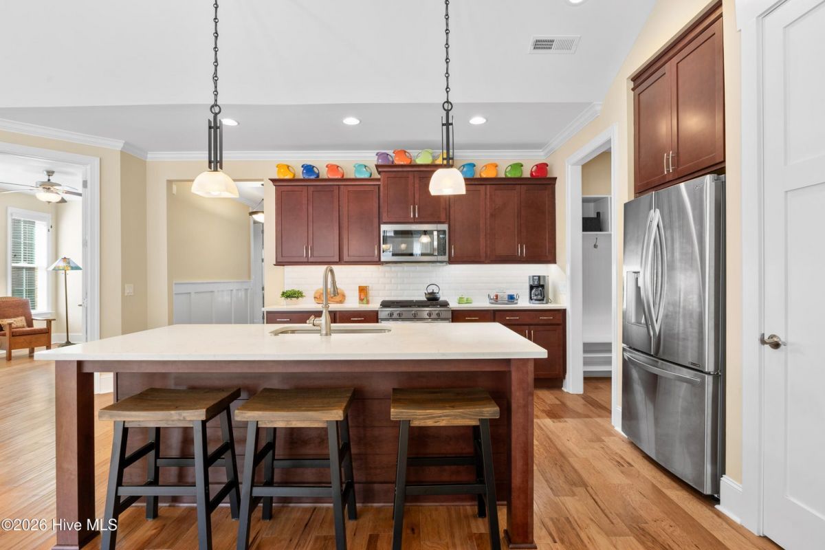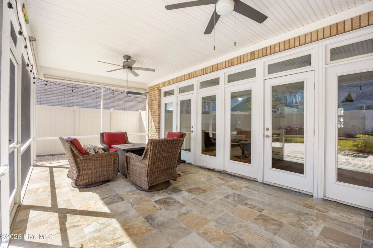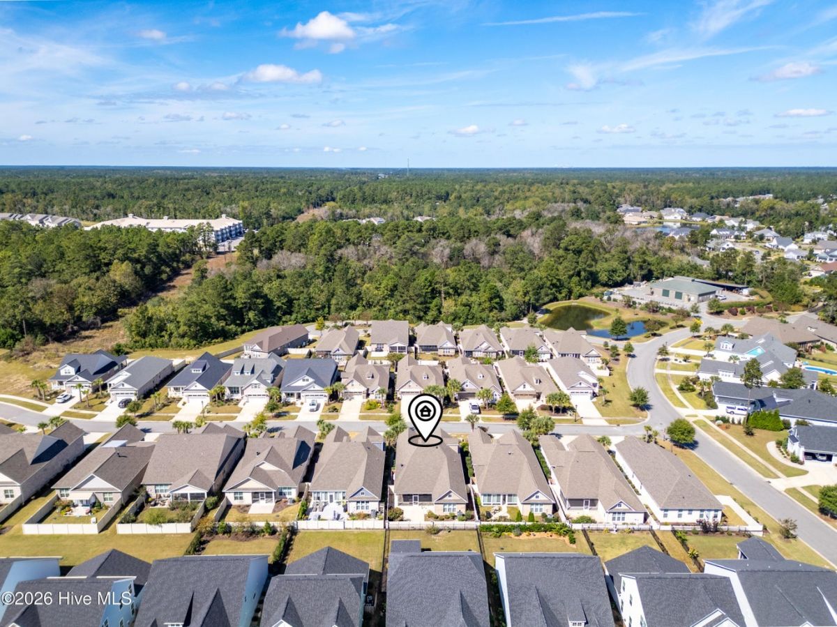 Discover this beautiful, low-maintenance patio home by Hagood Homes, perfectly situated in the resort-style community of Compass Pointe. Designed for ease and longevity, this ''age-in-place'' home features low thresholds, an open-concept layout, and elegant hardwood floors throughout. The heart of the home is a light-filled vaulted great room featuring built-in cabinetry, a gas fireplace, and wall of full-height windows and French doors with transoms. The gourmet kitchen boast quartz countertops, a large island with seating, upgraded cabinetry with pull-outs, and premium stainless steel appliances. The primary suite serves as a private retreat with vaulted ceilings and a spa-like bathroom featuring a zero-entry shower and safety grab bars. Two additional guest bedrooms are located on the main level, with a full bath in the center. This area is separated by a door for ultimate privacy. Ascend the 48'' wide staircase to a large FROG flex space with a full bath and access to the attic. Outside, enjoy an extra-large screened porch with tile flooring and roll-down shades. The backyard has been professionally upgraded with Empire Zoysia sod and new River Birch trees. Live like you're on vacation with access to a clubhouse, indoor/outdoor pools, a lazy river, fitness center, tennis, pickleball, and optional golf club membership. Minutes from downtown Wilmington and Leland. Quick Reference Details • Included Items (Convey ''As-Is''): Kitchen refrigerator, bar stools, porch wicker furniture, firepit table, washer/dryer, laundry room mini fridge, and garage shelving. • Excluded Items: Art pole in the yard and all hanging artwork. • Recent Updates: Freshly painted primary suite and exterior trim; professional power wash; re-graded yard with new sod • HOA Dues: $381.73/month (Includes all amenities, landscaping, and irrigation water).