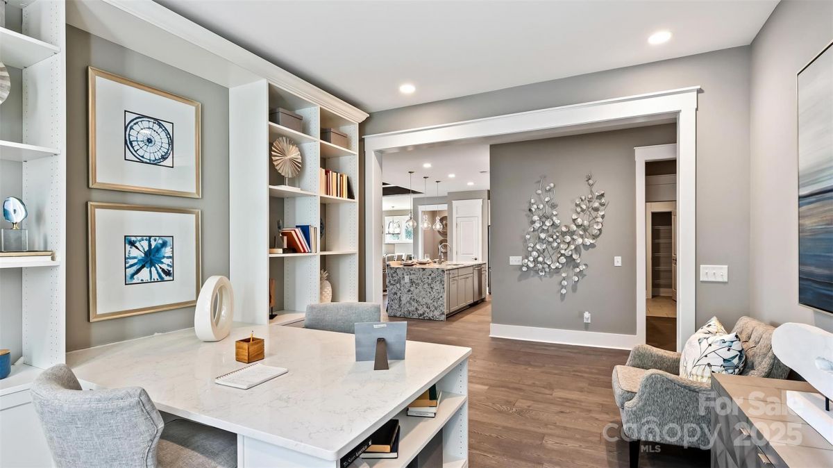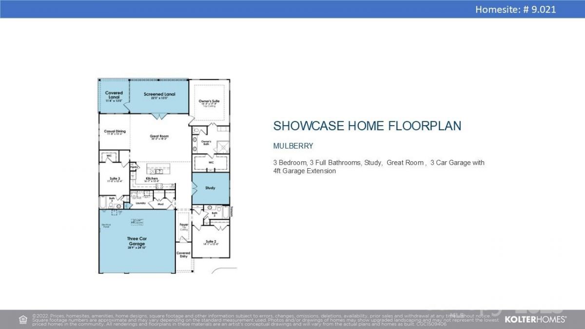 ***UNDER CONSTRUCTION*** Model photos used for reference. This Mulberry floorplan has 3-bedroom, 3-bathroom, Study, 3-Car Garage, is situated on a lot with no homes behind it. The foyer enhanced with tray ceilings leads to a private study with glass French doors. The great room connects to a large screened-in porch with an extended patio, creating a seamless indoor-outdoor living space. There is also a dedicated dining or flex space for gatherings. The kitchen includes dual pantry closets, a gas cooktop, built-in microwave, and quartz countertops. The primary suite has a tray ceiling and an en suite bath with double sinks and a frameless shower door. All bathrooms feature tiled walls. Ceiling fans are installed in all bedrooms, the study, great room, and screened porch. A built-in Taexx pest control system is included, and the 3-car garage features a four-foot extension and attic storage.