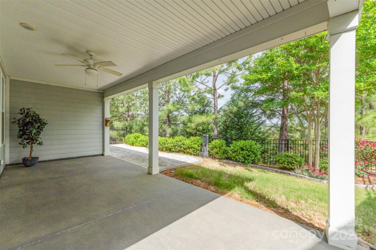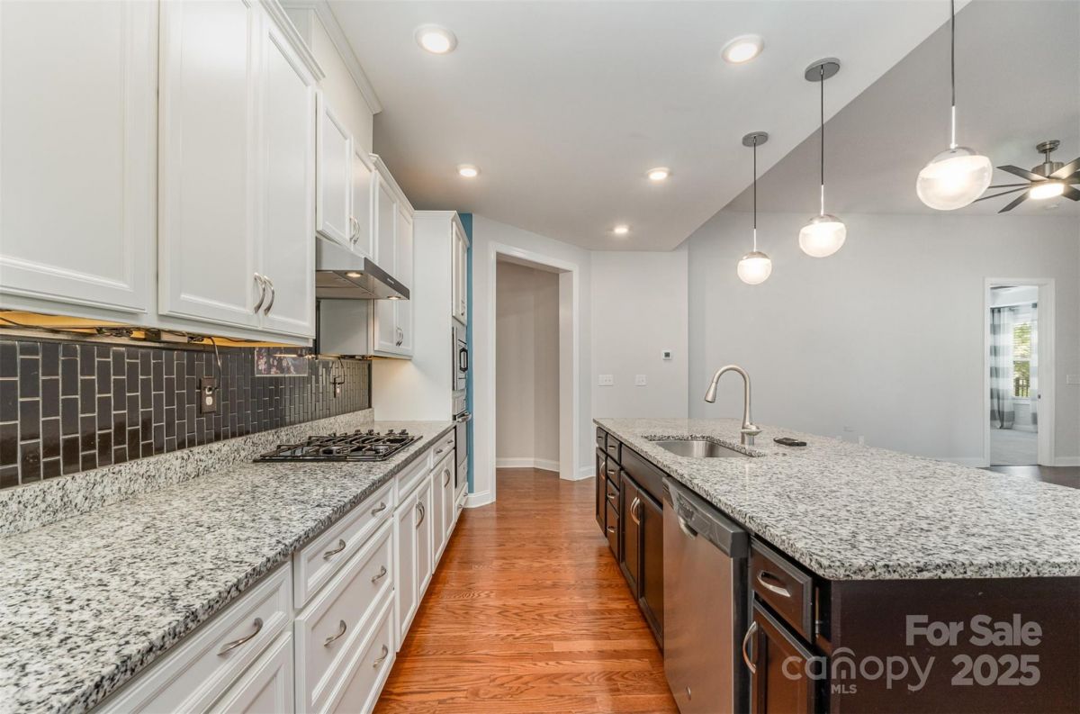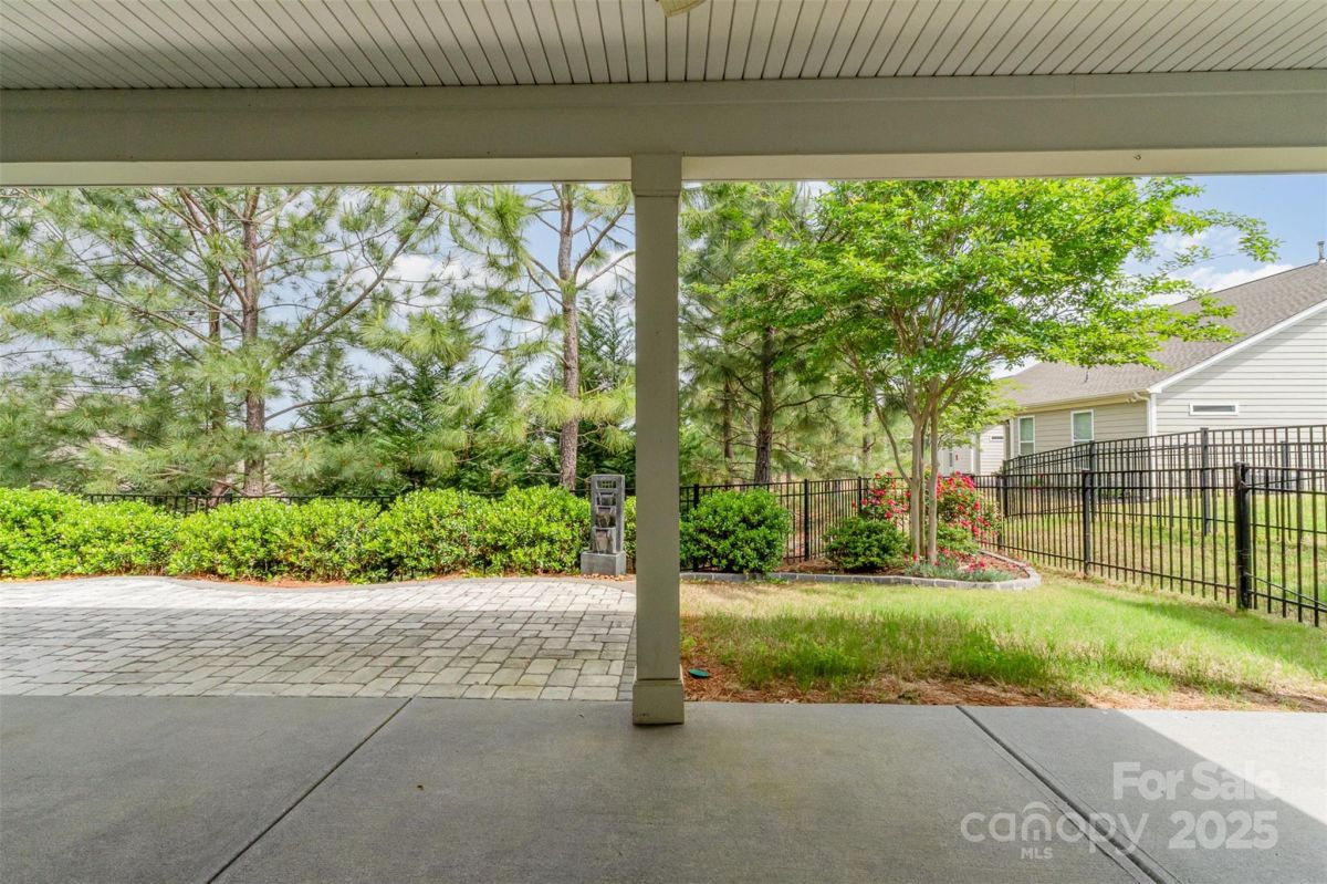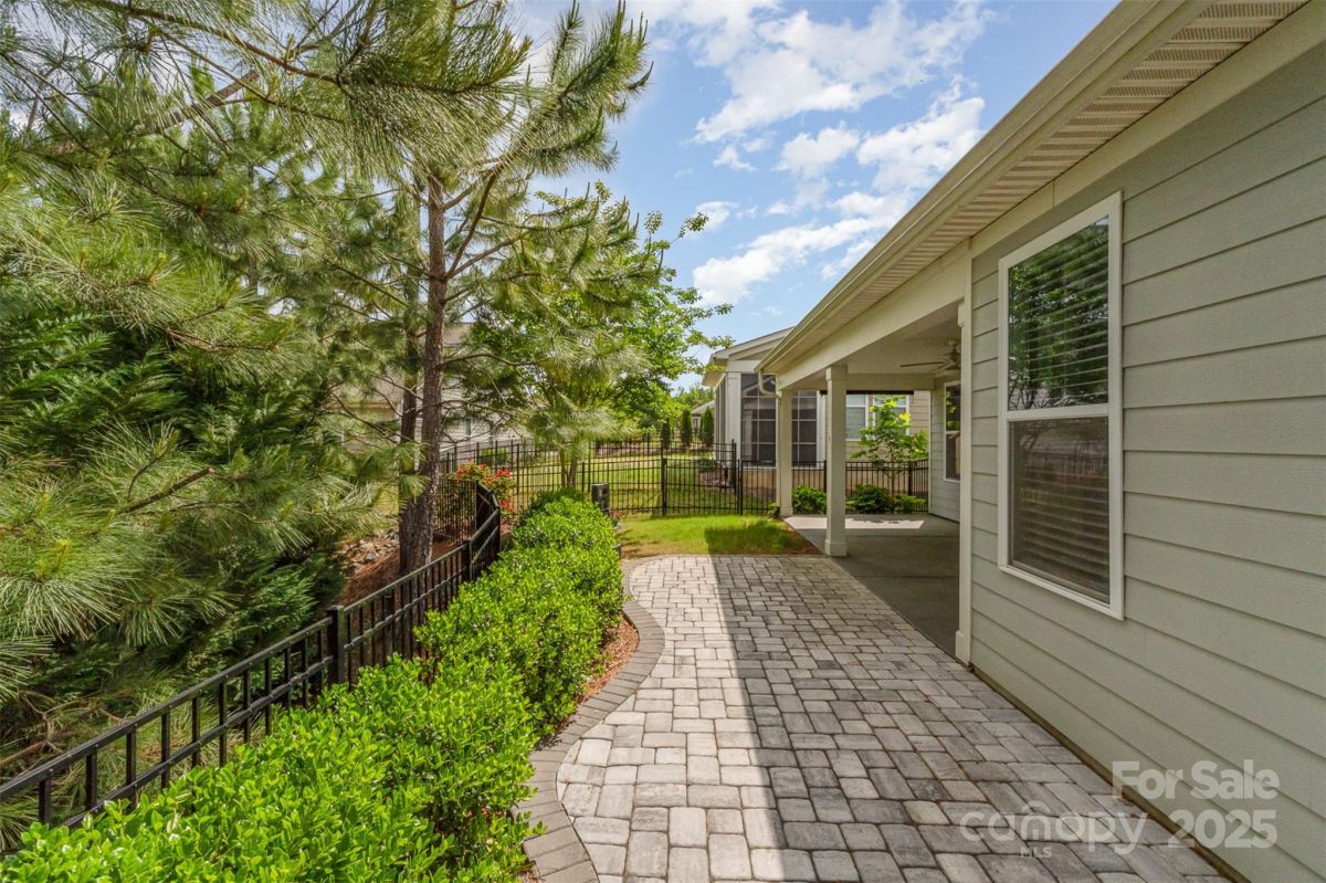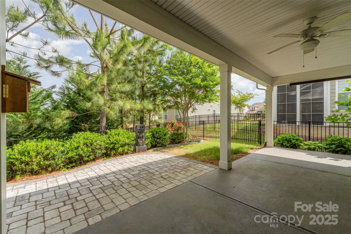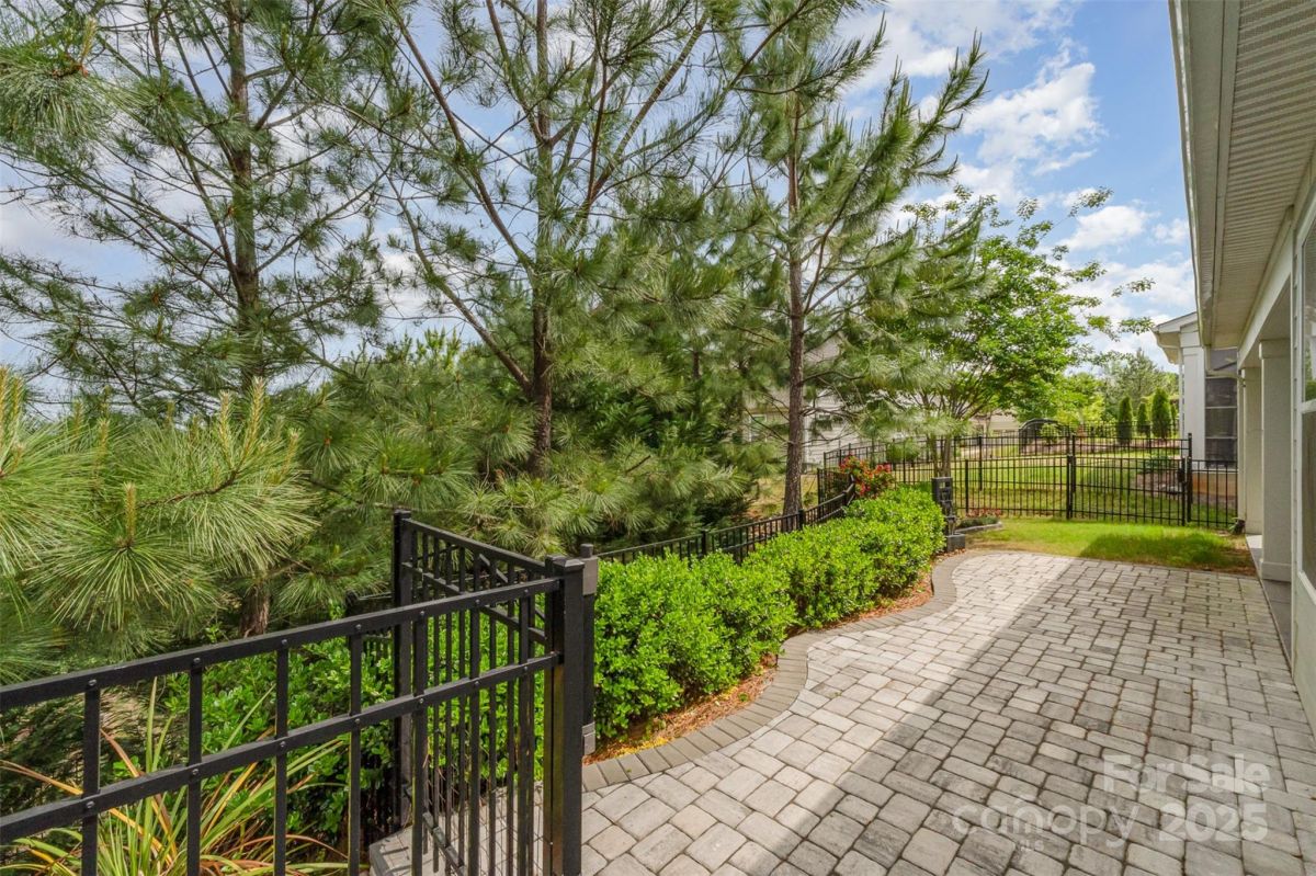 Welcome home! Inside you’ll find two well-appointed bedrooms, each with ceiling fans, sharing a bathroom featuring modern cabinetry and lighting. Step into the expansive open-concept living area, where the custom kitchen takes center stage with white cabinetry, stainless steel sink, built-in ovens, a gas cooktop with stainless vent hood, eye-catching backsplash, under cabinet lighting, and a spacious walk-in pantry. The luxurious primary suite is generously sized and flows seamlessly into a beautifully upgraded en-suite bath, complete with an oversized walk-in shower, granite countertops, custom cabinetry, designer light fixtures, and a walk-in custom closet. Step outside to your private backyard retreat—an outdoor oasis featuring a large covered patio with ceiling fan, stone paver flooring and steps, fully fenced yard, and lush landscaping that offers both privacy and tranquility. The backyard also features a fountain that will convey with the property. Pickleball court community!