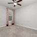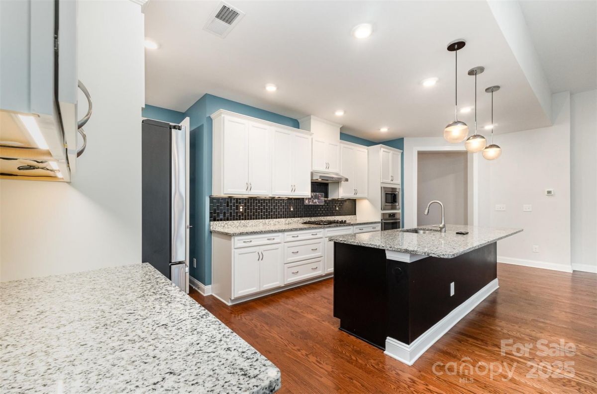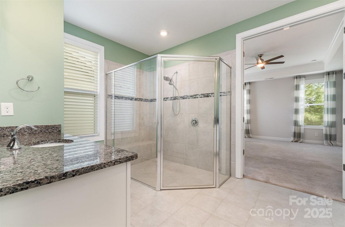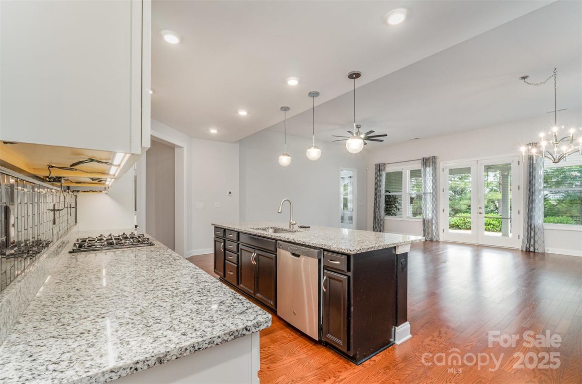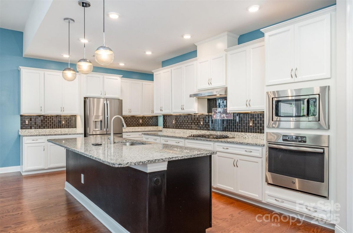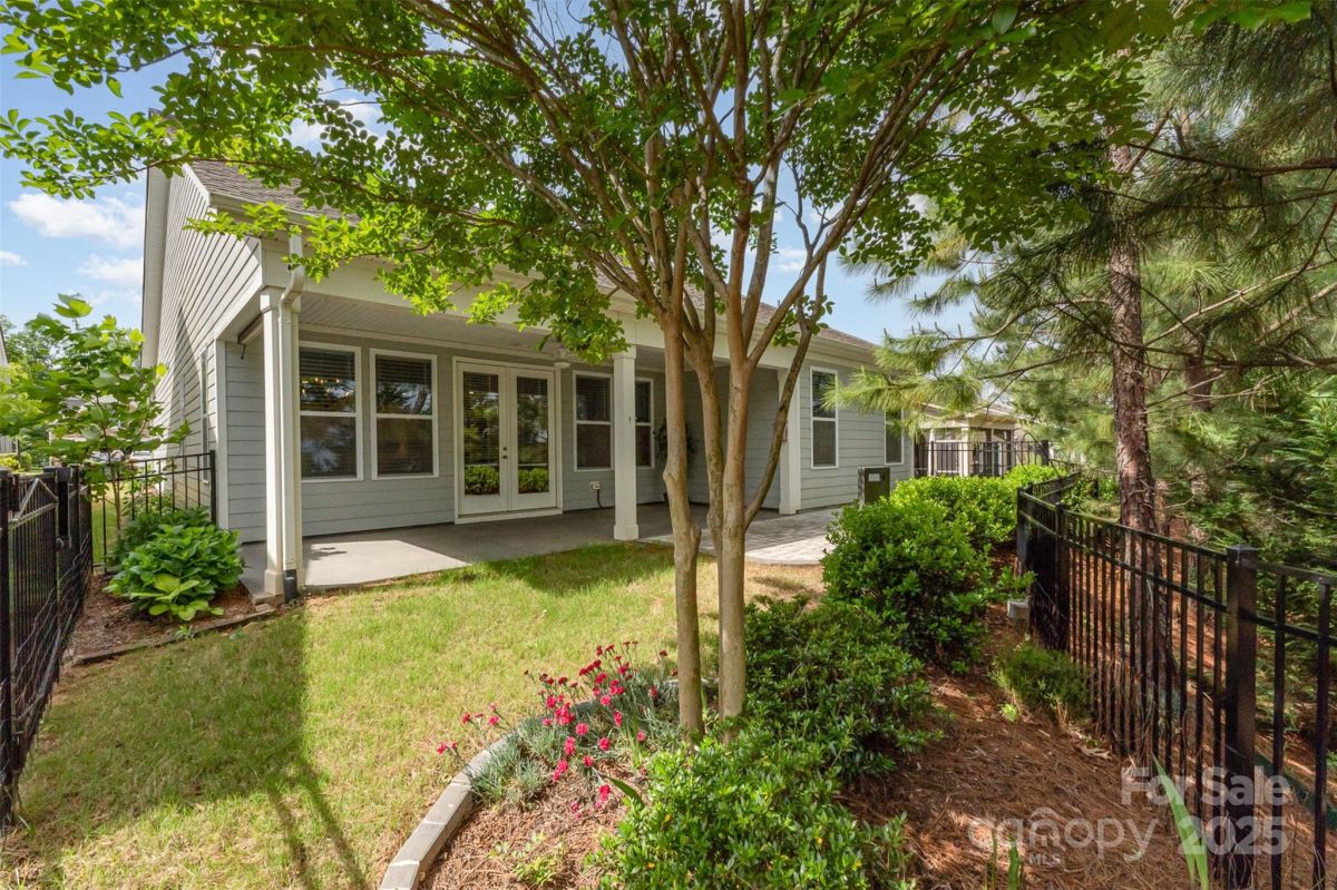 Welcome home! Inside you’ll find two well-appointed bedrooms, each with ceiling fans, sharing a bathroom featuring modern cabinetry and lighting. Step into the expansive open-concept living area, where the custom kitchen takes center stage with white cabinetry, stainless steel sink, built-in ovens, a gas cooktop with stainless vent hood, eye-catching backsplash, under cabinet lighting, and a spacious walk-in pantry. The luxurious primary suite is generously sized and flows seamlessly into a beautifully upgraded en-suite bath, complete with an oversized walk-in shower, granite countertops, custom cabinetry, designer light fixtures, and a walk-in custom closet. Step outside to your private backyard retreat—an outdoor oasis featuring a large covered patio with ceiling fan, stone paver flooring and steps, fully fenced yard, and lush landscaping that offers both privacy and tranquility. The backyard also features a fountain that will convey with the property. Pickleball court community!