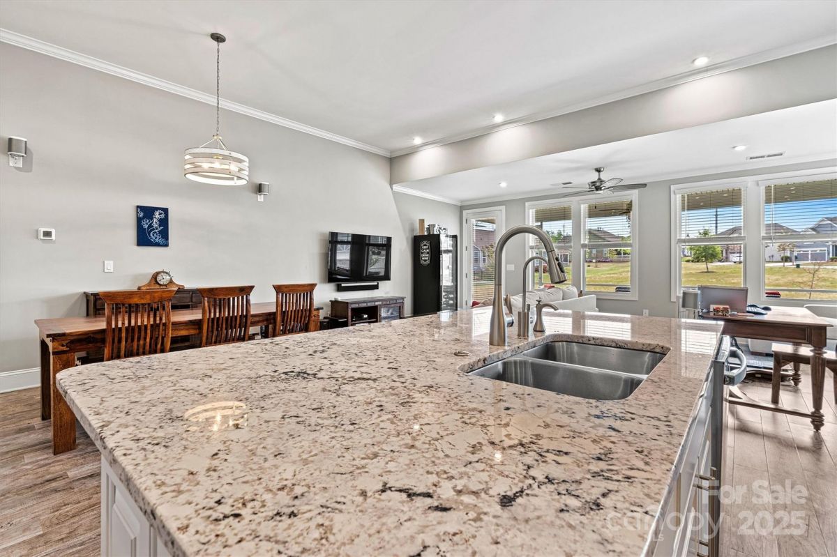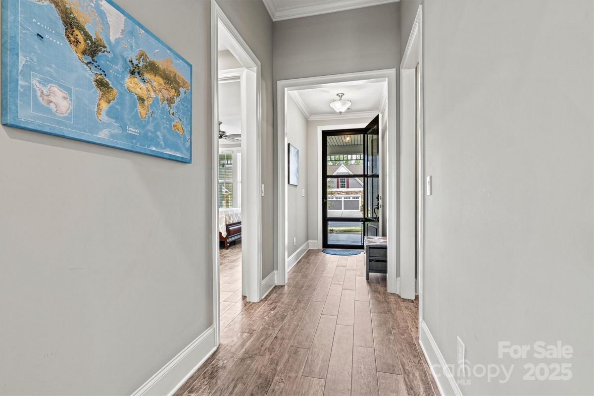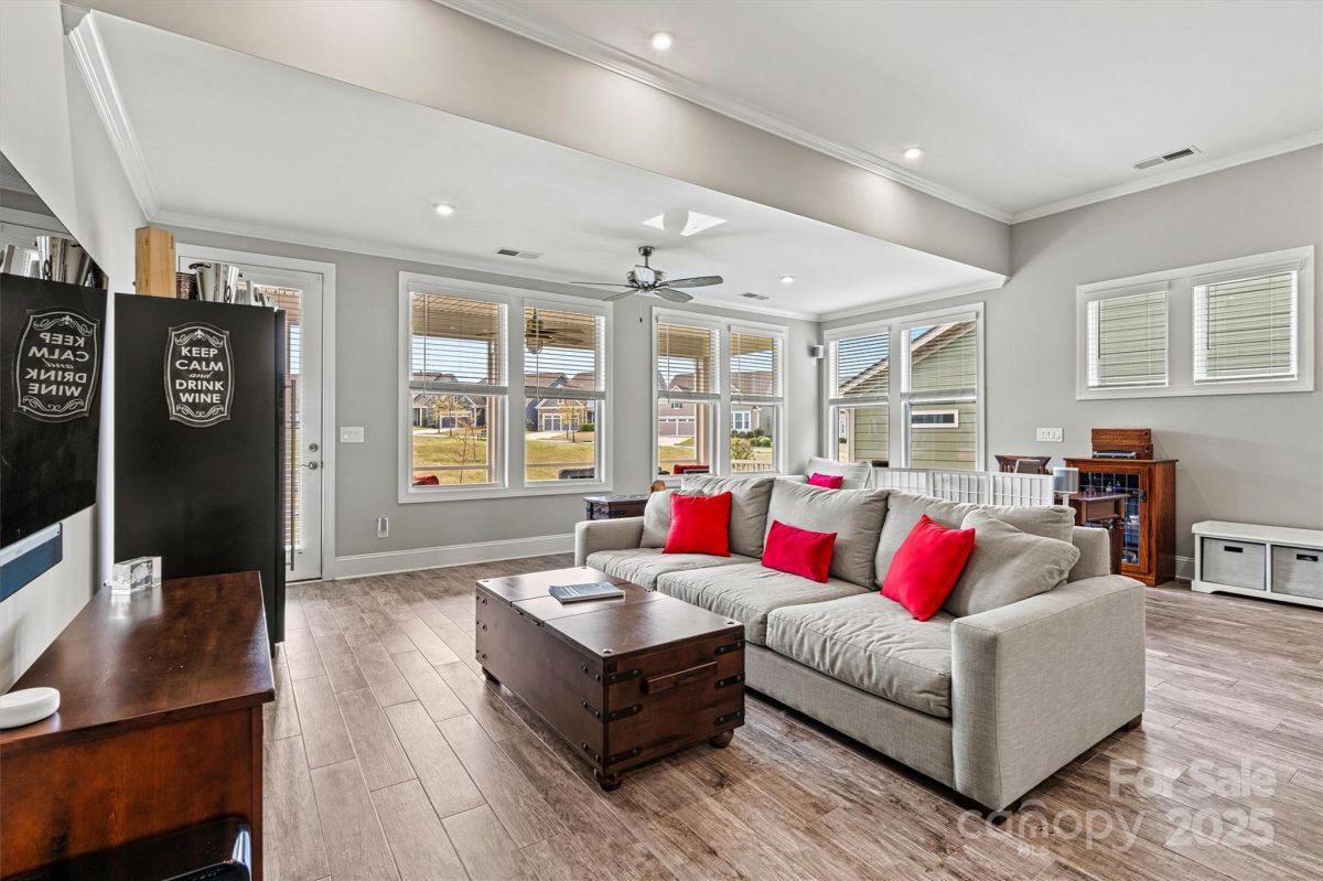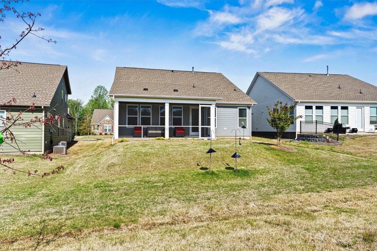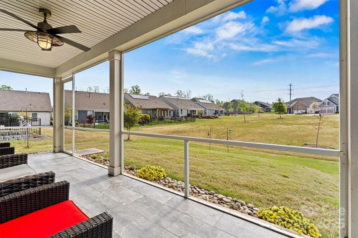 This beautifully upgraded 2-bed/2-bath home features an extended living area & large tiled screened porch overlooking serene green space—offering rare PRIVACY with no rear neighbors! The front porch & garage have durable epoxy coatings. Eye-catching upgrades inc. stone accents, stylish metal roof detail & low-maintenance fiber cement siding. INSIDE: porcelain tile floors (NO CARPET!), crown molding, upgraded baseboards/fixtures, and an open layout ideal for entertaining. The upgraded Gourmet Kitchen shines with abundant cabinetry, contrasting perimeter base cabinets, granite counters, center island, and CUSTOM Pantry shelving. The Primary Suite features a spa-like bath with designer tiled shower, handheld, dual vanities & spacious CUSTOM walk-in (and Linen) closets. Enjoy low-maintenance living w/lawn care, security system & high-speed internet. Vibrant 55+ community with top-tier amenities, including indoor/outdoor pools, sports courts, walking trails, and a 17,000+ sq ft clubhouse!