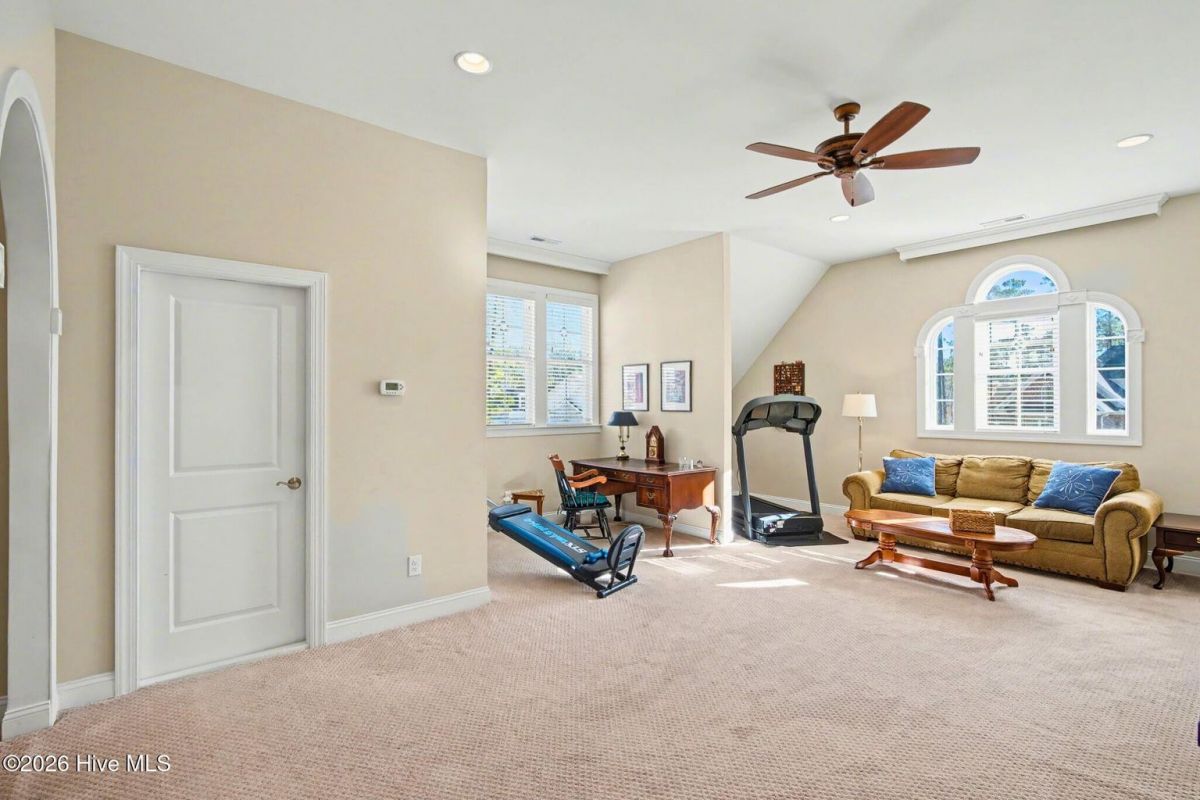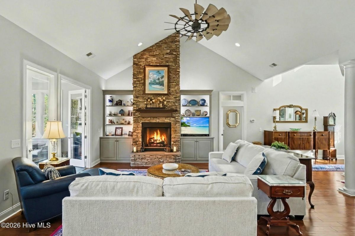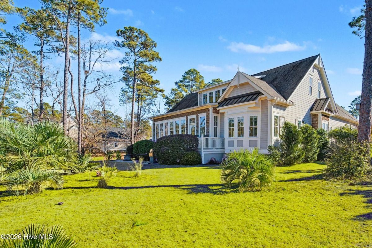 Exquisite Low Country Estate with Tee-to-Hole Golf Course & Pond Vistas in Barrington Place. Overlooking a portion of the award-winning Tiger's Eye Golf Course, this exceptional residence offers refined craftsmanship, sophisticated comfort, and breathtaking panoramic views and a serene setting. The covered porch welcomes you in true low country tradition, while the expansive stone patio in back—complete with gas firepit—is surrounded by illuminated mature landscaping and palm trees. Premium wood floors flow throughout main living spaces. The heart of the home features a dramatic two-story stone fireplace, flanked by custom-built cabinetry with LED accent lighting, and the soaring vaulted ceiling amplifies the sense of space and grandeur in the open floor plan. The gourmet kitchen features 42'' upper solid wall cabinetry with additional glass front cabinetry stacked above with LED accent lighting to display treasures. The kitchen is center-stage to the open floorplan with a custom oversized island with split bartop and countertop heights and expanded storage beneath. A dedicated wine bar with wine refrigerator makes this kitchen as practical as it is beautiful. Four bedrooms, each with private bathrooms, ensure comfort and privacy for family and guests alike. The oversized living space over the garage offers flexible space for multigenerational living, or media room including remote-controlled blackout shades. Inside from the garage is a climatized workshop with sink and cabinets, which could easily be a hobby room or pet daycare room. Located on Morely Circle, this home is convenient to the Plantation Club fitness center, indoor and outdoor community pools, two golf clubhouses, and the Plantation Community Gardens. An additional amenity to this community is access to the Ocean Beach Club located on Sunset Beach. An active social setting with over 100 community clubs and organizations. Come see this showstopper!