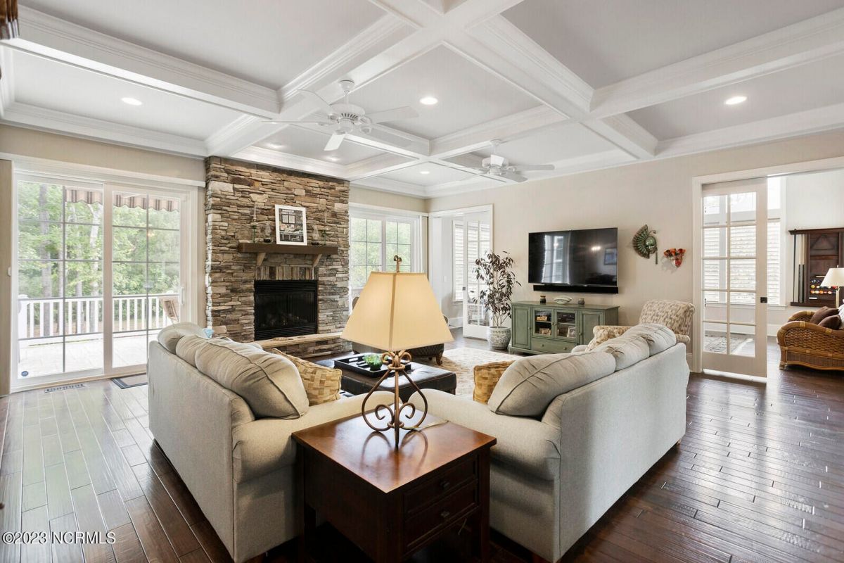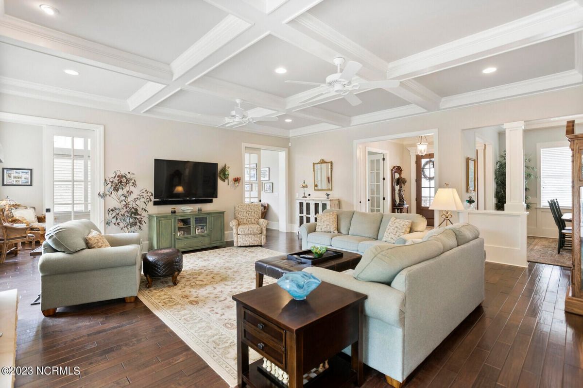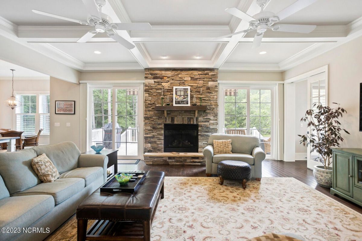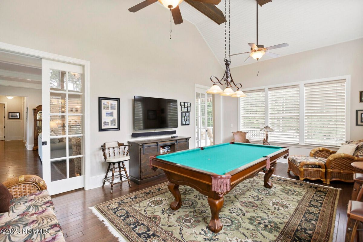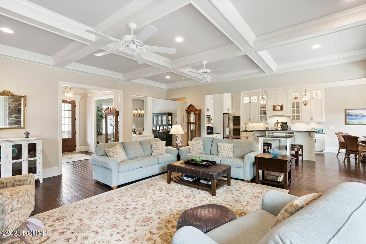 Welcome Home! This exquisite custom home offers all the features and upgrades you dreamed about. Situated on over 1/2 acre in a private cul-de-sac setting, you will quickly notice the detail and fine appointments. Walk onto the stamped concrete front porch and front entry, you know you are entering a warm, inviting home with the very popular open floor plan. The great room, kitchen & breakfast area is one expansive space providing an easy flow throughout the main living area, graced with beautiful hardwood floors. The great room features coffered ceilings, a stone fireplace, & 2 sets of sliding doors that lead to the rear porch. In the kitchen, there is lots of space for casual dining. The custom cabinetry is accented with granite counters & coordinating backsplash, with ample cooking space for the chef of the home. Additional features include a gas cooktop, a double oven, coffee station & walk-in pantry. A formal dining room, adjacent to the kitchen boasts coffered ceilings & wainscoting. From the great room, enter a very large recreation room, perfect for a pool table and/or game tables. The tongue and groove ceiling and wall to wall windows is very inviting for entertaining your family & friends. If working at home is an option, the large office will serve the purpose. The owner's suite features a tray ceiling with indirect lighting & his & her closets. The owner's bath offers double vanities, ceramic floors, makeup vanity & a large walk-in shower. The laundry is conveniently located near the owner's bathroom with lots of cabinetry, ceramic floors & a utility closet. The second floor features three guest bedrooms & 2 full baths. There are two large storage rooms, one is climate controlled. The garage is oversized, allowing extra space for workspace. Relax on the rear porch, featuring a retractable awning and enjoy the serenity that surrounds you. There is a view of the golf course. There are too many features to mention that it must be seen.