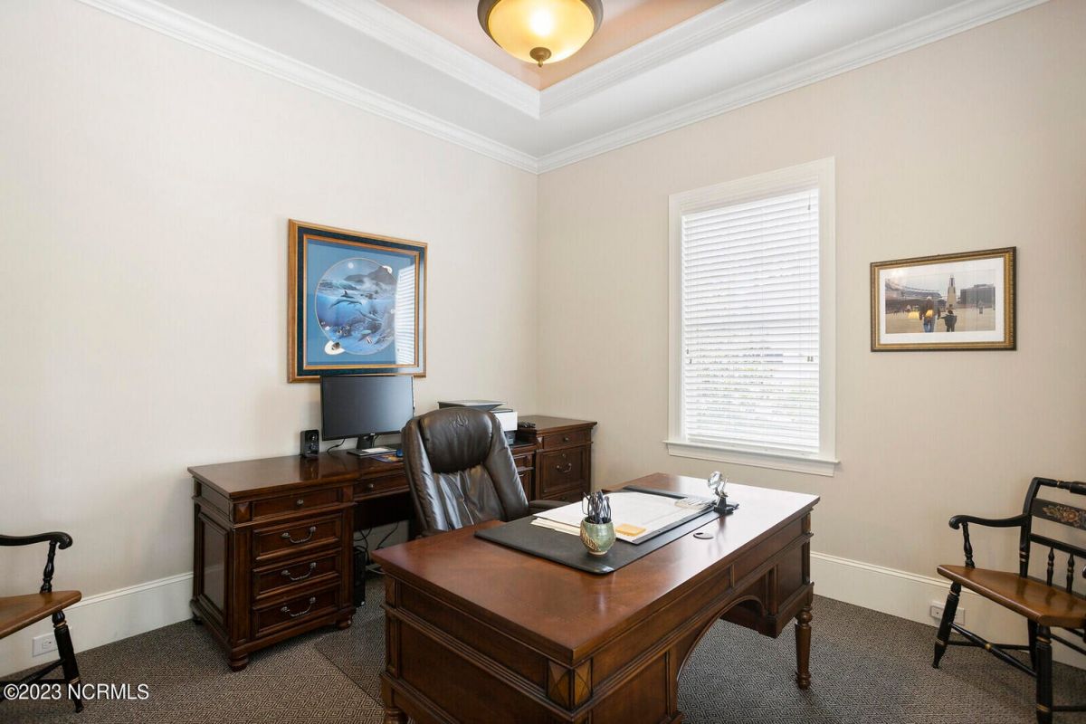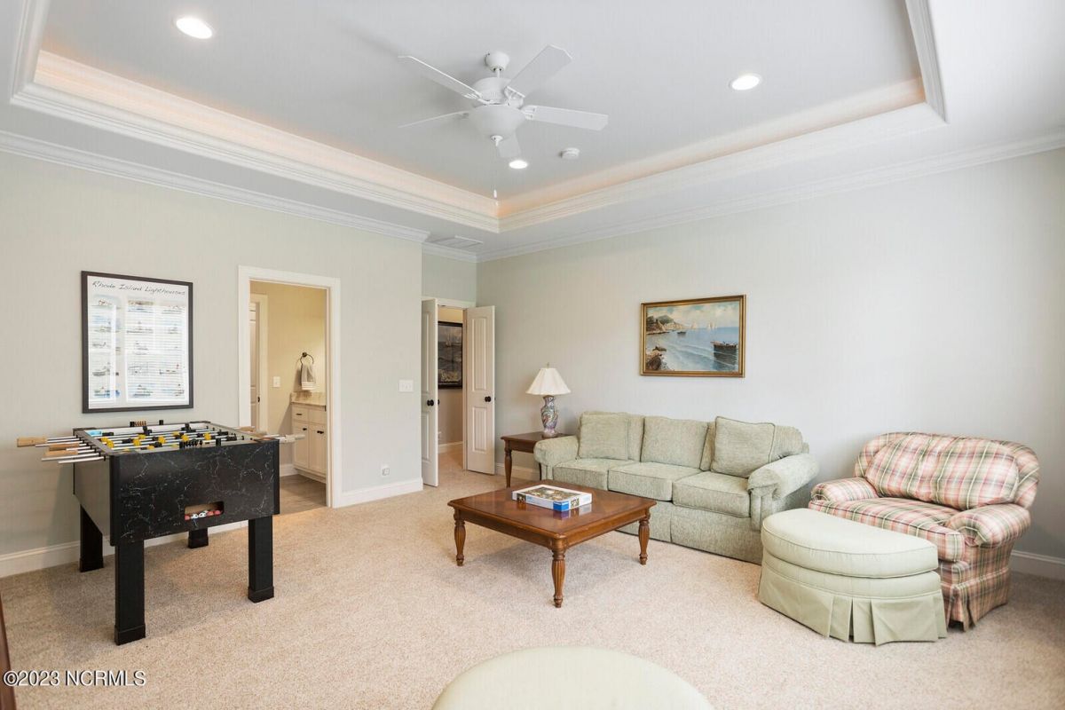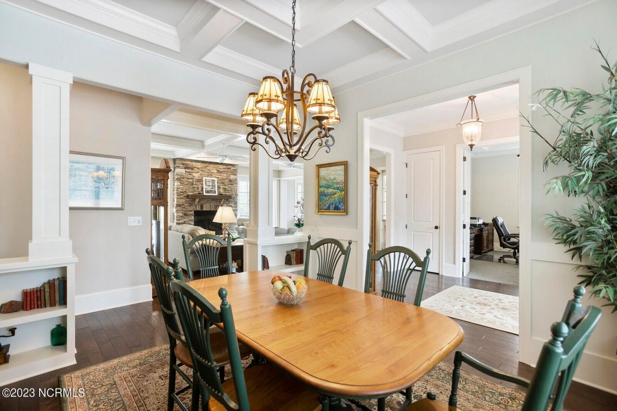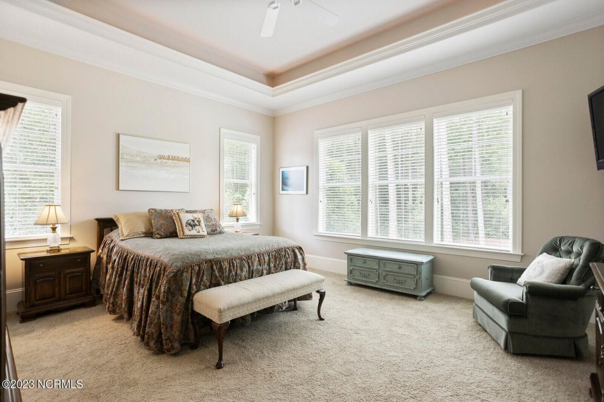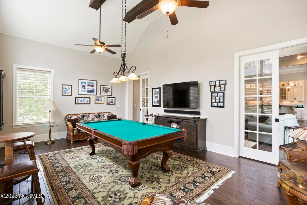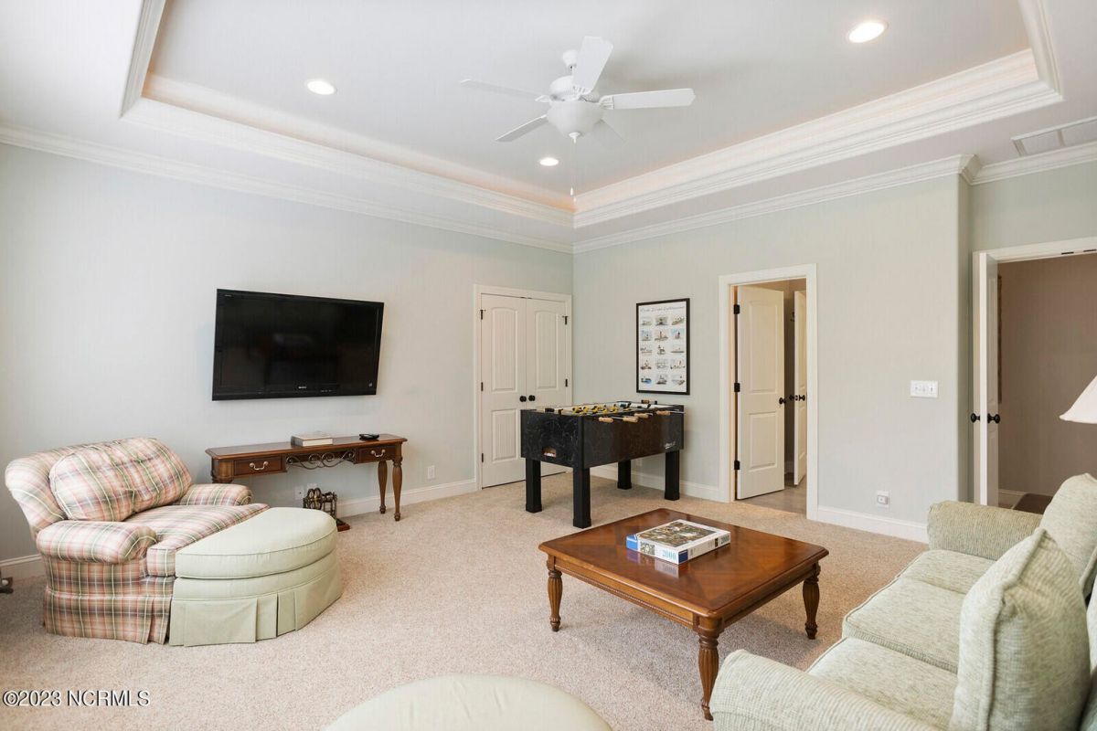 Welcome Home! This exquisite custom home offers all the features and upgrades you dreamed about. Situated on over 1/2 acre in a private cul-de-sac setting, you will quickly notice the detail and fine appointments. Walk onto the stamped concrete front porch and front entry, you know you are entering a warm, inviting home with the very popular open floor plan. The great room, kitchen & breakfast area is one expansive space providing an easy flow throughout the main living area, graced with beautiful hardwood floors. The great room features coffered ceilings, a stone fireplace, & 2 sets of sliding doors that lead to the rear porch. In the kitchen, there is lots of space for casual dining. The custom cabinetry is accented with granite counters & coordinating backsplash, with ample cooking space for the chef of the home. Additional features include a gas cooktop, a double oven, coffee station & walk-in pantry. A formal dining room, adjacent to the kitchen boasts coffered ceilings & wainscoting. From the great room, enter a very large recreation room, perfect for a pool table and/or game tables. The tongue and groove ceiling and wall to wall windows is very inviting for entertaining your family & friends. If working at home is an option, the large office will serve the purpose. The owner's suite features a tray ceiling with indirect lighting & his & her closets. The owner's bath offers double vanities, ceramic floors, makeup vanity & a large walk-in shower. The laundry is conveniently located near the owner's bathroom with lots of cabinetry, ceramic floors & a utility closet. The second floor features three guest bedrooms & 2 full baths. There are two large storage rooms, one is climate controlled. The garage is oversized, allowing extra space for workspace. Relax on the rear porch, featuring a retractable awning and enjoy the serenity that surrounds you. There is a view of the golf course. There are too many features to mention that it must be seen.