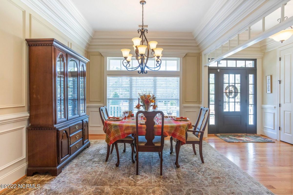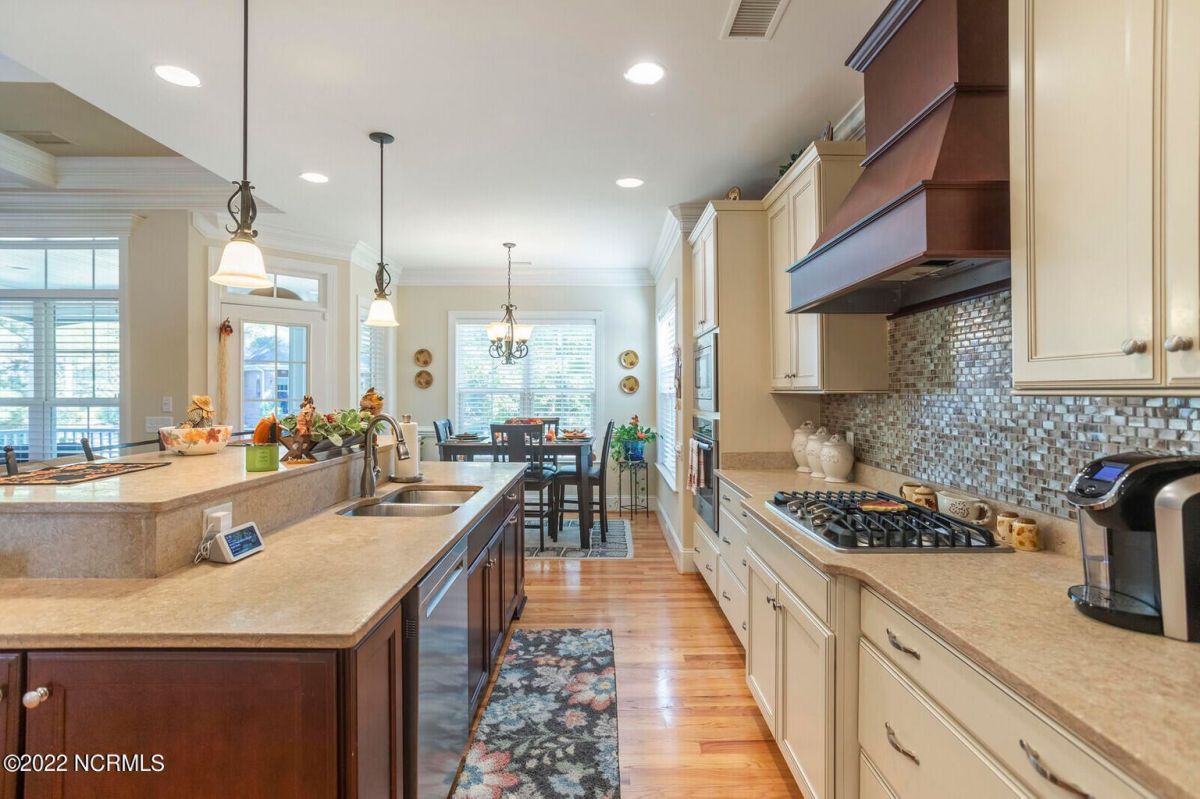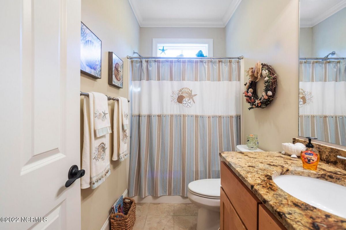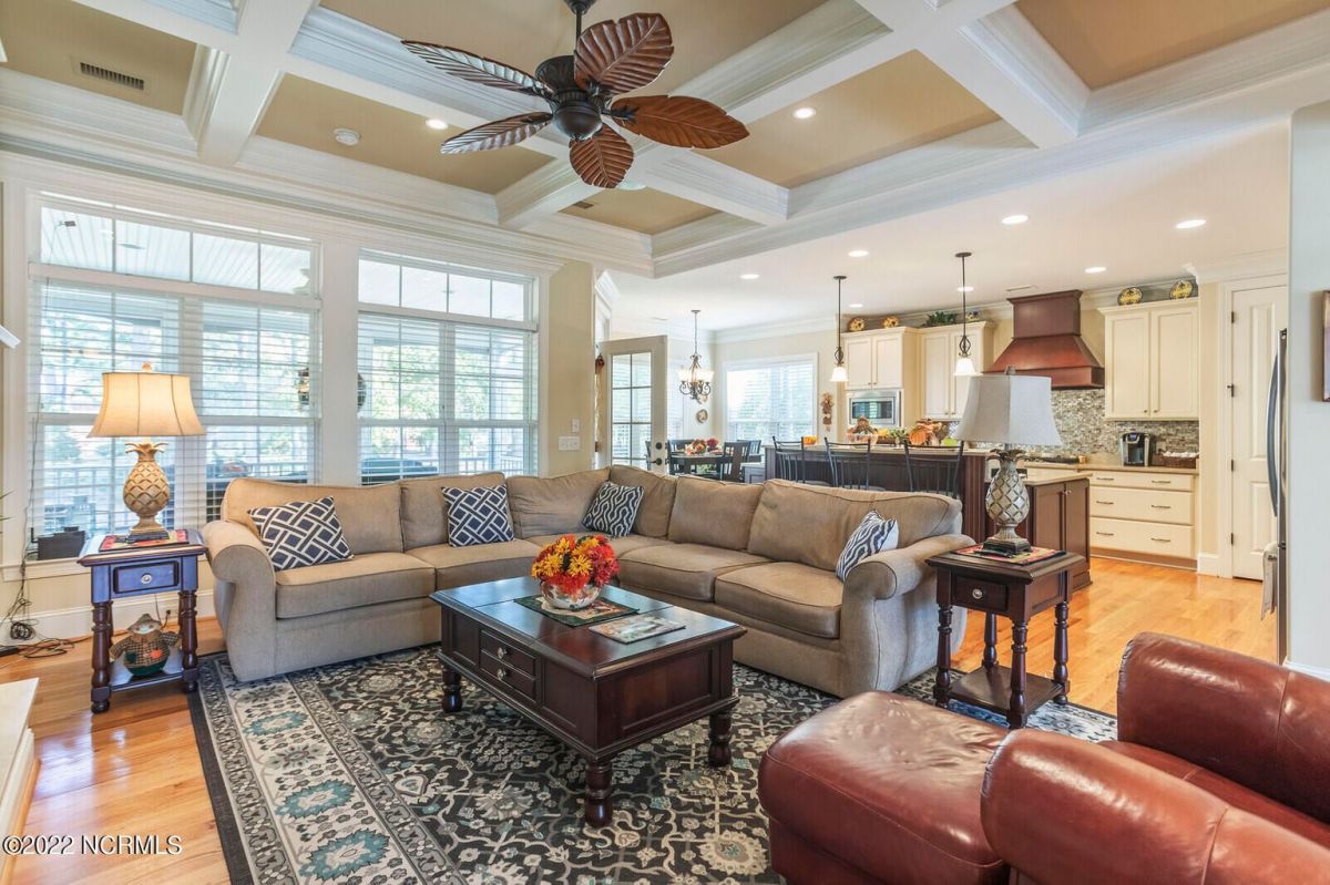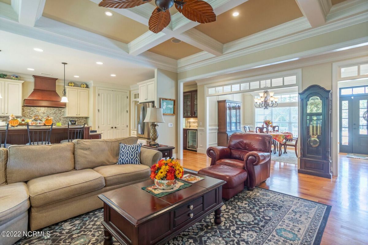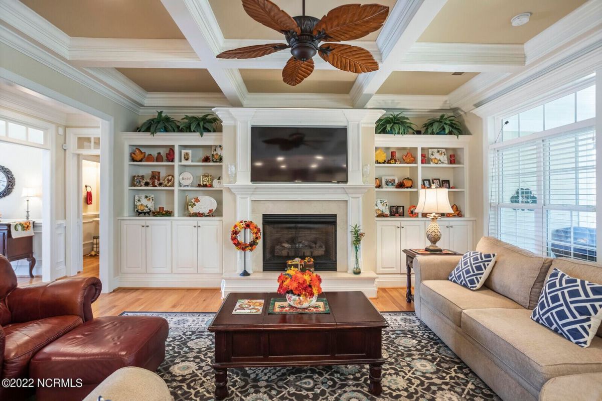 Offering southern living at its finest, this casually elegant residence sits on a tranquil lot nestled by tall shade trees and beautiful landscaping. The home greets you with a delightful overhead pineapple pendant light on the front porch and continues to enchant inside with hardwood flooring, double and triple crown molding, wainscoting and transom windows throughout. The gourmet kitchen showcases white-sand colored cabinets offset by oyster shell granite counters and glass tile backsplash along with a 5-burner gas stove, built-in microwave/convection oven and a huge pantry for easy storage. This kitchen allows plenty of room for everyday dining at the breakfast bar or kitchen table. A formal dining area accommodates large family gatherings. The living room features a coffered ceiling and gas log fireplace surrounded by built-in shelving and cabinets. Some quiet reflection time can be found on the large screened porch or the stamped concrete patio as you observe nature. There are three carpeted bedrooms on the first floor. Two bedrooms share a full bath. The impressive owner's suite sits under a trey ceiling and offers a spa-like experience with a soaking tub, ceramic tiled shower, double vanity and a walk-in closet large enough for an office area. A creative living space on the second floor is equipped with a full bathroom making it the perfect space for a 4th guest suite or family room. This meticulously maintained home offers so many extras including a wet bar with fridge, surround sound, large laundry room, walk-through attic, irrigation system and 2-car side entry garage. Ocean Ridge amenities including indoor & outdoor pools, four championship golf courses, fitness center, walking paths and a private oceanfront beach club at beautiful Sunset Beach. It's all right here – shouldn't you be?