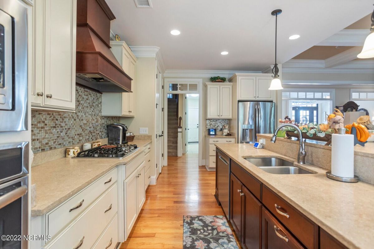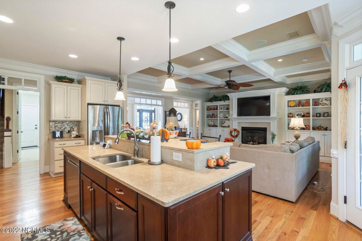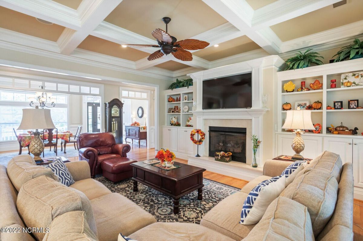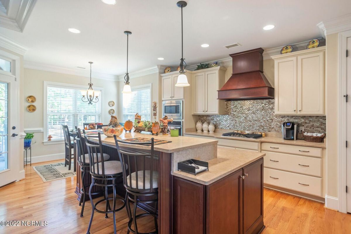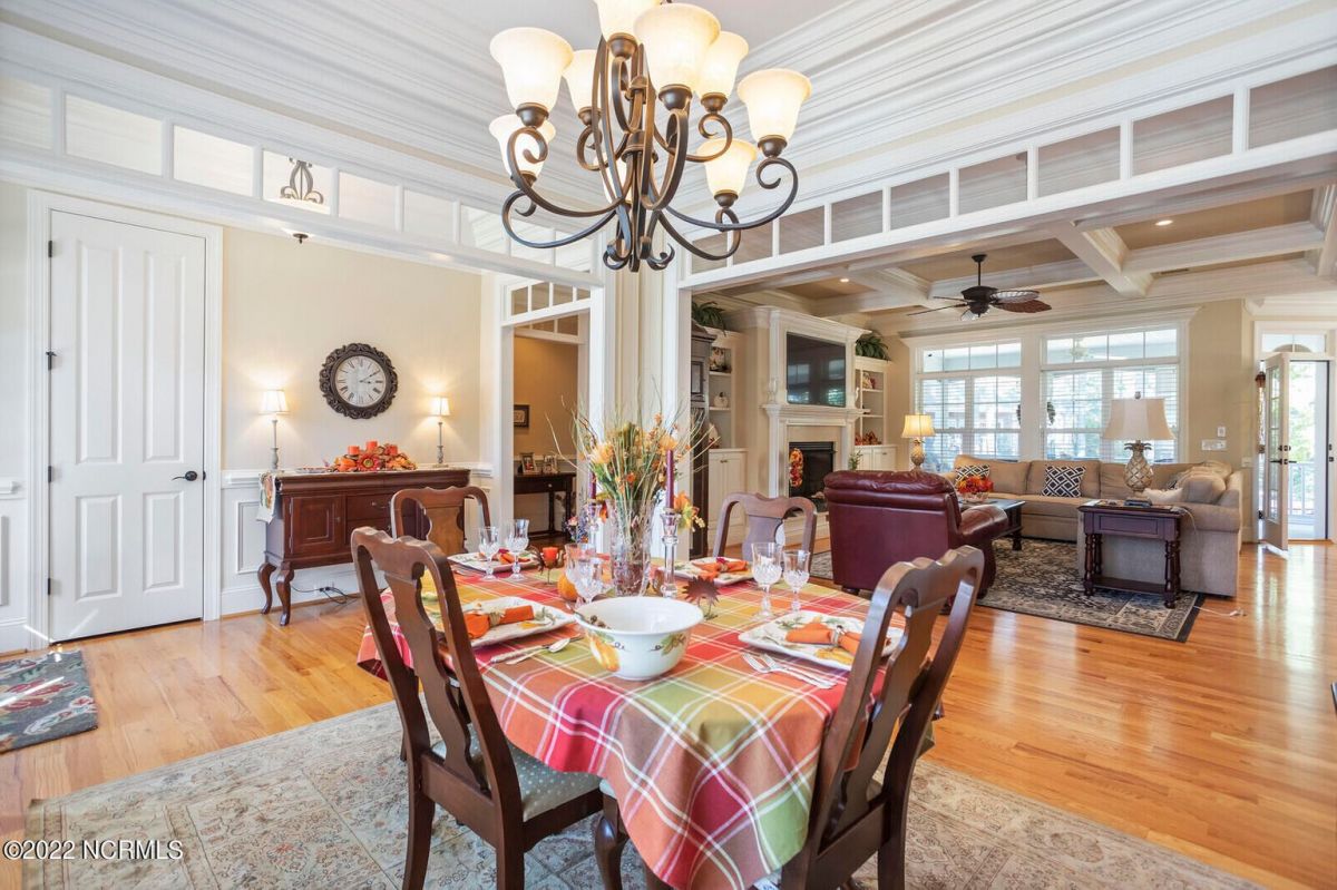 Offering southern living at its finest, this casually elegant residence sits on a tranquil lot nestled by tall shade trees and beautiful landscaping. The home greets you with a delightful overhead pineapple pendant light on the front porch and continues to enchant inside with hardwood flooring, double and triple crown molding, wainscoting and transom windows throughout. The gourmet kitchen showcases white-sand colored cabinets offset by oyster shell granite counters and glass tile backsplash along with a 5-burner gas stove, built-in microwave/convection oven and a huge pantry for easy storage. This kitchen allows plenty of room for everyday dining at the breakfast bar or kitchen table. A formal dining area accommodates large family gatherings. The living room features a coffered ceiling and gas log fireplace surrounded by built-in shelving and cabinets. Some quiet reflection time can be found on the large screened porch or the stamped concrete patio as you observe nature. There are three carpeted bedrooms on the first floor. Two bedrooms share a full bath. The impressive owner's suite sits under a trey ceiling and offers a spa-like experience with a soaking tub, ceramic tiled shower, double vanity and a walk-in closet large enough for an office area. A creative living space on the second floor is equipped with a full bathroom making it the perfect space for a 4th guest suite or family room. This meticulously maintained home offers so many extras including a wet bar with fridge, surround sound, large laundry room, walk-through attic, irrigation system and 2-car side entry garage. Ocean Ridge amenities including indoor & outdoor pools, four championship golf courses, fitness center, walking paths and a private oceanfront beach club at beautiful Sunset Beach. It's all right here – shouldn't you be?