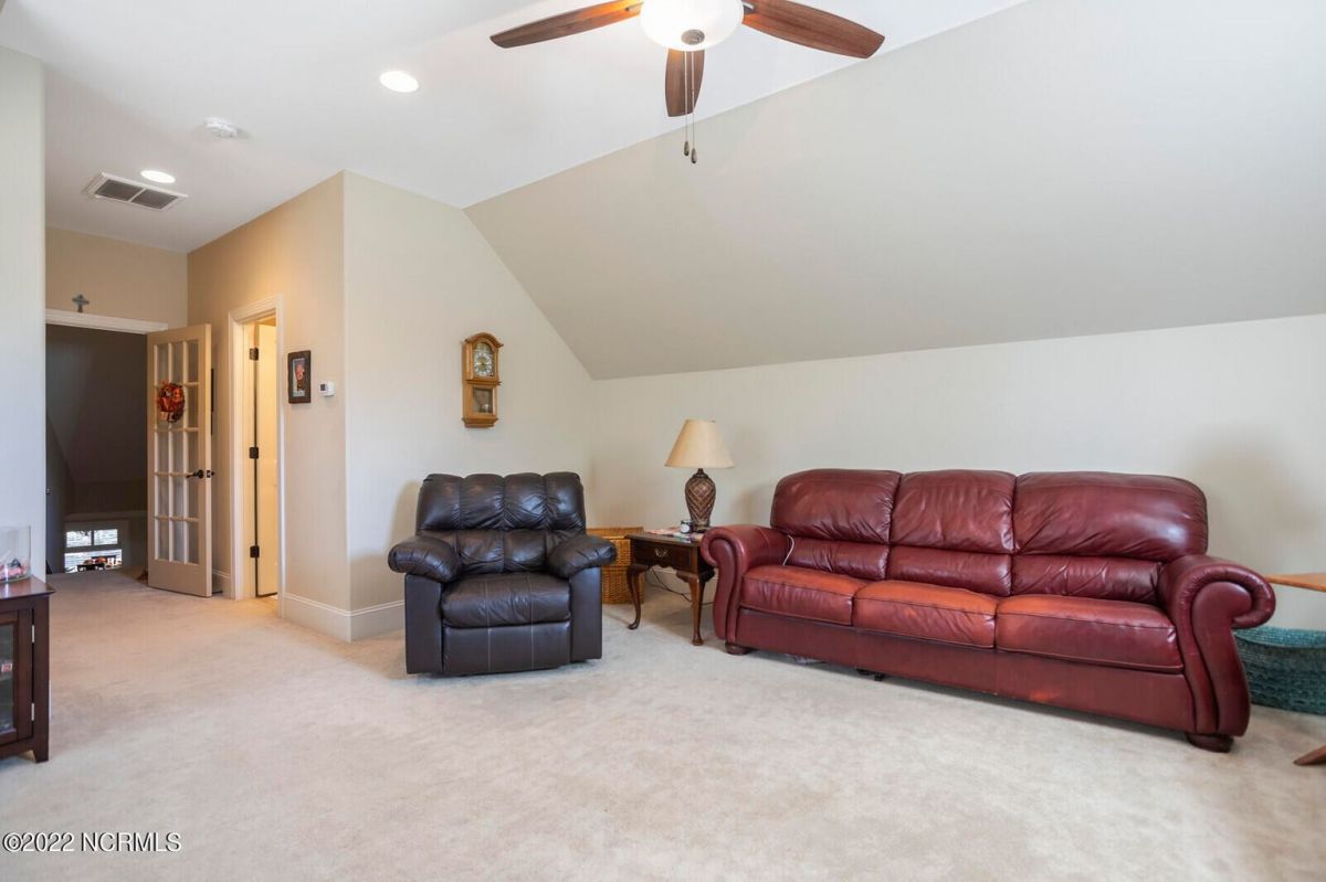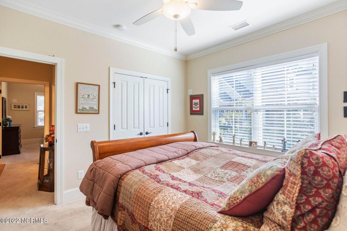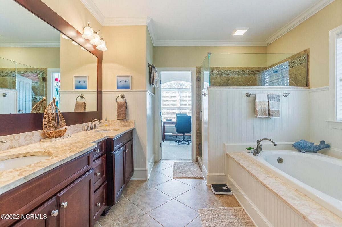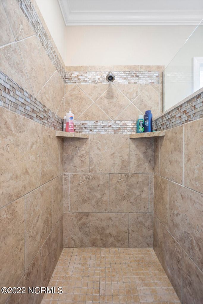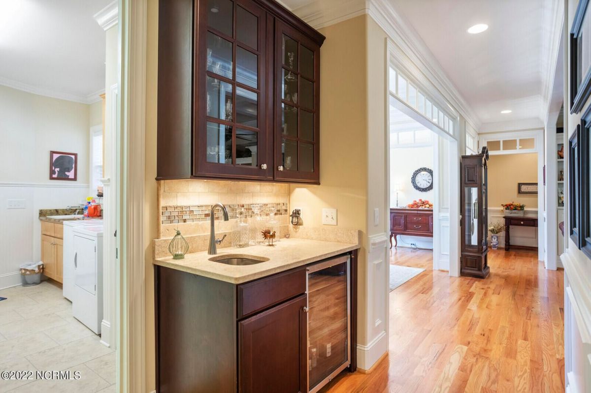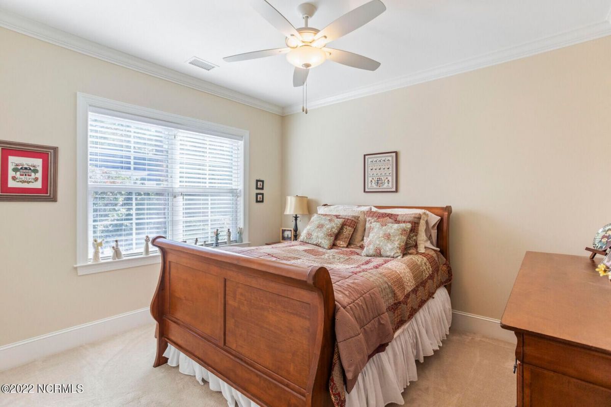 Offering southern living at its finest, this casually elegant residence sits on a tranquil lot nestled by tall shade trees and beautiful landscaping. The home greets you with a delightful overhead pineapple pendant light on the front porch and continues to enchant inside with hardwood flooring, double and triple crown molding, wainscoting and transom windows throughout. The gourmet kitchen showcases white-sand colored cabinets offset by oyster shell granite counters and glass tile backsplash along with a 5-burner gas stove, built-in microwave/convection oven and a huge pantry for easy storage. This kitchen allows plenty of room for everyday dining at the breakfast bar or kitchen table. A formal dining area accommodates large family gatherings. The living room features a coffered ceiling and gas log fireplace surrounded by built-in shelving and cabinets. Some quiet reflection time can be found on the large screened porch or the stamped concrete patio as you observe nature. There are three carpeted bedrooms on the first floor. Two bedrooms share a full bath. The impressive owner's suite sits under a trey ceiling and offers a spa-like experience with a soaking tub, ceramic tiled shower, double vanity and a walk-in closet large enough for an office area. A creative living space on the second floor is equipped with a full bathroom making it the perfect space for a 4th guest suite or family room. This meticulously maintained home offers so many extras including a wet bar with fridge, surround sound, large laundry room, walk-through attic, irrigation system and 2-car side entry garage. Ocean Ridge amenities including indoor & outdoor pools, four championship golf courses, fitness center, walking paths and a private oceanfront beach club at beautiful Sunset Beach. It's all right here – shouldn't you be?
