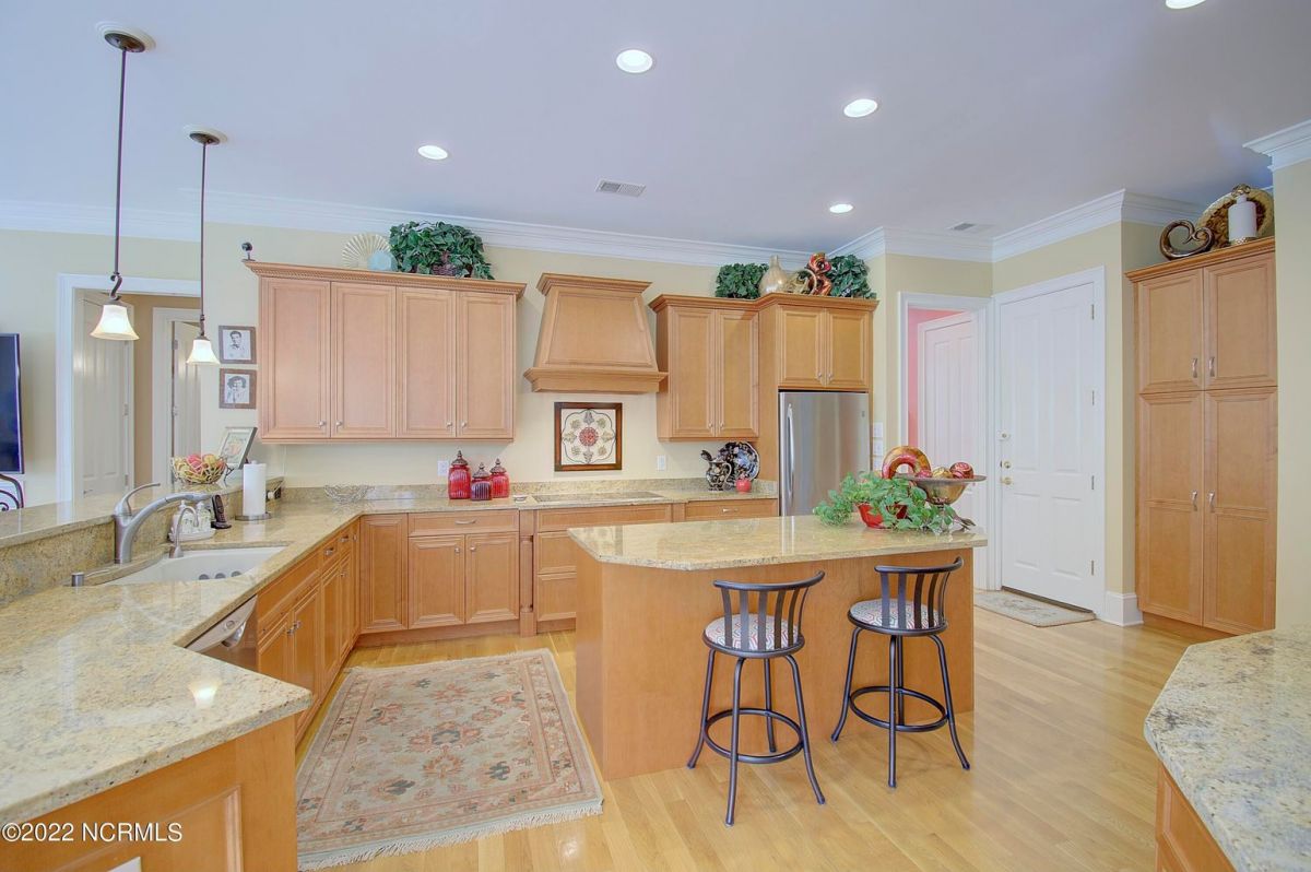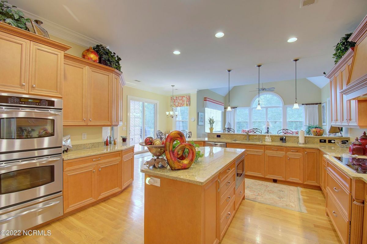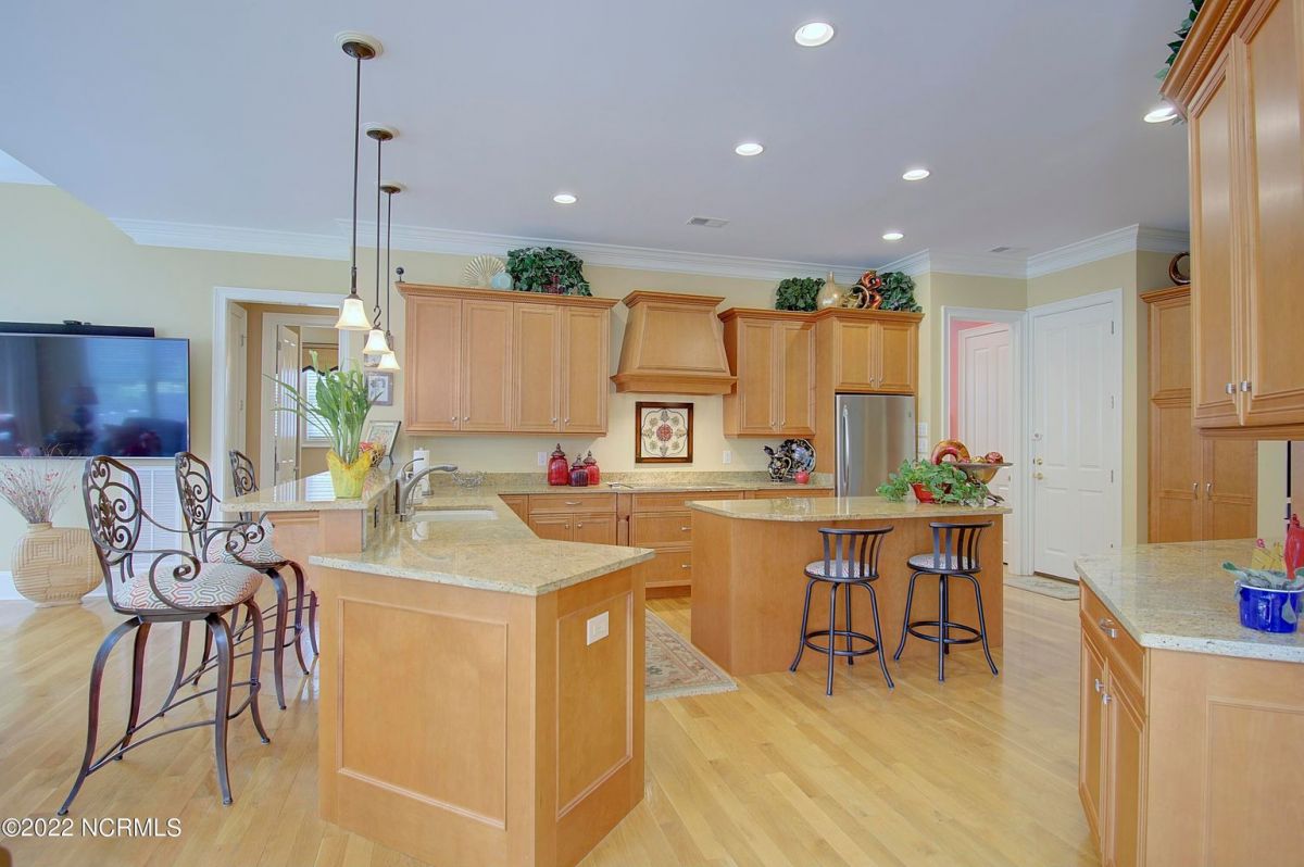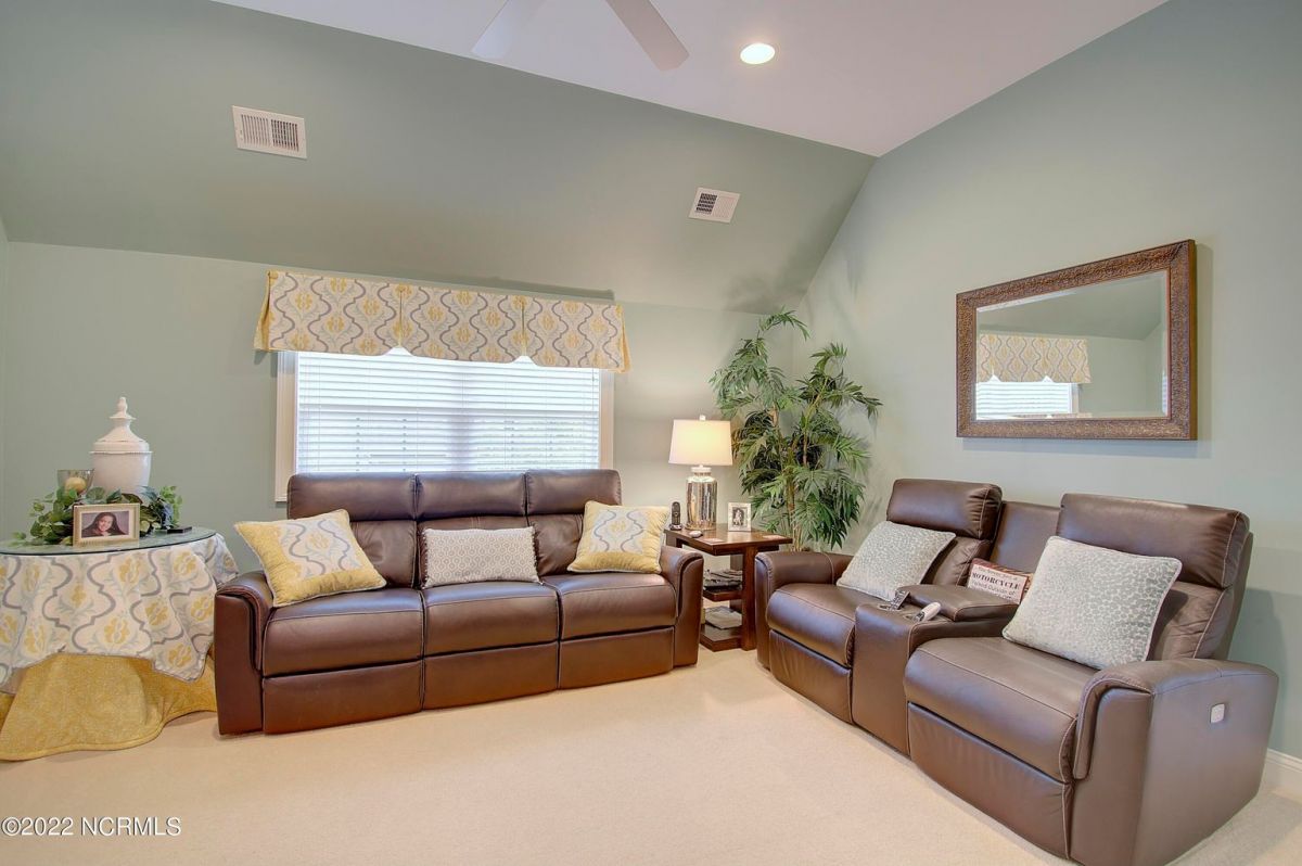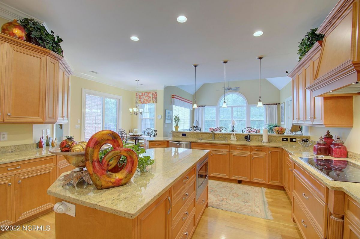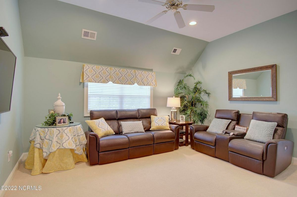 Must-see Ocean Ridge custom home built with attention to detail in mind and a rare 3-car garage! The open floor plan highlights the entertainment options as you move from the formal living room, the formal dining room to the open kitchen. Vaulted and trey ceilings with arched windows throughout. The huge kitchen features gleaming custom cabinets, an island, granite countertops, stainless steel appliances, a double oven, and a warming drawer. Breakfast nook and large family room are directly off of the kitchen. The Primary Suite offers a large bedroom with a trey ceiling and sitting area, the dressing closet with built-ins for everything, and a large bathroom with a soaker tub, a walk-in tiled shower, and twin vanities. 2nd guest bedroom downstairs with a full bathroom for your guests. Large laundry area has a built-in desk, room for a spare fridge, and lots of cabinetry storage. Head upstairs to find a 3rd living area/tv room and a 3rd bedroom with a full bath. The attic has a huge storage area with great shelving and flooring for all of your extras. 3 car oversized garage. Beautiful low maintenance brick exterior, composite decking, and extensive landscaping with curbed bedding in front and an irrigation system. Beautiful setting out back to enjoy a morning coffee or an afternoon beverage or three as you get a sneak peak of the hackers at a par 3 on Leopard's Chase Golf Course from afar. Ocean Ridge has it all with its 4 golf courses, 2 golf clubhouses, a beach clubhouse on Sunset Beach, a heated indoor pool, sauna, steam room, a jacuzzi, a banquet room, an outdoor pool, pickle ball courts, a well-equipped fitness center, walking trails, a pavilion area, a community garden, and over 50 social groups available to join. There's literally something for everyone in Ocean Ridge!