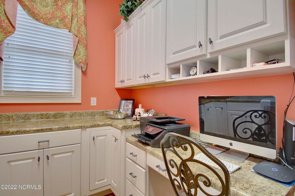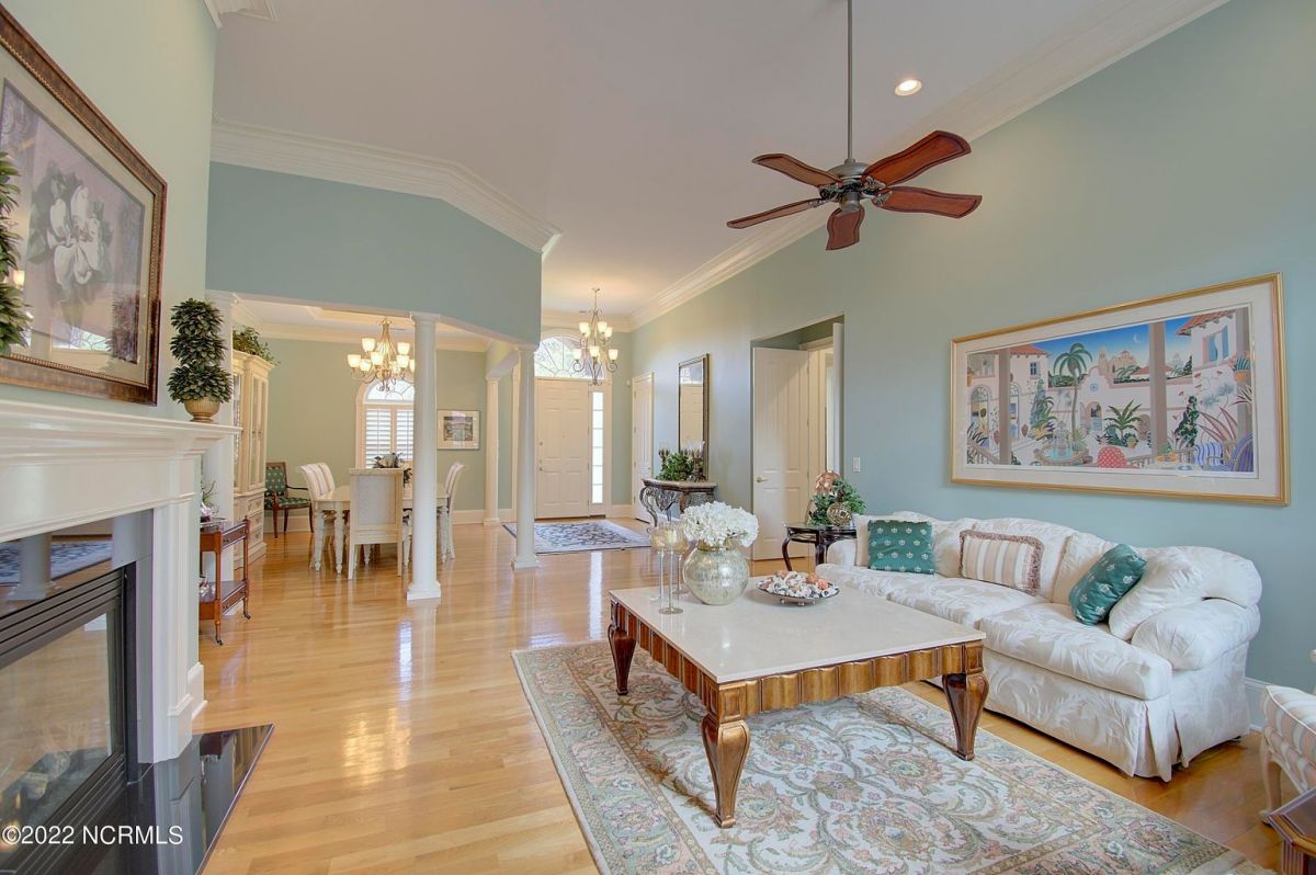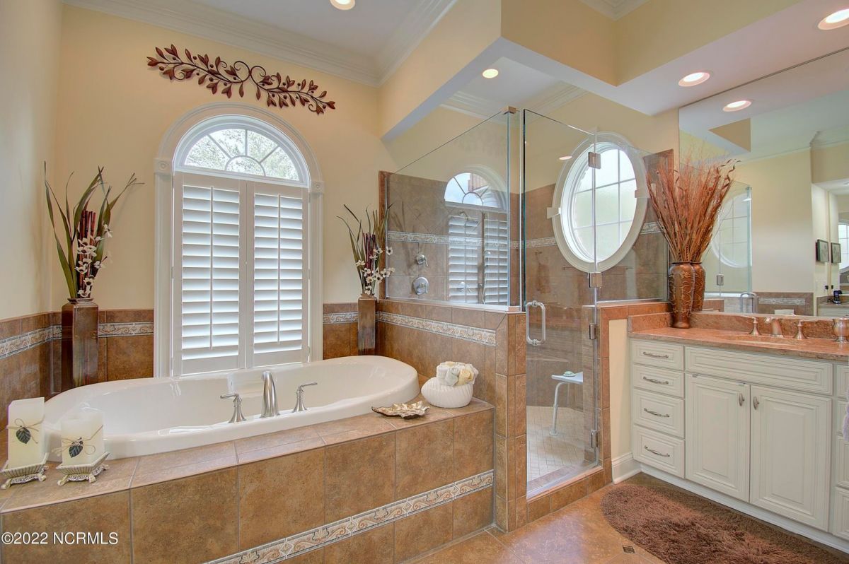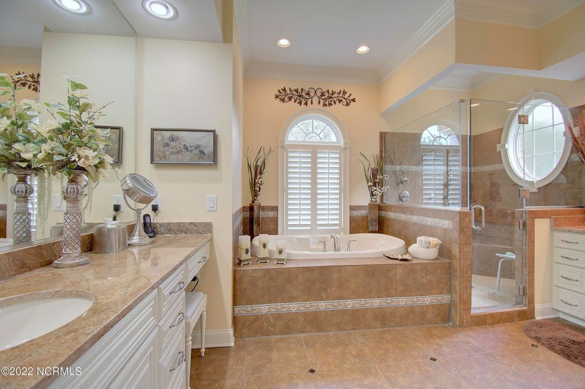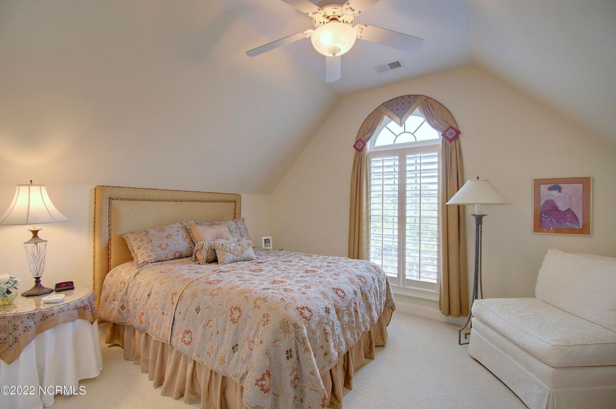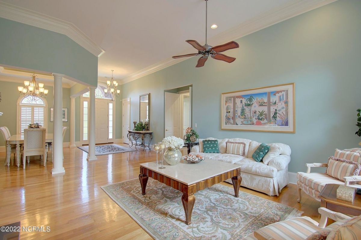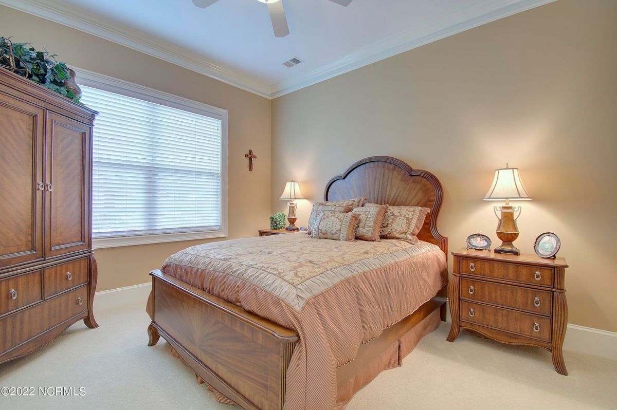 Must-see Ocean Ridge custom home built with attention to detail in mind and a rare 3-car garage! The open floor plan highlights the entertainment options as you move from the formal living room, the formal dining room to the open kitchen. Vaulted and trey ceilings with arched windows throughout. The huge kitchen features gleaming custom cabinets, an island, granite countertops, stainless steel appliances, a double oven, and a warming drawer. Breakfast nook and large family room are directly off of the kitchen. The Primary Suite offers a large bedroom with a trey ceiling and sitting area, the dressing closet with built-ins for everything, and a large bathroom with a soaker tub, a walk-in tiled shower, and twin vanities. 2nd guest bedroom downstairs with a full bathroom for your guests. Large laundry area has a built-in desk, room for a spare fridge, and lots of cabinetry storage. Head upstairs to find a 3rd living area/tv room and a 3rd bedroom with a full bath. The attic has a huge storage area with great shelving and flooring for all of your extras. 3 car oversized garage. Beautiful low maintenance brick exterior, composite decking, and extensive landscaping with curbed bedding in front and an irrigation system. Beautiful setting out back to enjoy a morning coffee or an afternoon beverage or three as you get a sneak peak of the hackers at a par 3 on Leopard's Chase Golf Course from afar. Ocean Ridge has it all with its 4 golf courses, 2 golf clubhouses, a beach clubhouse on Sunset Beach, a heated indoor pool, sauna, steam room, a jacuzzi, a banquet room, an outdoor pool, pickle ball courts, a well-equipped fitness center, walking trails, a pavilion area, a community garden, and over 50 social groups available to join. There's literally something for everyone in Ocean Ridge!