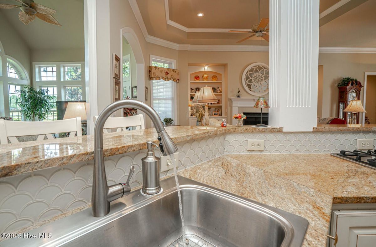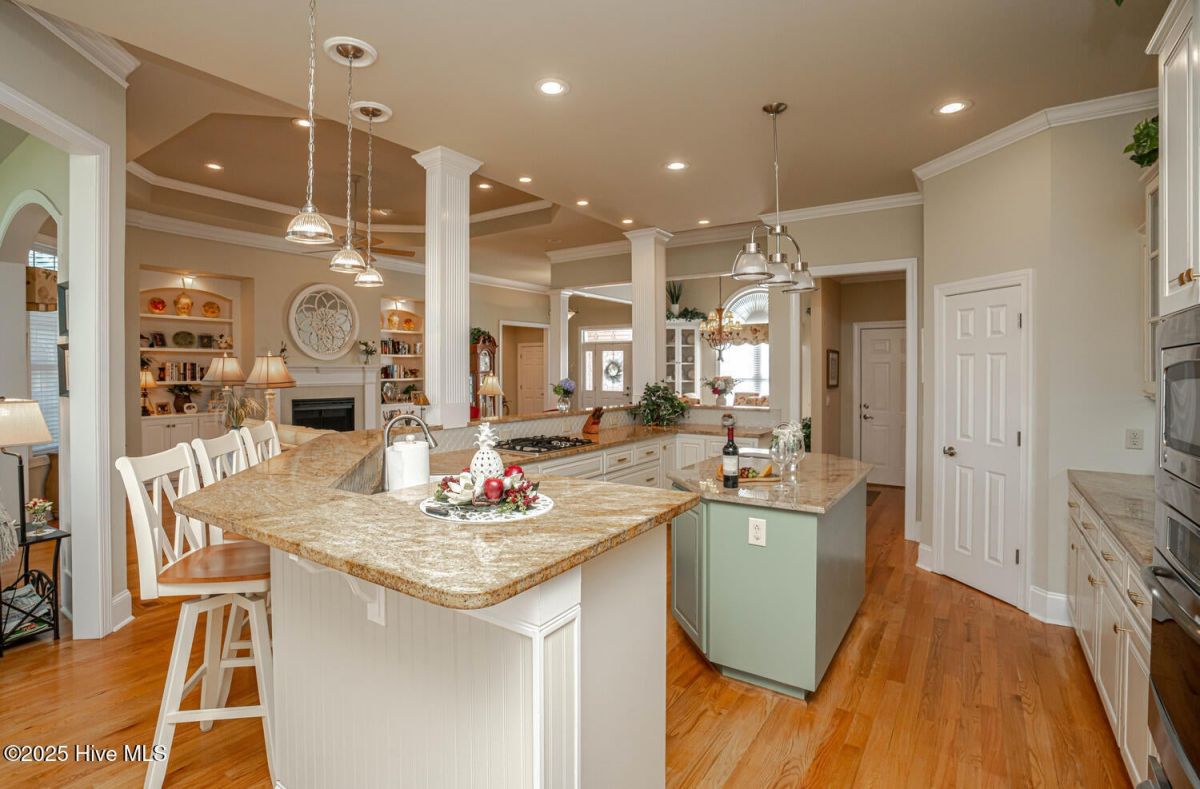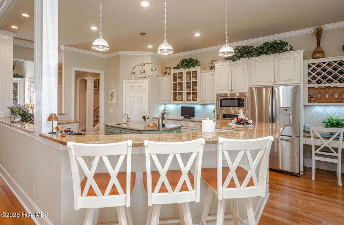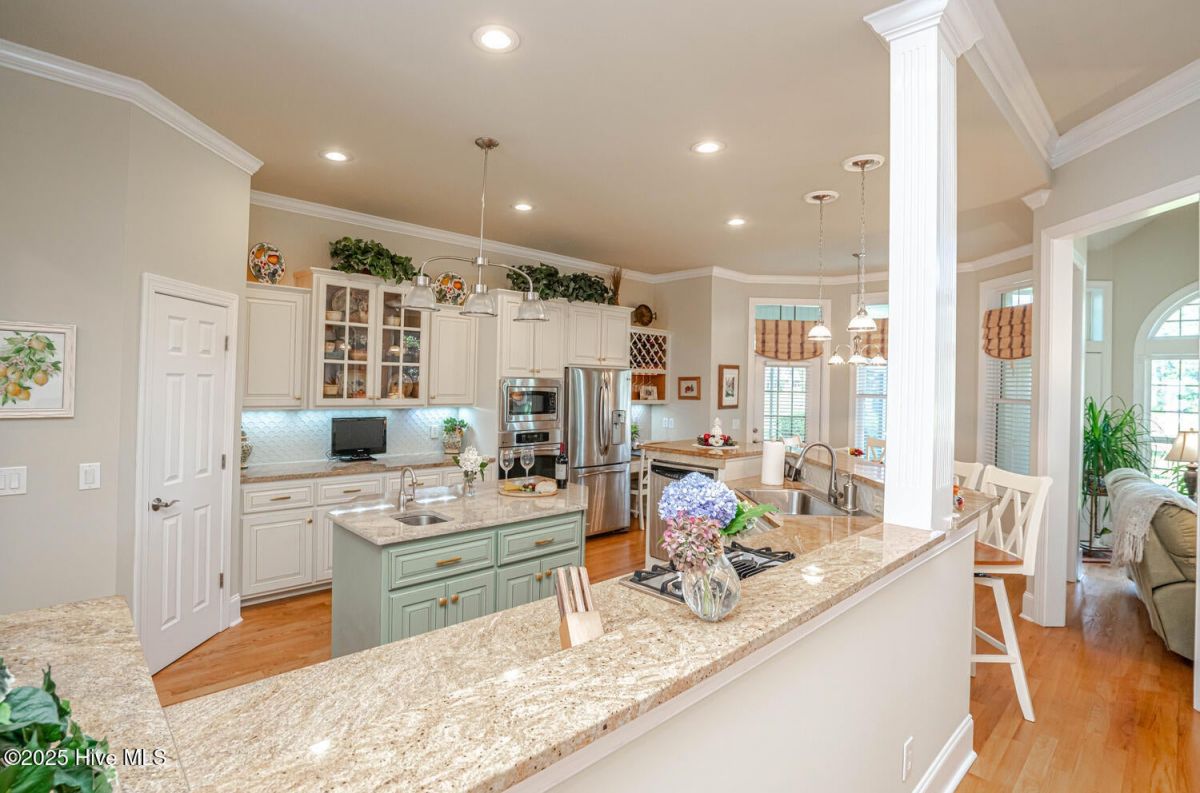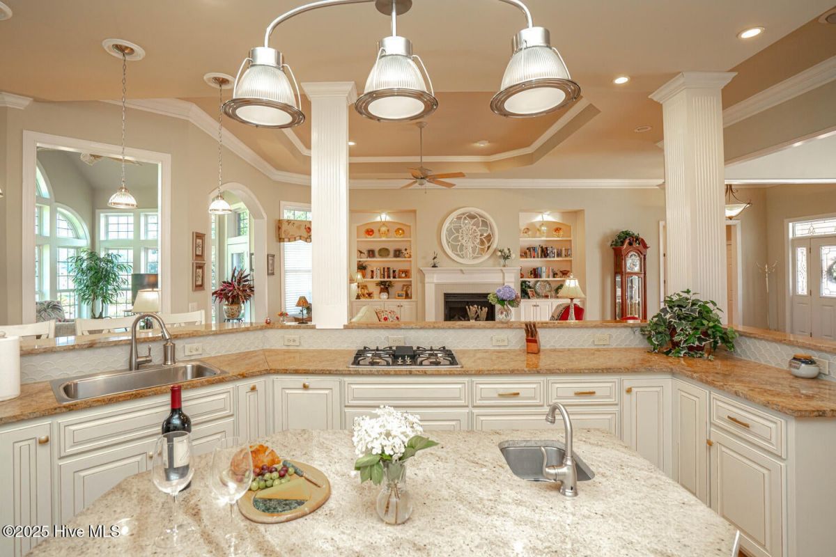 Have a look at this impeccably maintained brick beauty! Gorgeous & mature landscaping outside on .49/acre with so many updates inside! Green-to-tee golf course & pond views of the 15th hole of Panther's Run Golf Course. This home was built w/ entertaining in mind. The kitchen was tastefully redesigned to open up to the living room. Plenty of room to gather around the sprawling granite counters w/ 3 bar stools, refinished custom cabinetry w/ custom pull-outs, elegant backsplash, & a huge granite work island. Stainless Steel GE Profile appliances w/ a counter depth fridge, a gas cooktop, built-in microwave, & a warming drawer below the oven. A deep pantry & an office area complete the kitchen. Formal dining room for those special occasions & a breakfast nook for day-to-day use. The sun room's arched windows allow for natural light to pour in w/ the desirable eastern exposure offering morning sun & afternoon shade. Soak in the views of the golf course, pond, & the assortment of birds that frequent the back yard. The expansive primary bedroom has it's own cozy fireplace, 2 huge walk-in custom closets, dual sinks w/ granite counters, & a massive tiled shower w/ a heater above it. Your company will be staying in style as they take in the golf/pond views & their own full bathroom which was renovated w/ tiled flooring, shower, & granite counters. The laundry room with ample cabinets, a spare fridge, & a work sink completes the first floor. The sleek & modern staircase to the 2nd floor leads to the 3rd BR which also has a full BA. Walk-up floored attic & 2 additional storage areas for all of your extras. Gas Pack for improved heat efficiency in the few cooler months, a generator hook-up, 2 fireplaces, & an encapsulated crawl space w/ a dehumidifer. The screened-in porch w/ stamped concrete is the perfect spot for your morning coffee or an afternoon adult beverage while taking in the amazing views. Upgraded trex deck for lounging and grilling. This home is truly special! Ocean Ridge is widely regarded as the premier community in Coastal NC with its beautiful custom homes, gorgeous landscaping, 4 golf courses, 2 clubhouses with outdoor pools, a heated indoor pool, sauna, steam room, jacuzzi, a fitness center under renovation currently, pickleball courts, meeting/party rooms, a nature pavilion, walking trails, a community garden, and last but not least, a beach clubhouse on the locals' favorite, Sunset Beach. Ocean Ridge has something for everyone socially with over 75 social groups/activities to offer!