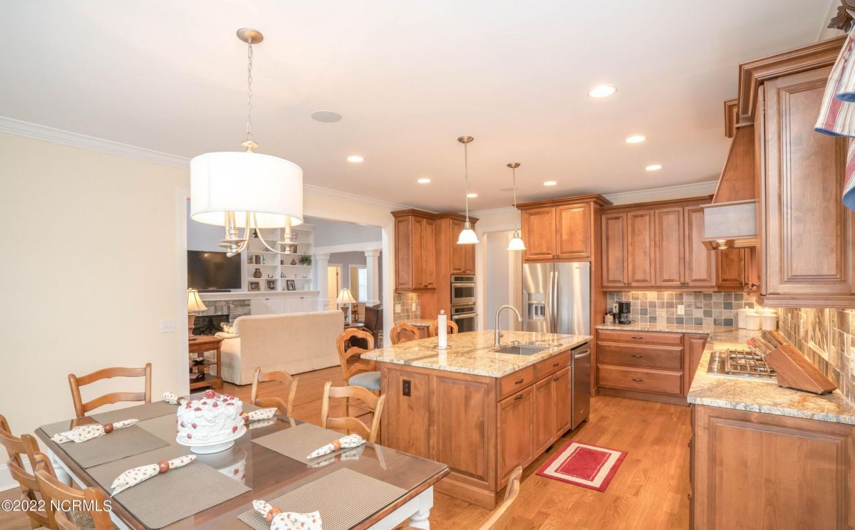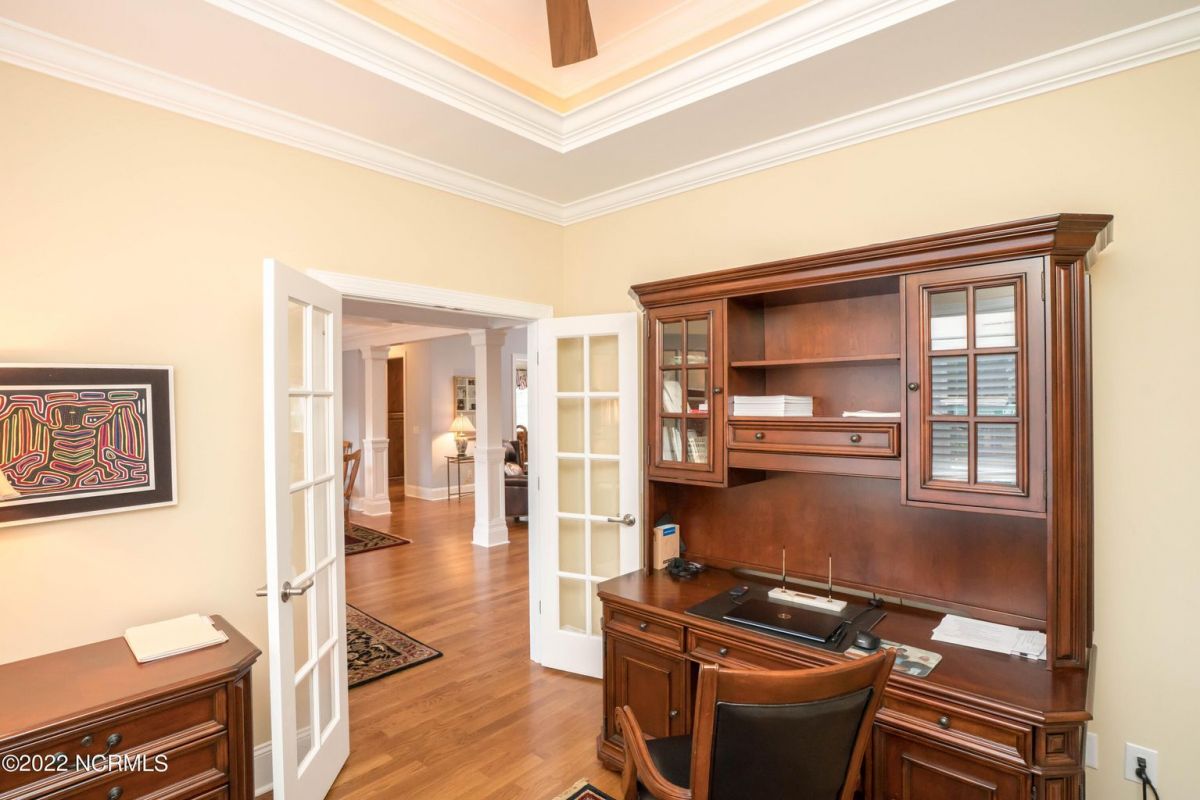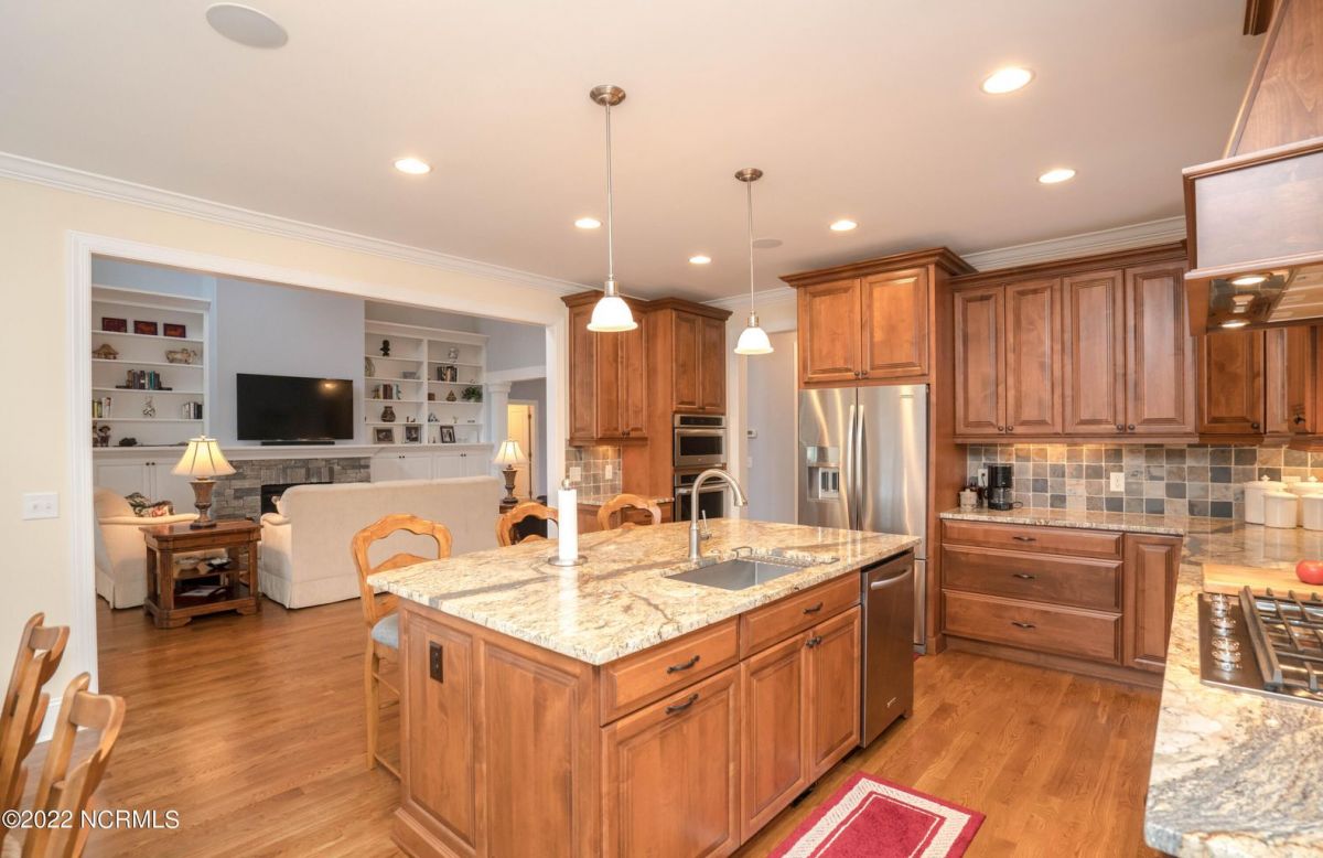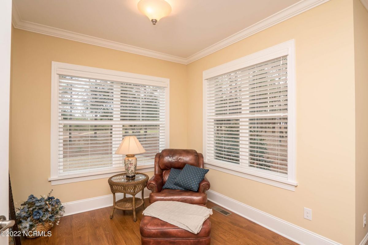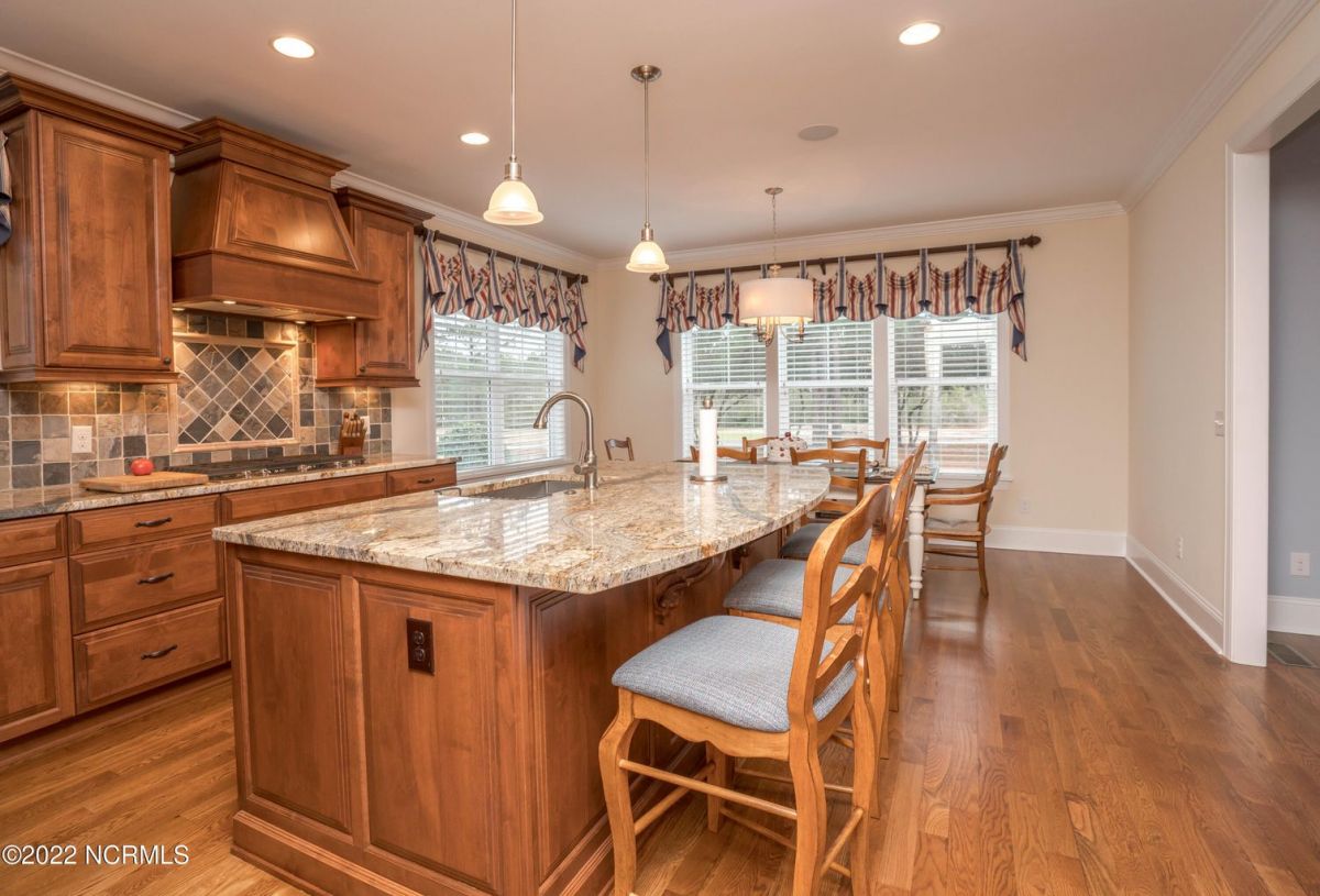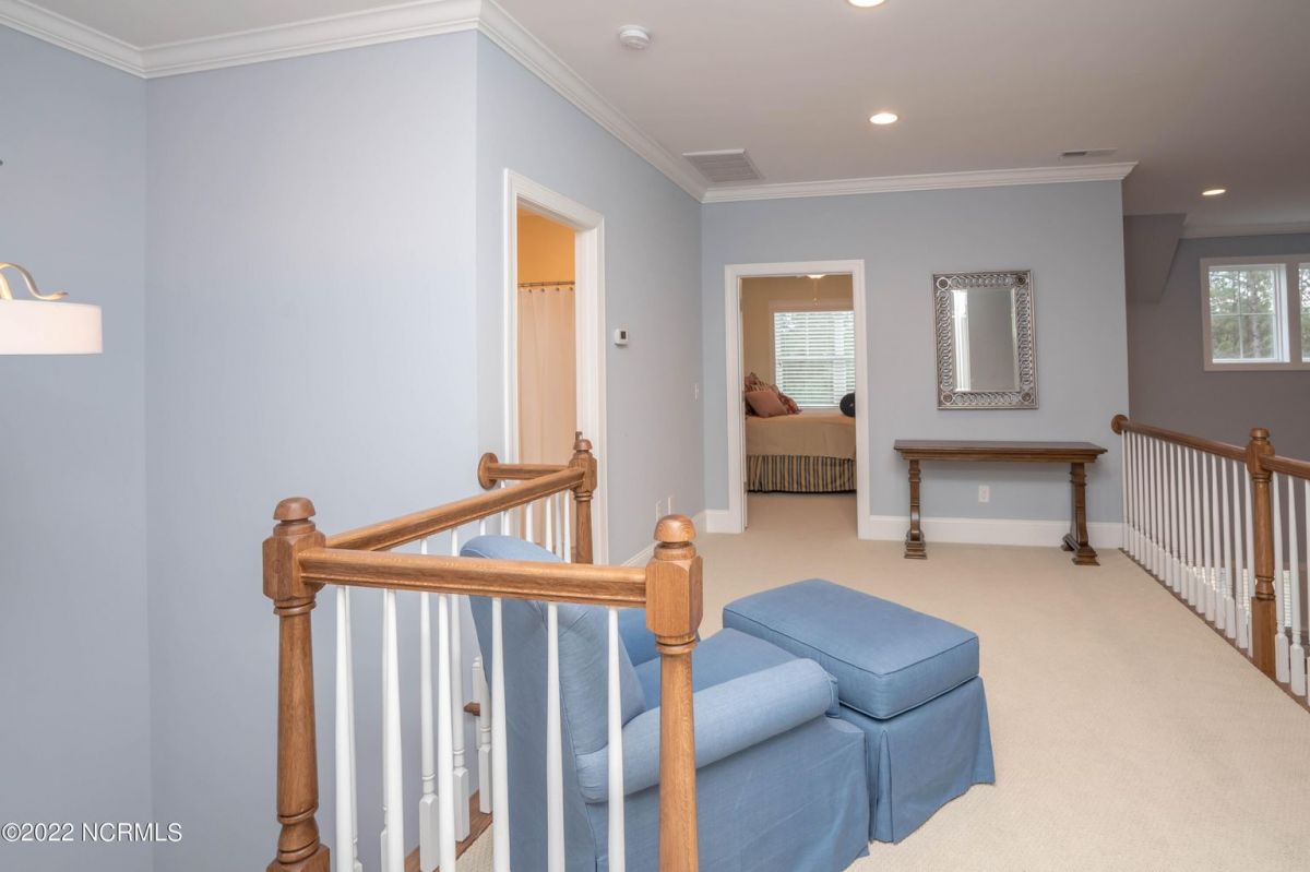 This is the house you have been looking for! This like new home combines quality, space, golf views & privacy into one. As soon as you enter through the front door, you will instantly appreciate how well this home has been maintained by the original owners. There is an office and half bath on the right when you enter. On the opposite side of the entry way you will find a spacious dining room with coffered ceilings. This dining area opens to a huge living room that features built in bookcases/cabinets along with a gas fireplace. Off of the living room there is a sunroom that is filled with natural light overlooking the golf course, a small pond and Nature. This sunroom is complete with a built in bar and provides access to the oversized stamped concrete patio. The kitchen is a chef's dream with stunning granite counter tops, tile backsplash, a gas range with hood, built in wall oven, convection oven, a huge walk in pantry and very high end cabinets. There is bar top seating at the kitchen island along with room for an eat in kitchen table. The master suite completes the first floor, as you enter the master suite through double doors, you will find a sitting area and lots of details that you expect to find in a home of this quality. The tray ceiling has rope lighting, there are two walk in closets and a stunning master bath with two vanities and a beautiful walk in shower. Upstairs there are two more guest bedrooms and a massive bonus room. Each bedroom has nice sized closets and if you need storage, make sure you check out the attic space. There is a full bathroom upstairs and a loft overlooking the living room. The garage is finished and offers additional storage or room for a work bench as well as a sink. This home is located on a quiet cul-de-sac street and overlooks the #11 hole of Leopard's Chase course. Ocean Ridge continues to be one of the most popular communities in coastal NC. Come explore this opportunity for yourself before it's too late.