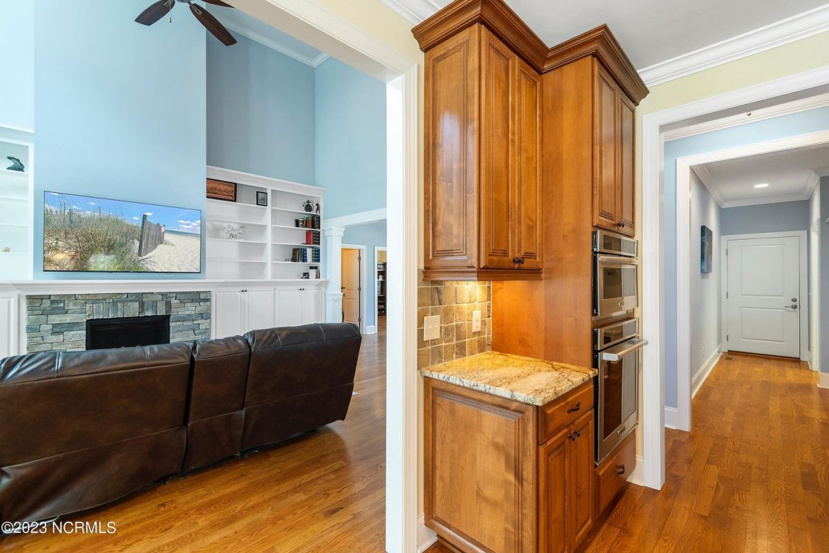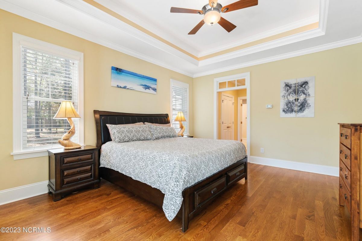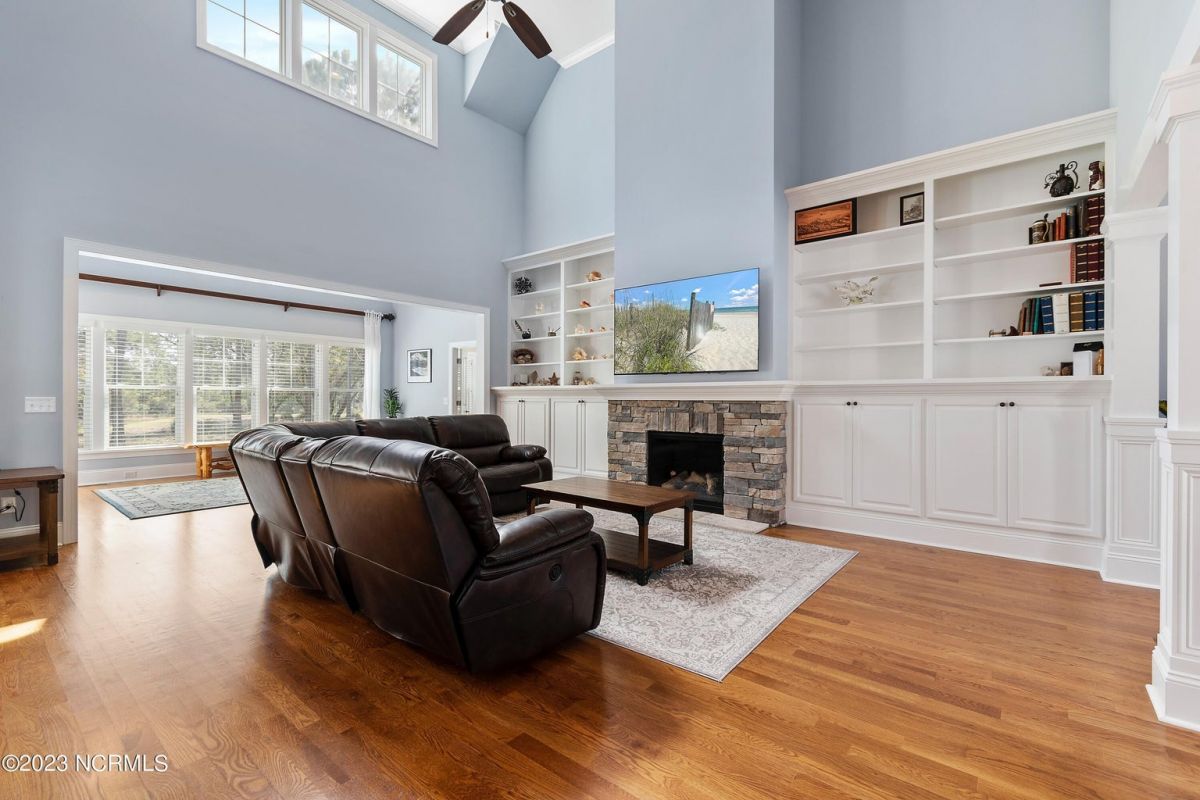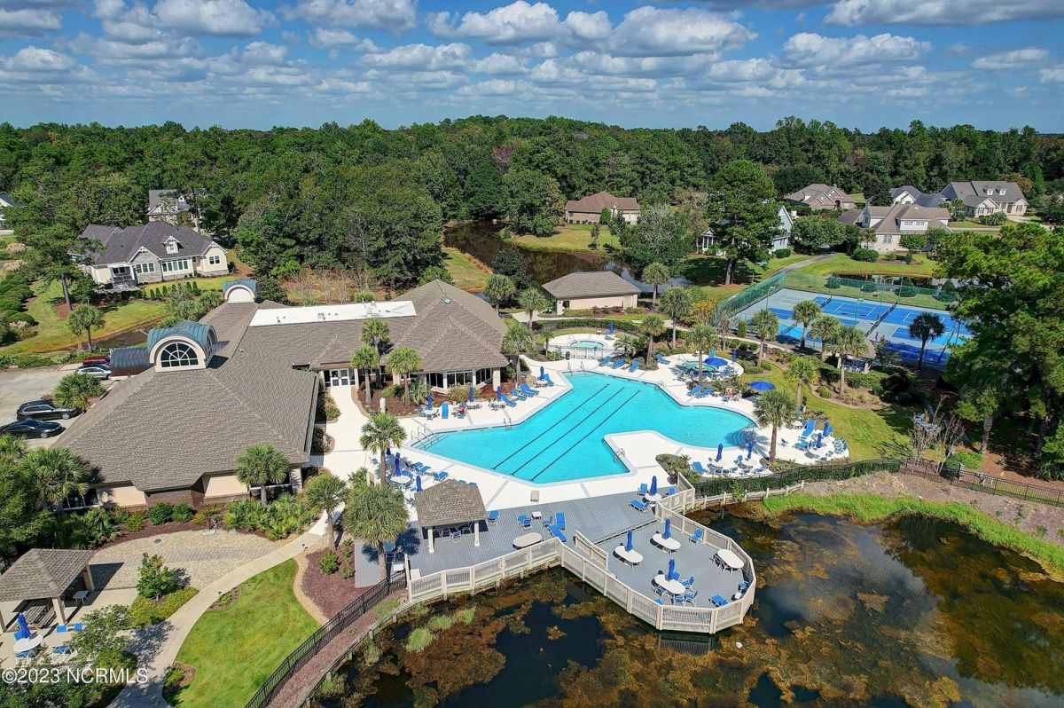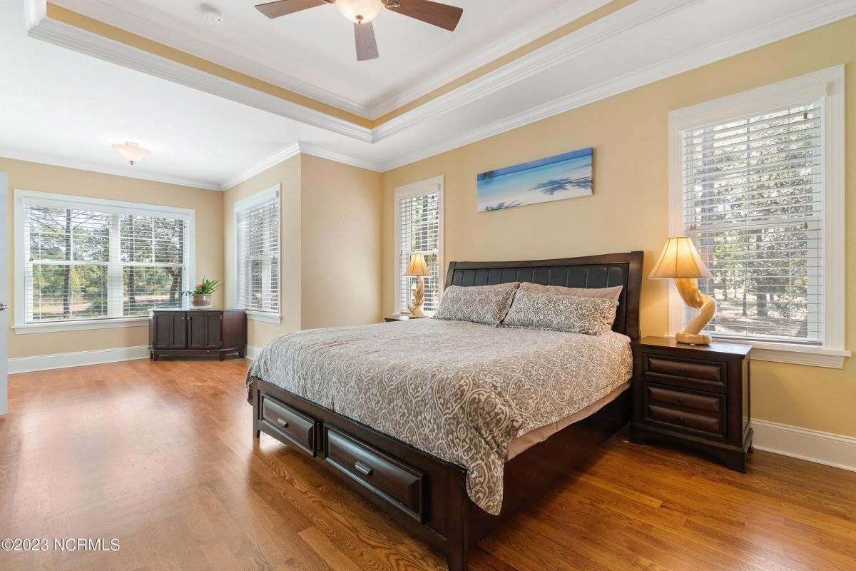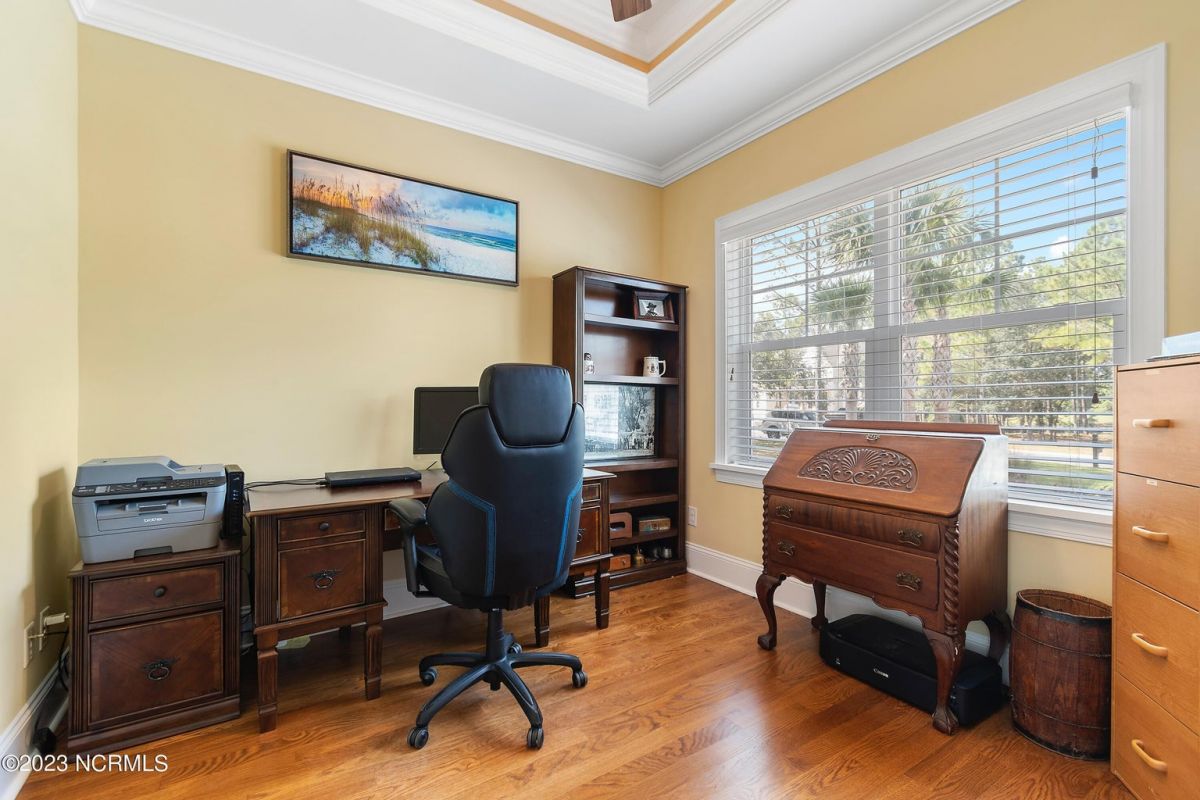 Welcome to your stunning golf course view home with modern luxury. Nestled right on the picturesque Leopard's Chase Golf Course's 11th hole in the highly desirable Ocean Ridge Plantation. This exquisite property boasts a traditional and modern architecture, making it the perfect haven for golf enthusiasts and those seeking elegant living spaces. As you step through the double front doors into the inviting foyer, you'll be greeted by the warm embrace of real golden oak hardwood floors, setting the tone for the entire main area. To your right, an office space awaits, complete with double glass French doors, hardwood flooring, a ceiling fan, trayed ceiling, and crown molding- a tranquil setting for work or relaxation. The adjacent dining area is a masterpiece of design, showcasing coffered ceilings, decorative columns, and, of course, those beautiful hardwood floors. In the living room, you'll discover built-in shelving and a stunning stone-accented gas fireplace. The home is equipped with a below-ground propane tank for your convenience. The main living space continues to impress with its 20-foot-tall ceilings, ceiling fan, and more hardwood flooring. Wireless hi-fi system sonos speakers in the living room and kitchen. There is a Carolina room complete with windows, ceiling fan and a mini fridge / dry bar area. The kitchen is a chef's dream, offering hardwood floors, an eat-in dining area, breakfast bar, kitchen island, 5-burner gas stove, wall oven, microwave, fridge, garbage disposal, and even an instant hot feature. Custom built-ins adorn the pantry, and a coat closet with central vacuum completes the package. The laundry room comes equipped with a washer, dryer, and cabinets with granite countertops. The master bedroom is a sanctuary unto itself, featuring double doors, golden oak hardwood flooring, a relaxing sitting area, trayed ceiling, crown molding, and two large closets with custom built-ins. The master bathroom offers tile flooring, a double sink vanity, a separate toilet closet, a linen closet, a wall-in tile shower with a window and built-in seat, and two shower heads- all elegantly accented with crown molding. Upstairs, you'll find a versatile loft landing area with two spacious bedrooms, bathroom and a huge bonus room. The guest bedrooms feature carpet, ceiling fans, crown molding and closets. The guest bathroom boasts granite countertops, tub / shower combination and tile flooring. Next, the sizable bonus room can serve as an additional bedroom, offering ample space, carpeting, and double closets. There is also a door leading to a generously sized walk-in attic space complete with flooring. This home is equipped with two HVAC systems and three thermostats, ensuring optimal comfort year-round. The spacious two-car garage includes a convenient door leading to the outside, storage shelving, and a utility sink. Outside, a patio area with stamped concrete overlooks the lush backyard, surrounded by live oak trees, palm trees, and a Japanese maple. The property also features a sprinkler system to keep your landscaping vibrant. Ocean Ridge Plantation is the most exclusive and luxurious golf community. Amenities include indoor and outdoor pool, 72 holes of premier golf, fitness center, wet & dry sauna, library, outdoor grilling pavilion, 4 acre fishing lake, nature park, community gardens, outdoor whirlpool, tennis and pickleball courts. Don't forget about the luxurious oceanfront beach club located on gorgeous Sunset Beach, NC. The private oceanfront club provides convenience with a full kitchen, wet bar, porches, elevator and parking. Ocean Ridge Plantation is conveniently tucked away between the historic charm of Wilmington, NC, and the excitement of Myrtle Beach, SC. Don't miss this opportunity to own a truly exceptional property that seamlessly blends modern luxury with golf!