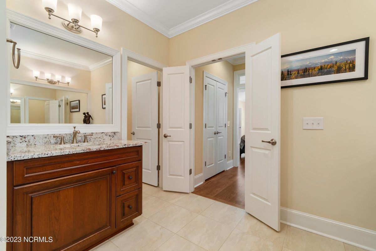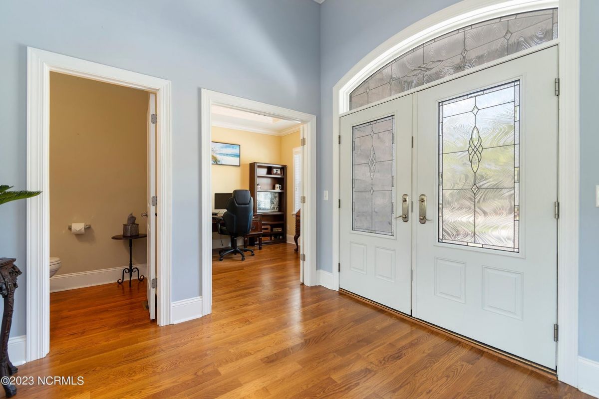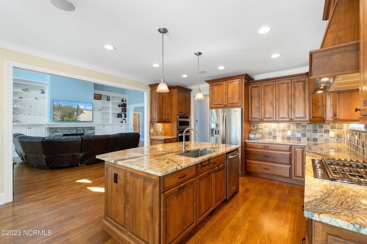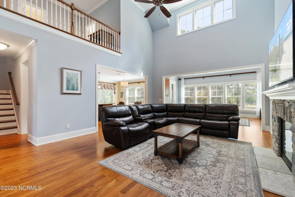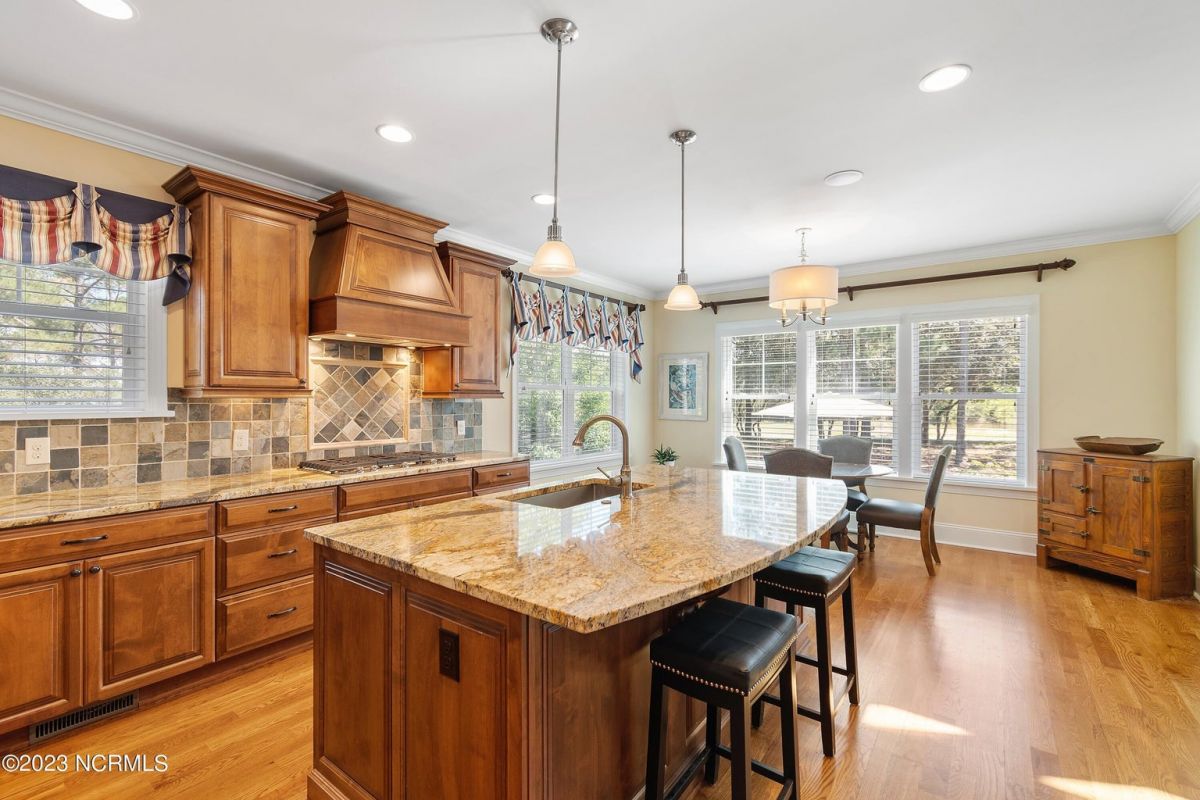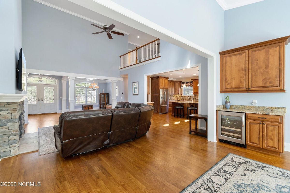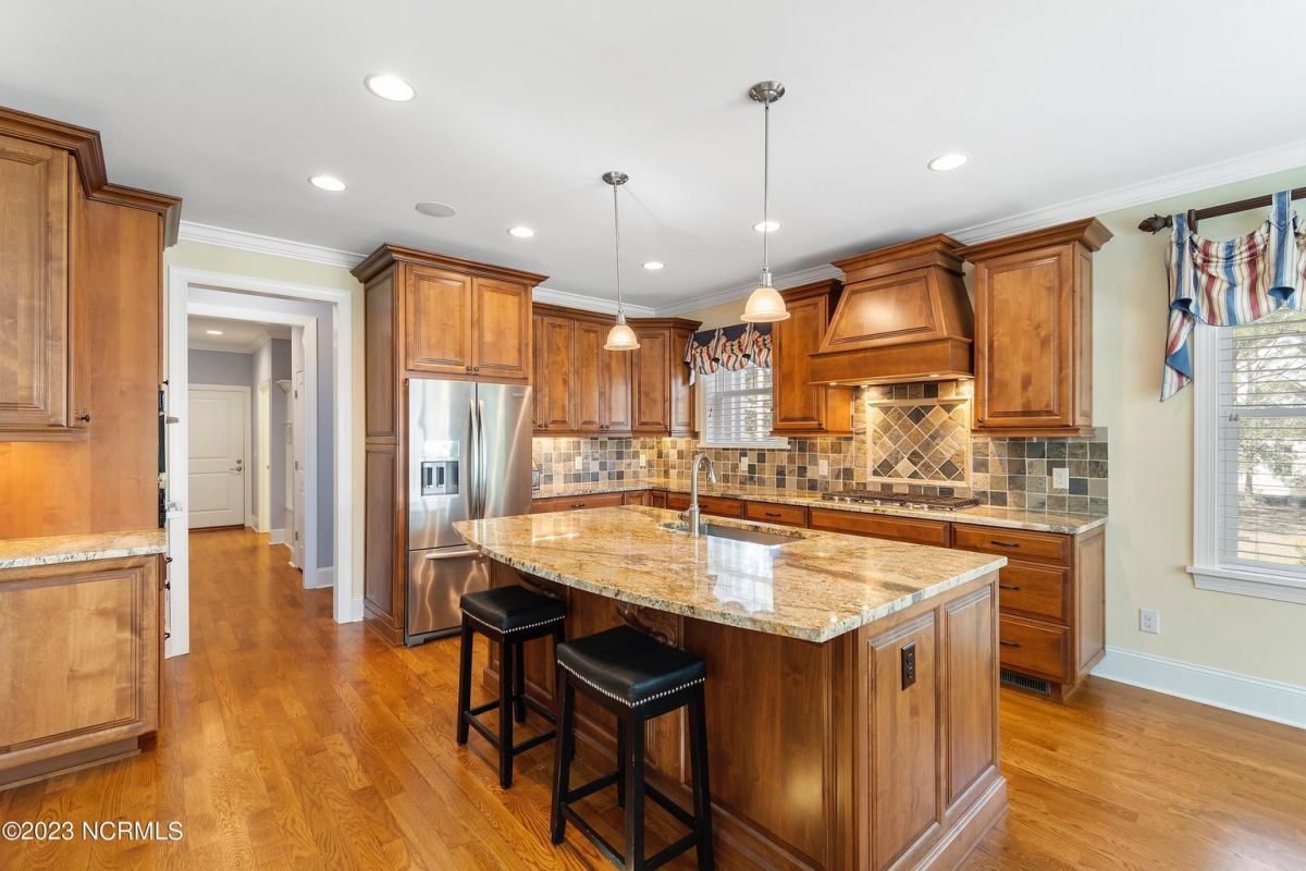 Welcome to your stunning golf course view home with modern luxury. Nestled right on the picturesque Leopard's Chase Golf Course's 11th hole in the highly desirable Ocean Ridge Plantation. This exquisite property boasts a traditional and modern architecture, making it the perfect haven for golf enthusiasts and those seeking elegant living spaces. As you step through the double front doors into the inviting foyer, you'll be greeted by the warm embrace of real golden oak hardwood floors, setting the tone for the entire main area. To your right, an office space awaits, complete with double glass French doors, hardwood flooring, a ceiling fan, trayed ceiling, and crown molding- a tranquil setting for work or relaxation. The adjacent dining area is a masterpiece of design, showcasing coffered ceilings, decorative columns, and, of course, those beautiful hardwood floors. In the living room, you'll discover built-in shelving and a stunning stone-accented gas fireplace. The home is equipped with a below-ground propane tank for your convenience. The main living space continues to impress with its 20-foot-tall ceilings, ceiling fan, and more hardwood flooring. Wireless hi-fi system sonos speakers in the living room and kitchen. There is a Carolina room complete with windows, ceiling fan and a mini fridge / dry bar area. The kitchen is a chef's dream, offering hardwood floors, an eat-in dining area, breakfast bar, kitchen island, 5-burner gas stove, wall oven, microwave, fridge, garbage disposal, and even an instant hot feature. Custom built-ins adorn the pantry, and a coat closet with central vacuum completes the package. The laundry room comes equipped with a washer, dryer, and cabinets with granite countertops. The master bedroom is a sanctuary unto itself, featuring double doors, golden oak hardwood flooring, a relaxing sitting area, trayed ceiling, crown molding, and two large closets with custom built-ins. The master bathroom offers tile flooring, a double sink vanity, a separate toilet closet, a linen closet, a wall-in tile shower with a window and built-in seat, and two shower heads- all elegantly accented with crown molding. Upstairs, you'll find a versatile loft landing area with two spacious bedrooms, bathroom and a huge bonus room. The guest bedrooms feature carpet, ceiling fans, crown molding and closets. The guest bathroom boasts granite countertops, tub / shower combination and tile flooring. Next, the sizable bonus room can serve as an additional bedroom, offering ample space, carpeting, and double closets. There is also a door leading to a generously sized walk-in attic space complete with flooring. This home is equipped with two HVAC systems and three thermostats, ensuring optimal comfort year-round. The spacious two-car garage includes a convenient door leading to the outside, storage shelving, and a utility sink. Outside, a patio area with stamped concrete overlooks the lush backyard, surrounded by live oak trees, palm trees, and a Japanese maple. The property also features a sprinkler system to keep your landscaping vibrant. Ocean Ridge Plantation is the most exclusive and luxurious golf community. Amenities include indoor and outdoor pool, 72 holes of premier golf, fitness center, wet & dry sauna, library, outdoor grilling pavilion, 4 acre fishing lake, nature park, community gardens, outdoor whirlpool, tennis and pickleball courts. Don't forget about the luxurious oceanfront beach club located on gorgeous Sunset Beach, NC. The private oceanfront club provides convenience with a full kitchen, wet bar, porches, elevator and parking. Ocean Ridge Plantation is conveniently tucked away between the historic charm of Wilmington, NC, and the excitement of Myrtle Beach, SC. Don't miss this opportunity to own a truly exceptional property that seamlessly blends modern luxury with golf!