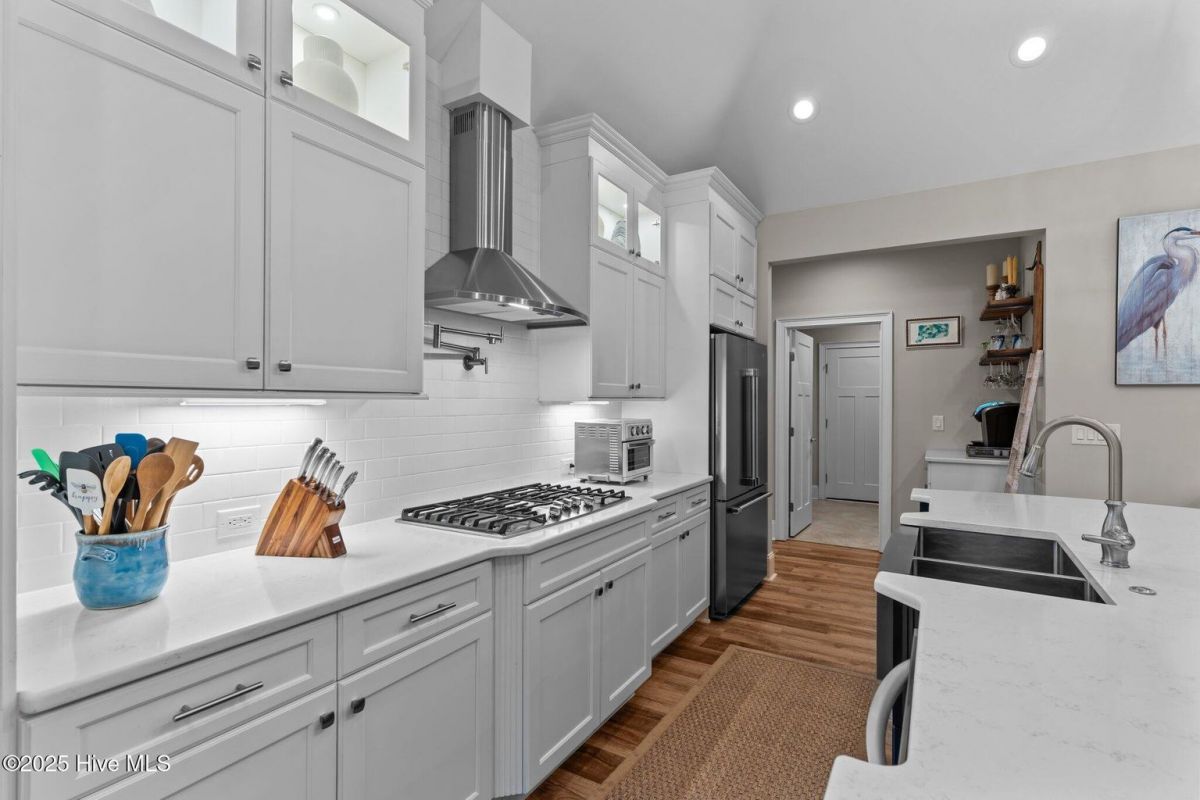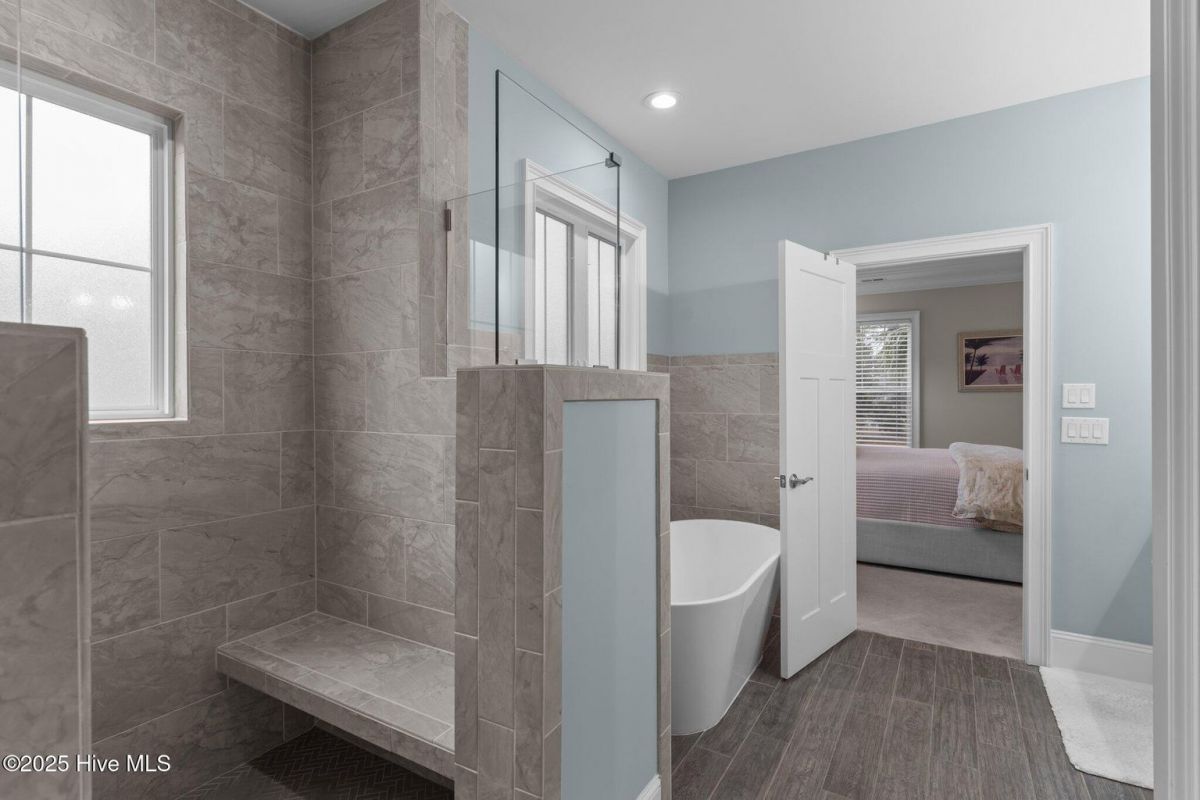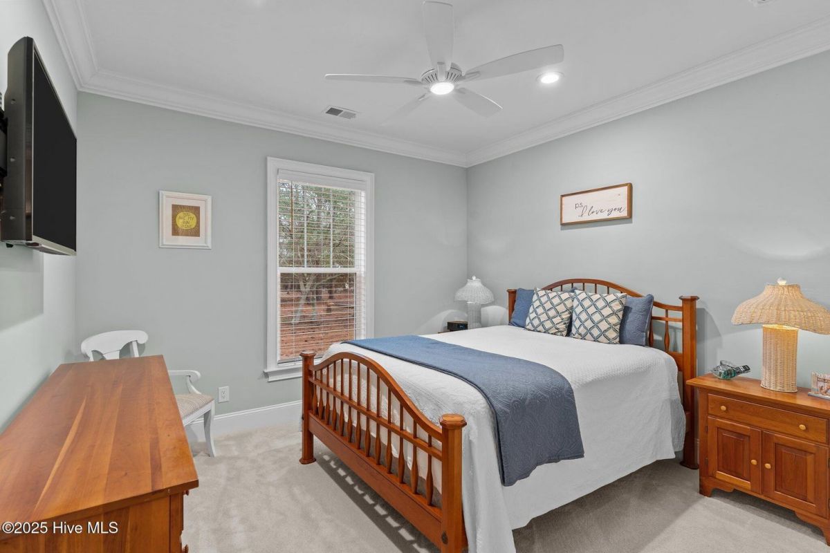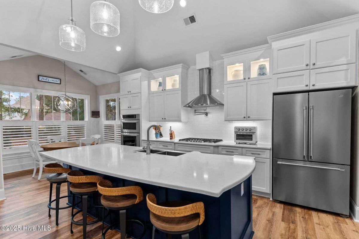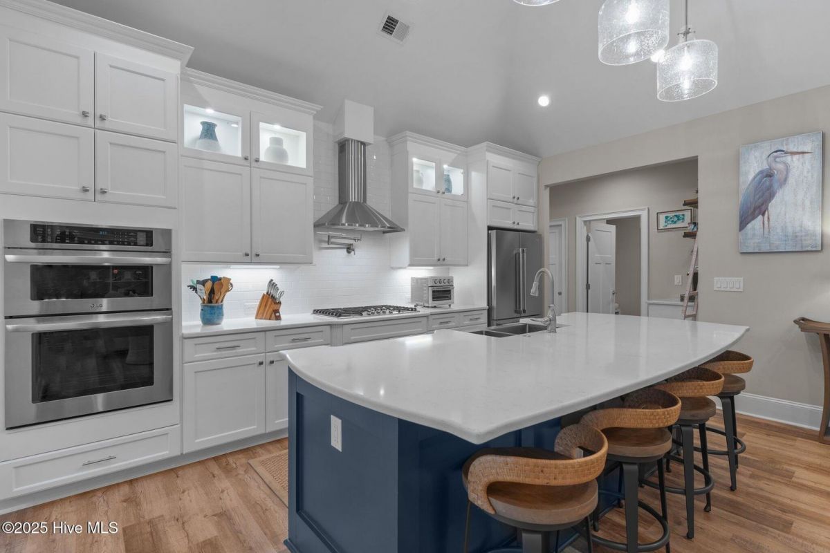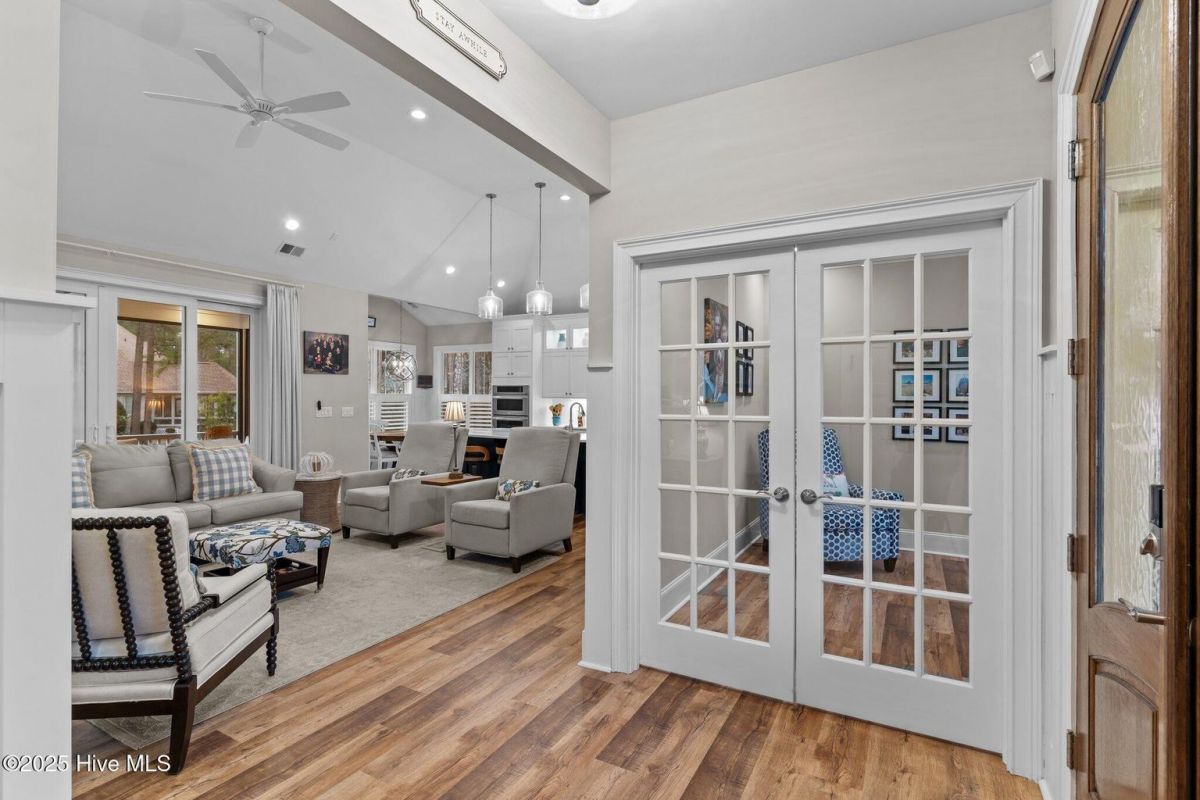 Exquisite Single-Story Home in Ocean Ridge Plantation. Nestled in a premier golf course community, this refined retreat offers exceptional amenities, including four golf courses, indoor and outdoor pools, pickleball courts, clubhouses, a fitness center, walking trails, and an oceanfront beach house in Sunset Beach. The home's elegant exterior features James Hardie lap siding, board and batten, shingle and brick accents, and detailed gable stickwork. Enter through arched, stained double doors into a foyer adorned with wainscoting. The vaulted Great Room boasts a 36-inch vent-free fireplace and sliding doors leading to a spacious, tiled, screened porch. Designed for entertaining, the kitchen features quartz countertops, an eat-in island, subway tile backsplash, under-cabinet lighting, and stainless steel appliances, including a microwave/oven combo, gas cooktop, and vent hood. White and navy soft-close cabinetry and a large walk-in pantry with a pocket door add to its functionality. The Owner's Suite impresses with a presidential tray ceiling, rope and recessed lighting, USB outlets, and a custom walk-in closet. The spa-inspired bath includes a fully tiled zero-entry shower with an LED-lit wall niche, a soaking tub, and a dual-sink quartz vanity. The guest bath features an upgraded tile shower with a transom window. Additional highlights include a laundry/mudroom with storage cubbies, solid core doors, HERS certification for energy efficiency, a tankless water heater, an irrigation system, an epoxy-coated garage floor, and a large patio equipped for grilling. This home blends luxury, comfort, and efficiency in a sought-after location.