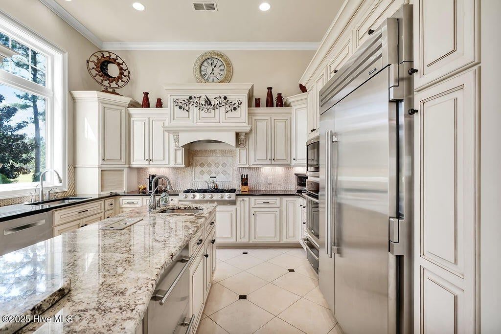 Discover refined luxury and timeless craftsmanship in this exquisite estate by builder Bruce Carrell, located on the 11th fairway of Leopard's Chase golf course. Nearly every room offers breathtaking views of the fairway, providing a serene backdrop for daily living. This home showcases quality and meticulous attention to detail through its architectural elegance and thoughtfully designed floorplan, making it perfect for both entertaining and everyday activities. As you enter the foyer, admire the grand staircase, soaring ceilings, and a stunning chandelier. Marble floors lead to a great room featuring a fireplace, coffered ceilings, a custom-built wall unit with bar & wine cooler, and French doors that beautifully frame the golf views. Entertain on the lanai, complete with an outdoor kitchen and remote controlled phantom screens. Transition to the gourmet kitchen, highlighted by a magnificent island, complemented by high-end appliances and custom cabinetry. Host gatherings in the spacious formal dining room, accented with elegant pillars. The luxurious primary suite features a linear fireplace, bay windows, and a sitting/sun room. The en suite bath boasts a jetted tub and a walk-in shower, plus a water closet with a bidet. Two generous walk-in closets with custom cabinetry complete the suite. An executive office, designer half bath, and laundry room finish the first floor. An elevator conveniently transports you to the second floor where you'll find three guest rooms and 2 full baths. There's a perfect entertainment room, featuring a full wet bar, Sonos surround sound, and gas fireplace. Plus, a deck with panoramic views of the golf course. Ocean Ridge has a vibrant social scene & amenities including a Sunset Beach clubhouse, four golf courses, multiple clubhouses, restaurants, community garden, 3 pools, sauna, steam room, jacuzzi, 2 fitness/ amenity centers, pickleball courts, nature pavilion, walking trails, meeting and party rooms, and a party lawn.