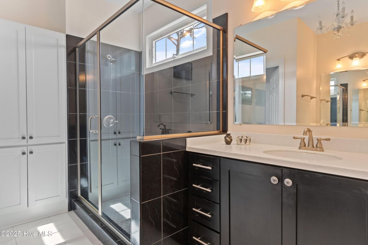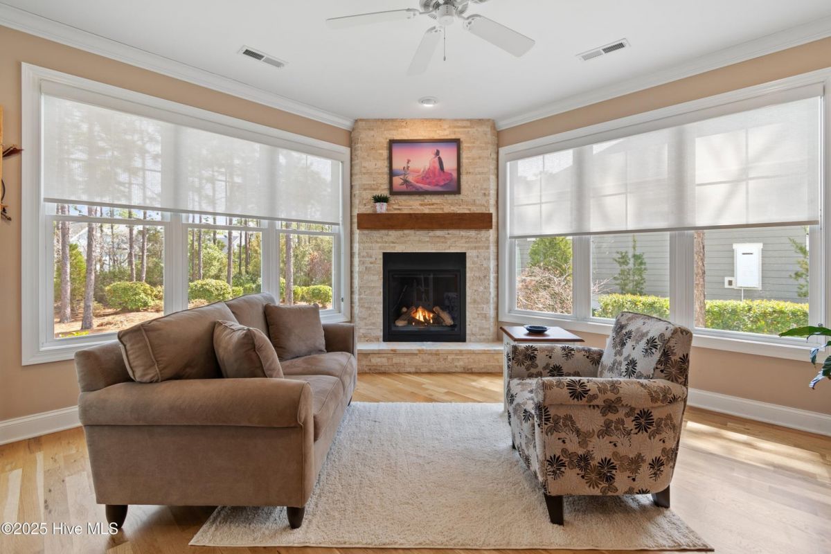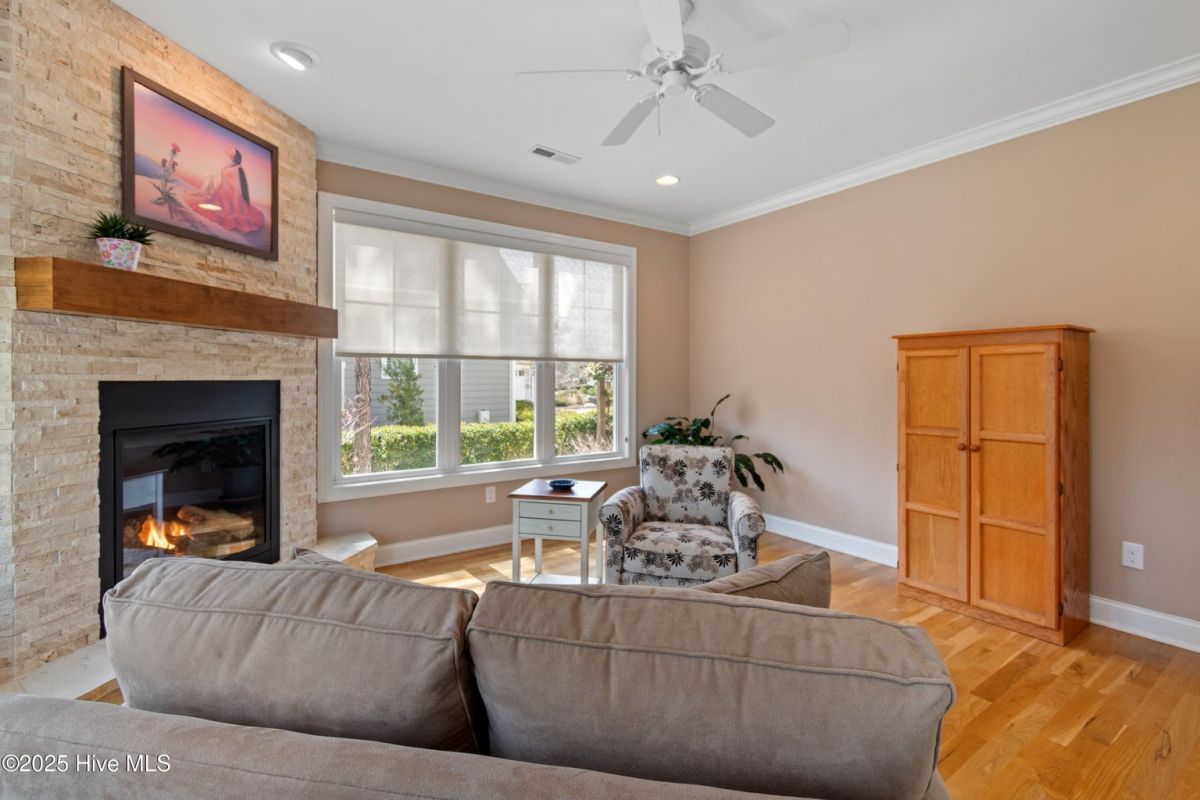 Nestled in the Reserve section of St. James on a wooded lot, this custom built home offers 2 primary suites on the first floor, a large chef's dream kitchen with an abundance of counter space and luxurious cabinetry. The welcoming entry foyer leads into a large living room with a soaring ceiling, built-in bookshelves, and a bank of windows looking out onto a private backyard. The retreat room welcomes with a travertine tiled gas fireplace, 2 walls of windows and a door to the screened porch. The first level office and laundry make this one floor living while 2 more bedrooms, a full bath with walk in shower and large storage closet await on the second floor. The walk in attic offers loads of storage. Built in shelves and storage cabinets in the garage make tool storage neat and tidy. Easy access to Seaside Gate.