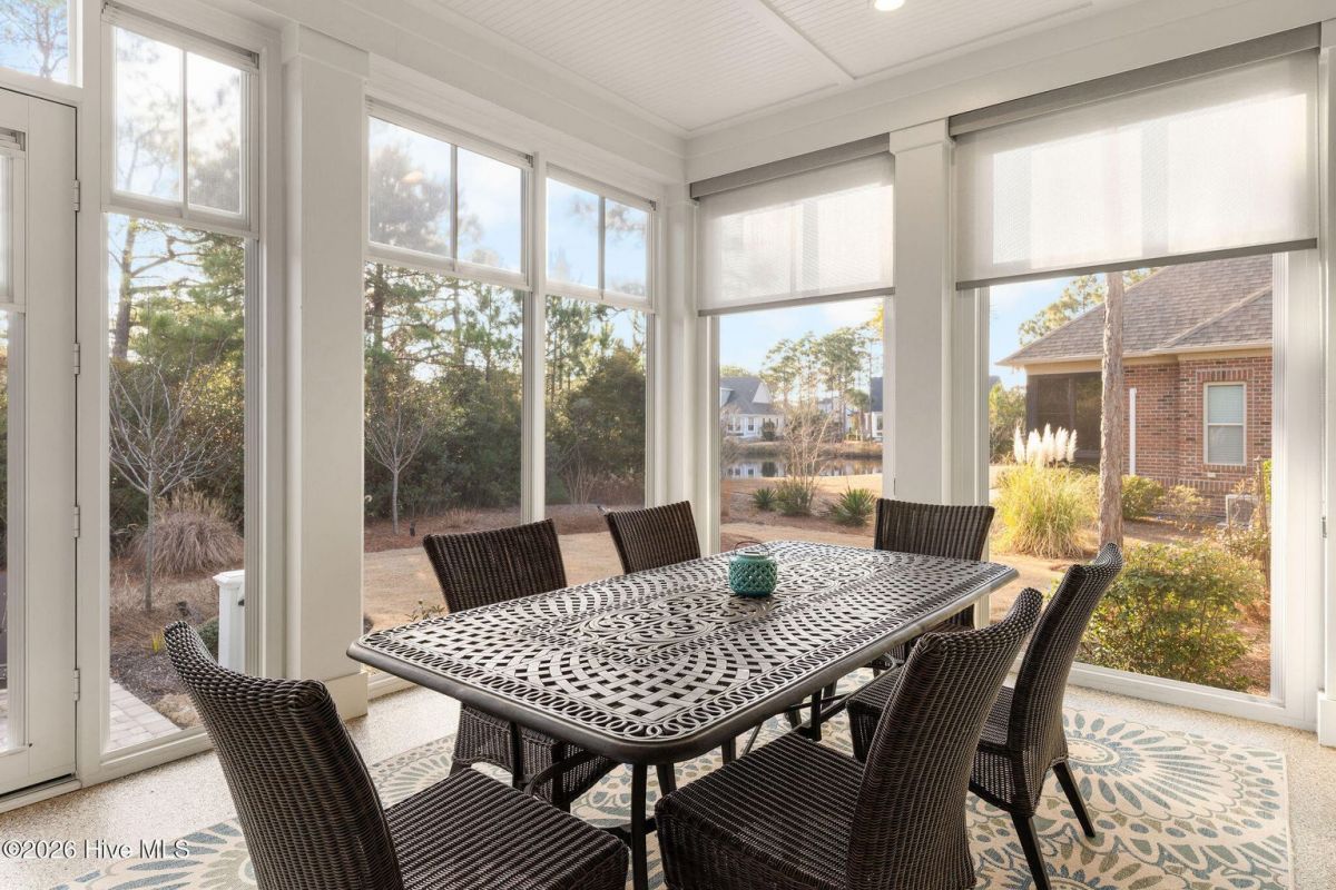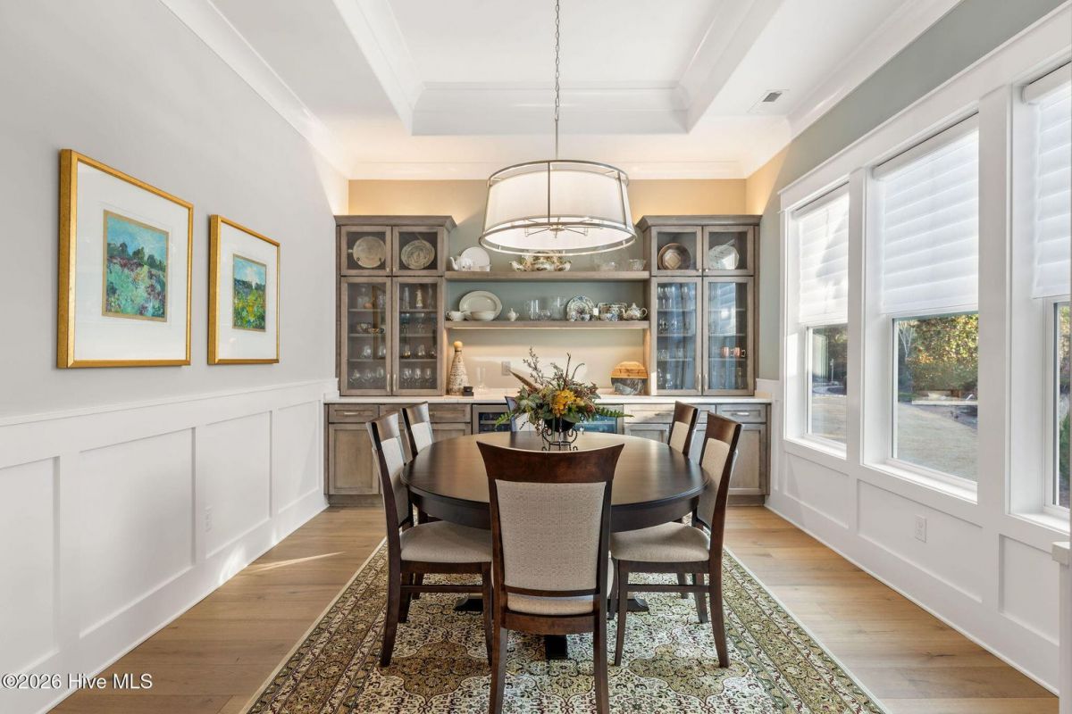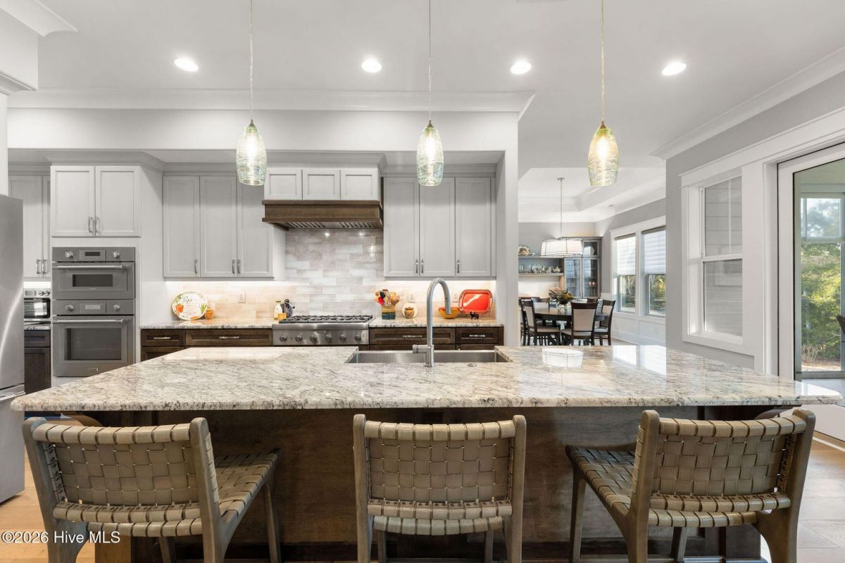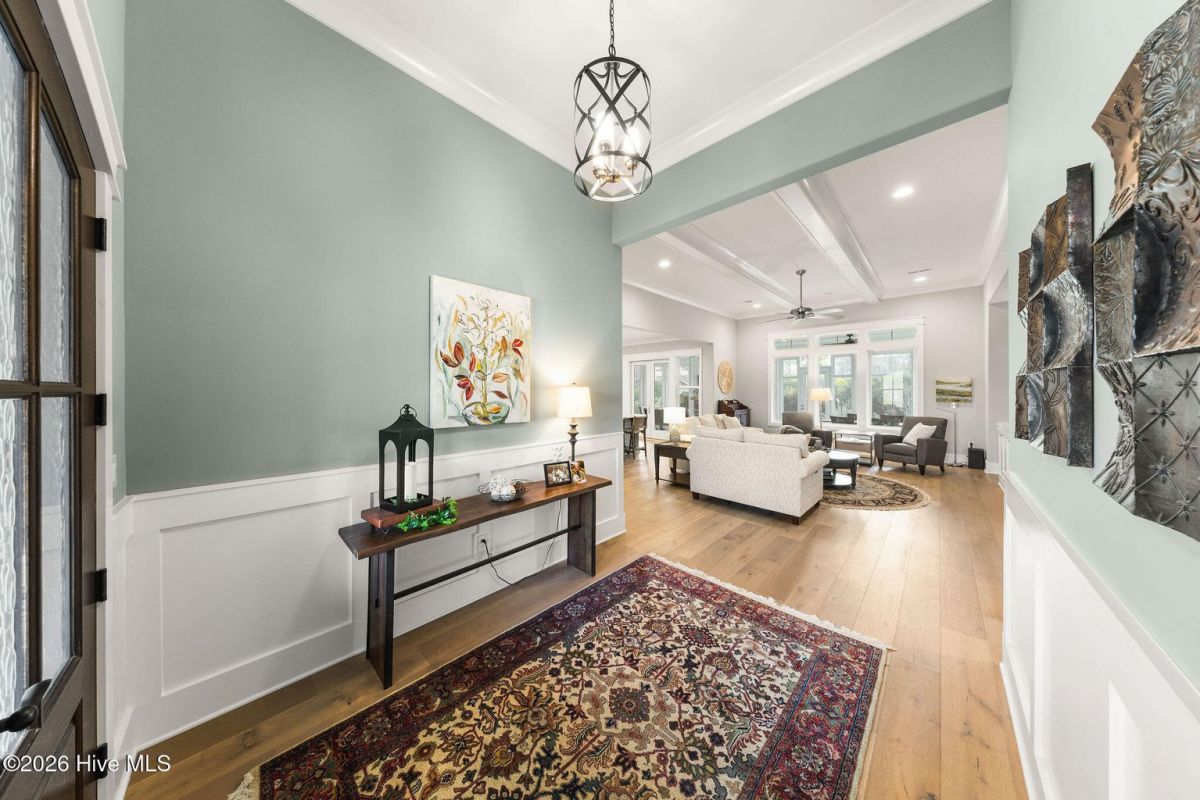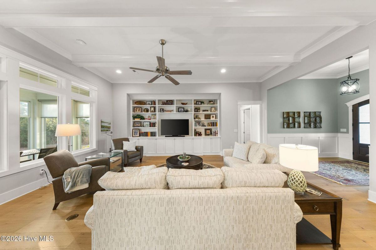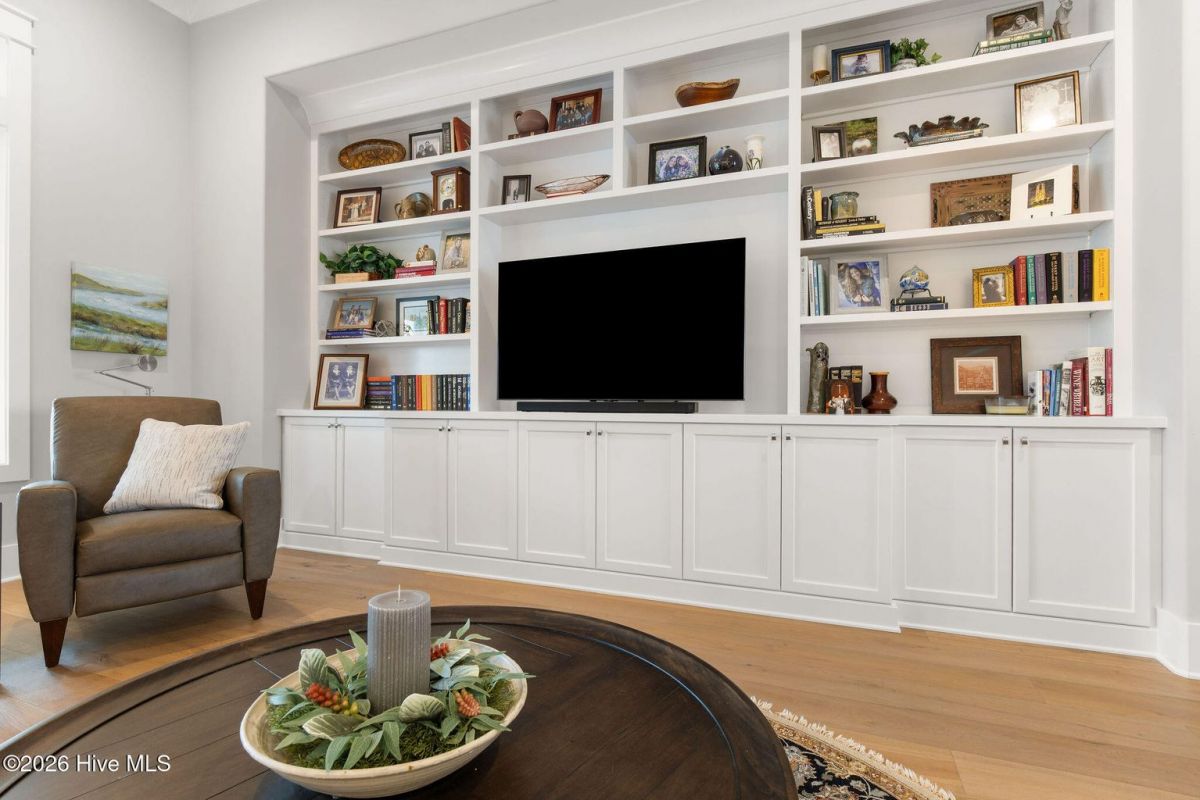 Designed by renowned builder George Crane and completed in 2023, this refined coastal residence offers a rare blend of craftsmanship, comfort, and timeless sophistication. Perfectly positioned on a tranquil pond-view lot backing to protected nature, the home enjoys exceptional privacy, peaceful water views, and a serene outdoor setting ideal for both entertaining and everyday living. French oak flooring flows throughout the main living spaces and is beautifully complemented by Pella windows, motorized blinds, and a striking mahogany front door. Thoughtfully designed California Closets elevate storage well beyond expectations, while dual-zone HVAC and a whole-home Port City sound system provide effortless modern comfort. The gracious formal dining room is designed for entertaining and features dual built-in wine and beverage refrigerators, while the chef's kitchen is anchored by premium Thermador appliances, abundant prep space, and generous storage—perfect for both casual living and elevated gatherings. A beautifully crafted solid-wood walk-in pantry, functional drop zone, and a dedicated Christmas tree closet with additional laundry storage add uncommon and highly practical luxury. The primary suite is a true retreat, offering a spacious bedroom, an impressive walk-in closet, and a spa-inspired bath with a walk-in shower and heated towel rack. A private first-floor office, enclosed by a sleek glass pocket door, provides a quiet and stylish workspace. A separate downstairs guest suite is ideal for visitors or multigenerational living and includes its private bathroom. Outdoor living is exceptional, with serene pond and nature views enjoyed from the extended EZ Breeze porch featuring epoxy flooring, fireplace, and an outdoor covered kitchen with a grill and extended paver. Professionally designed exterior lighting and gutter guards enhance both ambiance and ease of ownership. The rare 2½-car garage has been extended by two feet, offering exceptional storage and flexibility, and includes epoxy flooring, a separate exterior garage entrance, and an EV charging outlet. Upstairs, an additional private bedroom and full bath are complemented by a spacious media room with surround sound and abundant storage. An expansive attic provides outstanding future potential and may be converted into a fourth bedroom or a dedicated golf simulator, with additional attic storage accessed through a bedroom closet. Located in The Reserve at St. James Plantation, Ellington Place offers quick access to the Seaside gate and is surrounded by expansive greenspace, tranquil ponds, and preserved nature. Just minutes from the beach and a short stroll to the covered bridge, amphitheater, and lake in The Woodlands, the setting blends serenity with everyday convenience. Residents enjoy four security gates, a private oceanfront beach club with pool, a 475-slip marina with dining and Tiki bar, and the opportunity to join private clubs offering 81 holes of championship golf, multiple pools, dining venues, fitness centers, Har-Tru tennis, pickleball, and croquet. Discover why St. James has been the #1 coastal community in the Carolinas for over 20 years.