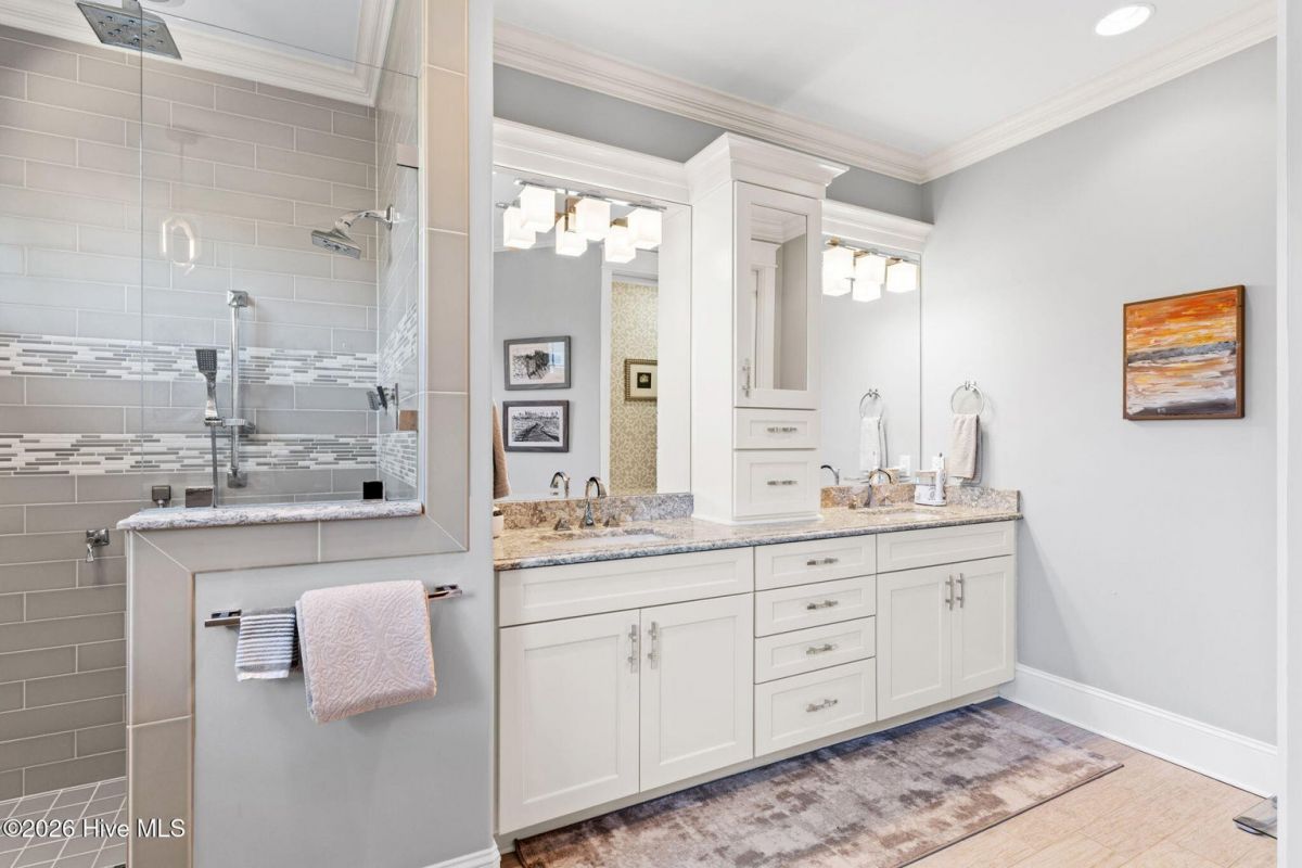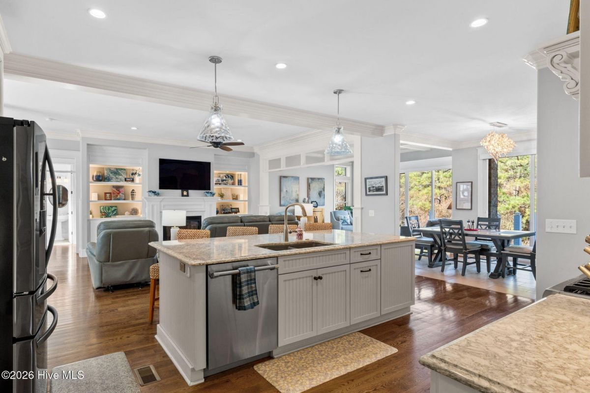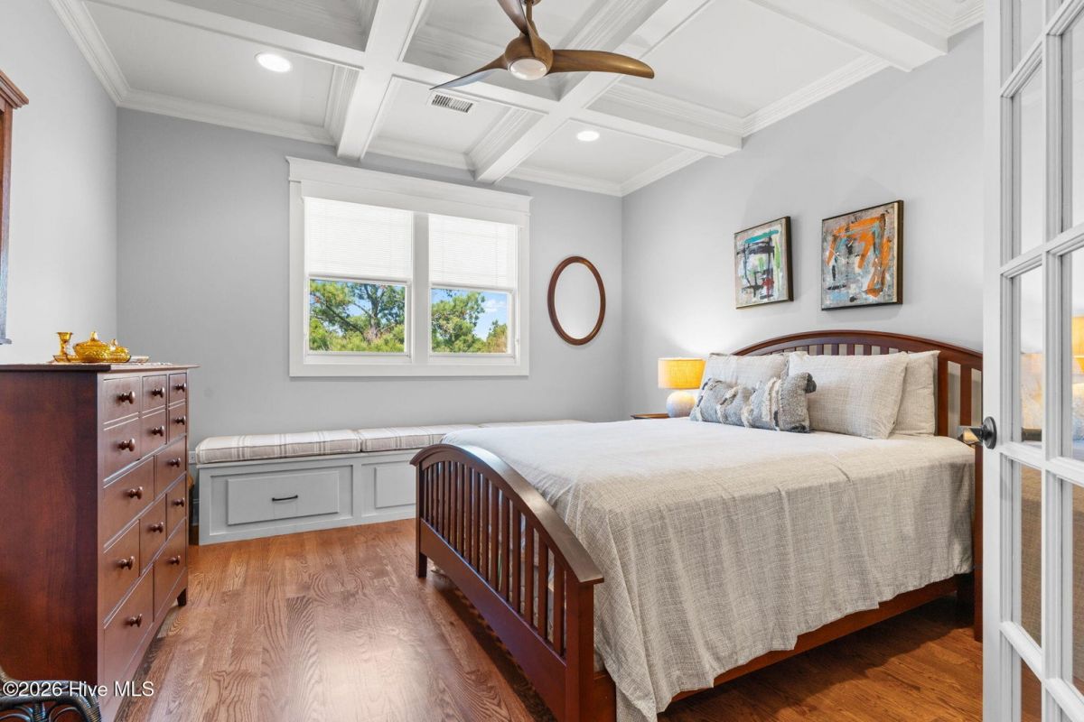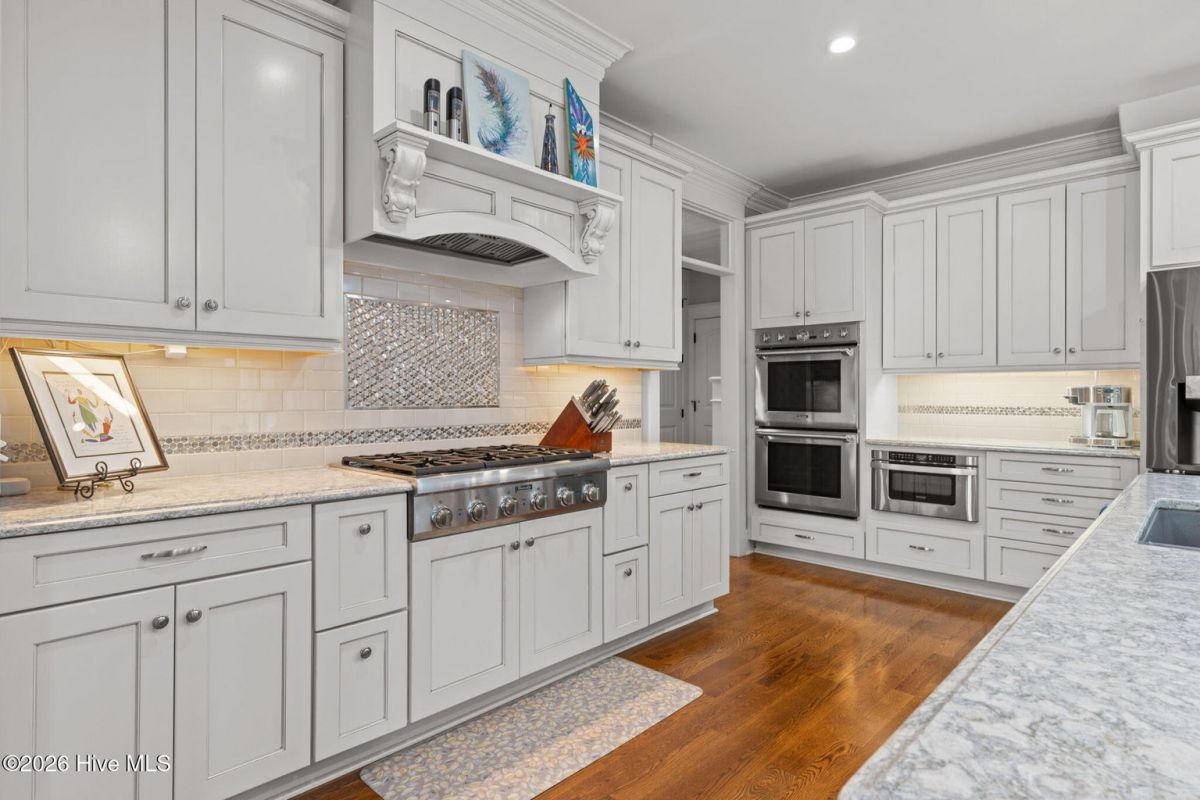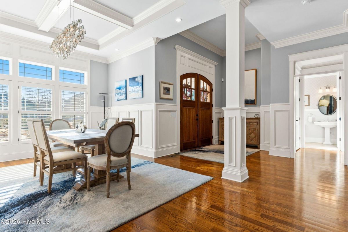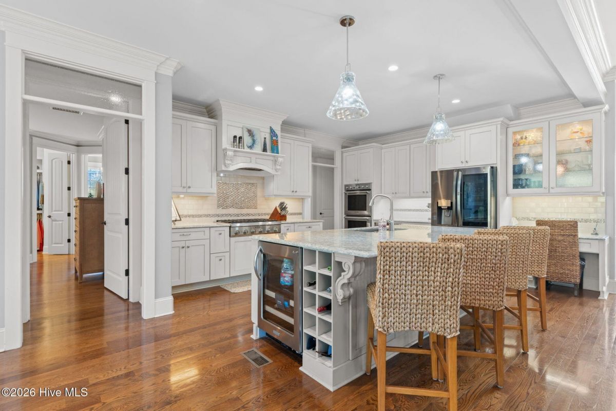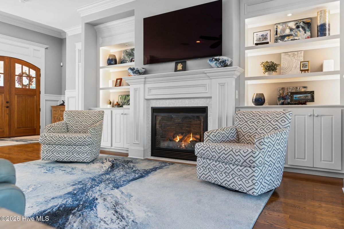 Exquisite custom home located in the prestigious Reserve section of St James Plantation on a quiet cul-de-sac, designed and built by Signature Construction Group with impeccable craftmanship, refined luxury and meticulous attention to detail. Step inside the double mahogany doors to discover a grand open concept layout filled with natural light, soaring coffered ceilings, 8 foot solid core doors and elegant finishes throughout. The gourmet chefs kitchen boasts Thermador appliances, a 6-burner gas cooktop, double ovens, beverage fridge, large pantry and soft close cabinetry that make it perfect for entertaining. The primary bedroom serves as a private retreat featuring a lighted trey ceiling, walk in closet and spa inspired soaking tub and a zero entry shower with Jets and a double shower head. The additional downstairs bedroom has the feel of a dual primary bedroom with a large ensuite bathroom with a large tub and separate shower. Upstairs feels like another complete living space with a large family room and wet bar, large 3rd bedroom, full bath and a finished flex-space currently used as a workout room but could be an office or additional bedroom. A big walk in storage space is a nice addition and has closed spray foam insulation Crawl space is completely sealed with foam insulation. The private backyard backs up to a lush forest with sweeping views of the pond that can be enjoyed from the Trex deck with retractable awning.