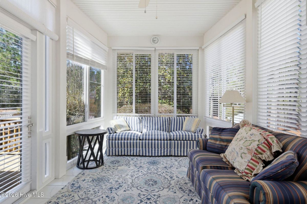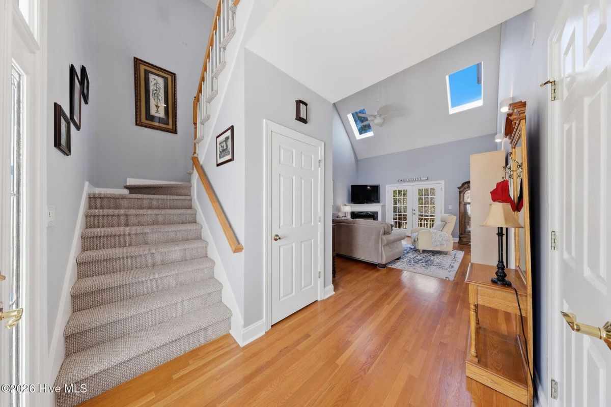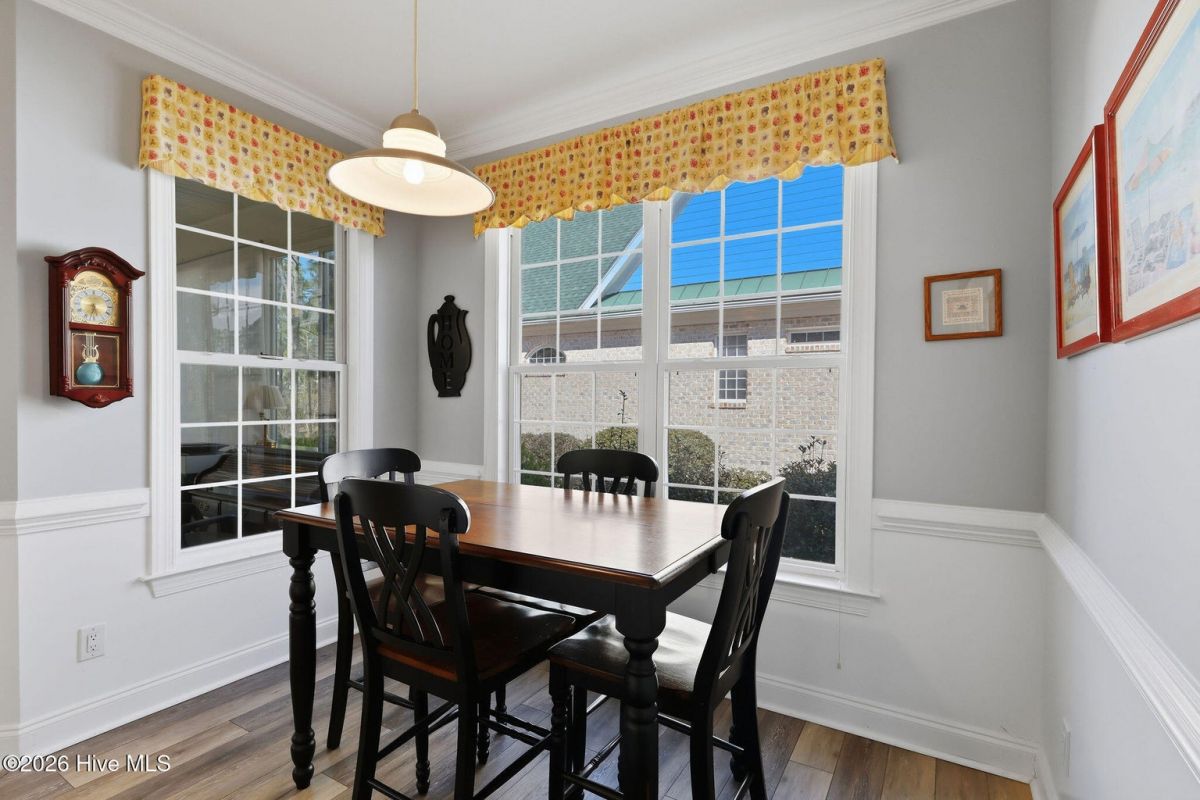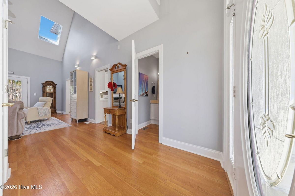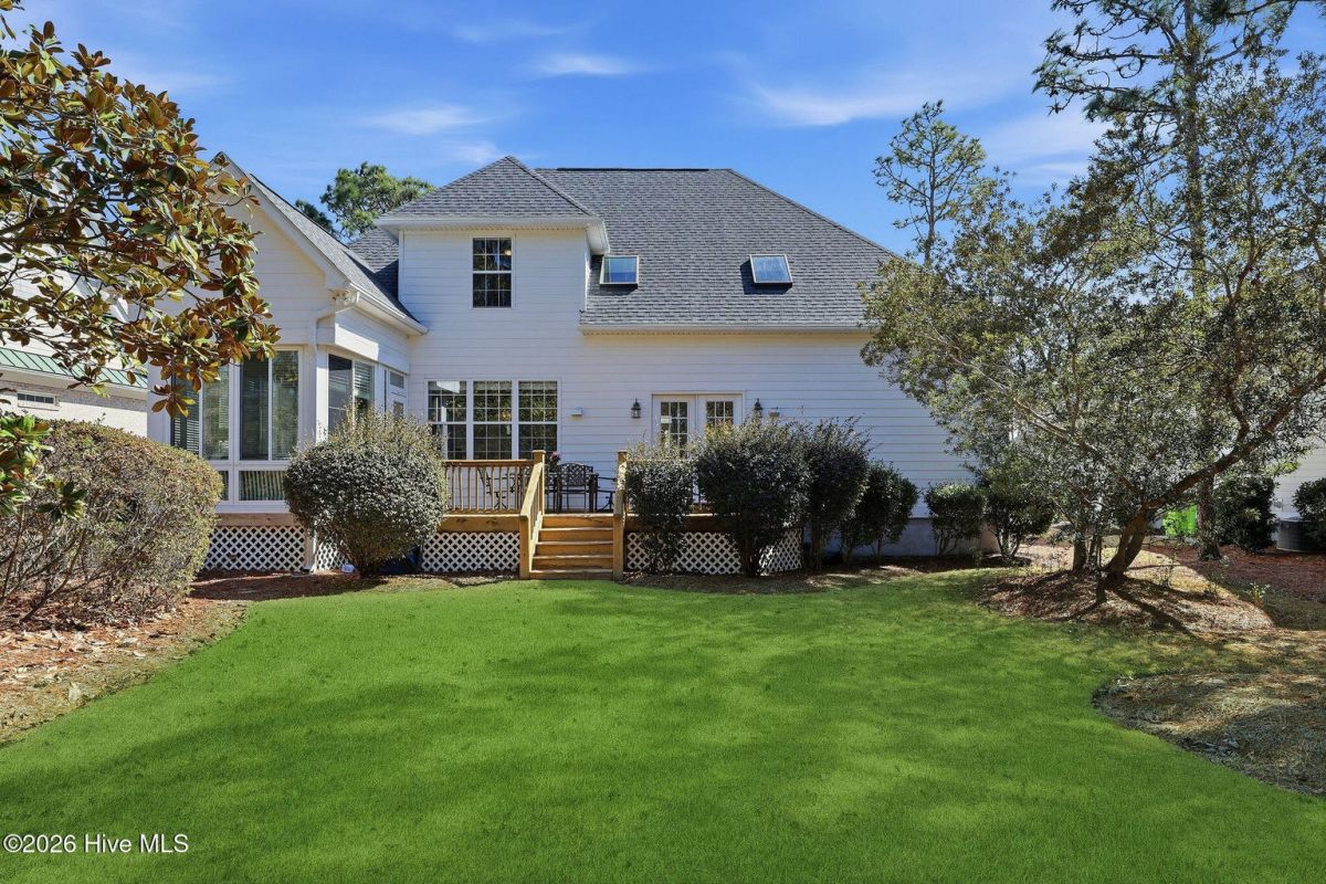 Quaint coastal charm meets comfortable living in this well-maintained home located in the highly desirable community of St. James Plantation. Set on a spacious .34-acre homesite with a natural wooded belt behind the property, the setting offers privacy while still being centrally located within the community. A cozy rocking chair front porch welcomes you inside to a warm and inviting floor plan. As you enter you are greeted by an impressive 2-story foyer and real ¾-inch oak hardwood flooring throughout the main living areas. The semi-open floor plan offers one story living with the primary bedroom downstairs and guest bedrooms upstairs. The great room features a soaring cathedral ceiling that enhances the sense of space and natural light with the focal point being an attractive corner propane gas fireplace. Just off the main living area, the heated/cooled sunroom provides peaceful views of the backyard. Enjoy the mild Carolina weather and expansive nature views from the open air attached deck. The semi-open kitchen is centrally positioned and gives you the privacy you need yet is open to the main living areas and offers solid surface countertops, plenty of cabinetry, counter space, stylish tile backsplash, and a functional layout. Entertain with ease in the eating area adjacent to the great room and for intimate family/friend gatherings the breakfast area is the perfect room. The first-floor primary suite includes a generous walk-in closet measuring nearly 12' x 8' ft., the bathroom features a comfortable soaking tub and walk-in shower with an updated sliding glass door. Upstairs are 2 guest bedrooms privately tucked away and serviced by a full bathroom. The large bonus room is the perfect flex space for additional guests or could easily be used as a hobby/media room. Additional features include a dedicated laundry room with sink, generous storage throughout the home, a crawlspace dehumidifier system, and a new roof installed in 2023. In St. James Plantation, residents enjoy an exceptional coastal lifestyle with access to championship golf, marinas, miles of walking and biking trails, fitness centers, restaurants, and a private oceanfront beach club.