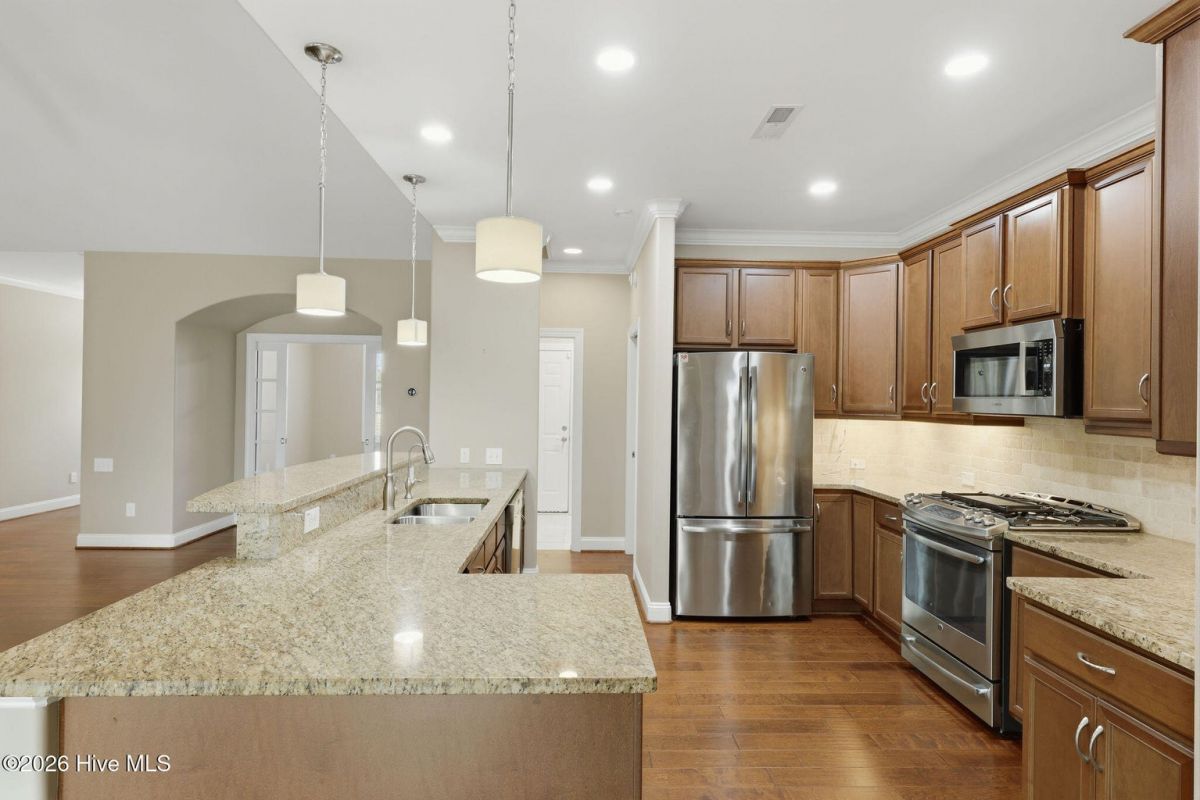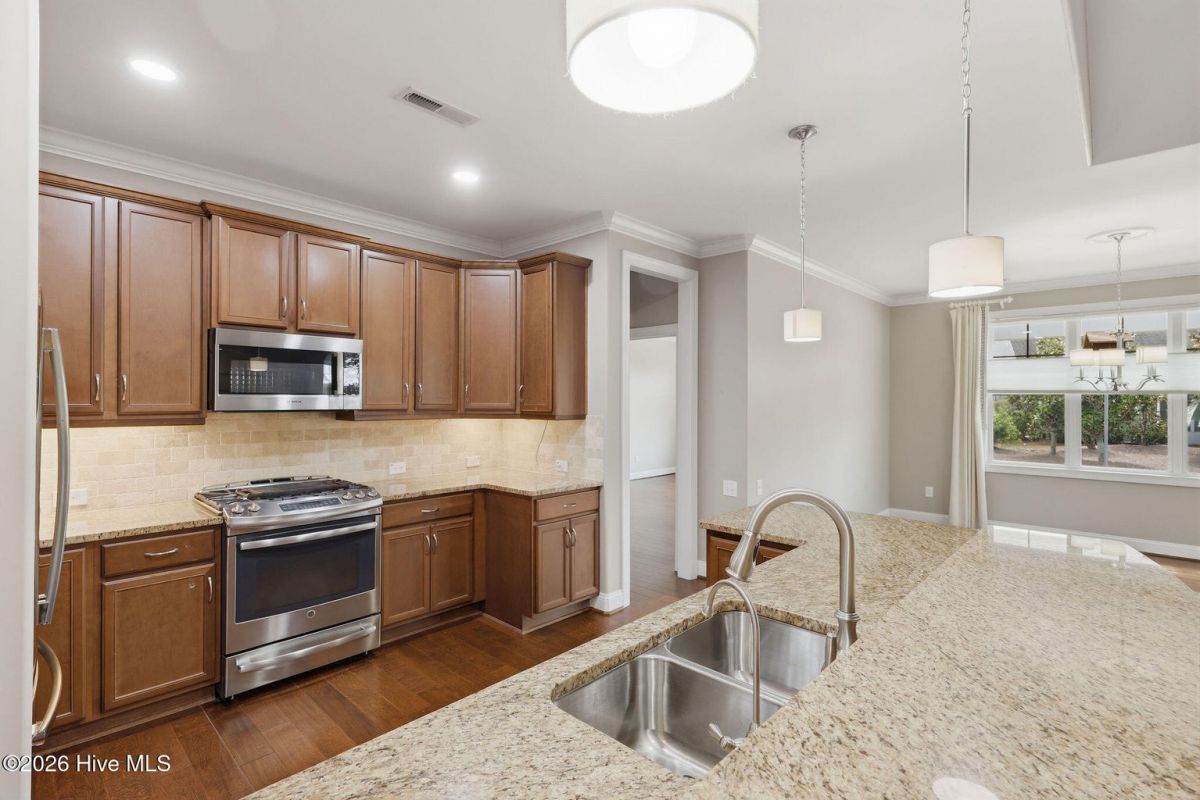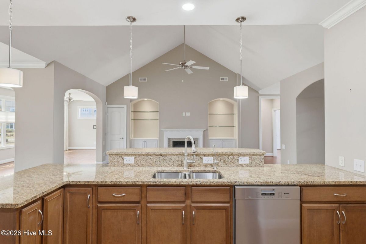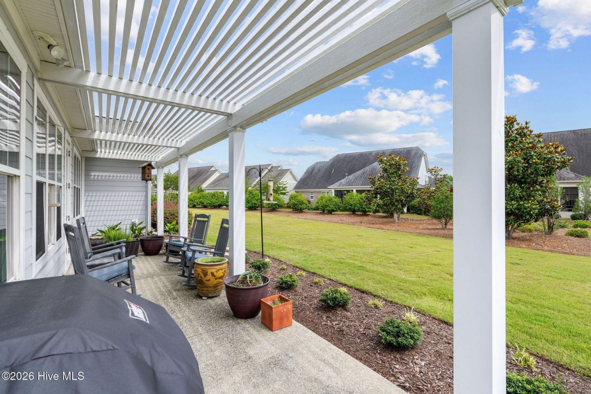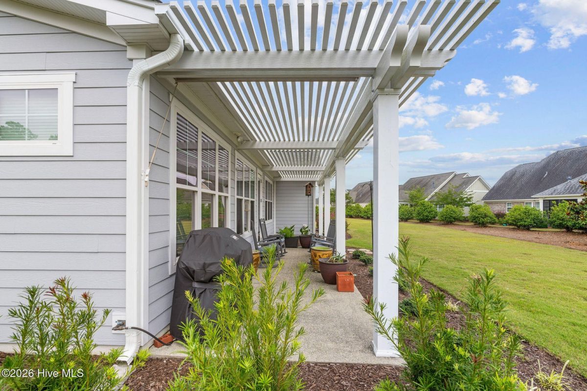 Welcome to 3346 Shell Isle Drive, a refreshing coastal cottage in St. James Plantation ideally positioned on a beautifully landscaped corner home-site with convenient access to the Seaside amenity center, gate, the sandy shores of Oak Island. The demands for energy efficiency are met with solar electricity and hot water on demand. This 2,774-square-foot home features 3 bedrooms and 3 bathrooms, blending comfort and style in every detail. A paver driveway leads to a spacious double garage and a charming walkway that guides you to the inviting front porch, highlighted by a metal roof accent and classic dormers. Step inside the welcoming entryway, where crown molding set an elegant tone that flows into the spacious great room. Here, a vaulted ceiling and gas fireplace flanked by custom built-ins nestled into arched niches create a cozy yet refined gathering space bathed in natural light from the surrounding sunroom, dining room, and home office. The handsome kitchen is seamlessly connected to the great room by an extended granite-topped bar with both raised and counter-height seating, perfect for casual dining or entertaining. Thoughtfully appointed, the kitchen features stainless steel appliances, a tiled backsplash, ample cabinetry, and stylish pendant lighting. The adjacent dining room, complete with a matching chandelier, comfortably hosts larger gatherings, while an arched opening leads to the cozy sunroom with access to the backyard retreat—featuring an exposed aggregate patio beneath a charming pergola. The spacious and private owner's suite offers a serene retreat, highlighted by a tray ceiling, rich bamboo flooring, and an abundance of natural light. The en-suite bathroom is thoughtfully designed with an extended granite-topped vanity featuring dual sinks and a dedicated makeup area, a beautifully tiled walk-in shower with an adjustable shower head, and direct access to an expansive walk-in closet. Family and friends will feel right at home in the comfortable guest bedrooms, which share a nicely appointed full bathroom, ensuring both style and convenience for all. Offering flexibility for overflow guests or multi-generational living, the bonus room features cozy carpeting, a full bathroom, a generous closet, and convenient attic access. Additional highlights of this thoughtfully maintained home include charming pocket doors, recently refreshed exterior paint, and solar panels that enhance both sustainability and savings. Every detail contributes to the comfort and functionality of this inviting coastal residence so come and visit St. James Plantation today!